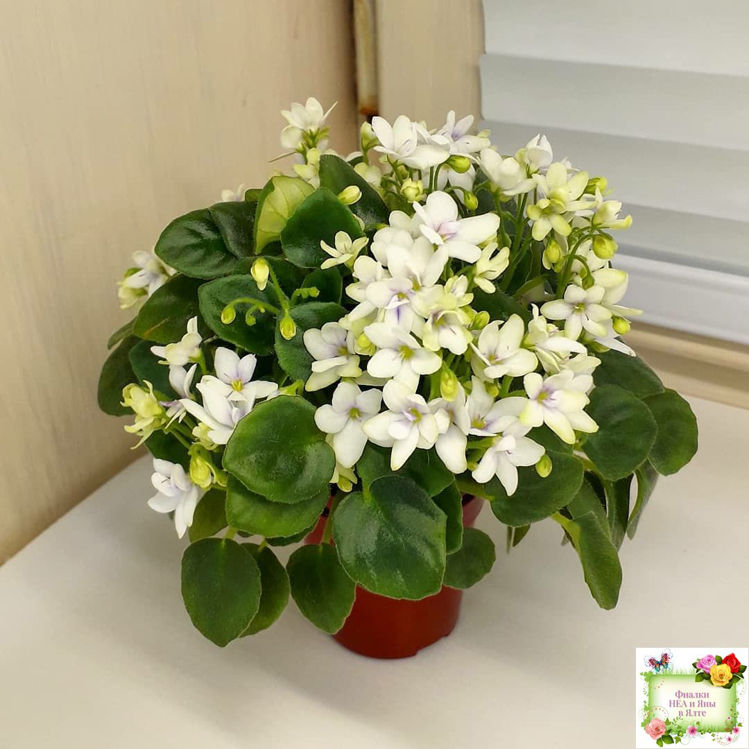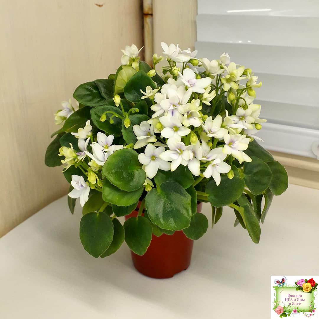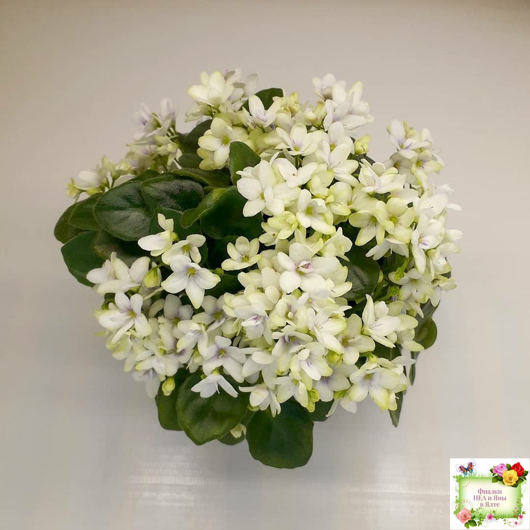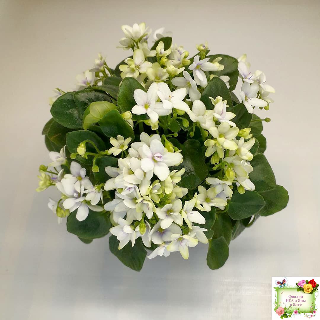 White semidouble blooms with lavender eyes. Semiminiature, medium green, pointed foliage.