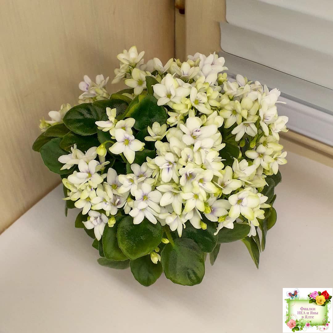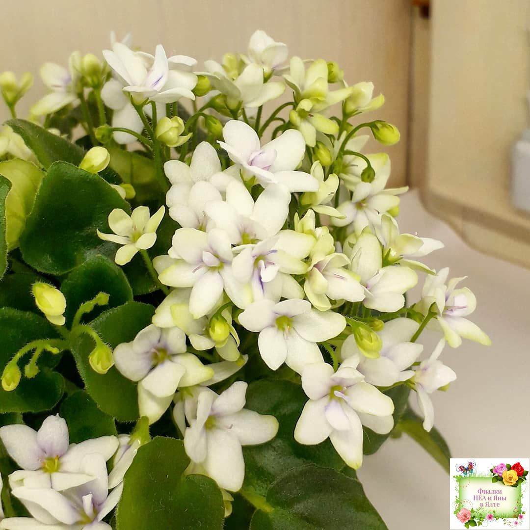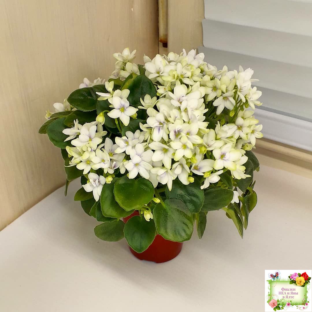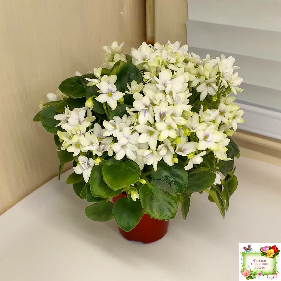 White semidouble blooms with lavender eyes. Semiminiature, medium green, pointed foliage.