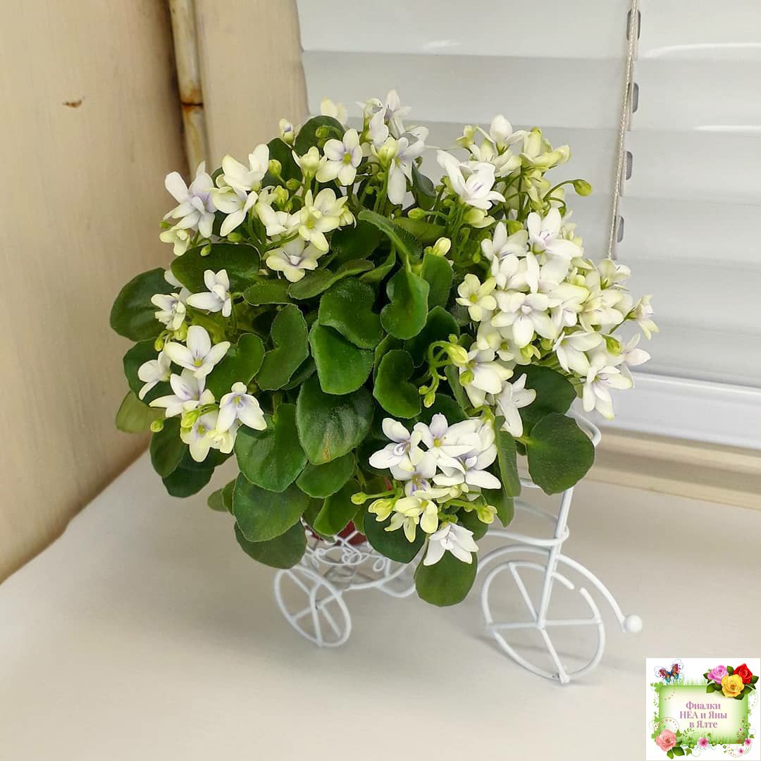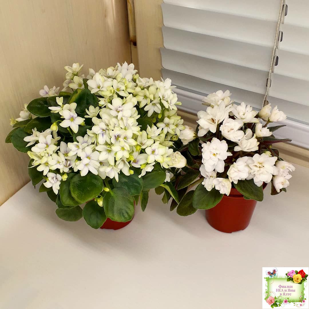 Белые полумахровые цветы с лавандовым глазком. Средне-зеленые заострённые листья.