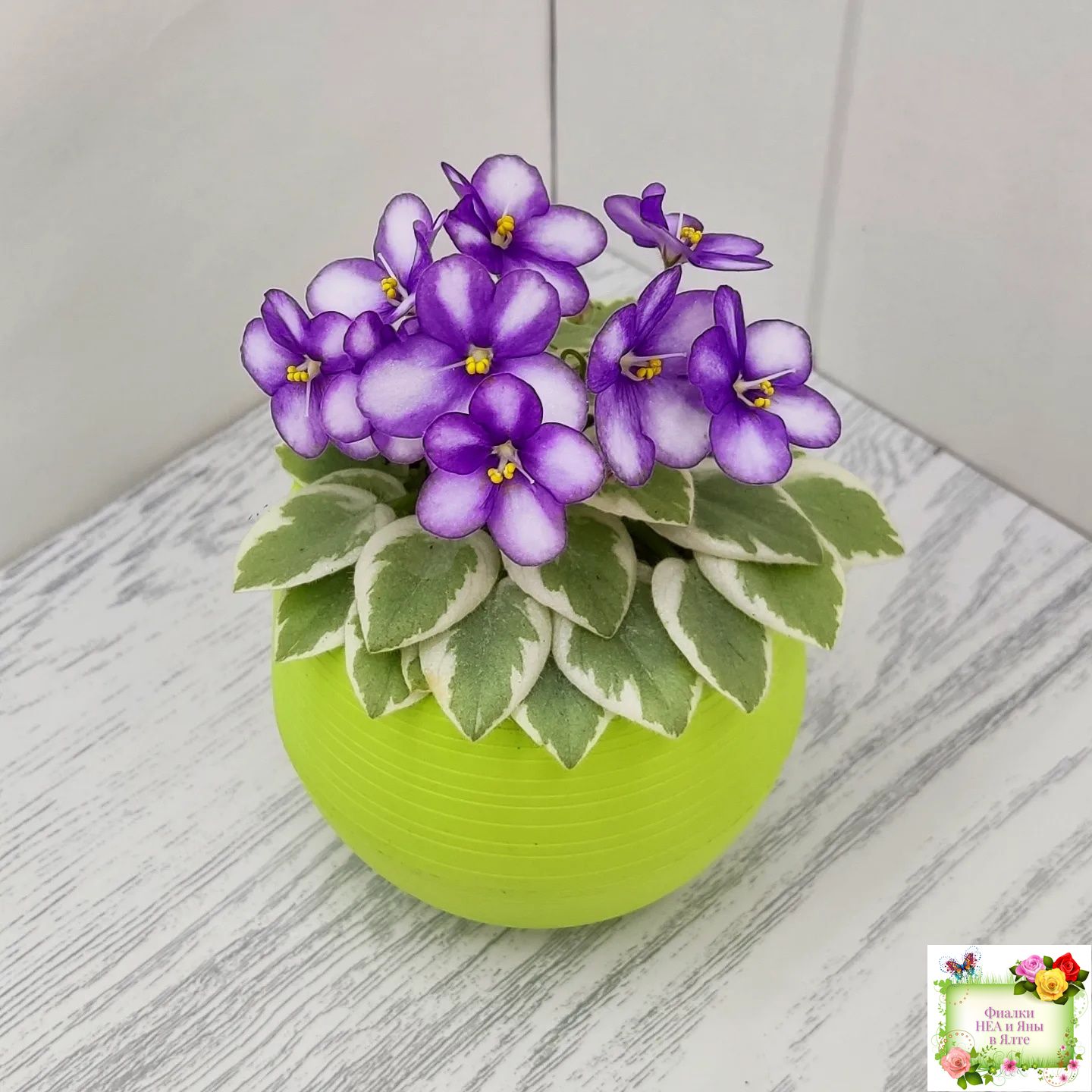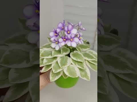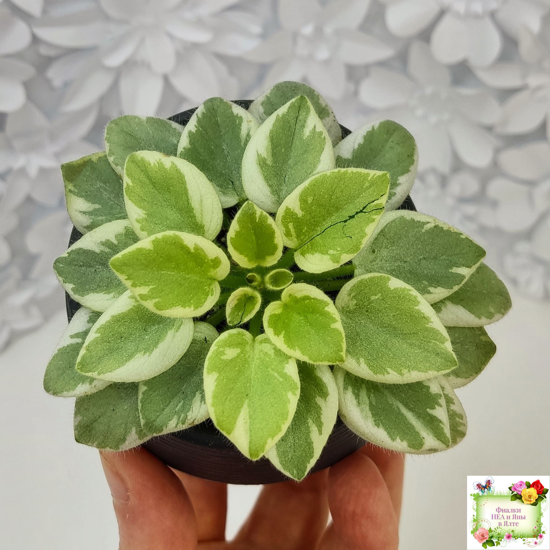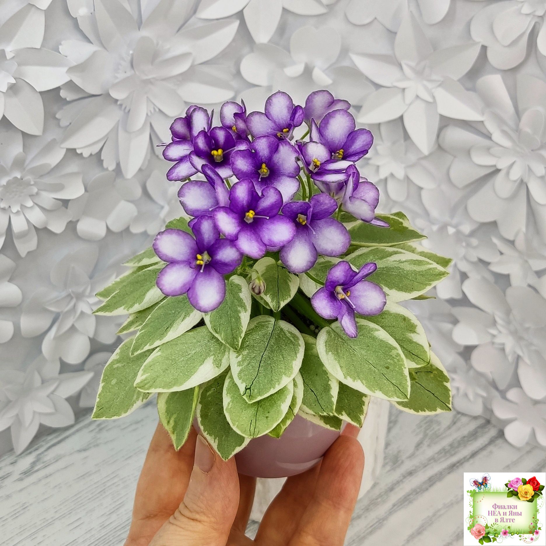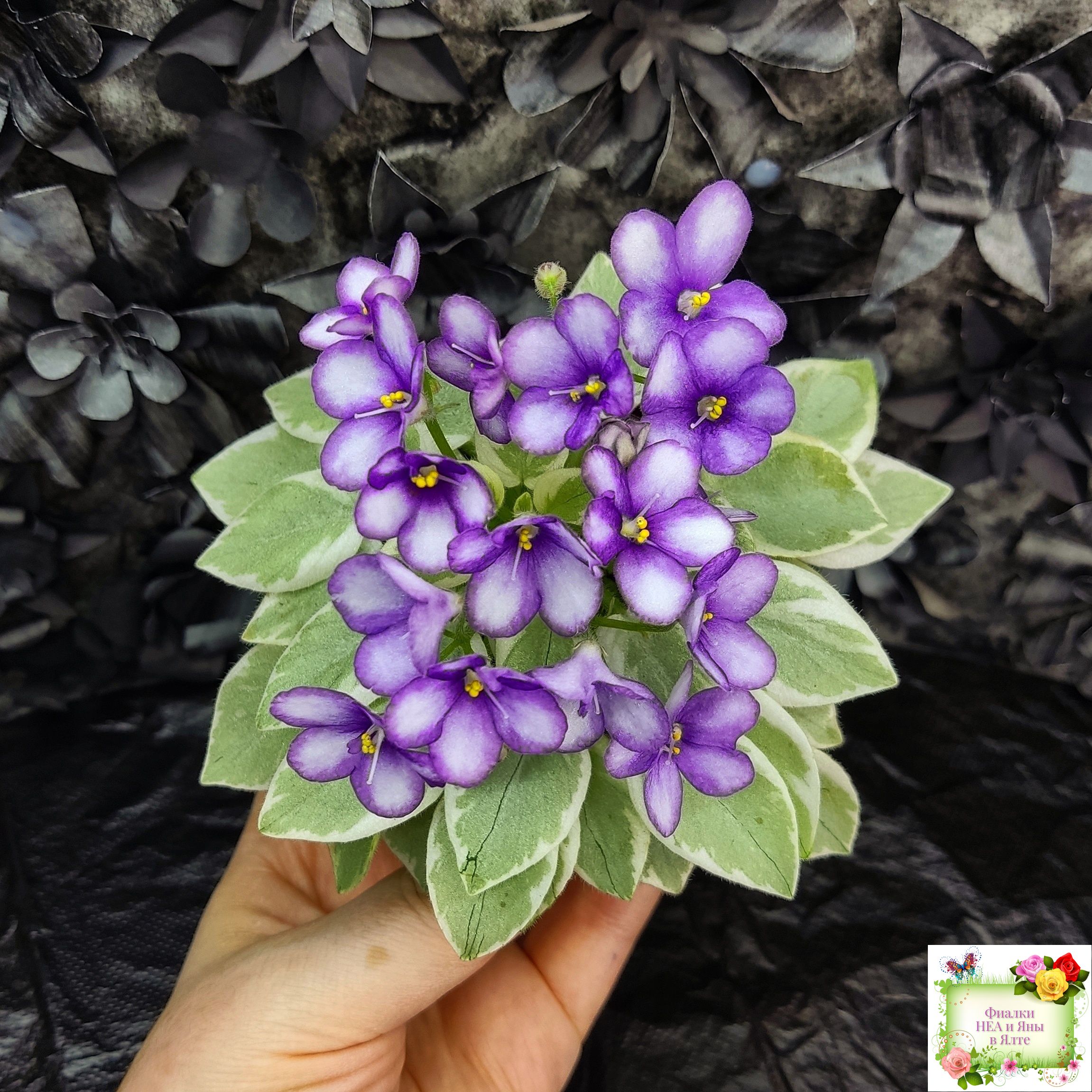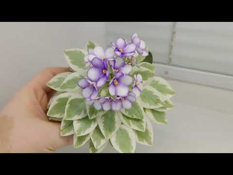 Semidouble white pansy/dark blue eye, variable thin blue edge.Variegated light-medium green and white, pointed, glossy. Sucker propagation only. Miniature.