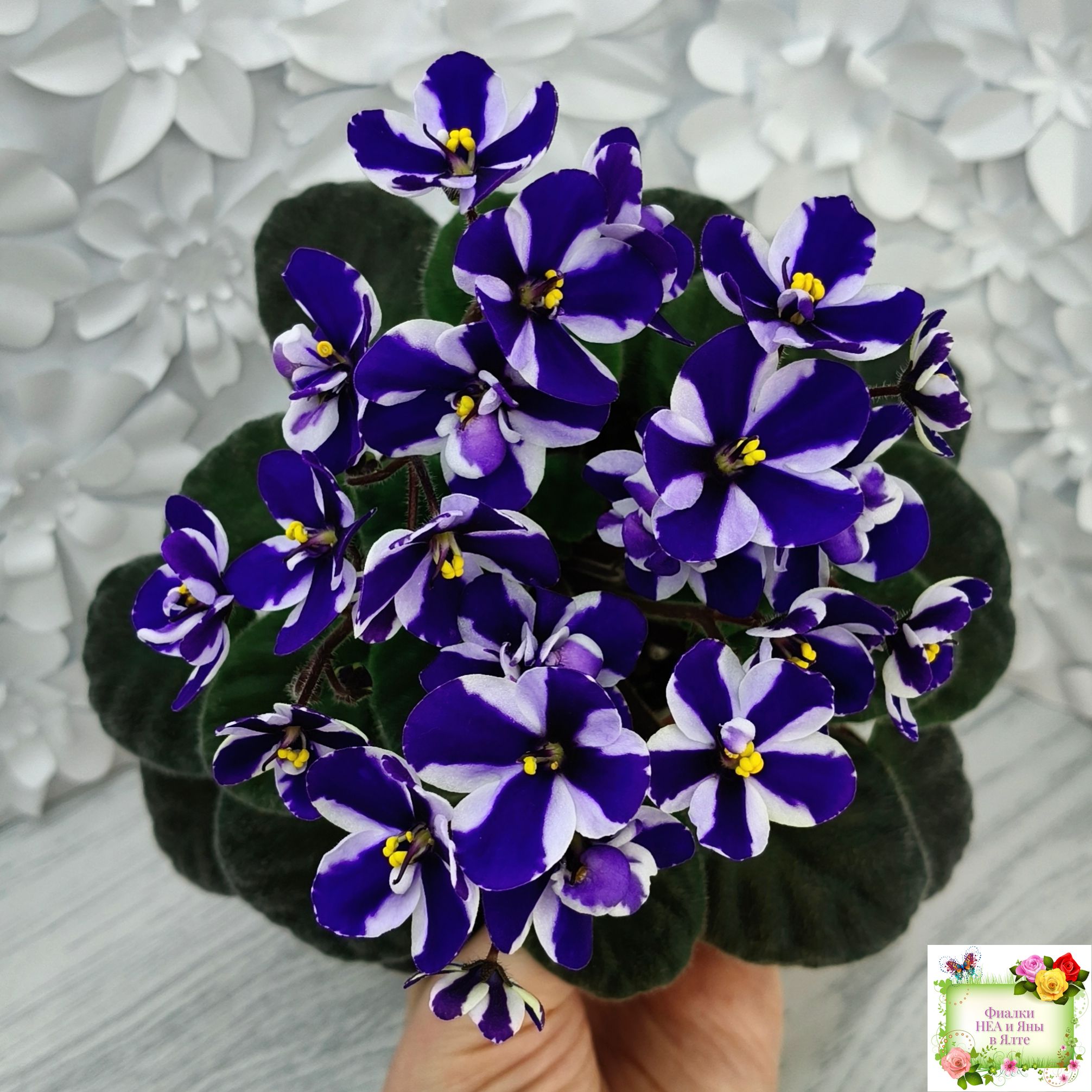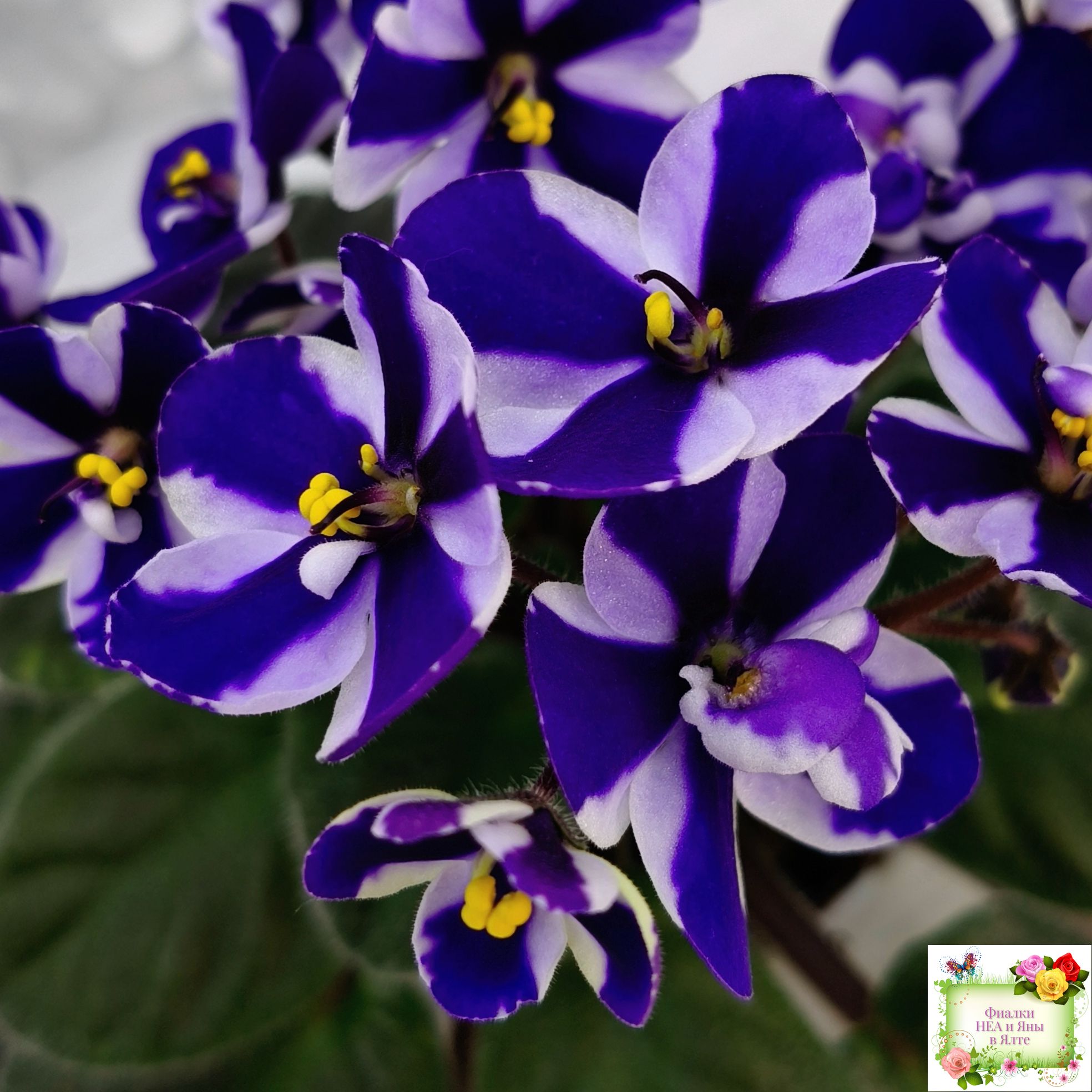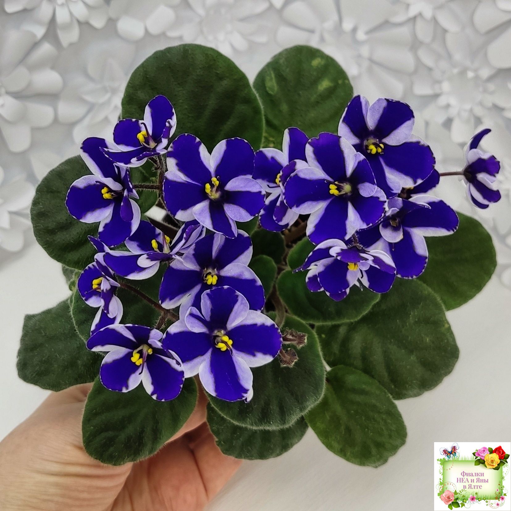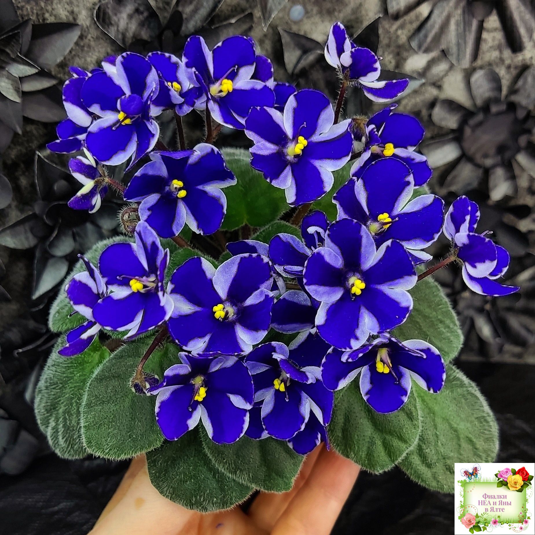 Простые и полумахровые очень крупные анютины глазки густого синего цвета с узкими белыми полосами по краю. Стеганая темно-зеленая блестящая листва. Малый стандарт.