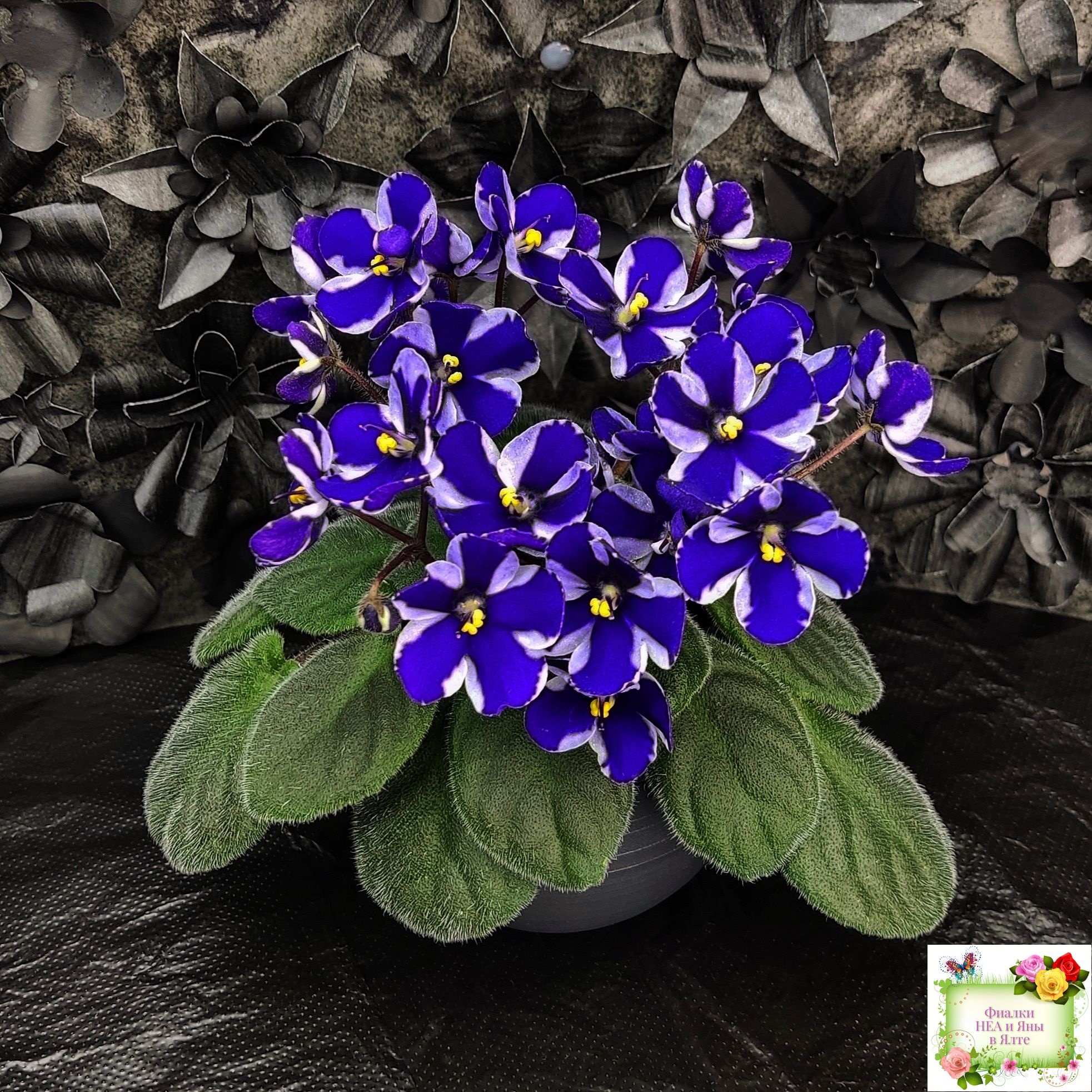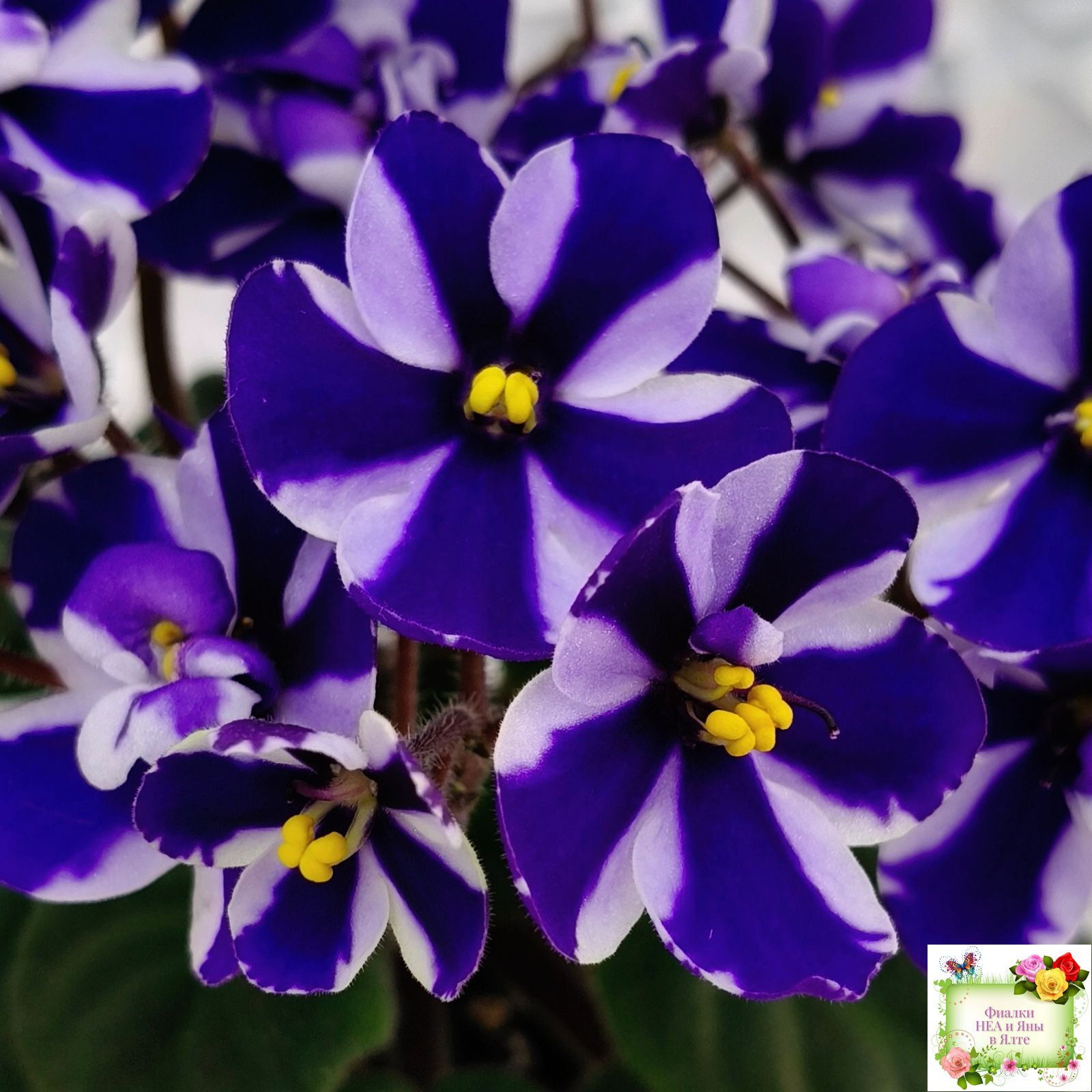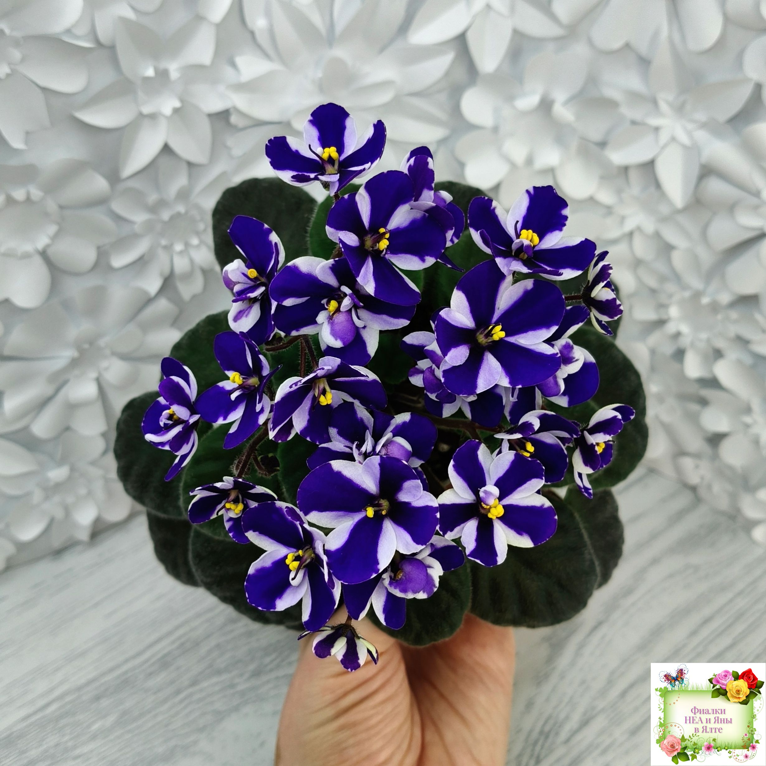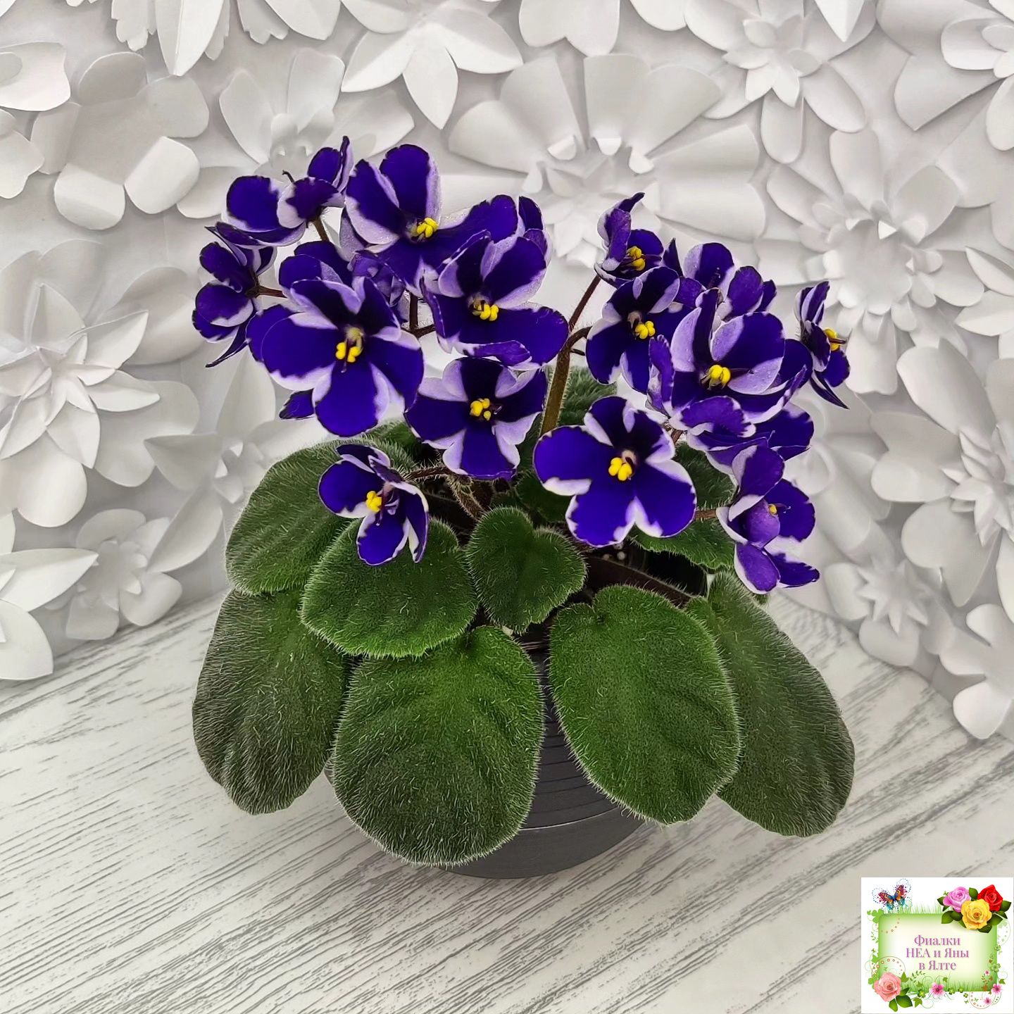 Простые и полумахровые очень крупные анютины глазки густого синего цвета с узкими белыми полосами по краю. Стеганая темно-зеленая блестящая листва. Малый стандарт.