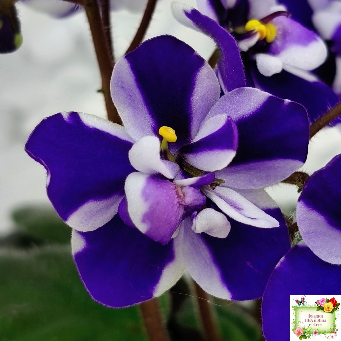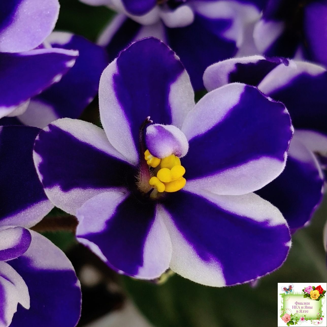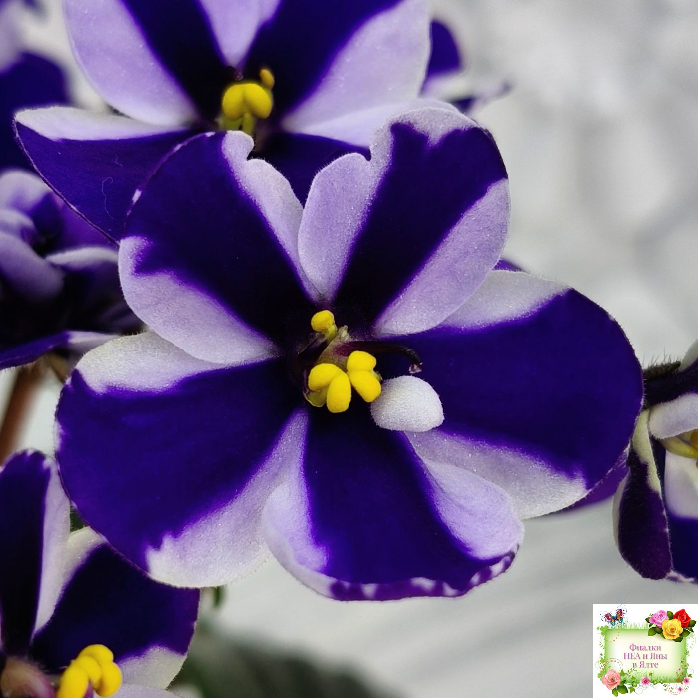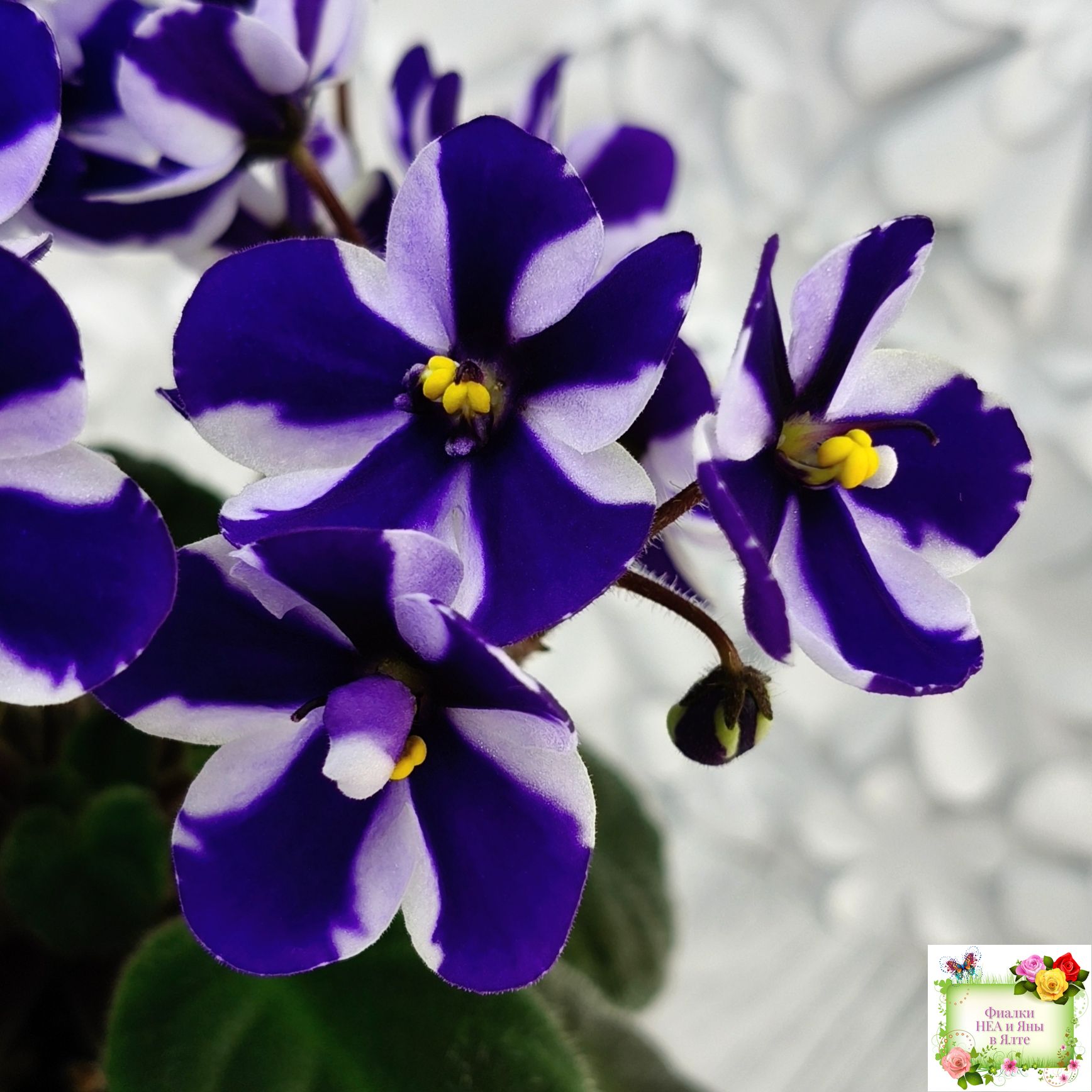 Простые и полумахровые очень крупные анютины глазки густого синего цвета с узкими белыми полосами по краю. Стеганая темно-зеленая блестящая листва. Малый стандарт.
