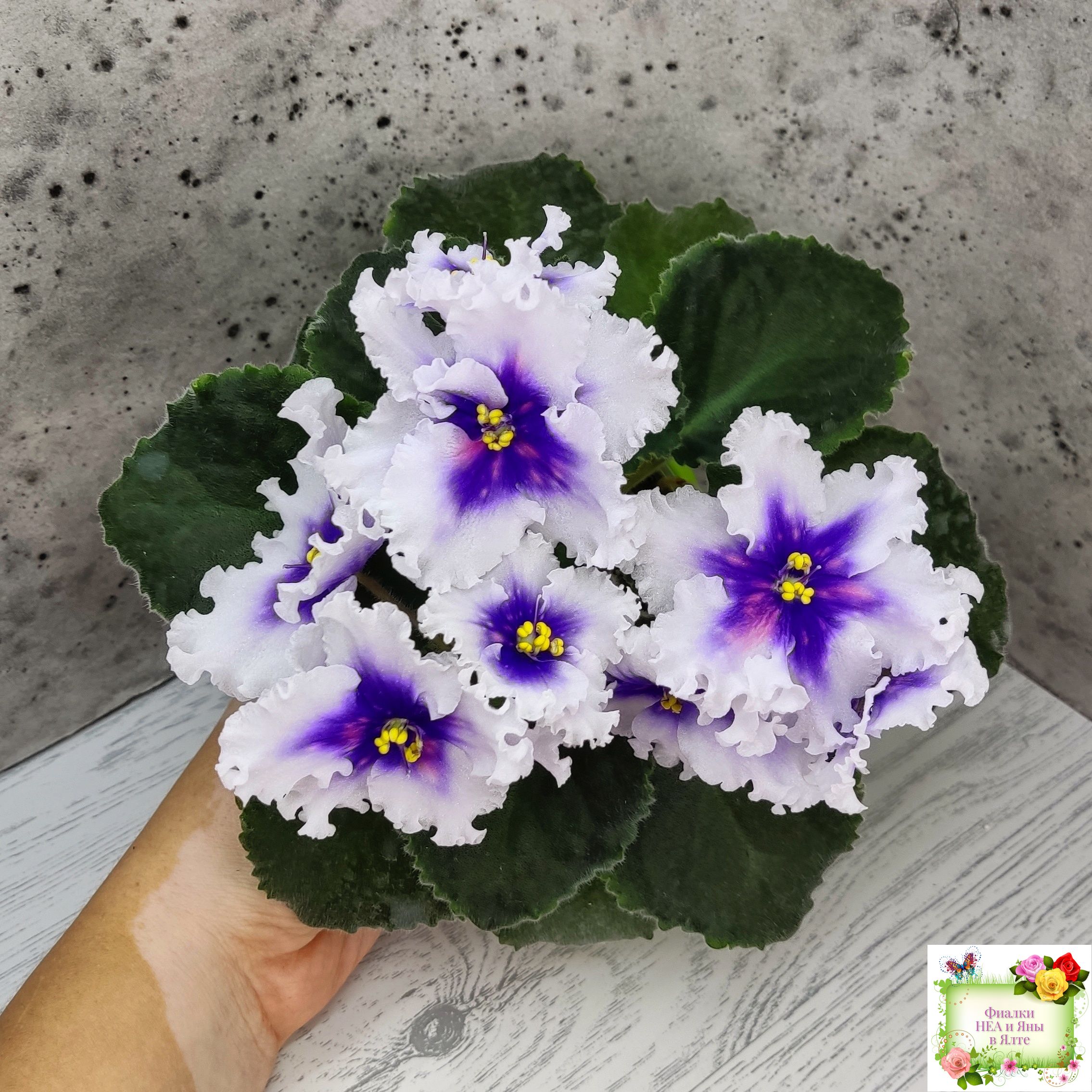 Крупные простые белые звезды с волнистым краем, глазок фиолетовый с яркими розовыми горошинками