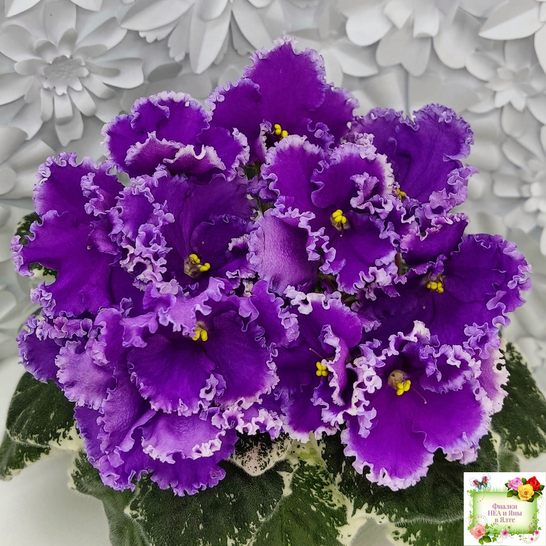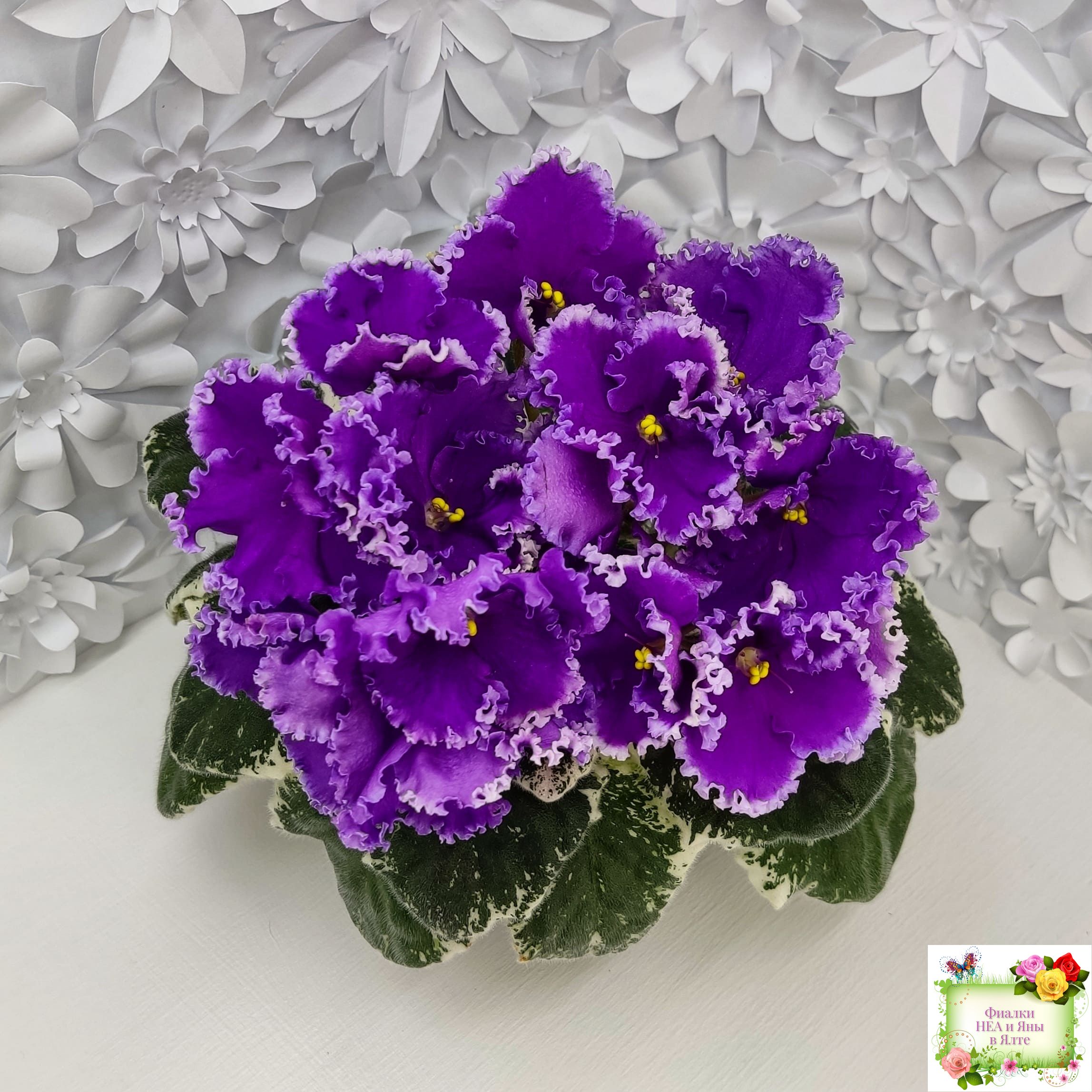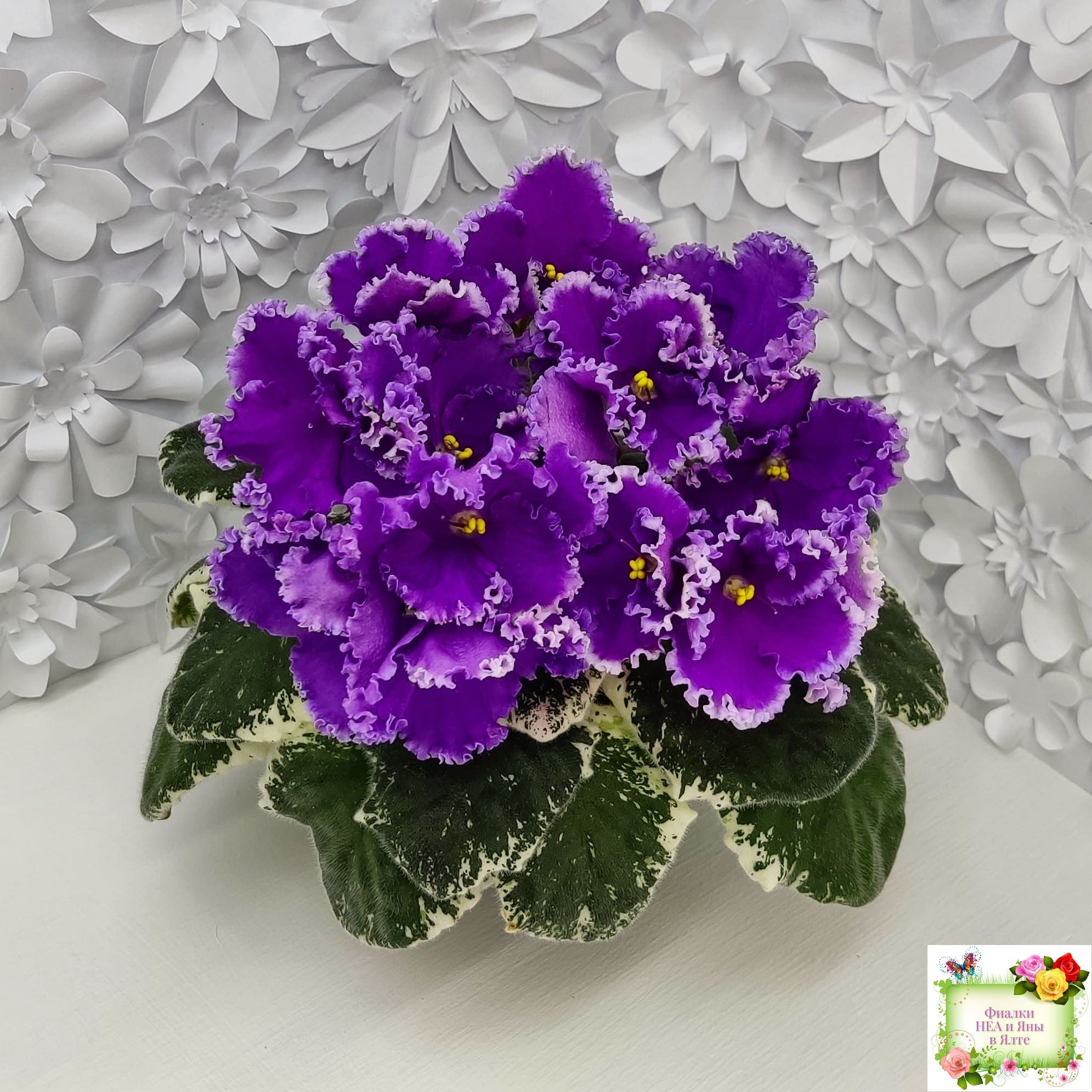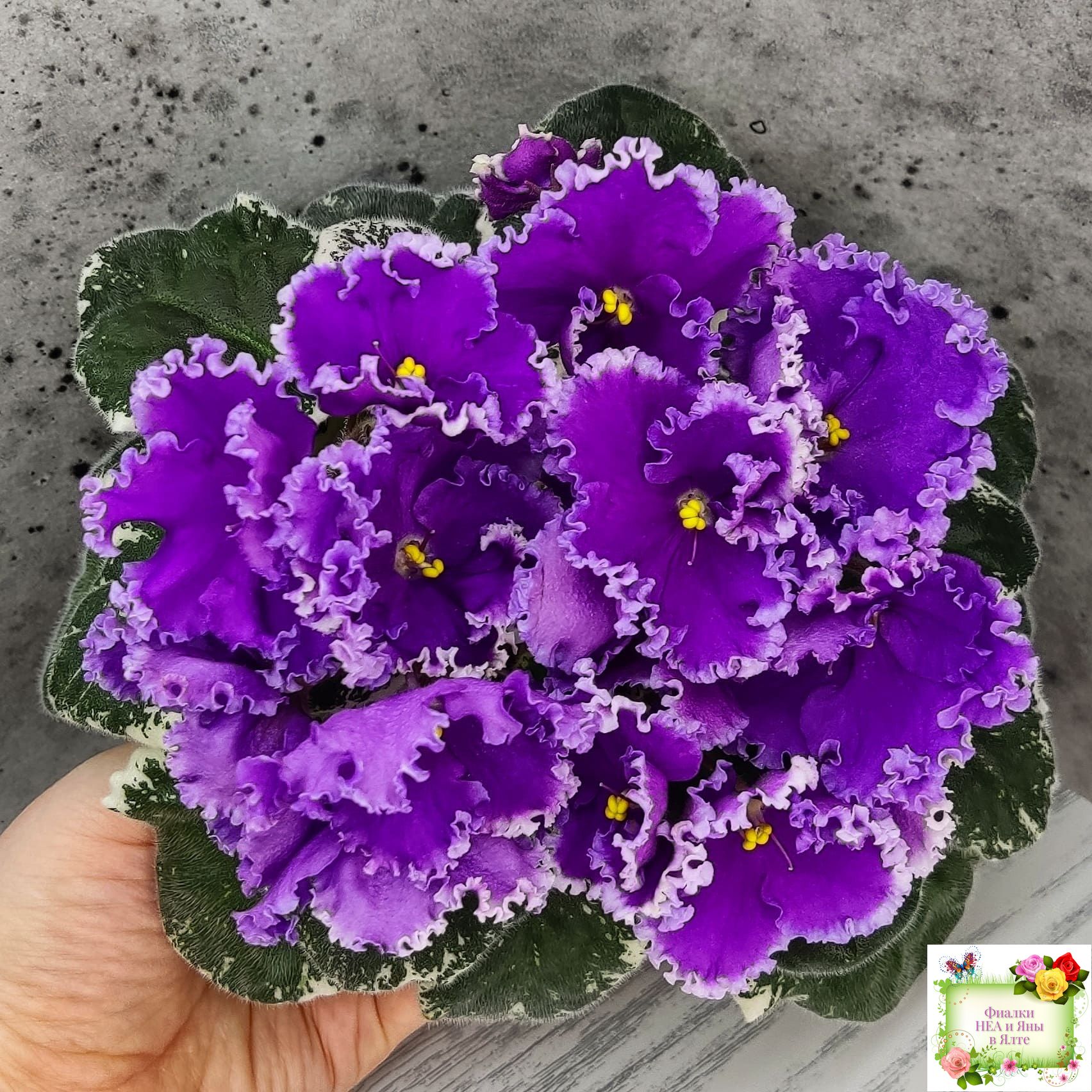 Крупные яркие фиолетовые анютины глазки с широкой осветленной бахромой. Пестролистная стандартная розетка.