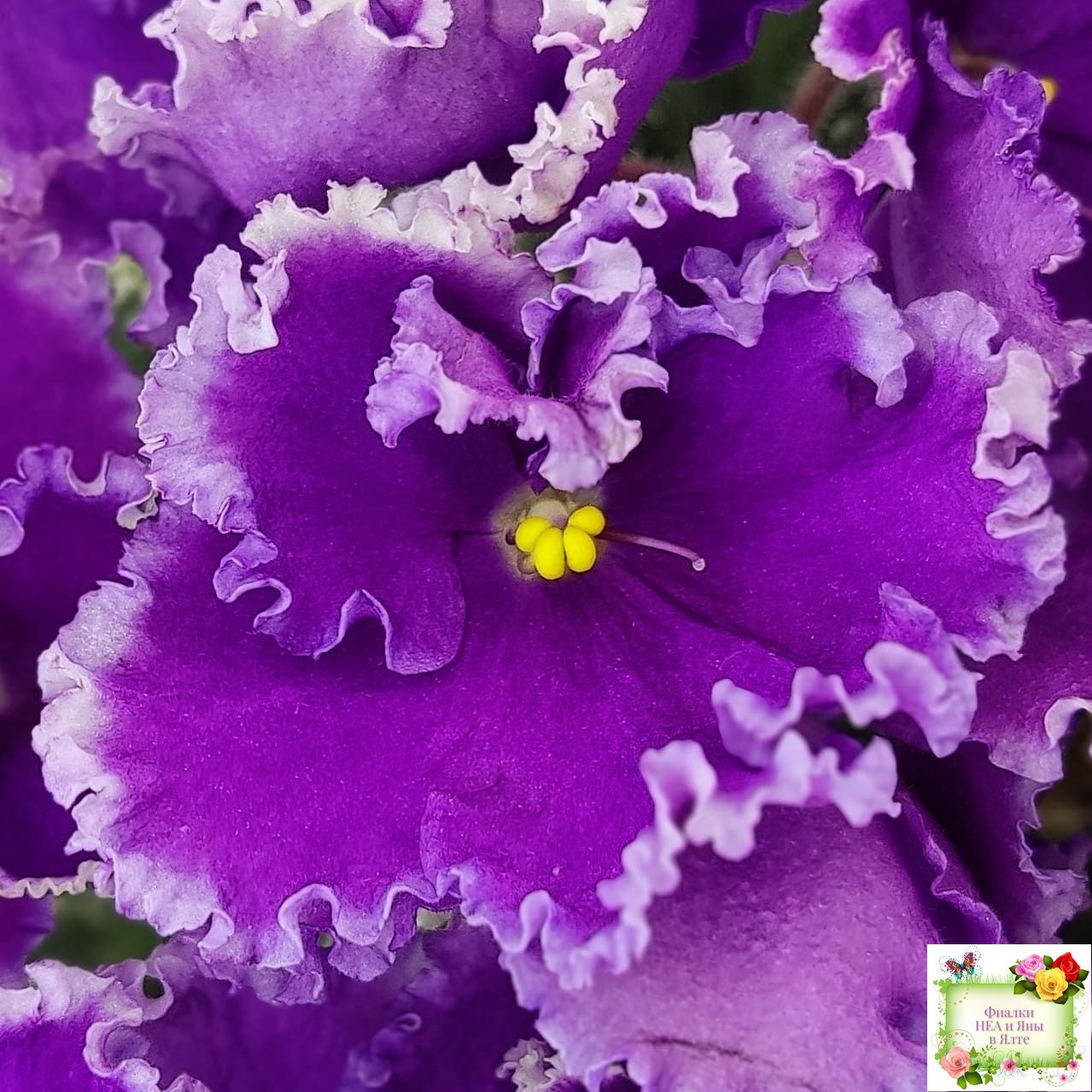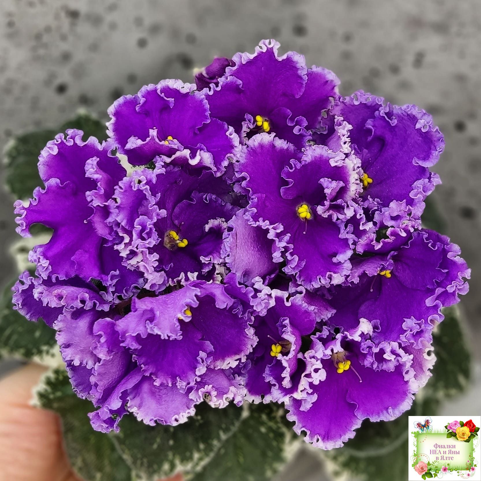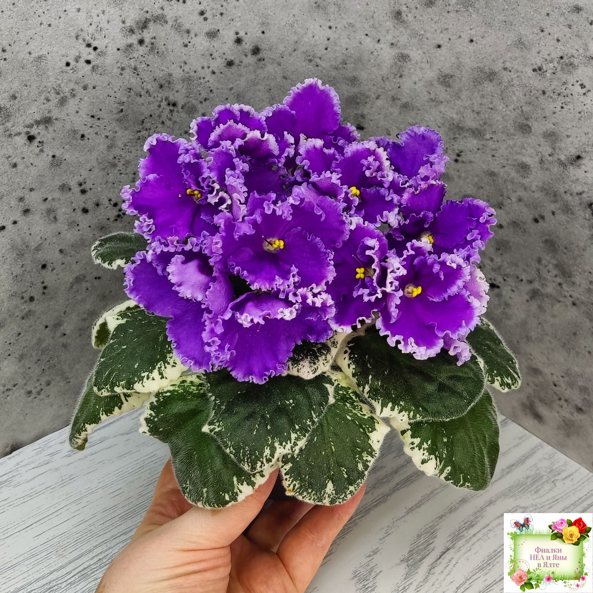 Крупные яркие фиолетовые анютины глазки с широкой осветленной бахромой. Пестролистная стандартная розетка.