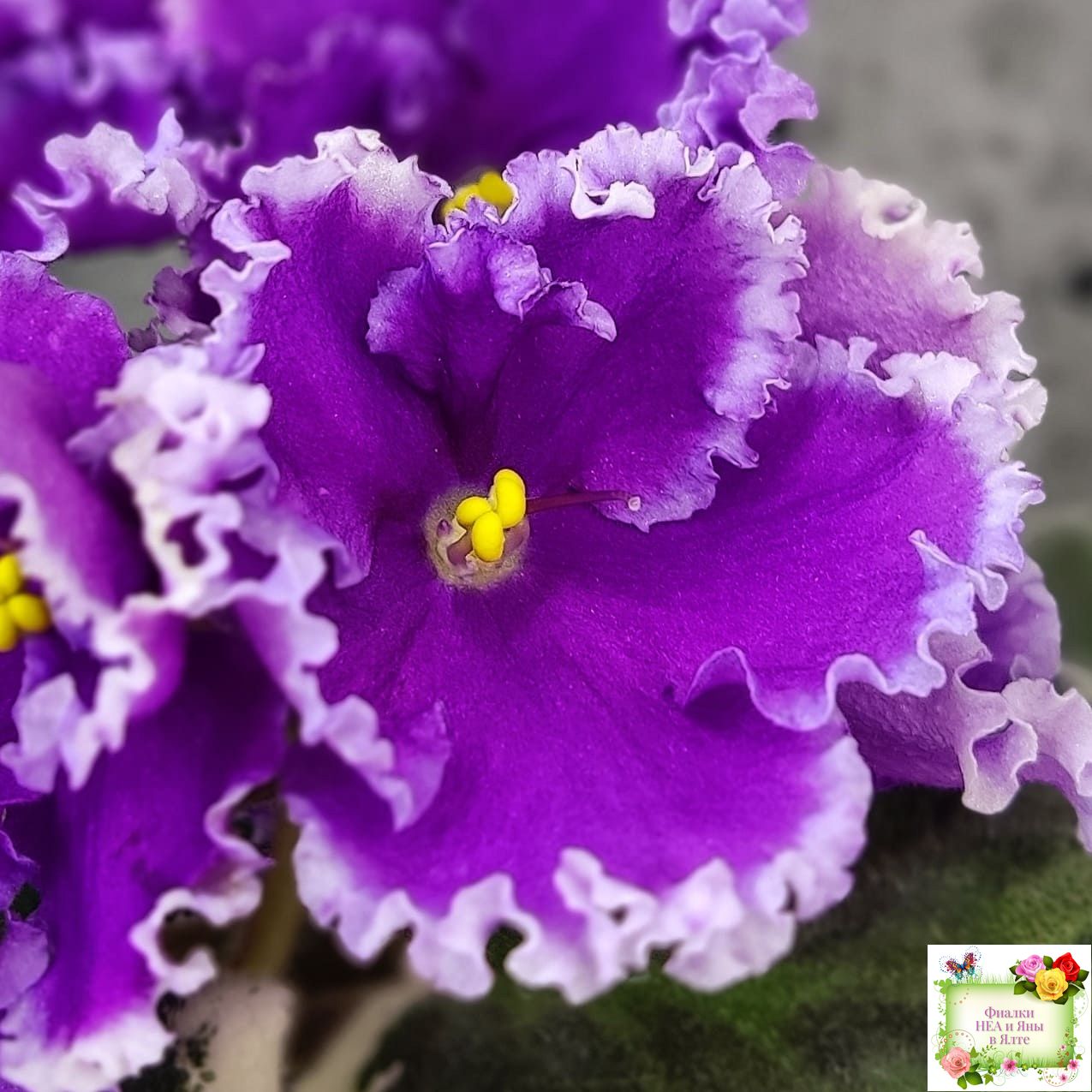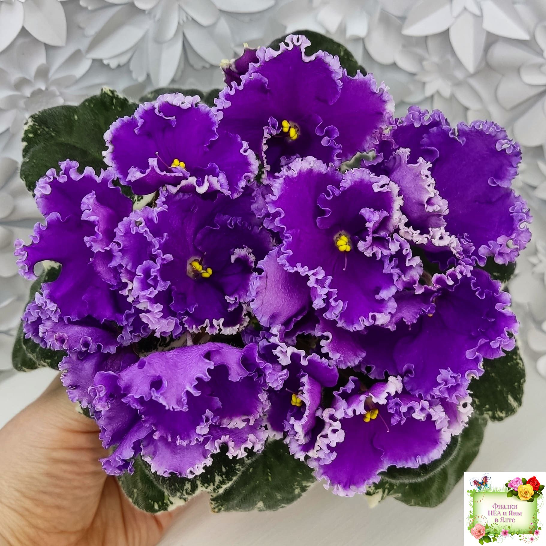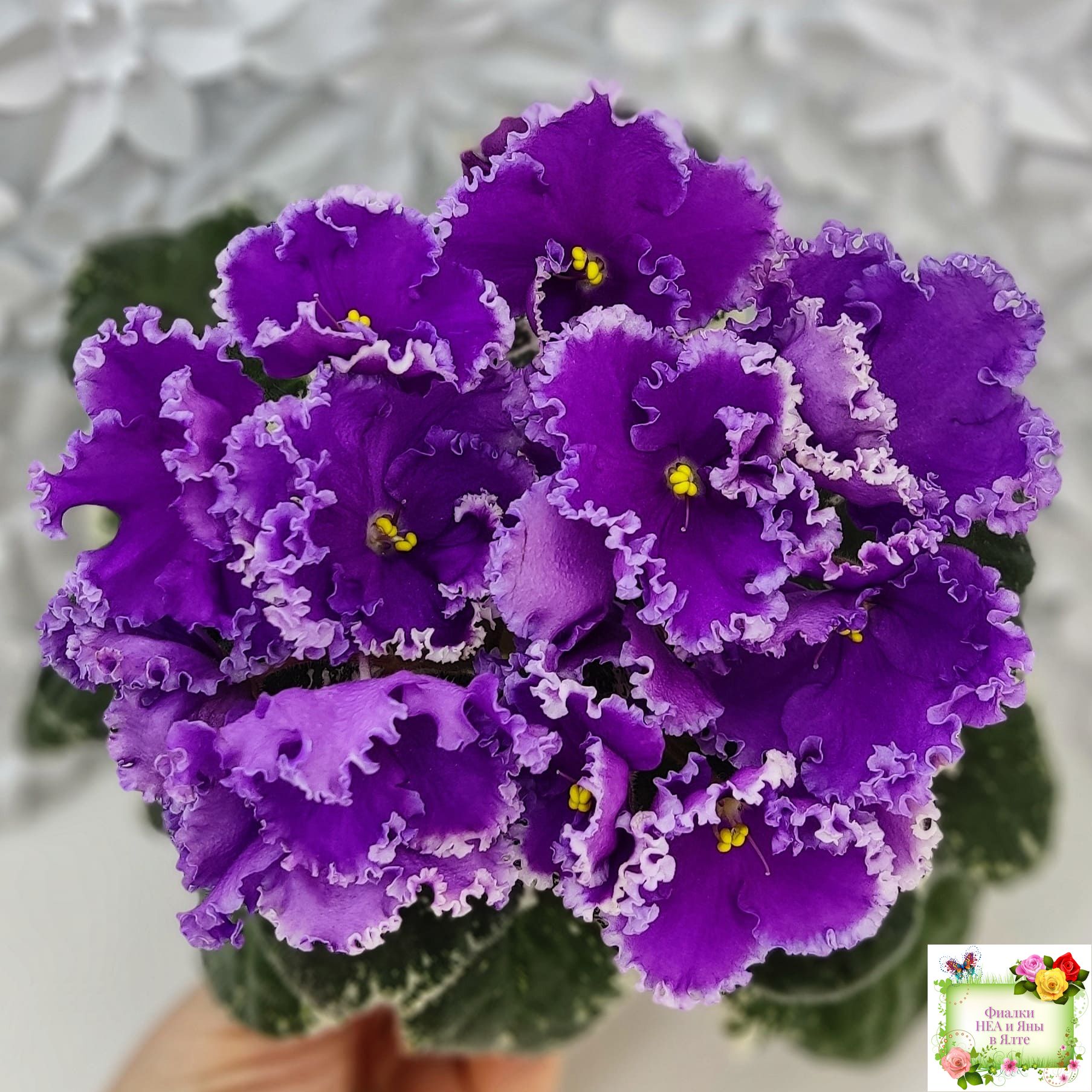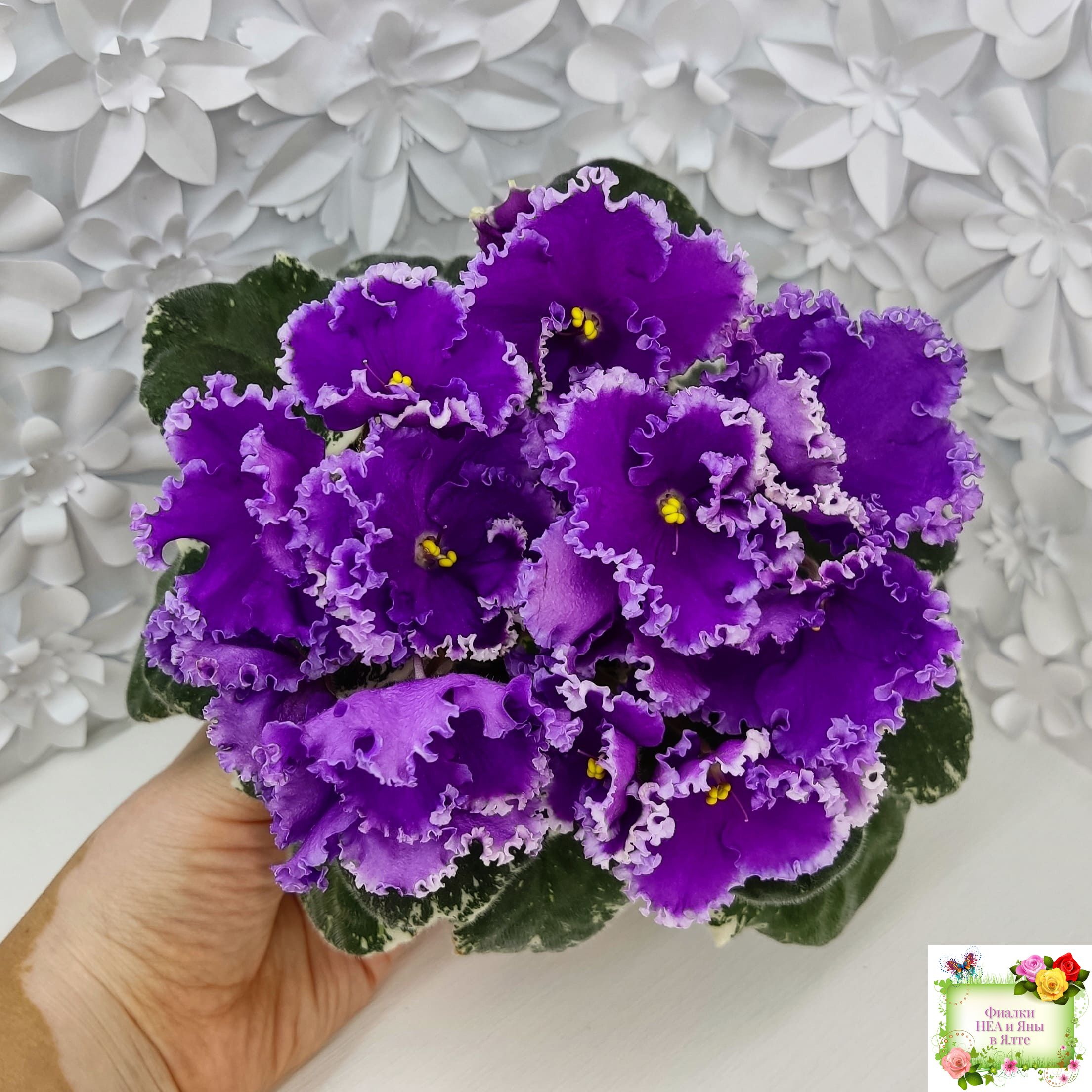 Крупные яркие фиолетовые анютины глазки с широкой осветленной бахромой. Пестролистная стандартная розетка.