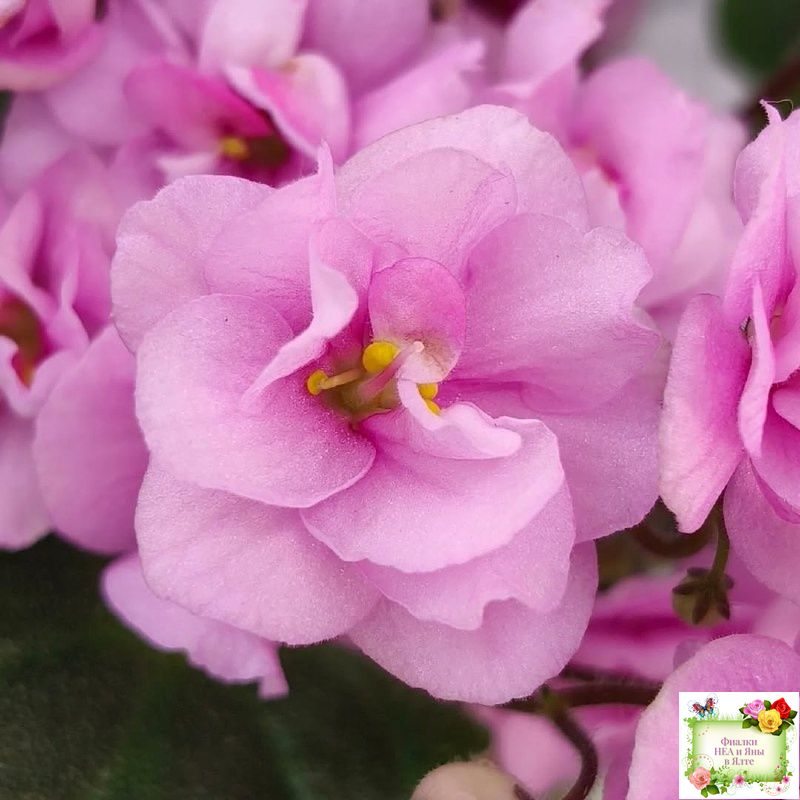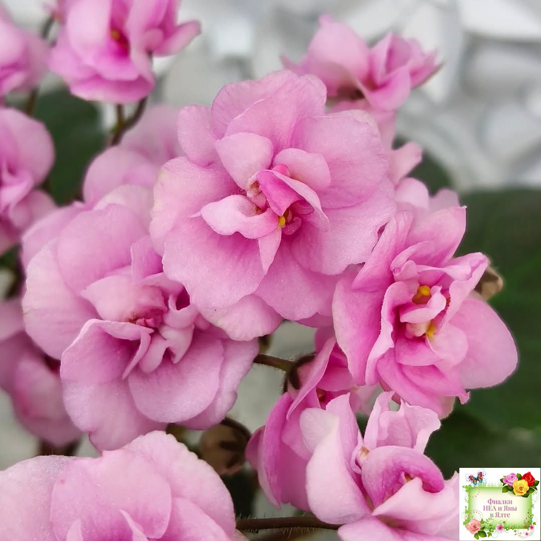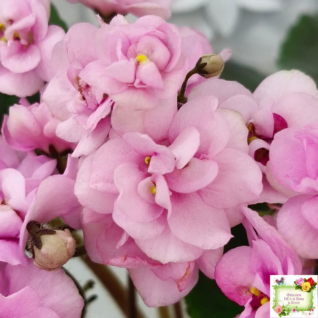 Махровые бледно-розовые цветы над средне- зелёной, сердцеобразной, заострённой листвой. Постоянно цветущий сорт. Стандартный кустовой трейлер.