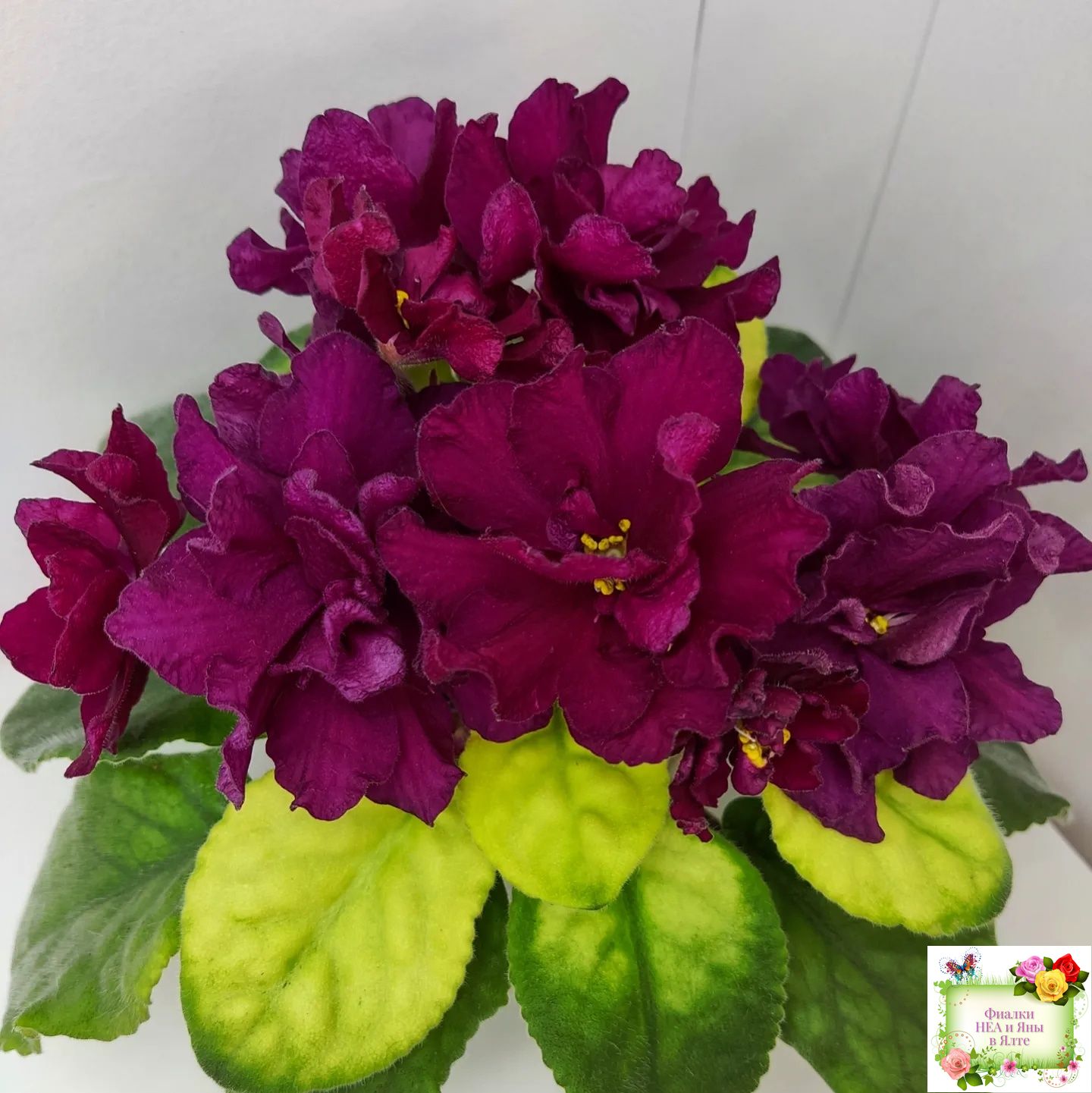 Мутация от сорта ЕК-Бой Быков 2006 г. Огромнейшие (8см) полумахровые тёмно-кроваво-красные звёзды. Красивейший выставочный пестролистник, центр розетки полностью бело-лимонный. Огромные красные цветы на лимонной листве! Супер!