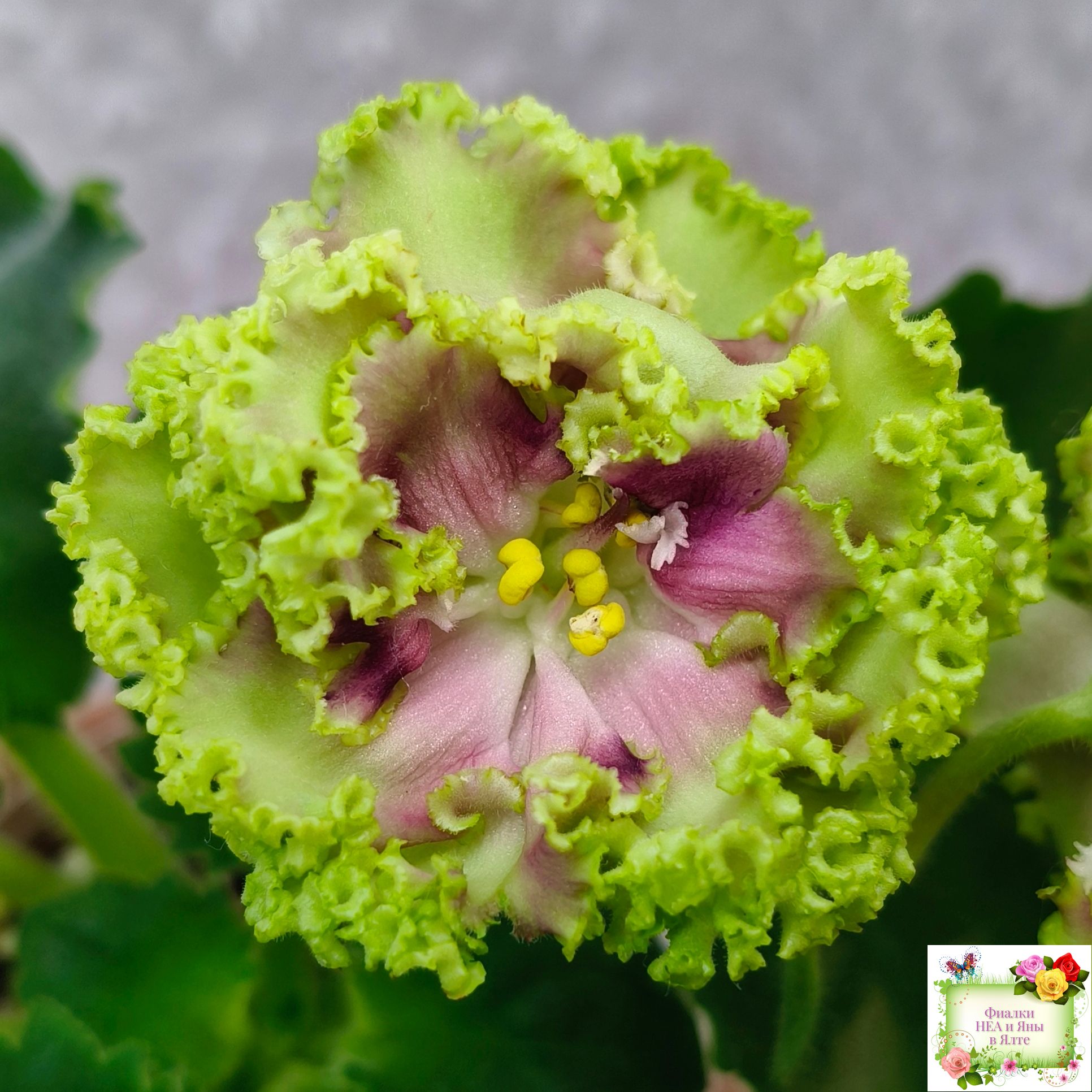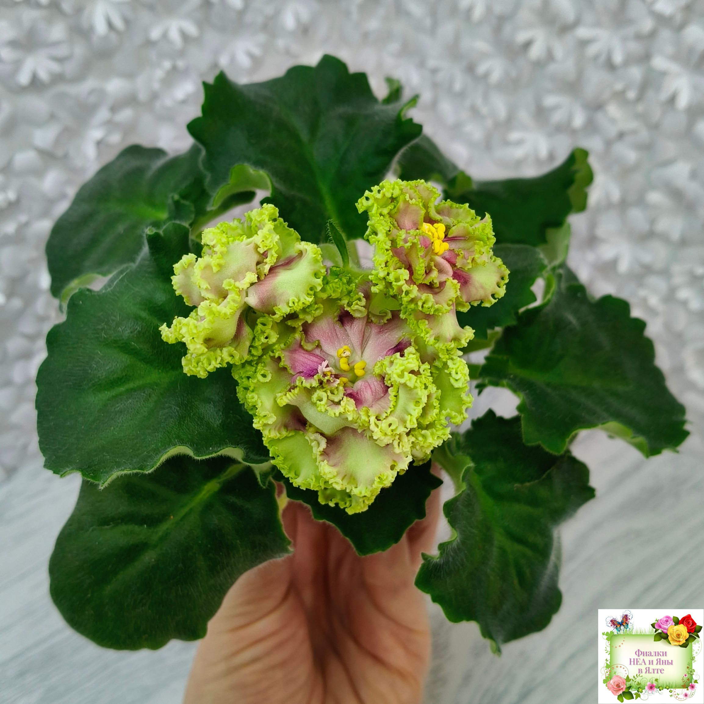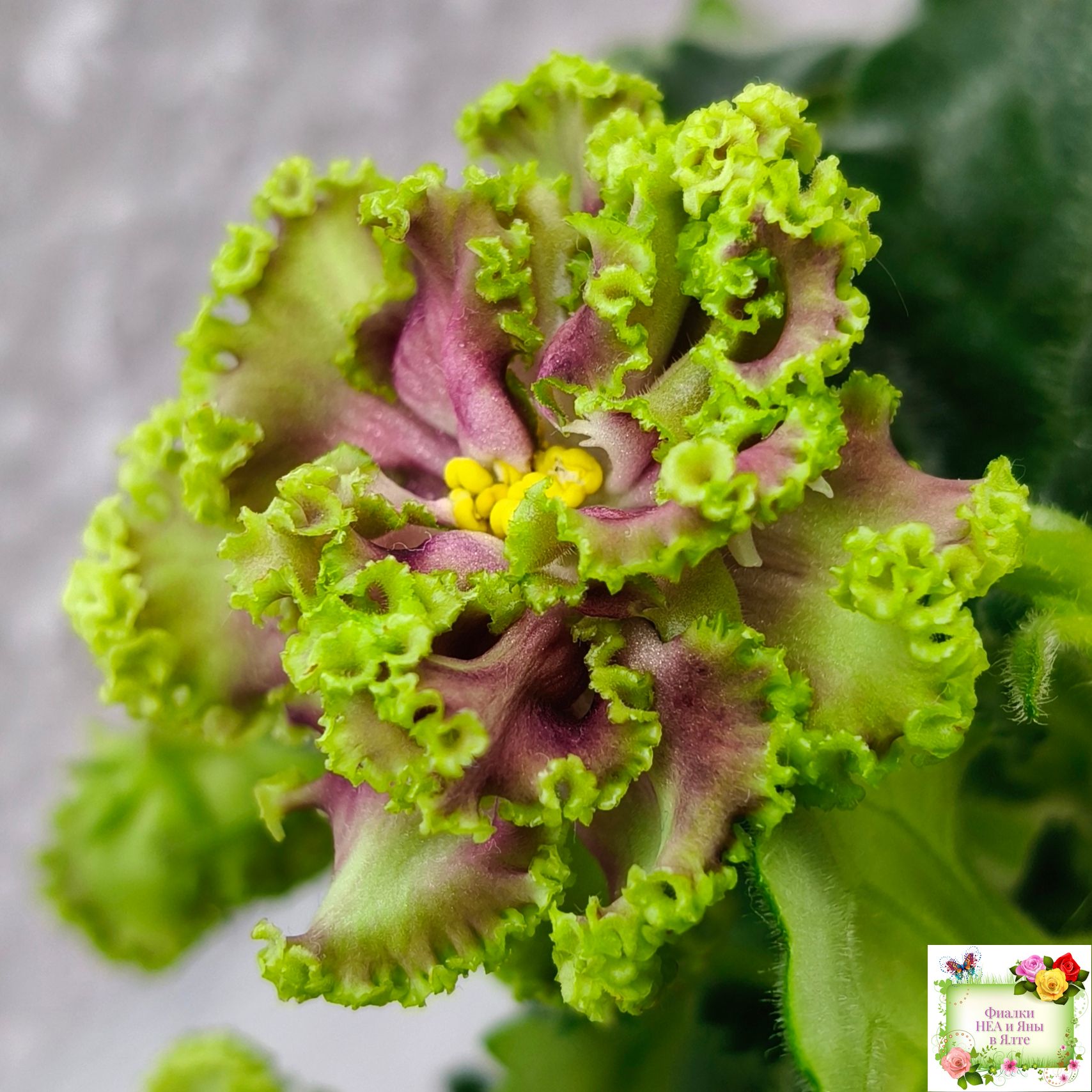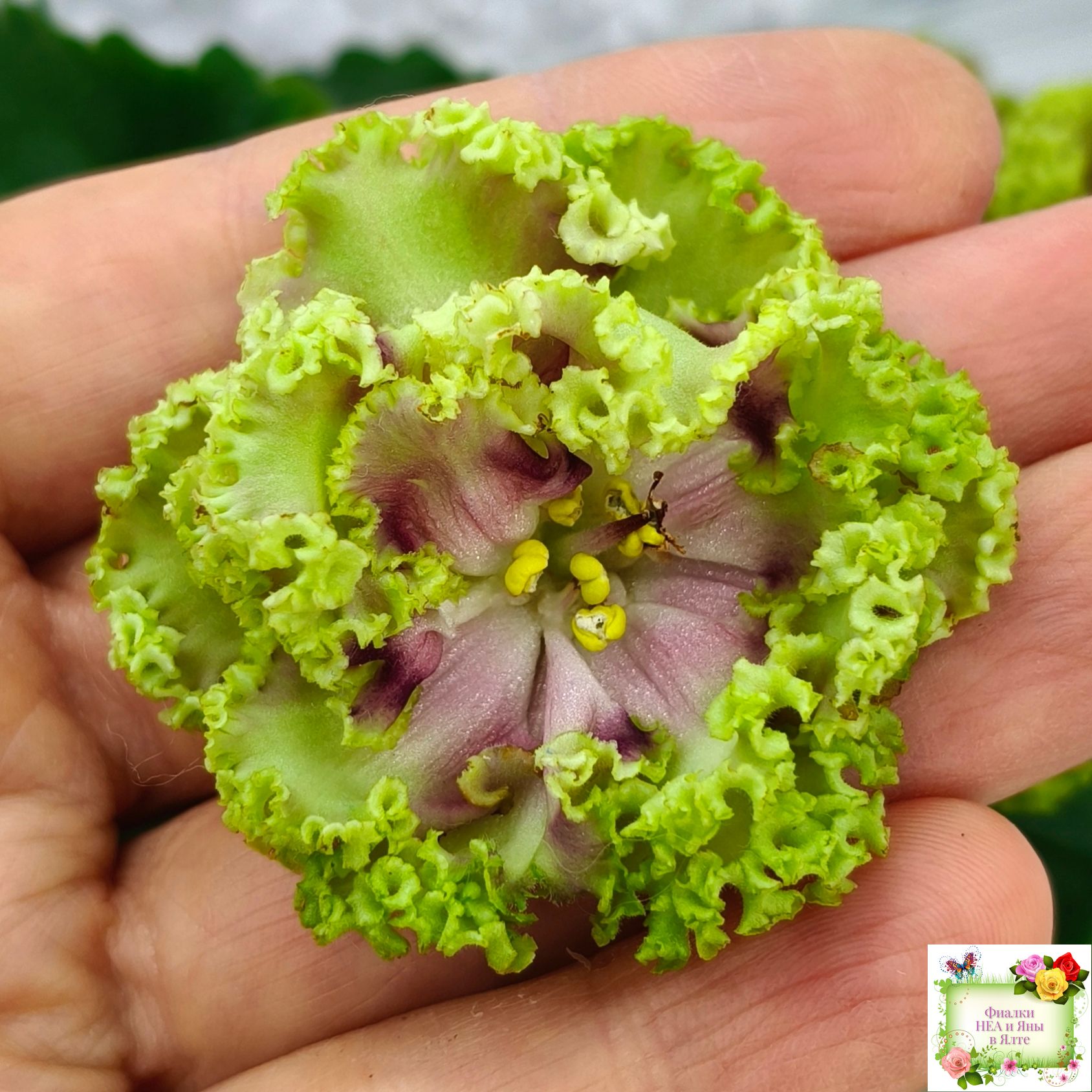 Очень крупные махровые густо-бахромчатые салатовые цветки. В центре цветка беловатый глазок и пурпурная обводка. Хорошая розетка из слегка волнистых насыщенно-зелёных фестончатых листьев. Аналогов нет! (Описание автора сорта).