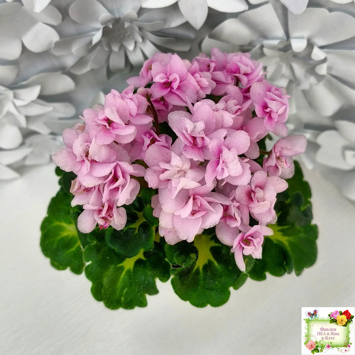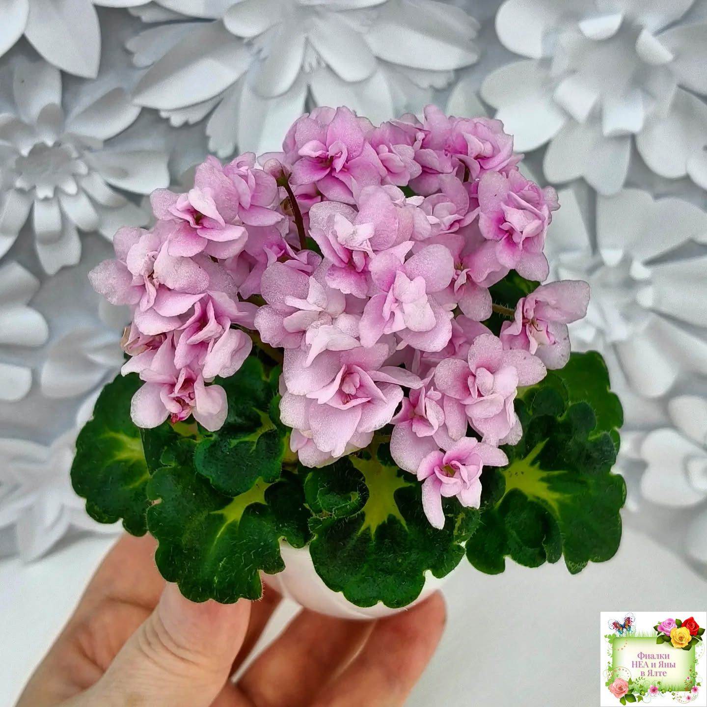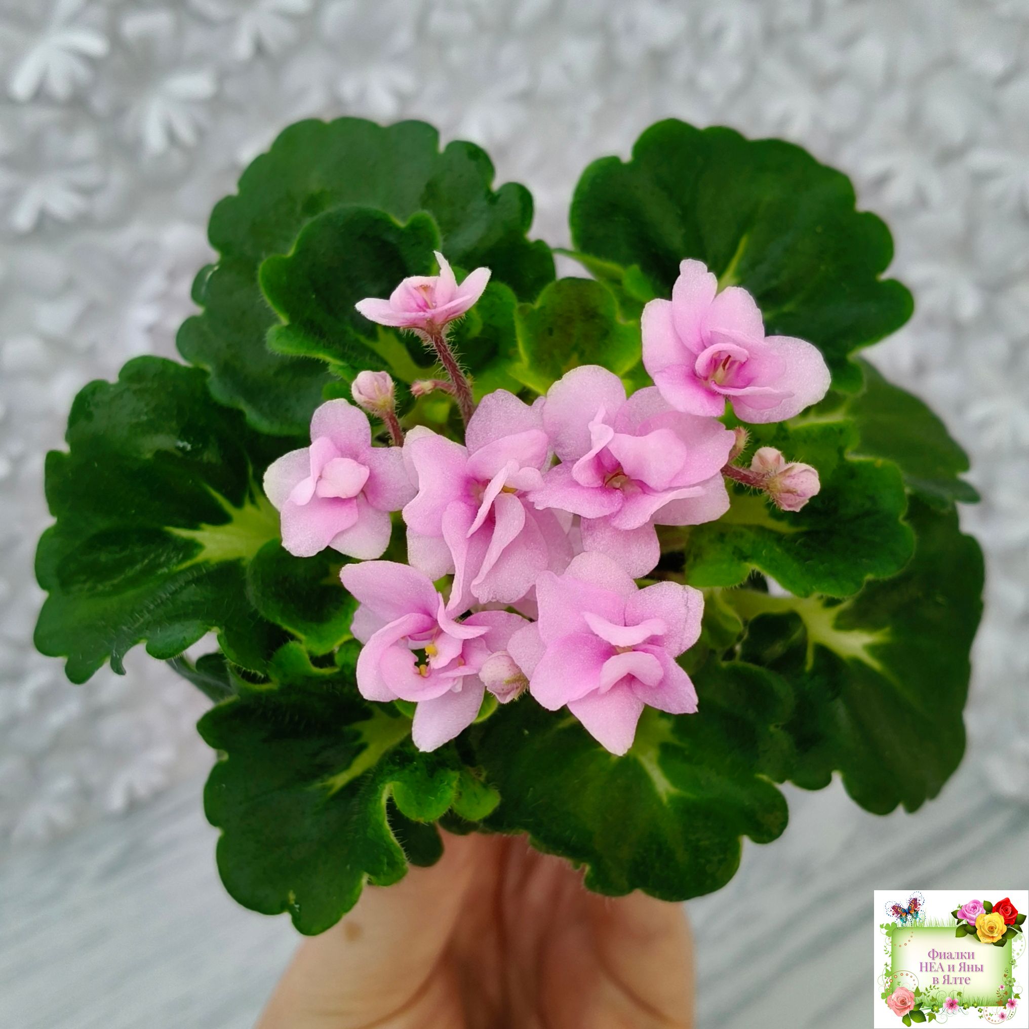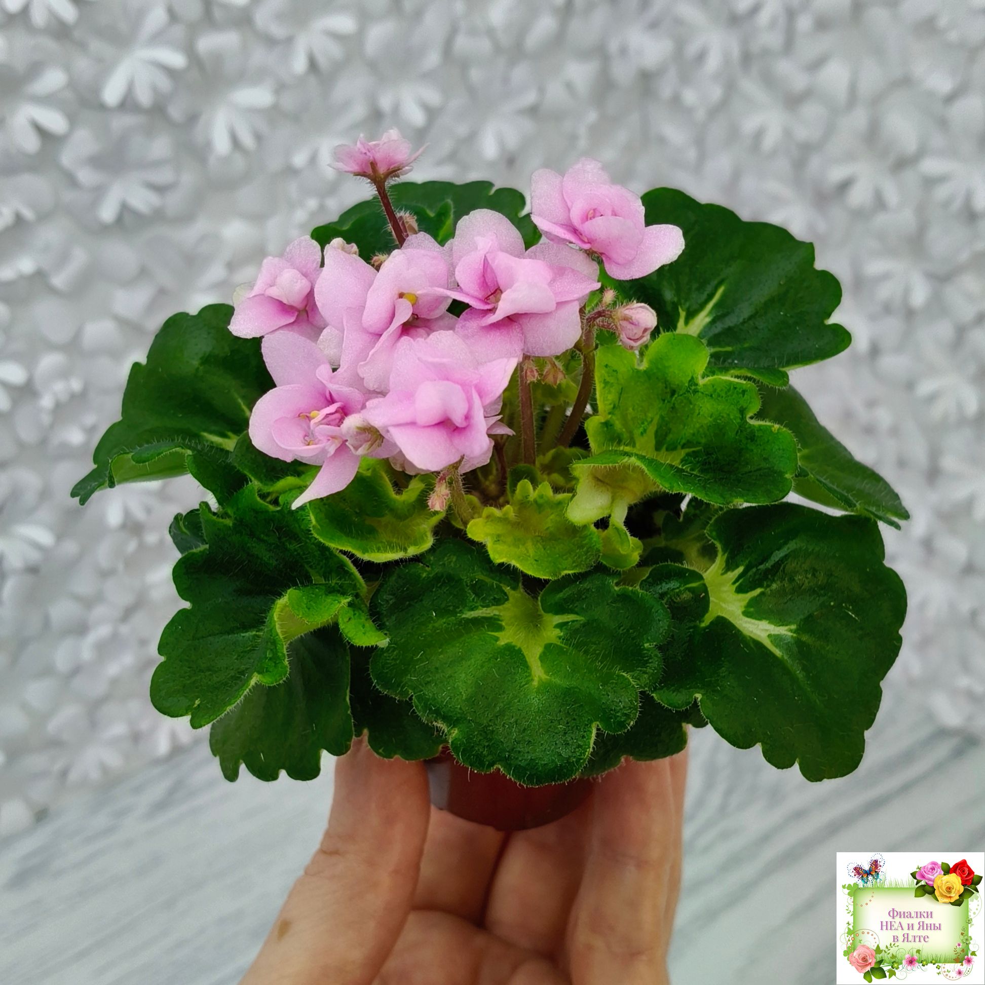 Махровые розовые цветы с бело-зеленой каймой. Золотистая кроновая пестролистность. Гел-листва с крупными фестонами. Миниатюра.