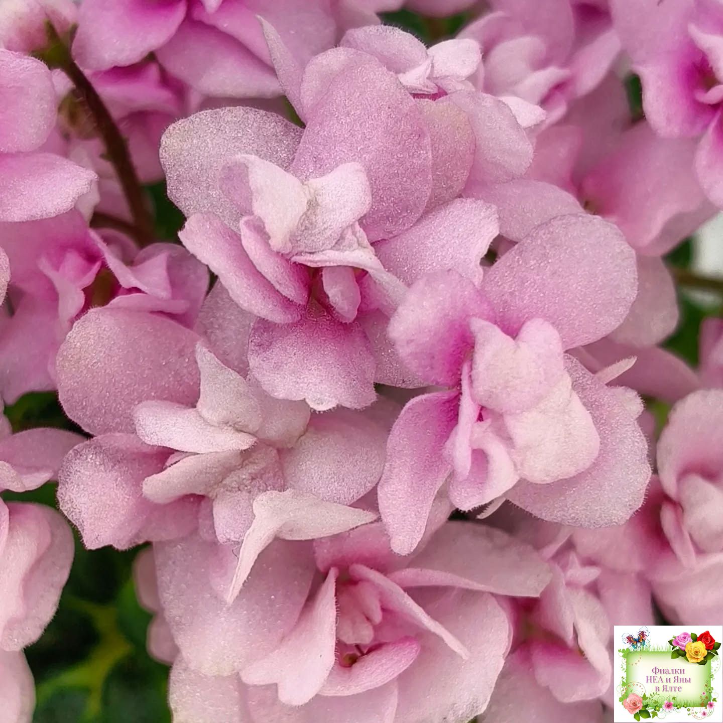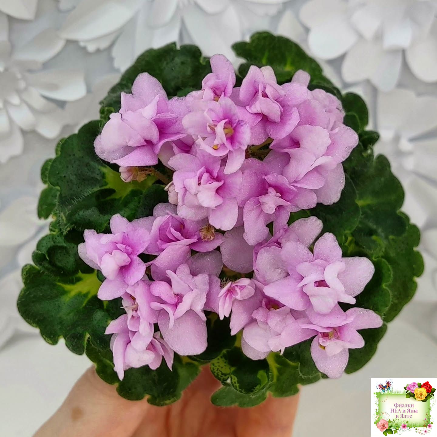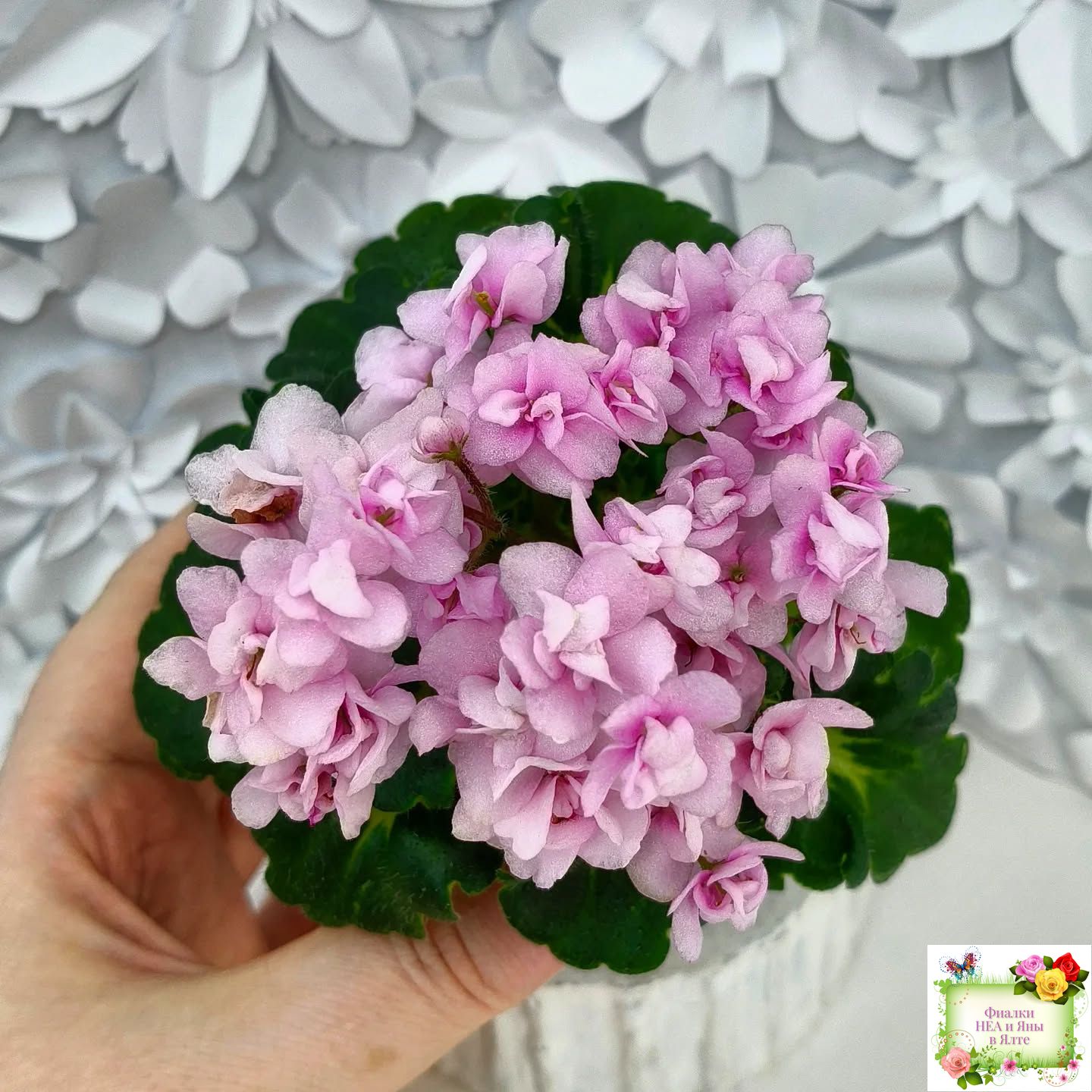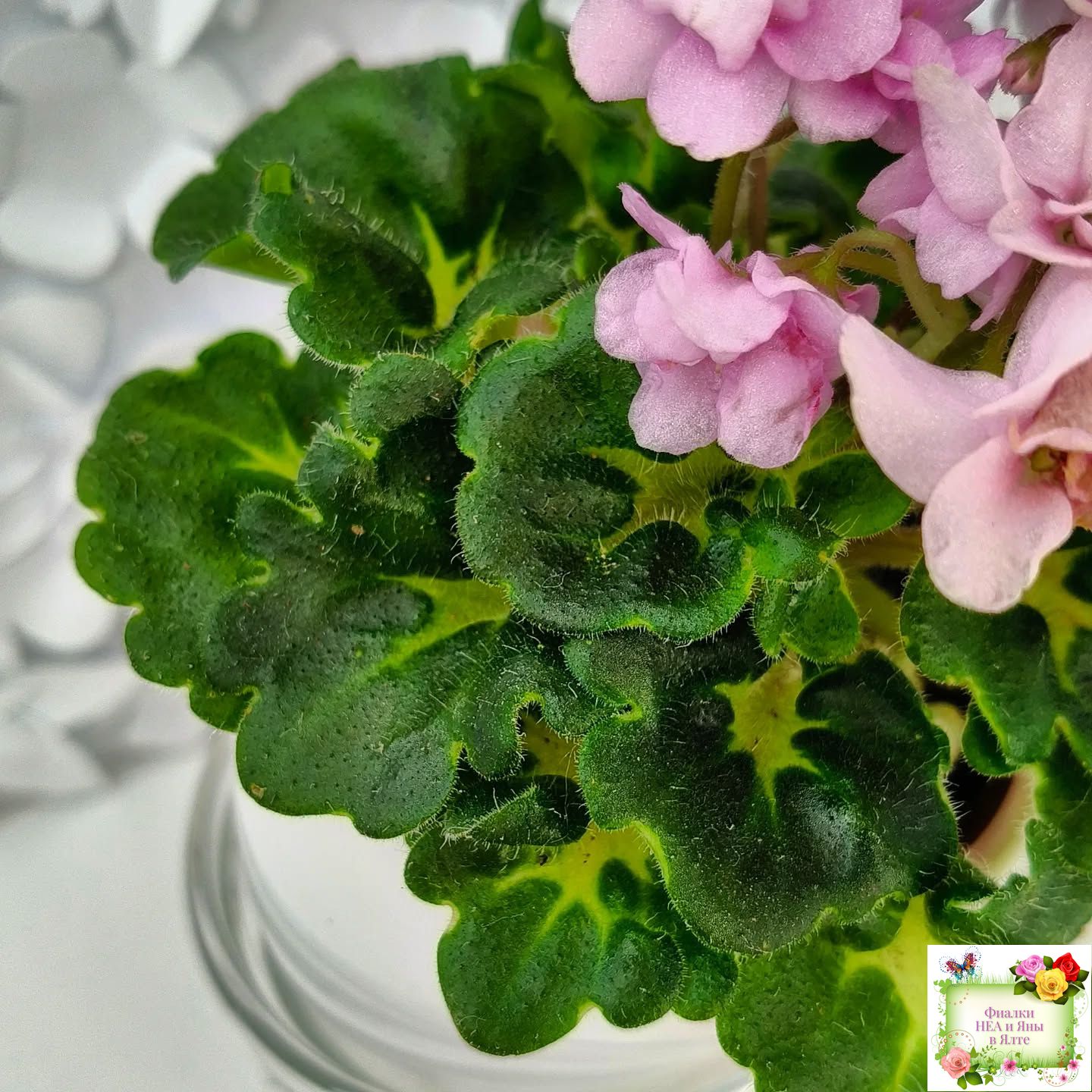 Махровые розовые цветы с бело-зеленой каймой. Золотистая кроновая пестролистность. Гел-листва с крупными фестонами. Миниатюра.