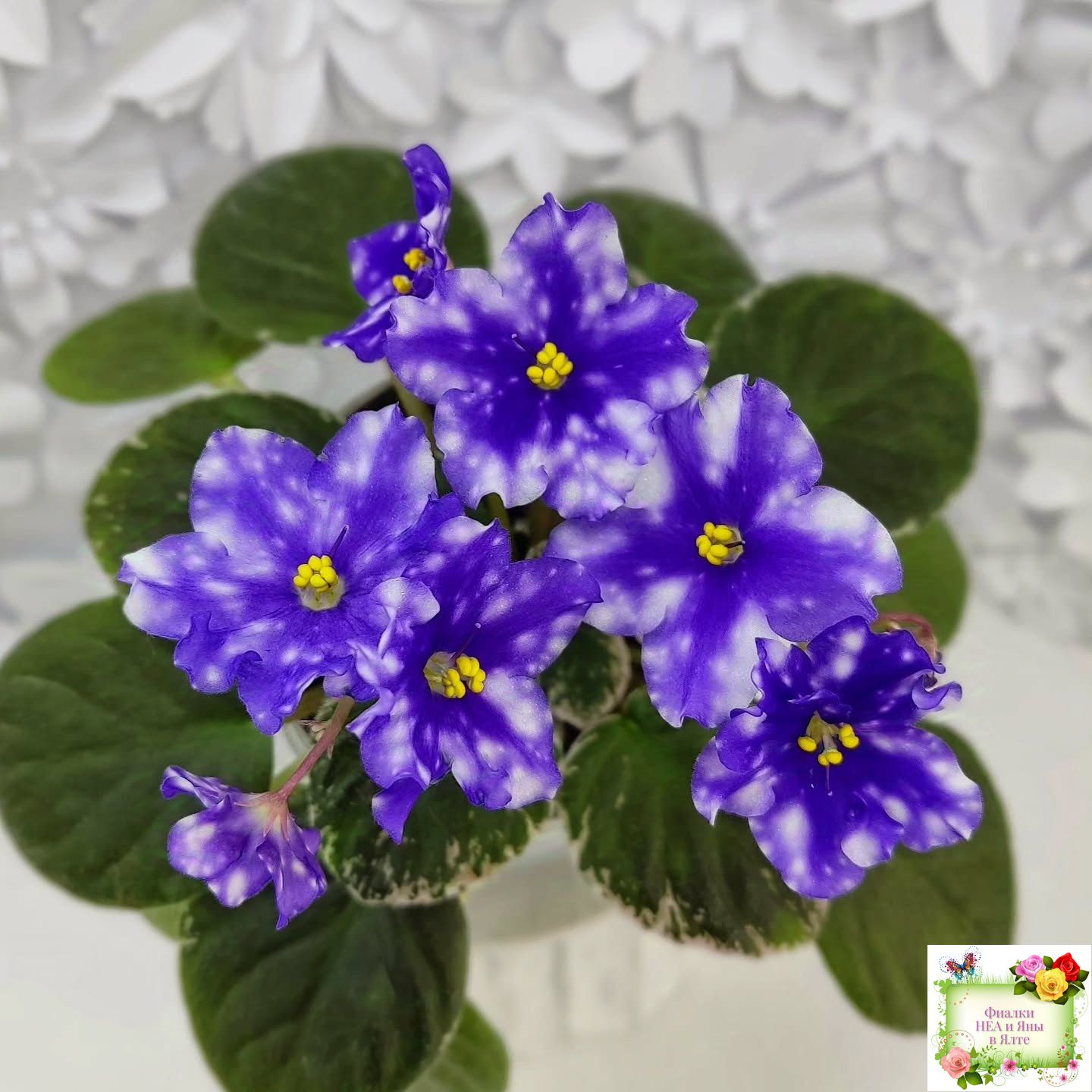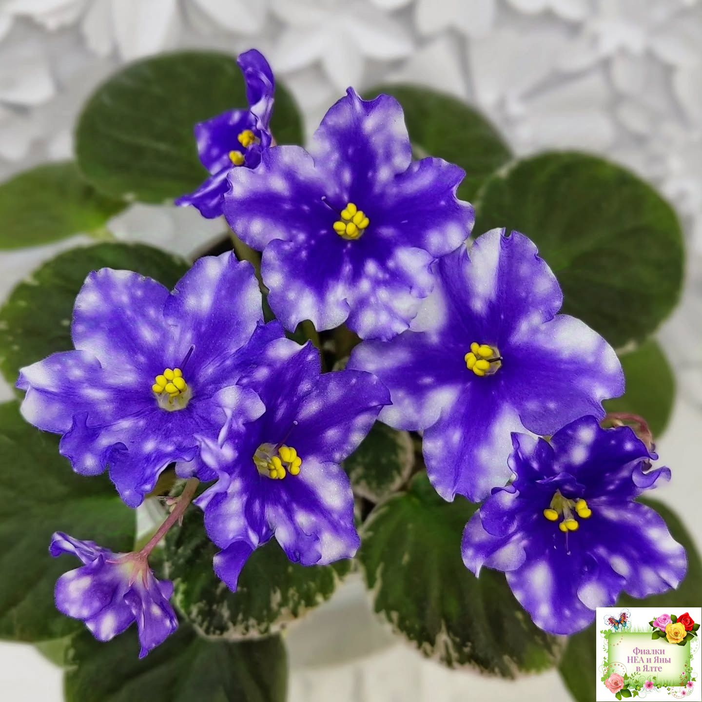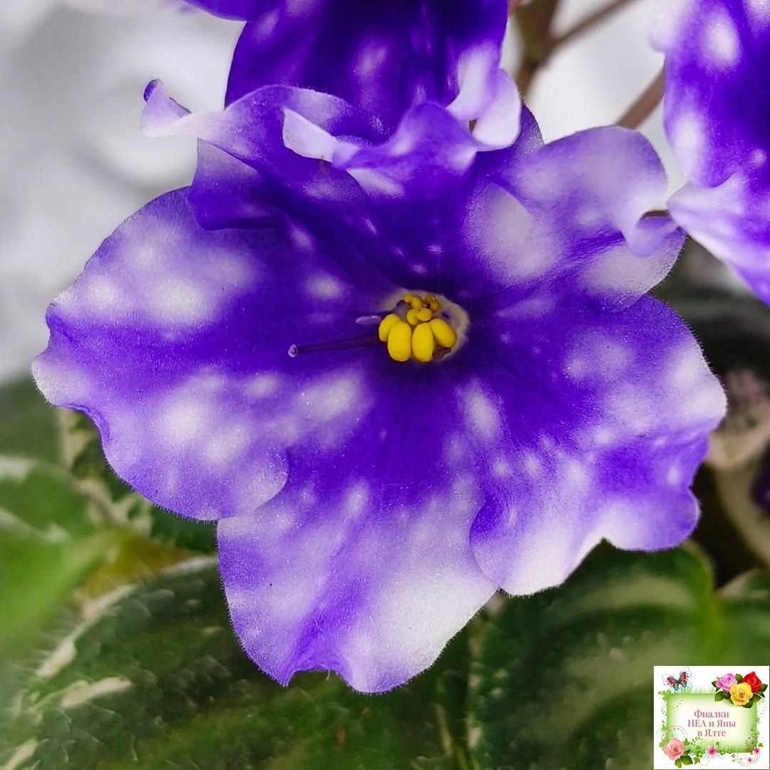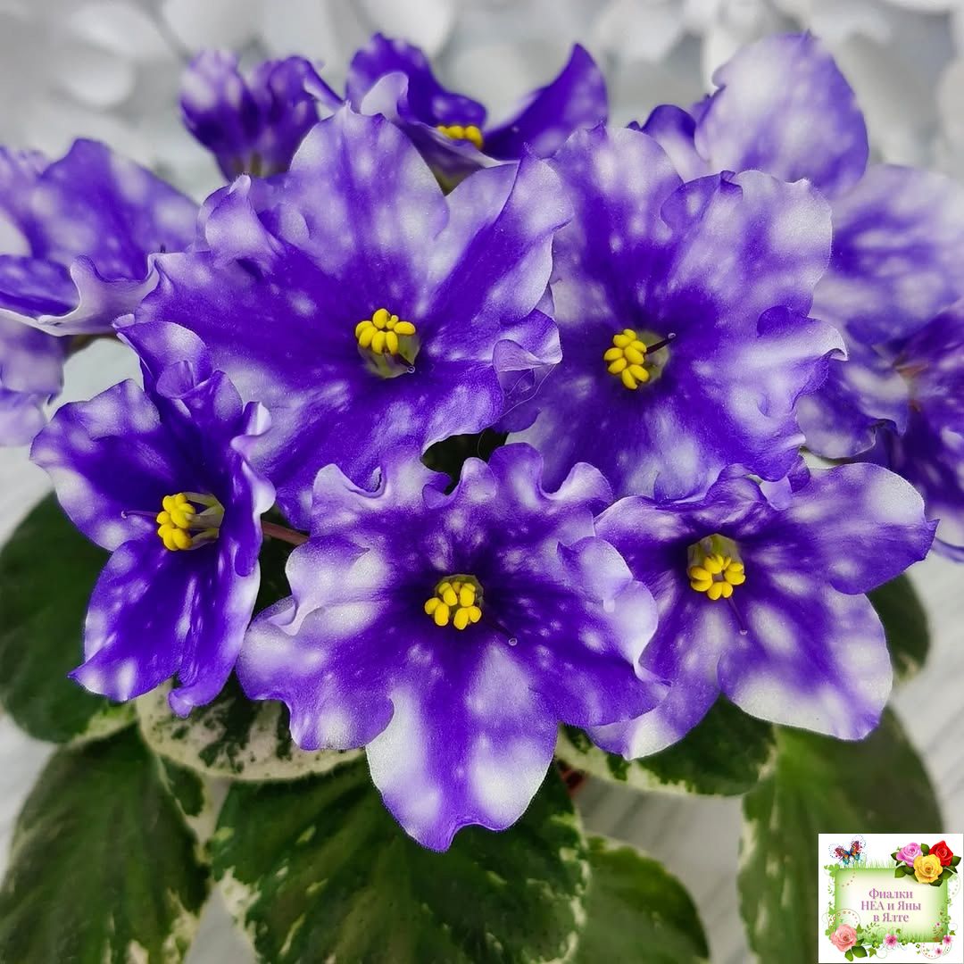 Крупные синие звезды с белым фэнтези в виде гороха и штрихов. Супер обильное цветение! Аккуратная симметричная пестролистная розетка. Полуминиатюра.