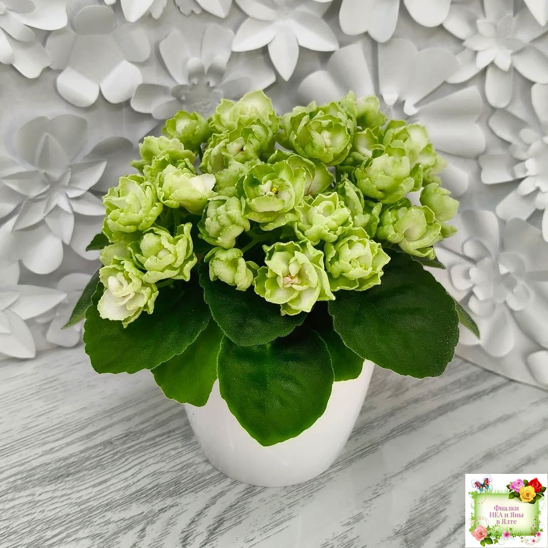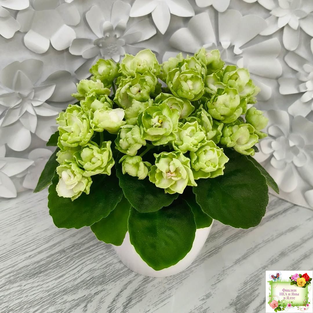Ярко-зеленые, словно восковые, махровые цветы «кочанчики». Обильное длительное цветение. Средне-зеленая листва, аккуратная розетка. Полумини.