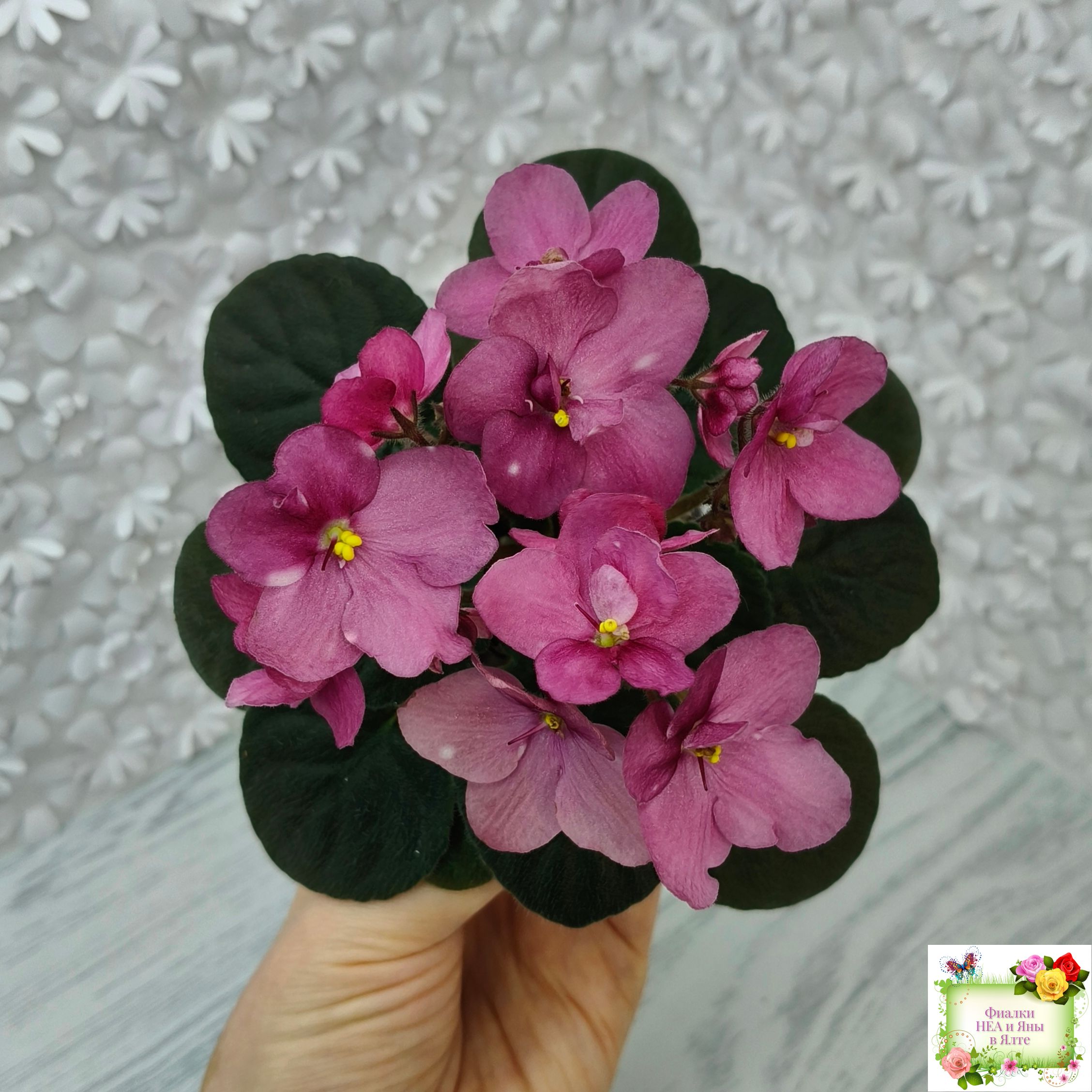 Крупные красно-розовые анютки с россыпью розового фэнтези гороха и штрихов. Листва сердцевидная, темно-зеленая. Шапочное цветение.