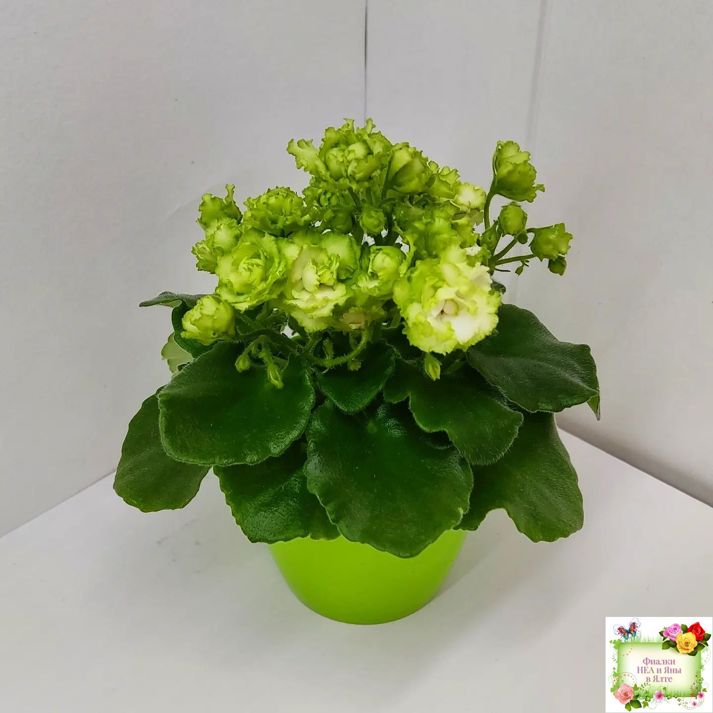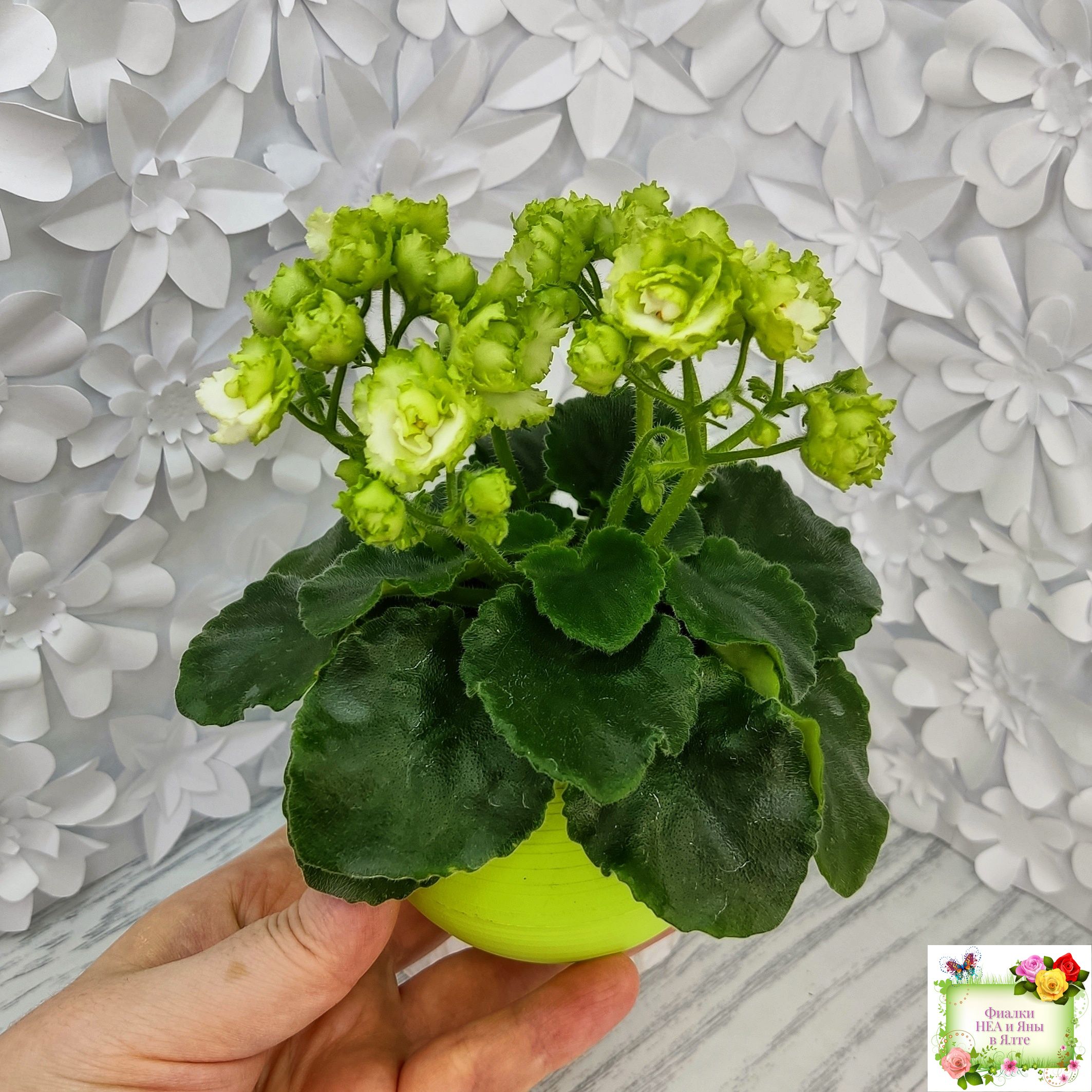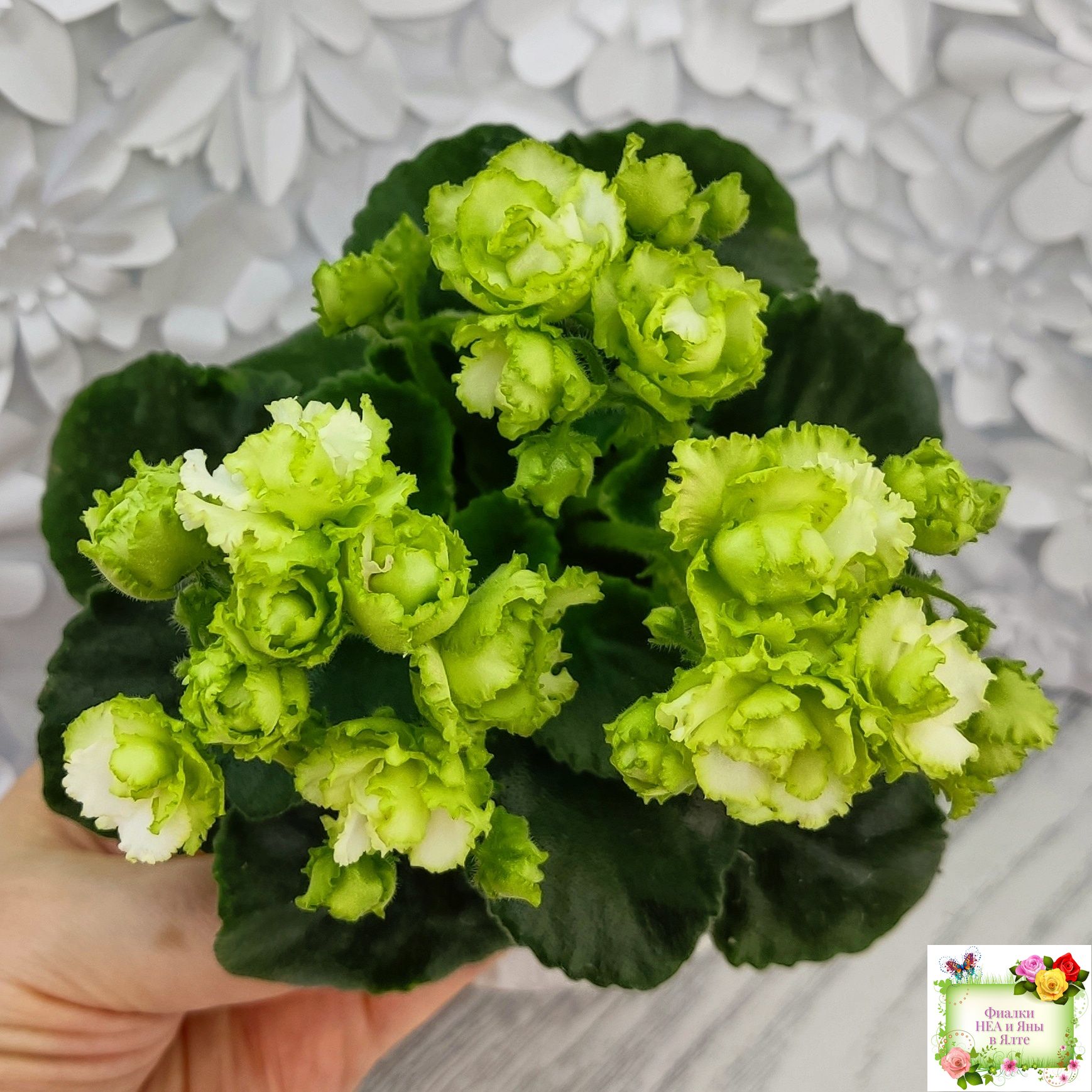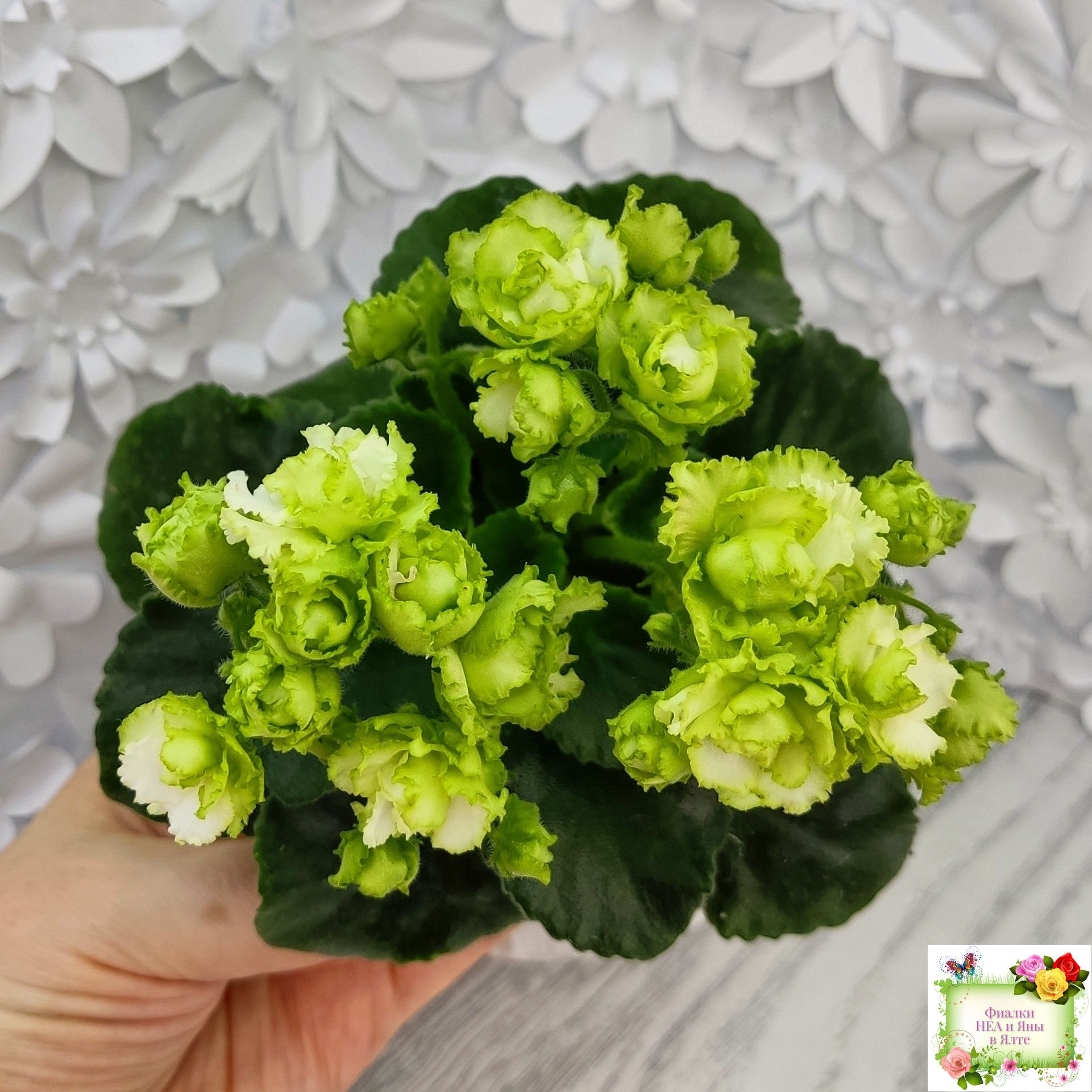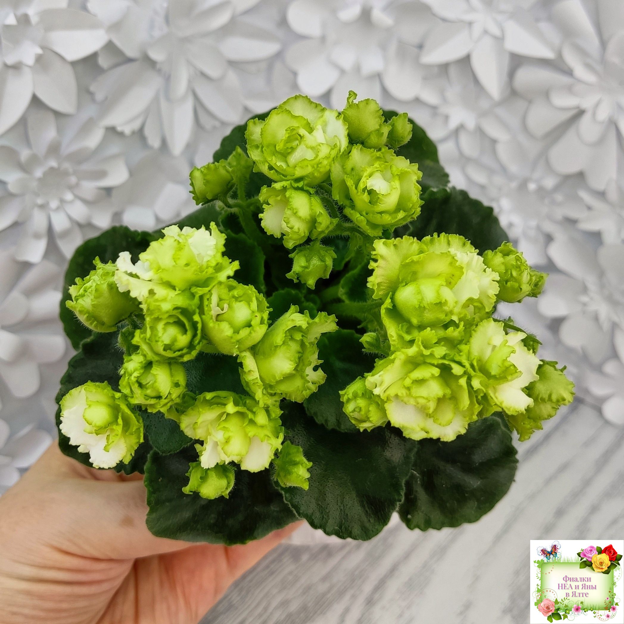 Сильно гофрированные плотные салатно-зеленые розочки. Блестящая светло-зеленая листва с волнистым краем идеально гармонирует с шапочкой нарядных цветов. Полуминиатюра.