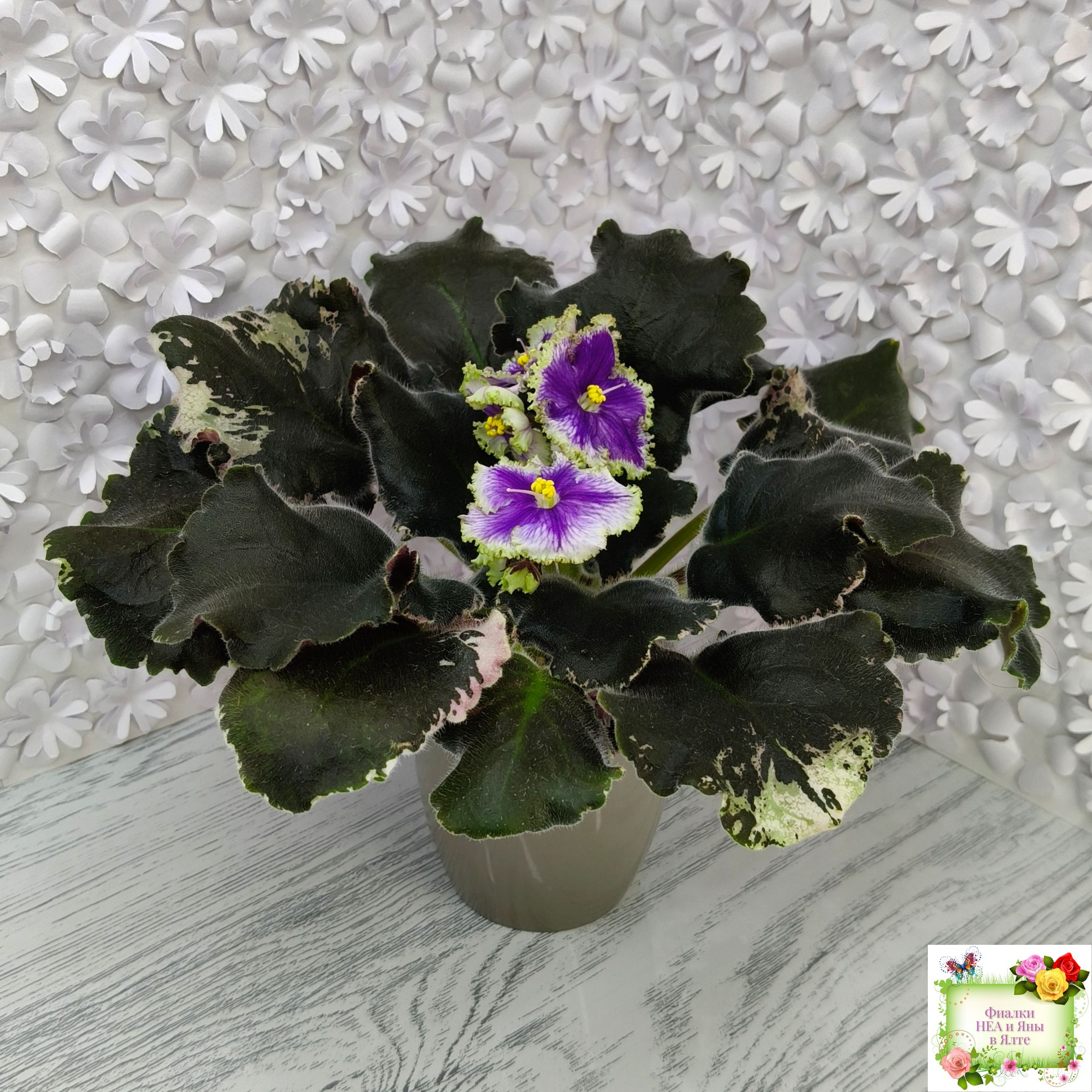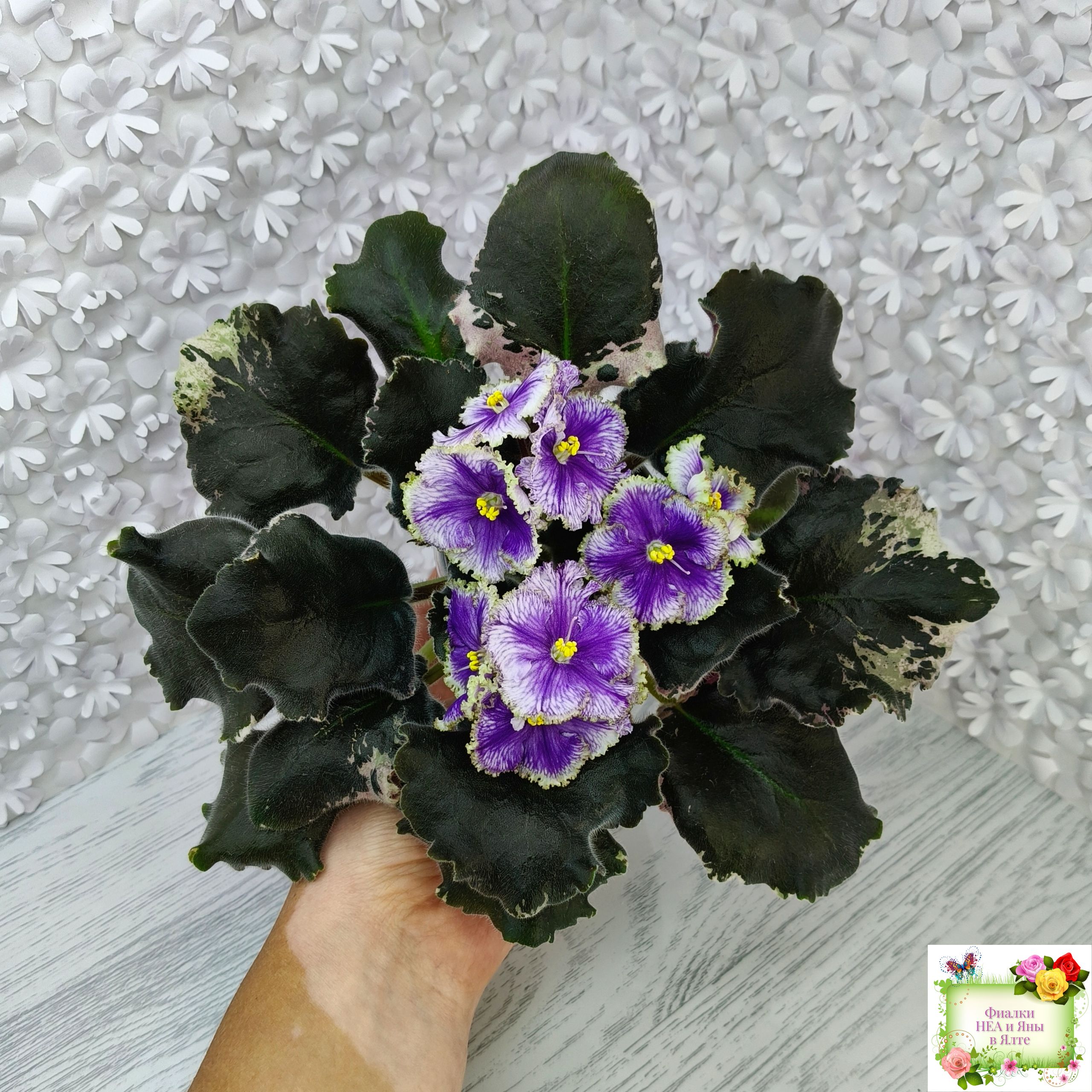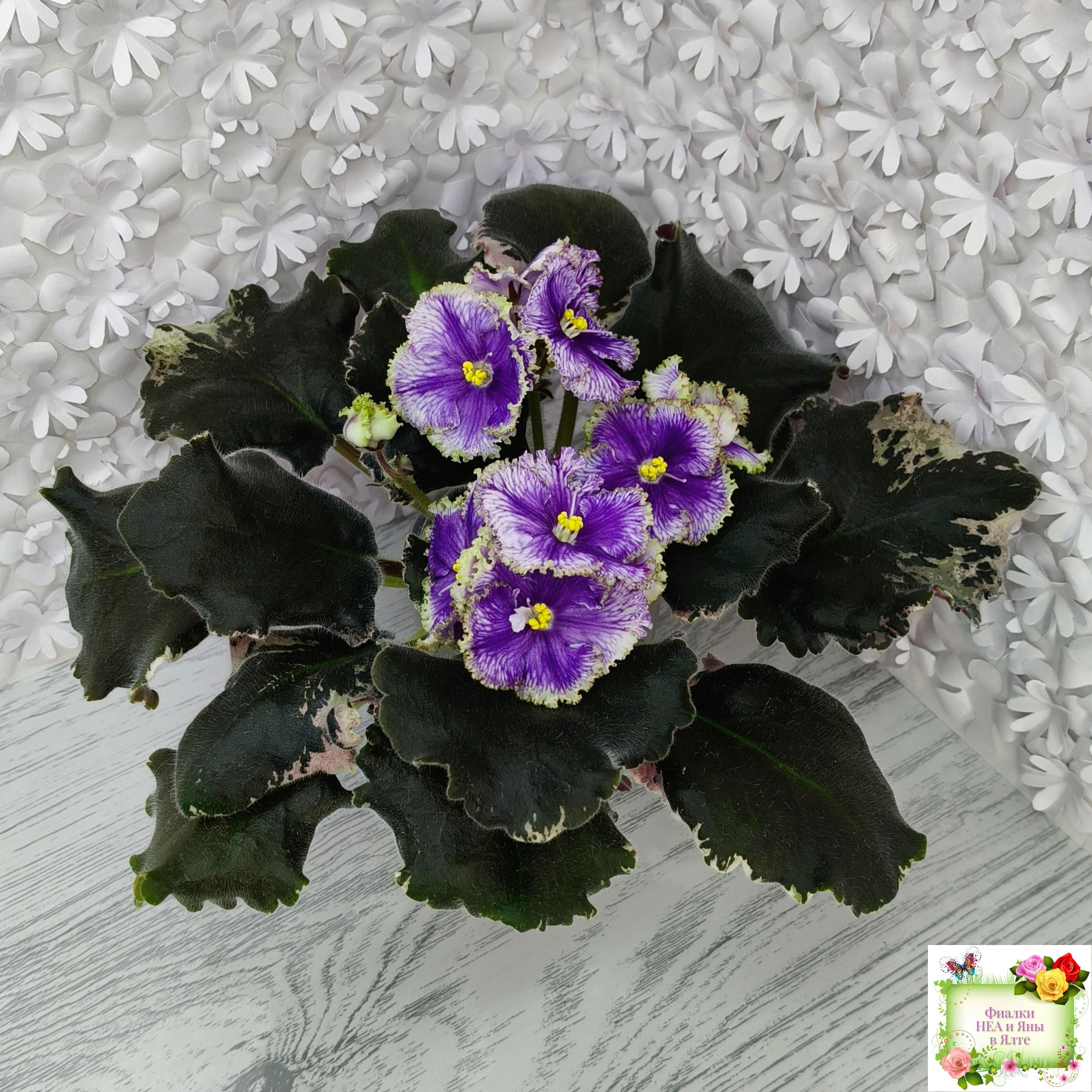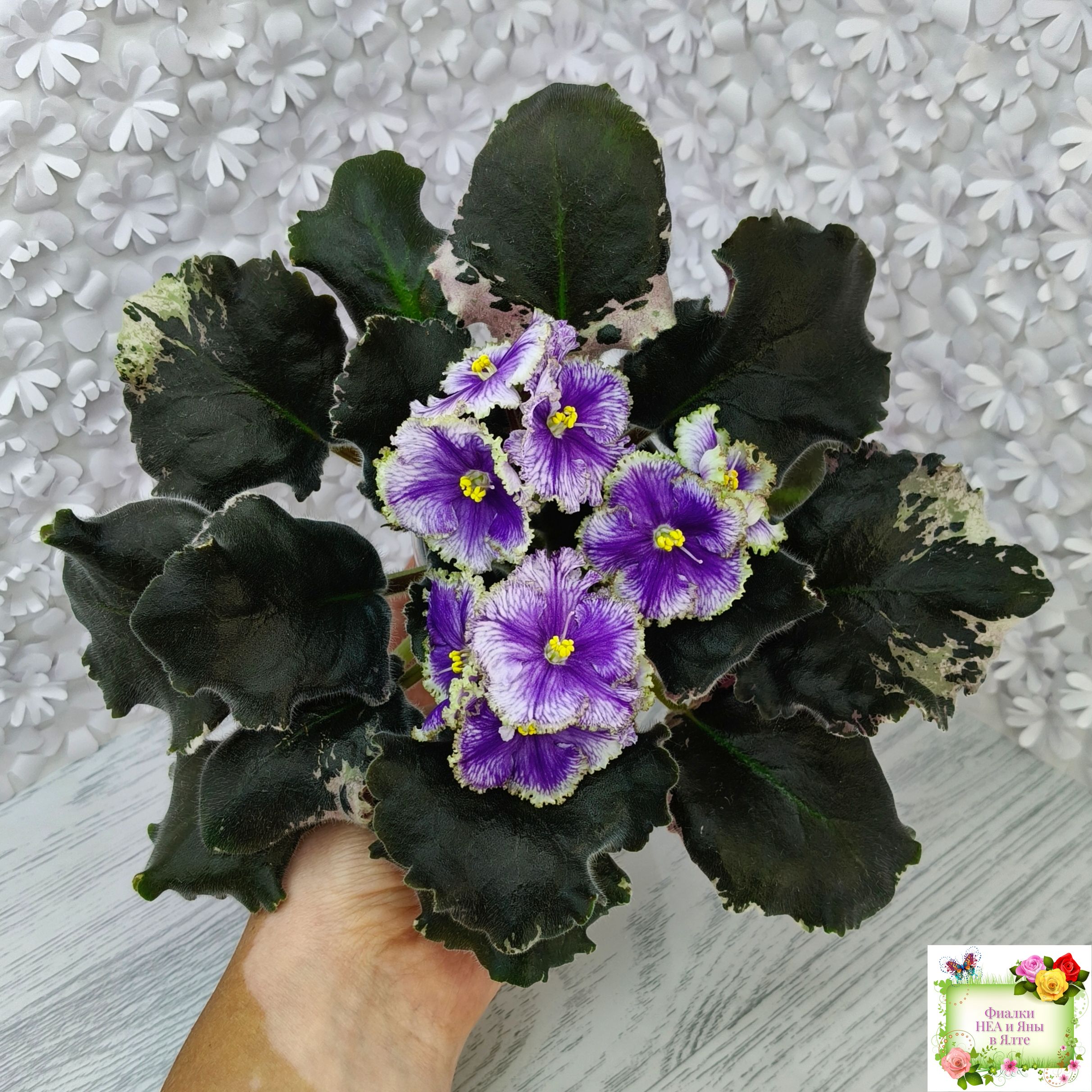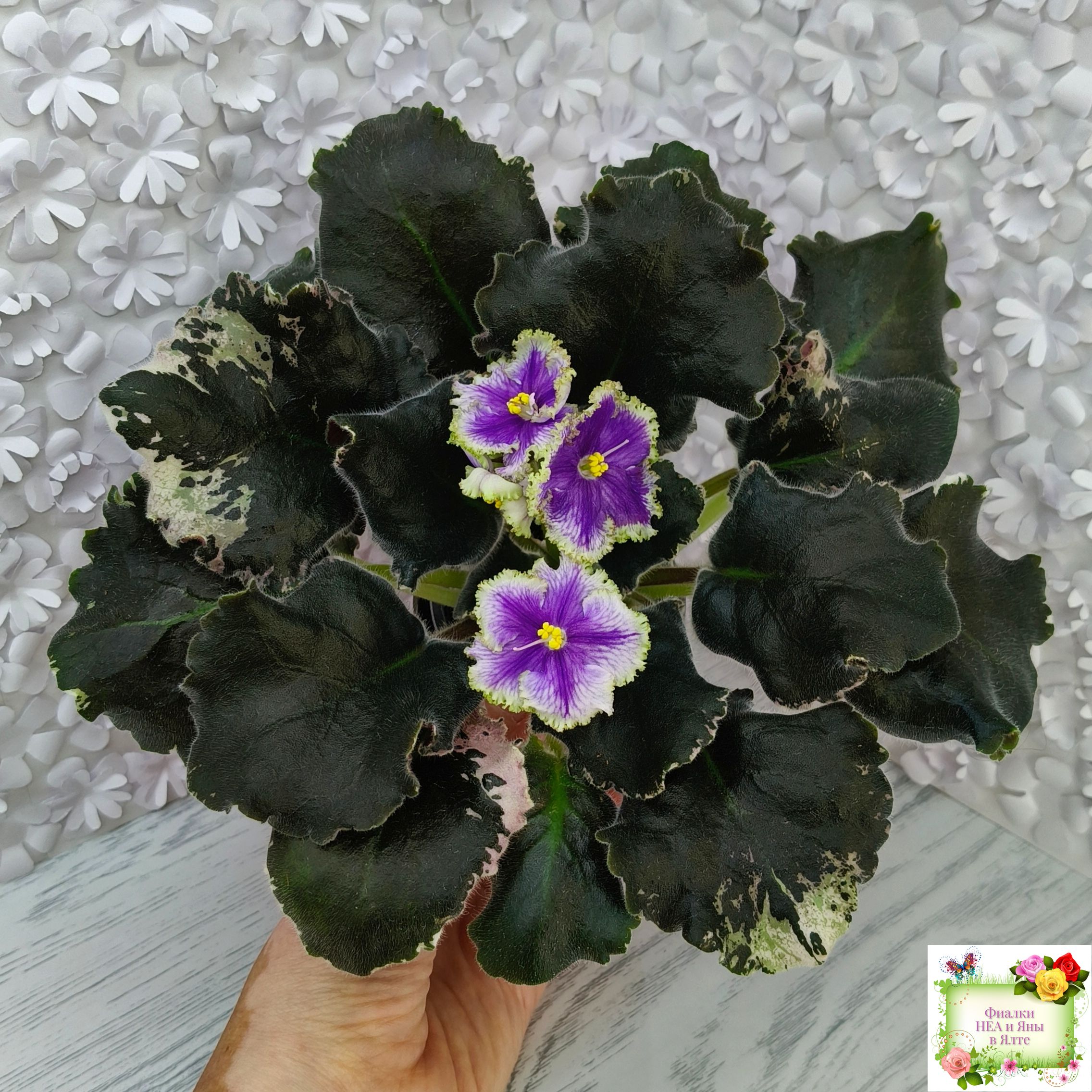Цветы сине-голубого цвета округлой формы с венозным тёмным рисунком по цветку и салатовой гофрированной рюшей. Розетка темно-зелёных листьев с окаймляющей пестролистностью. Стандарт.