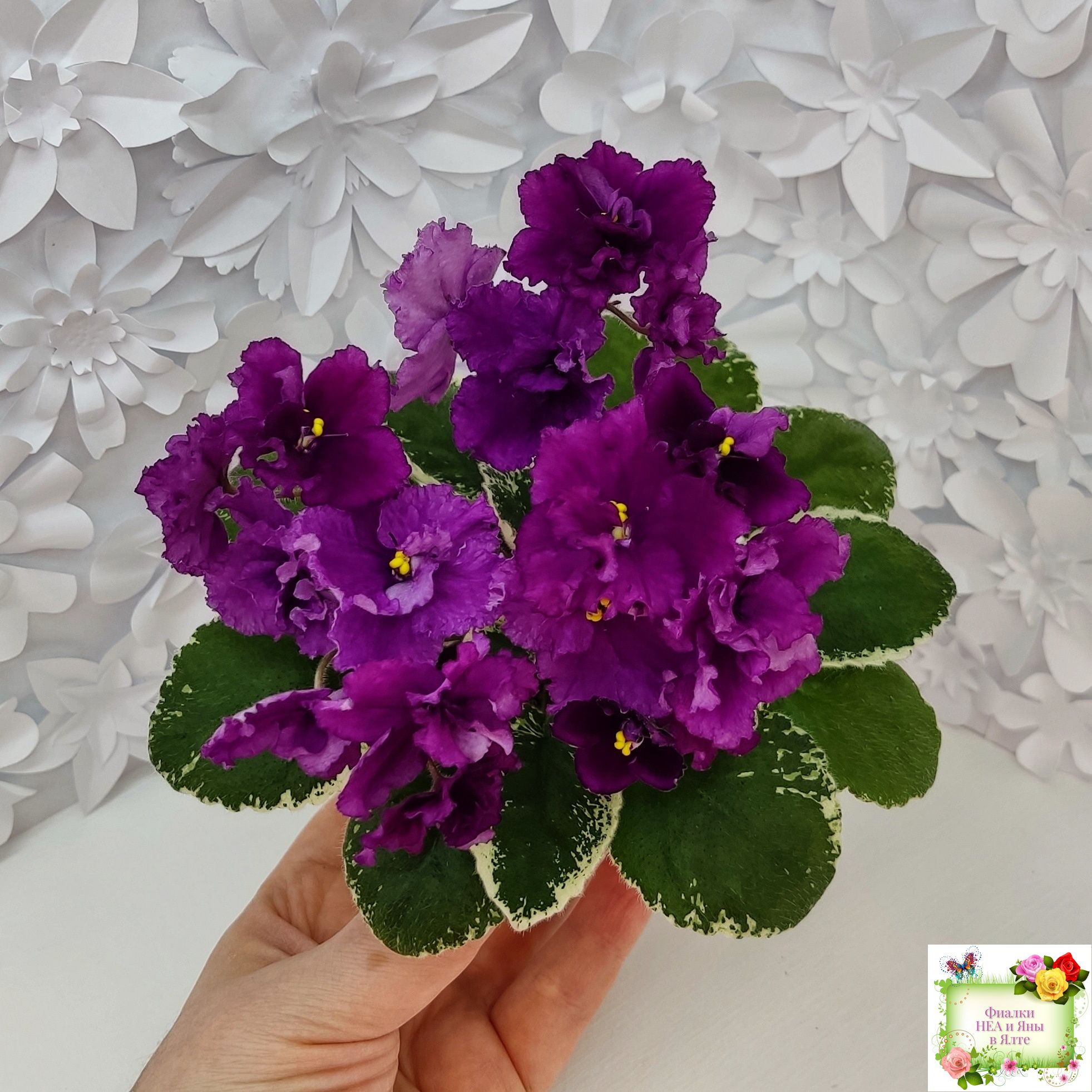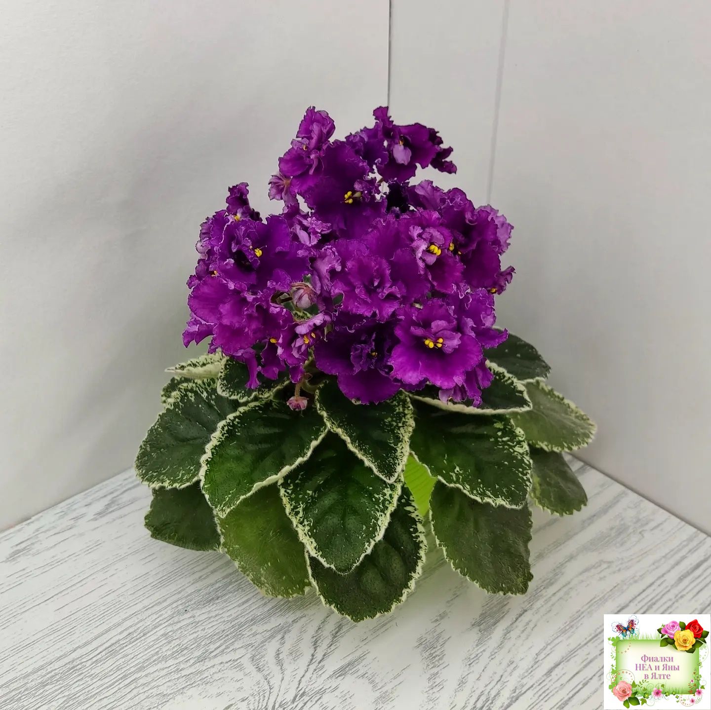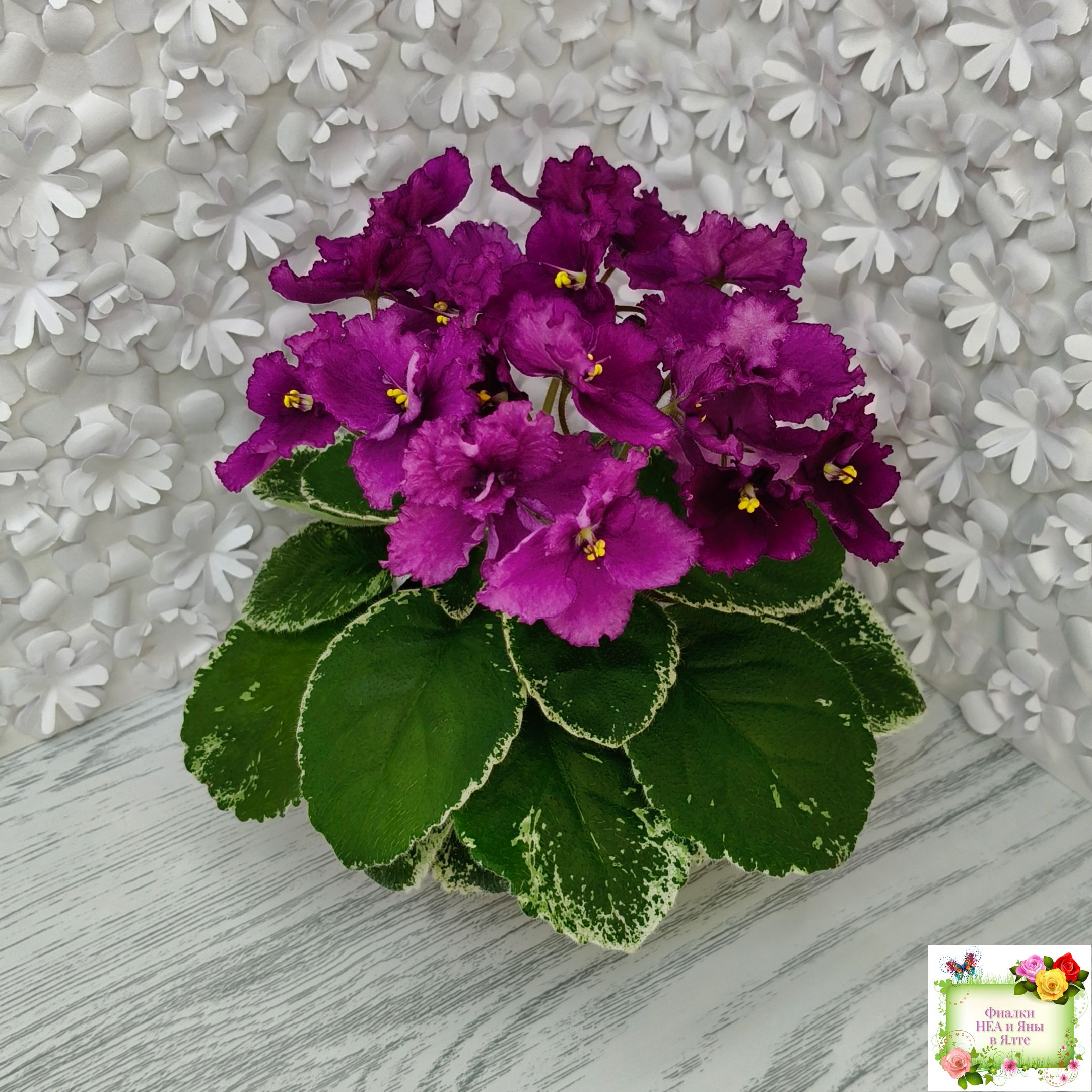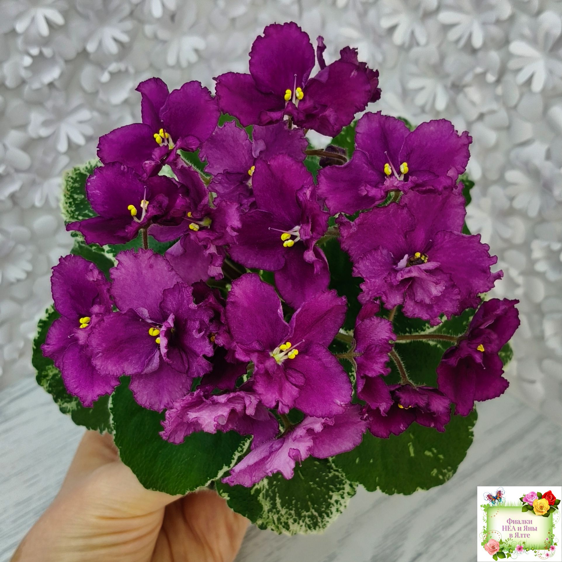 Крупные темно-бордовые, в начале роспуска почти чёрные волнистые анютины глазки. Пестролистная ровная средне-зелёная розетка с окаймляющей белой пестролистностью. Размер розетки: полумини. (Описание НЕА)