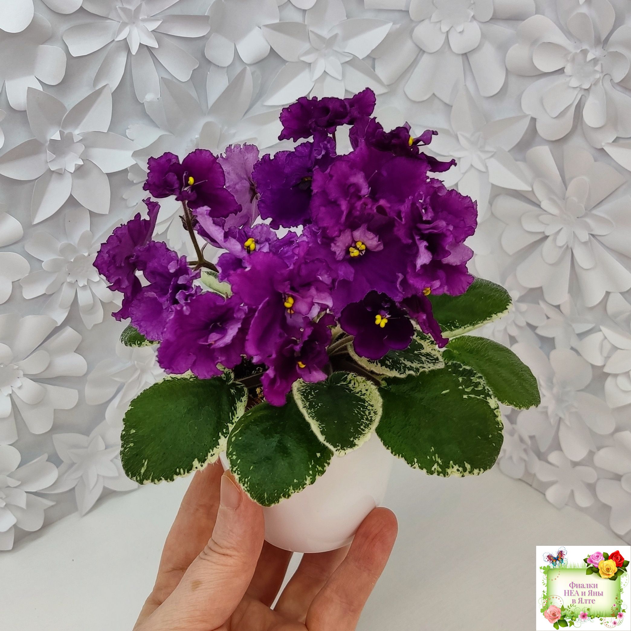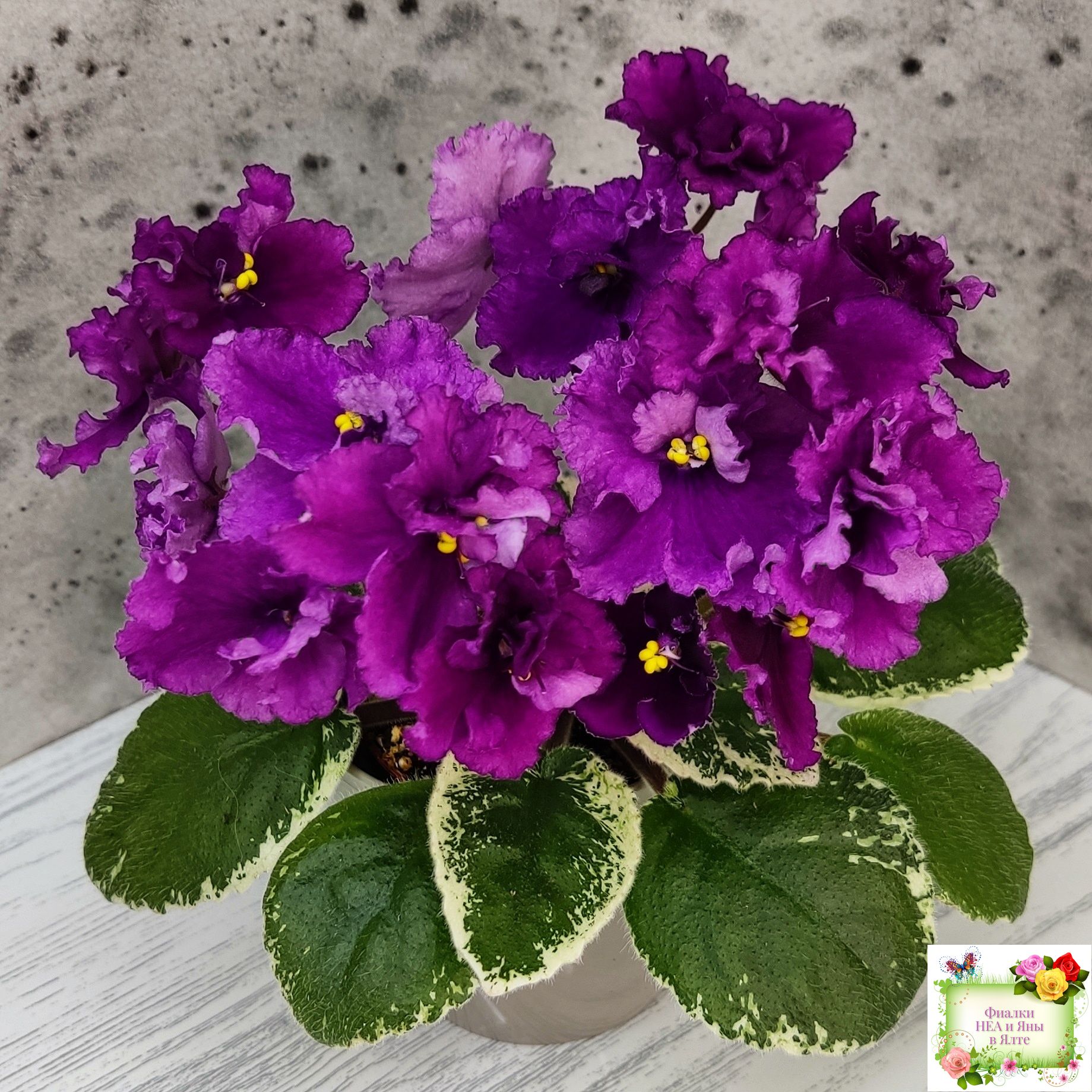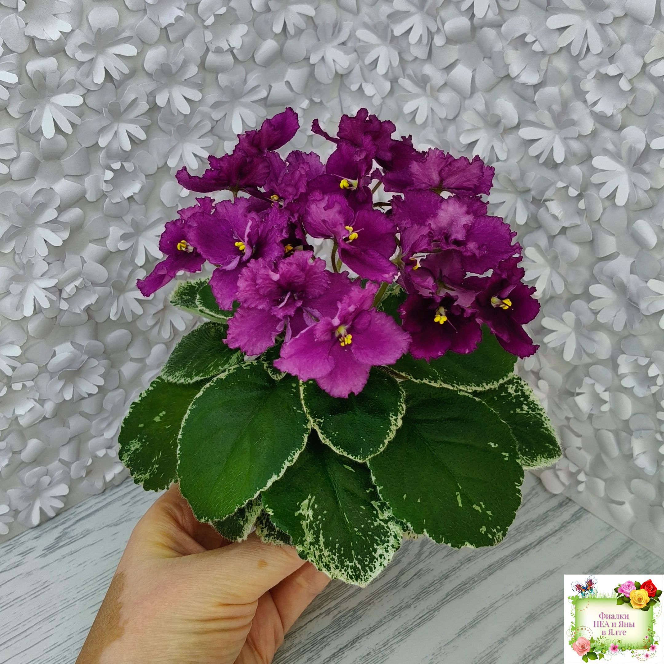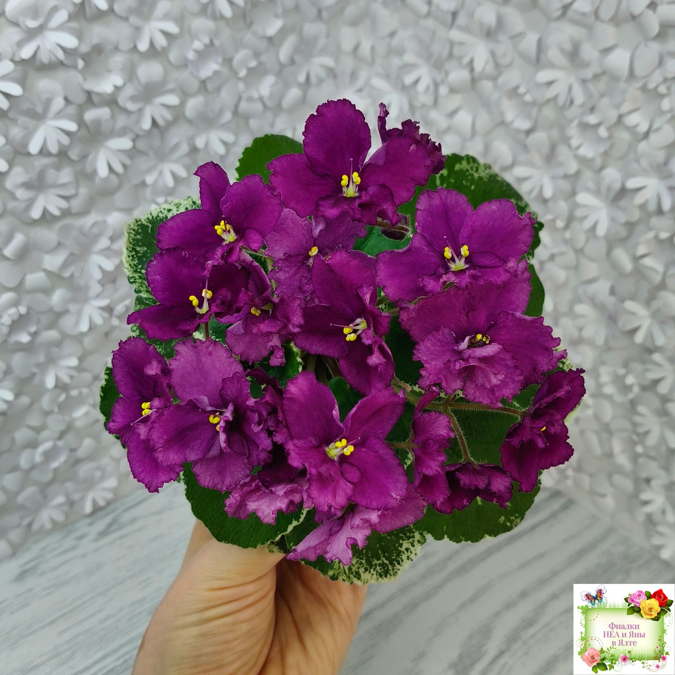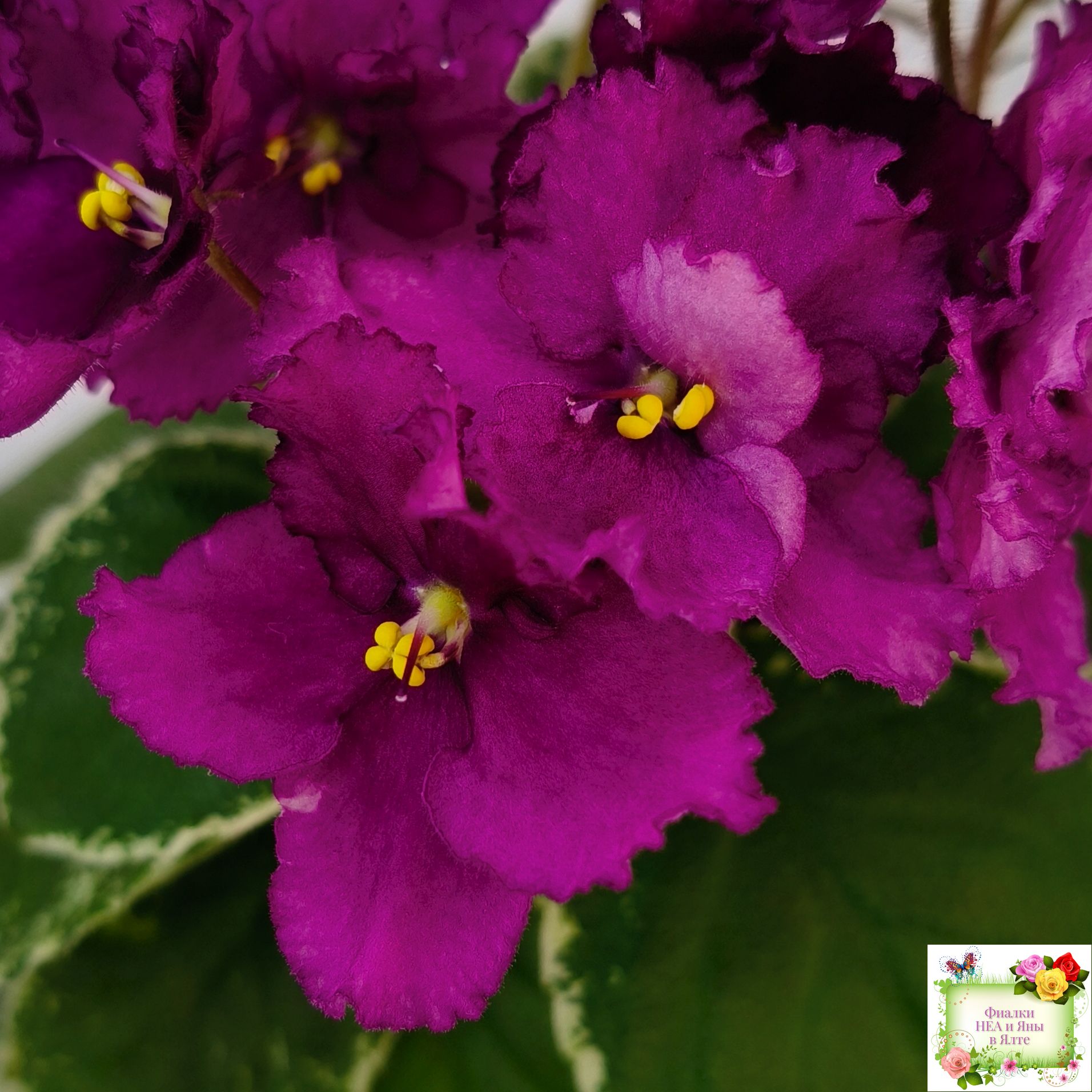 Крупные темно-бордовые, в начале роспуска почти чёрные волнистые анютины глазки. Пестролистная ровная средне-зелёная розетка с окаймляющей белой пестролистностью. Размер розетки: полумини. (Описание НЕА)