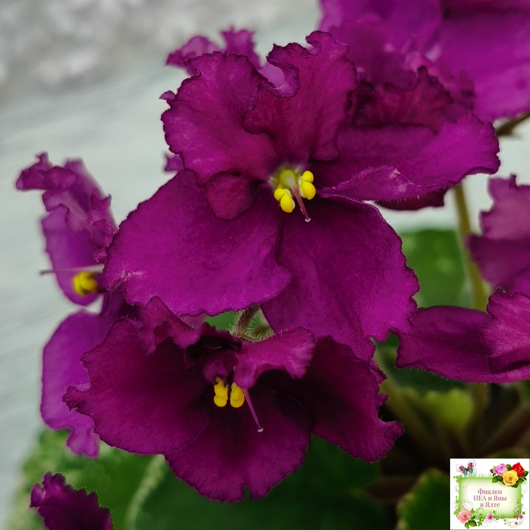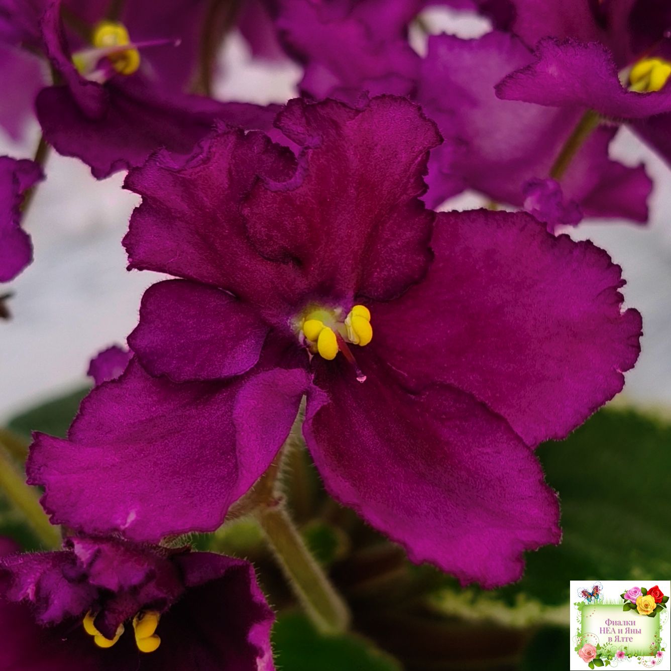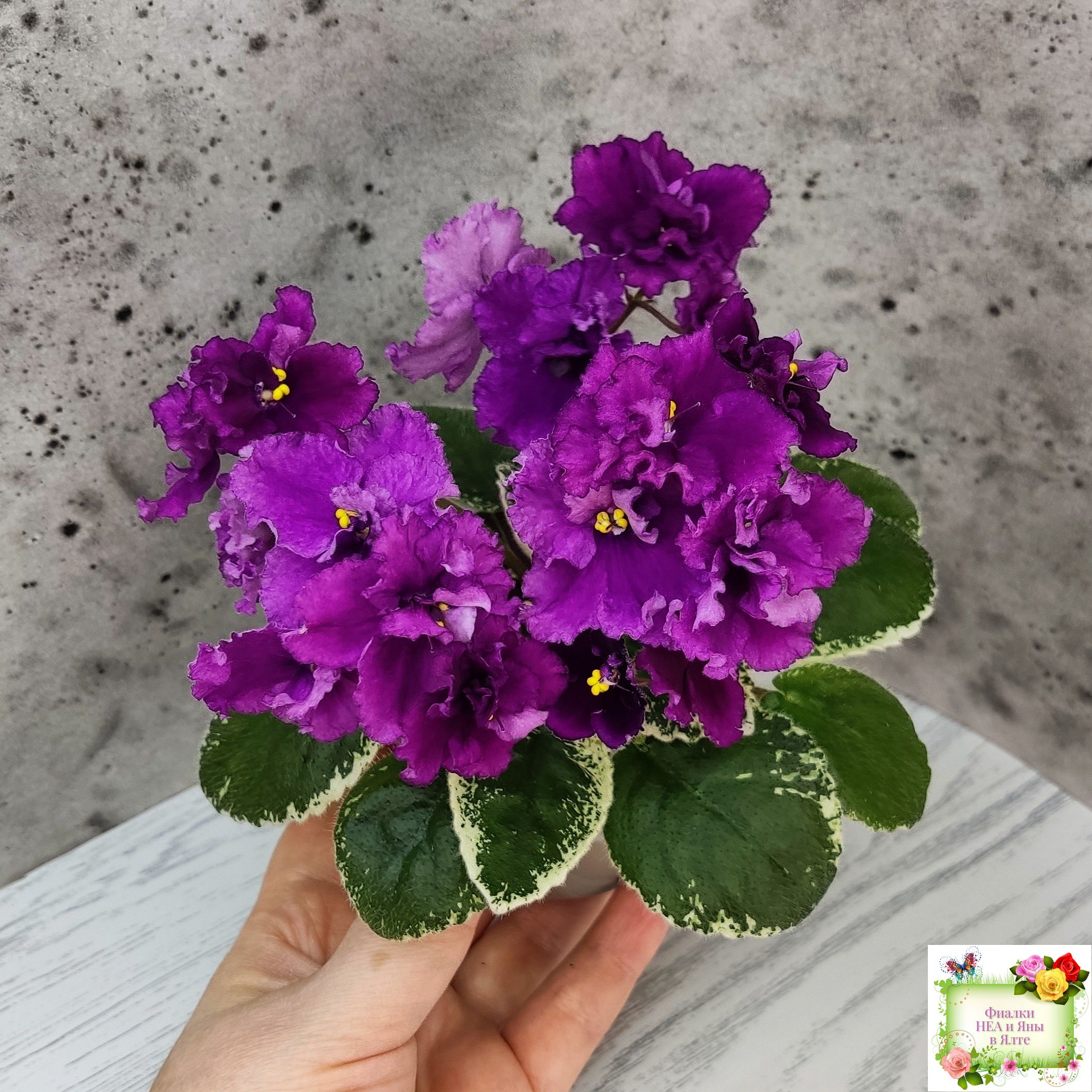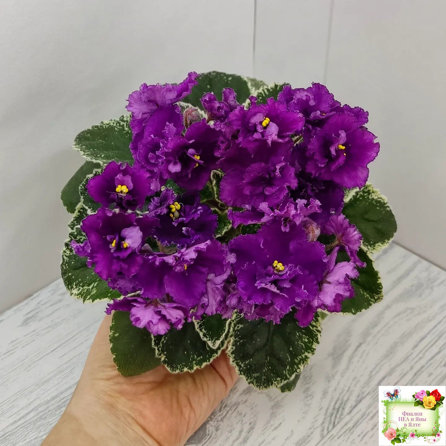 Крупные темно-бордовые, в начале роспуска почти чёрные волнистые анютины глазки. Пестролистная ровная средне-зелёная розетка с окаймляющей белой пестролистностью. Размер розетки: полумини. (Описание НЕА)