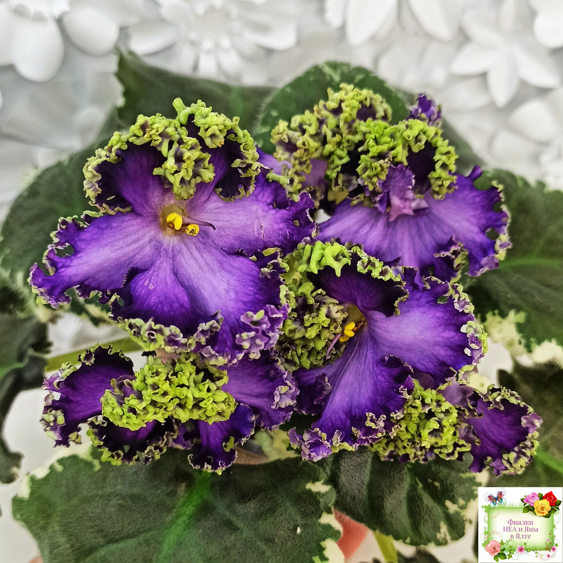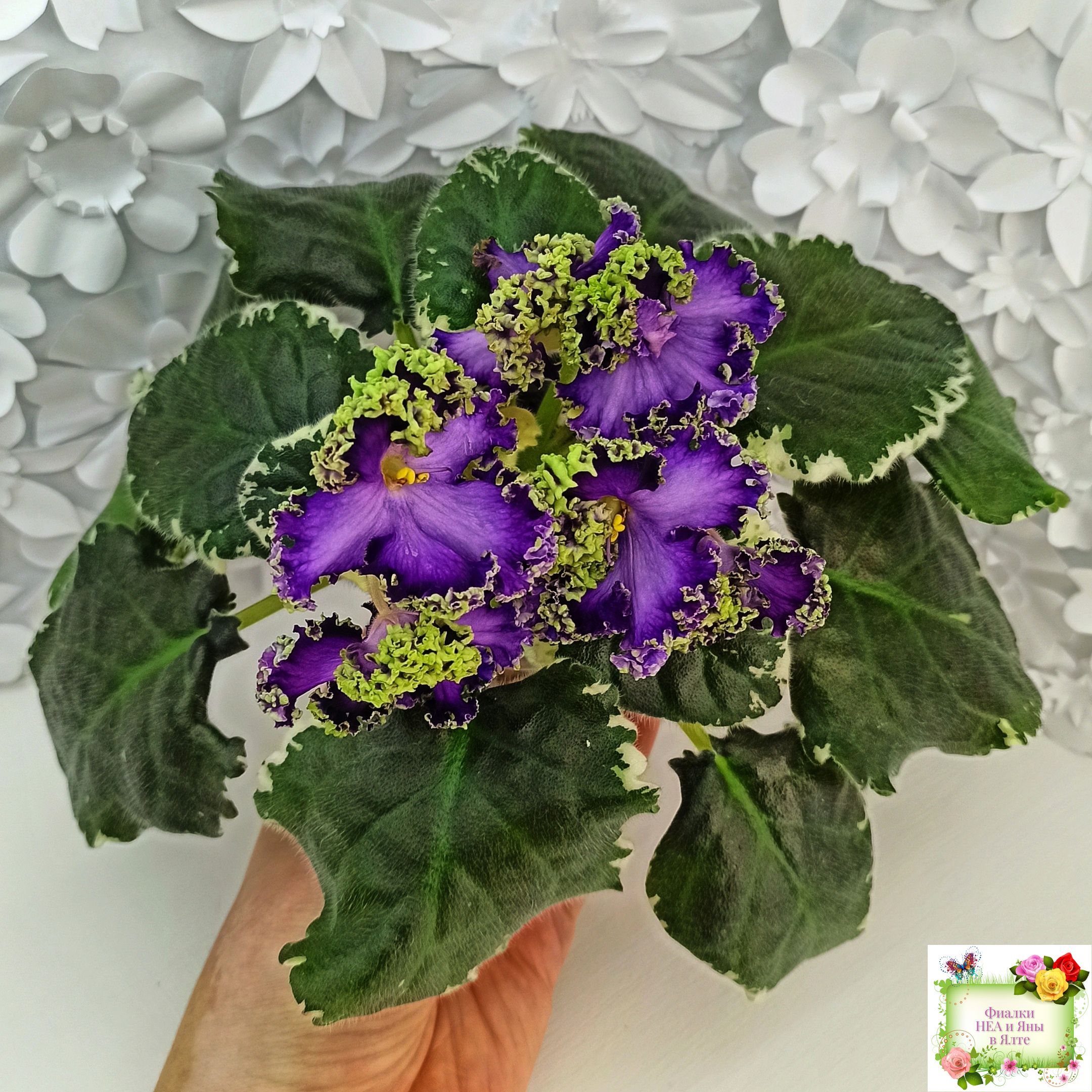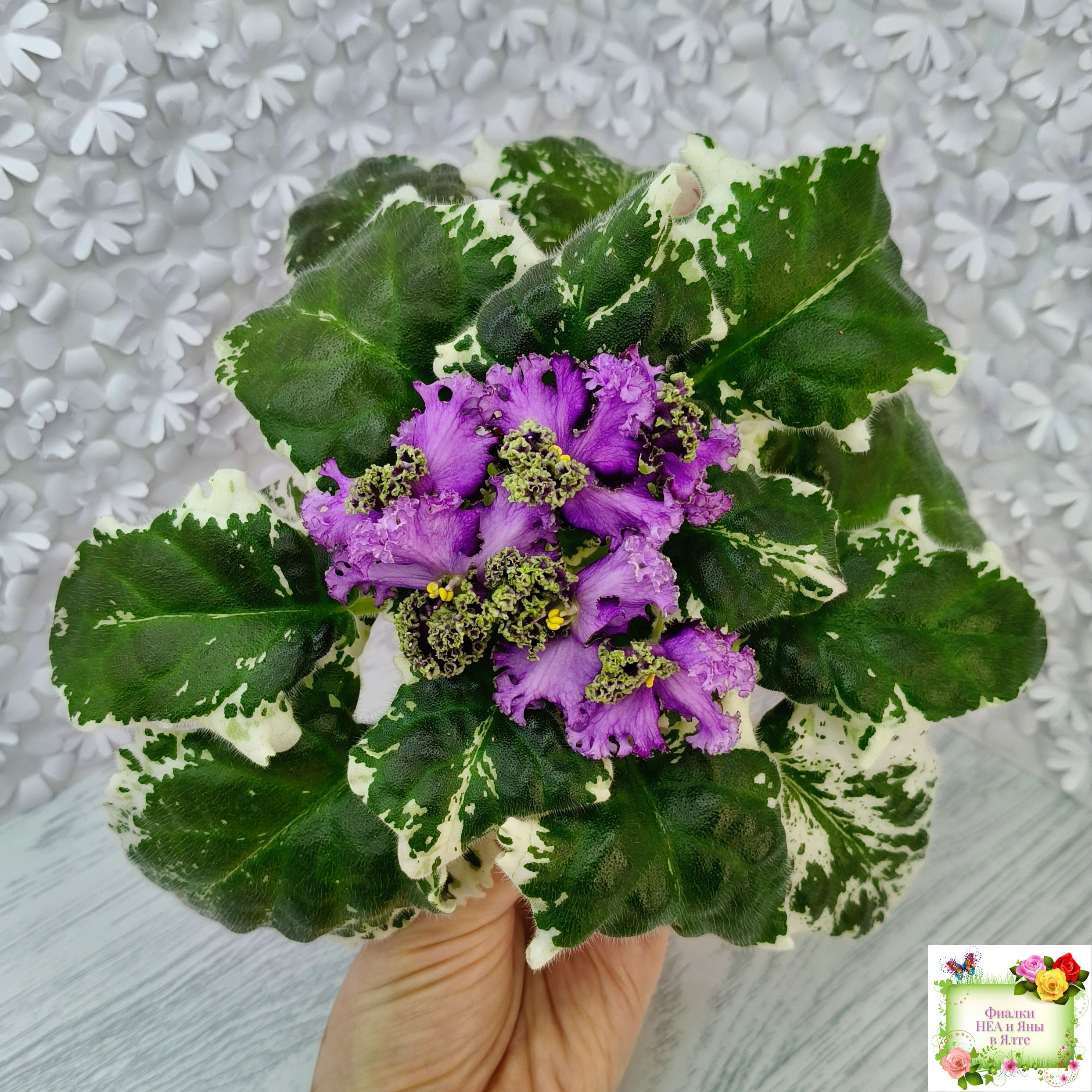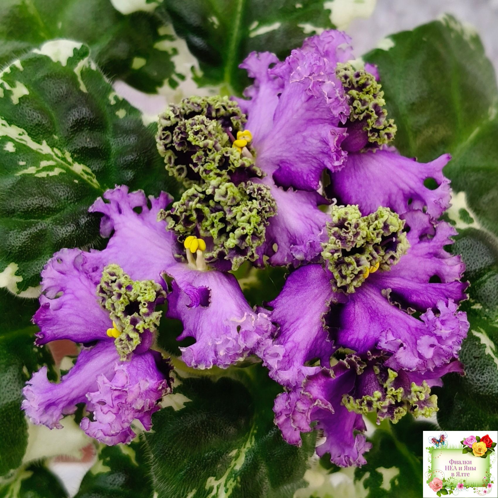 Нежно лавандовые анютки с бело-зеленоватой слегка гофрированной каймой и сгущением цвета под краями лепестков, пестролистник. (Описание сорта).