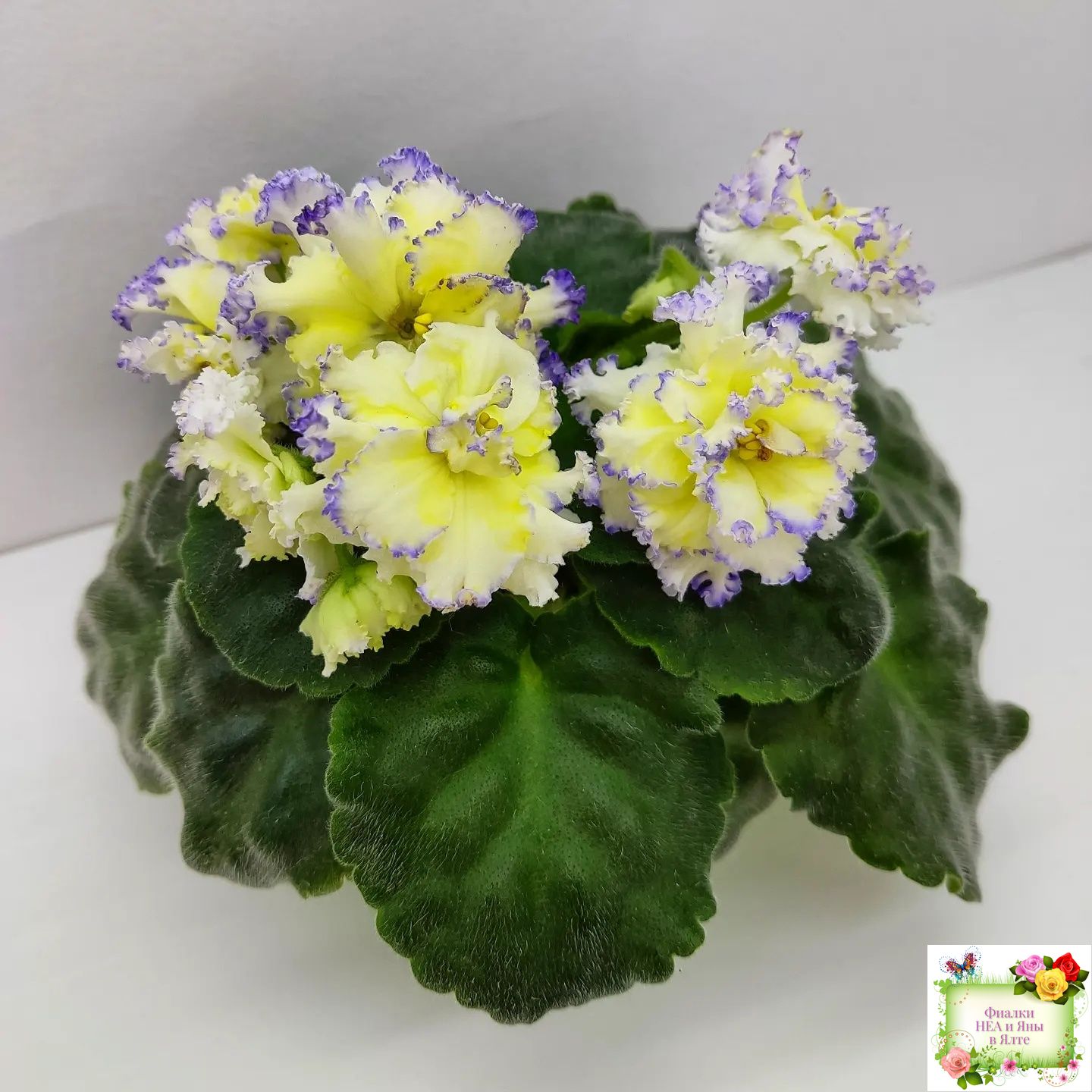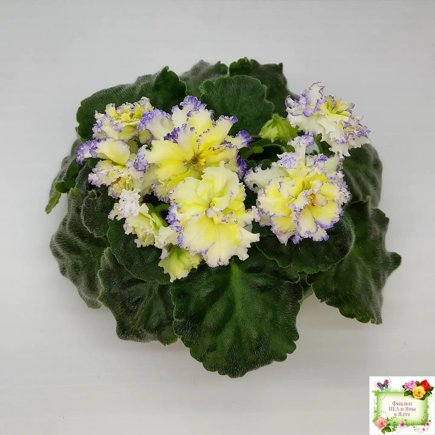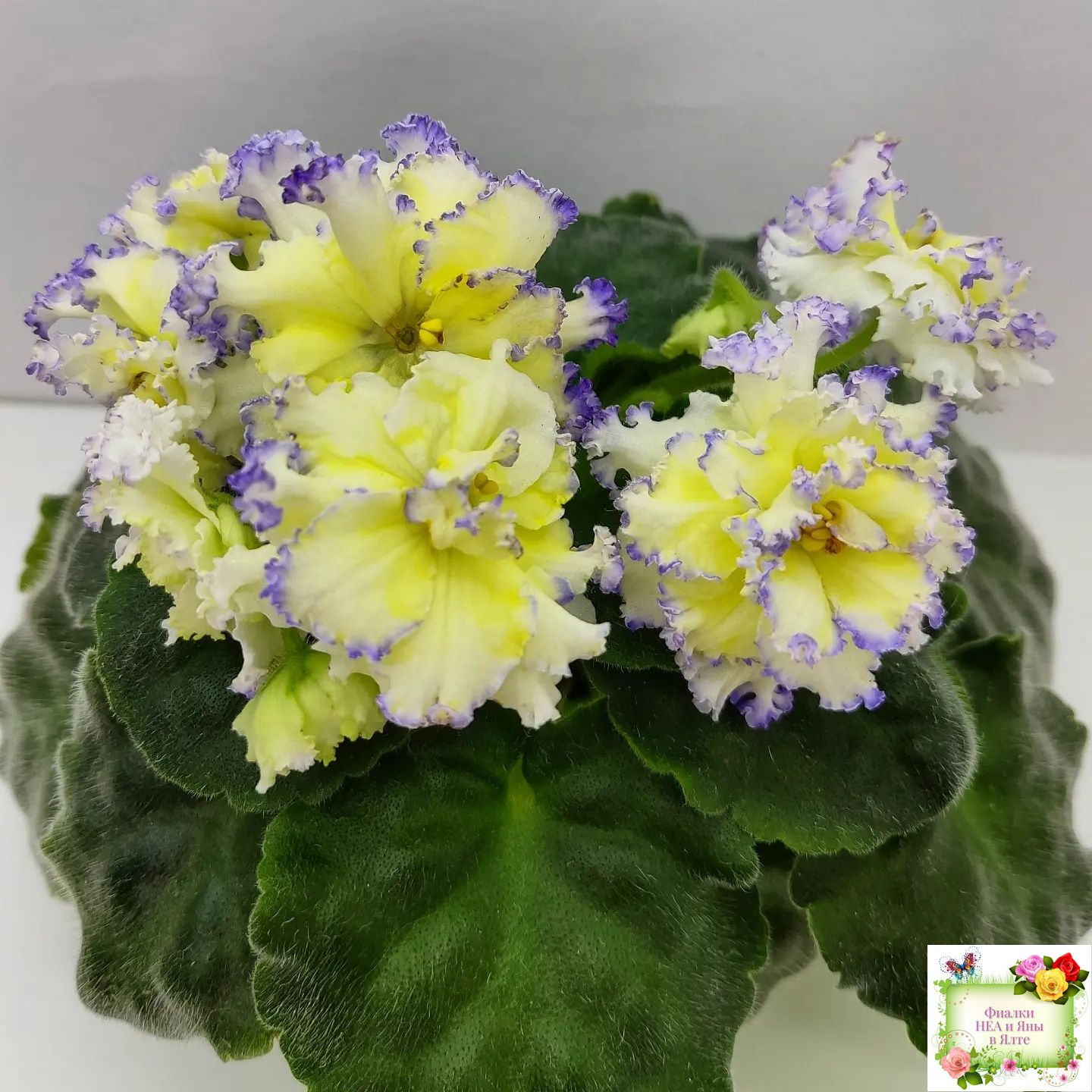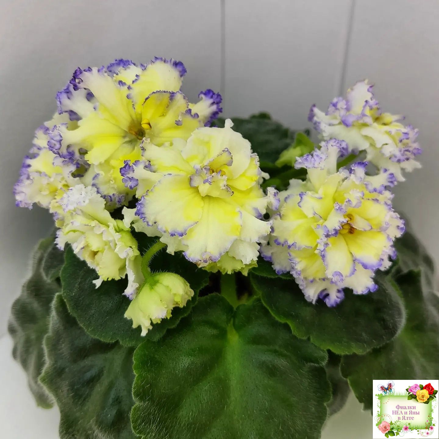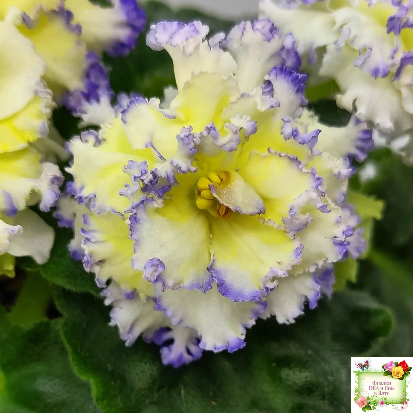 Белые с очень яркой желтой пропиткой махровые звезды с тоненькой прерывистой голубой каемкой. Ровные средне-зеленые листья 2017