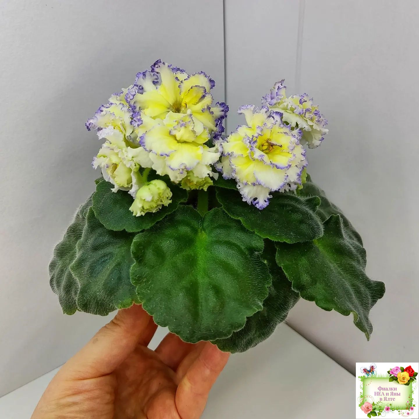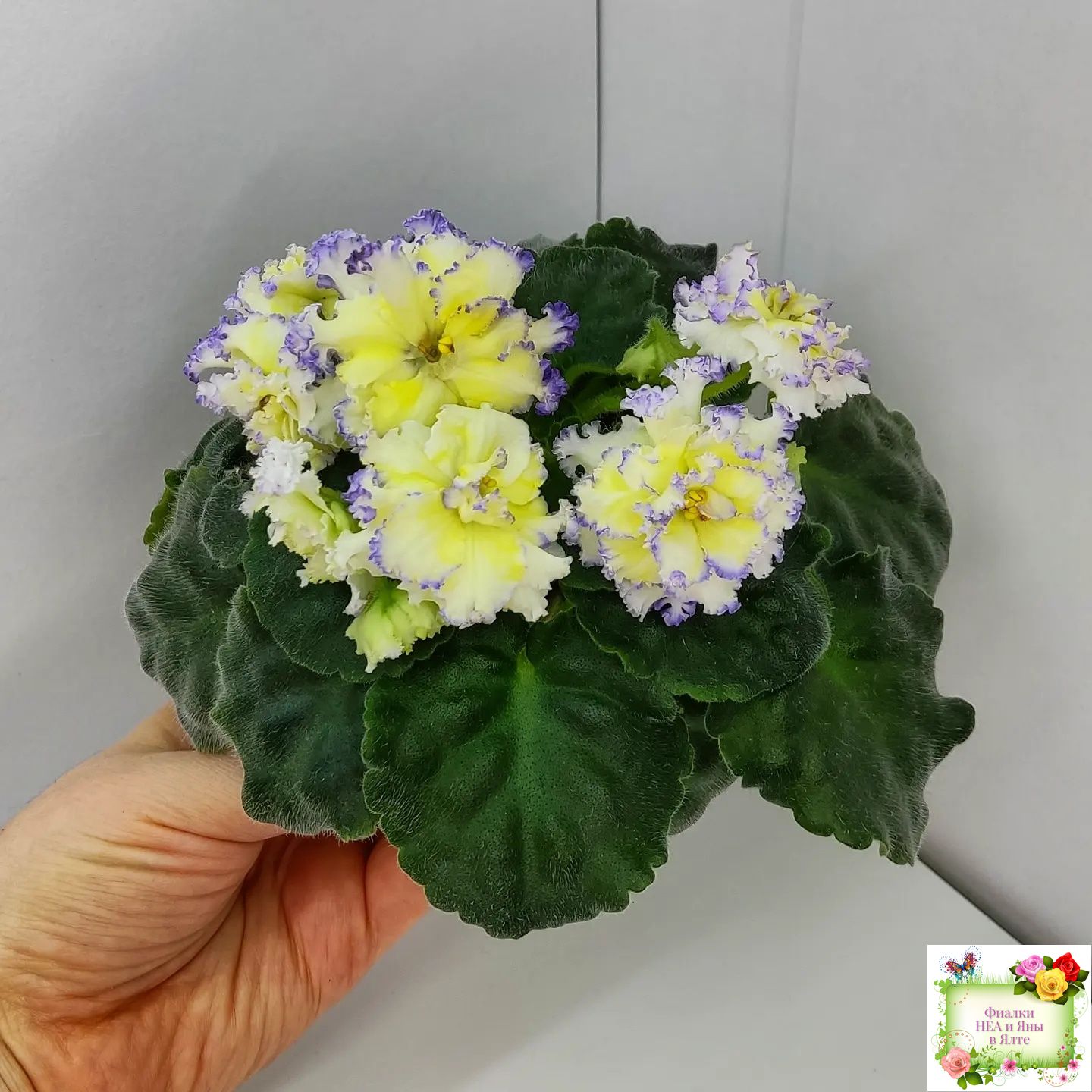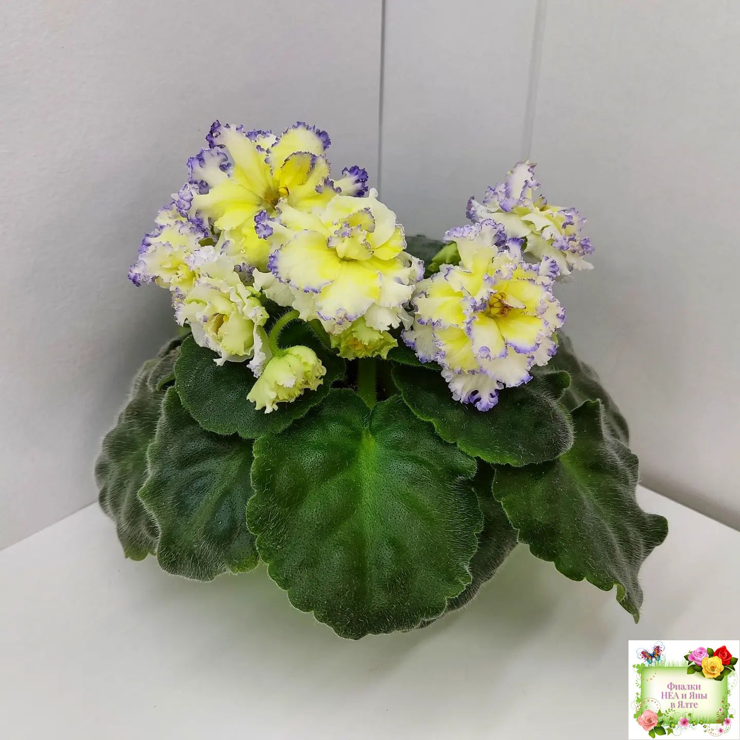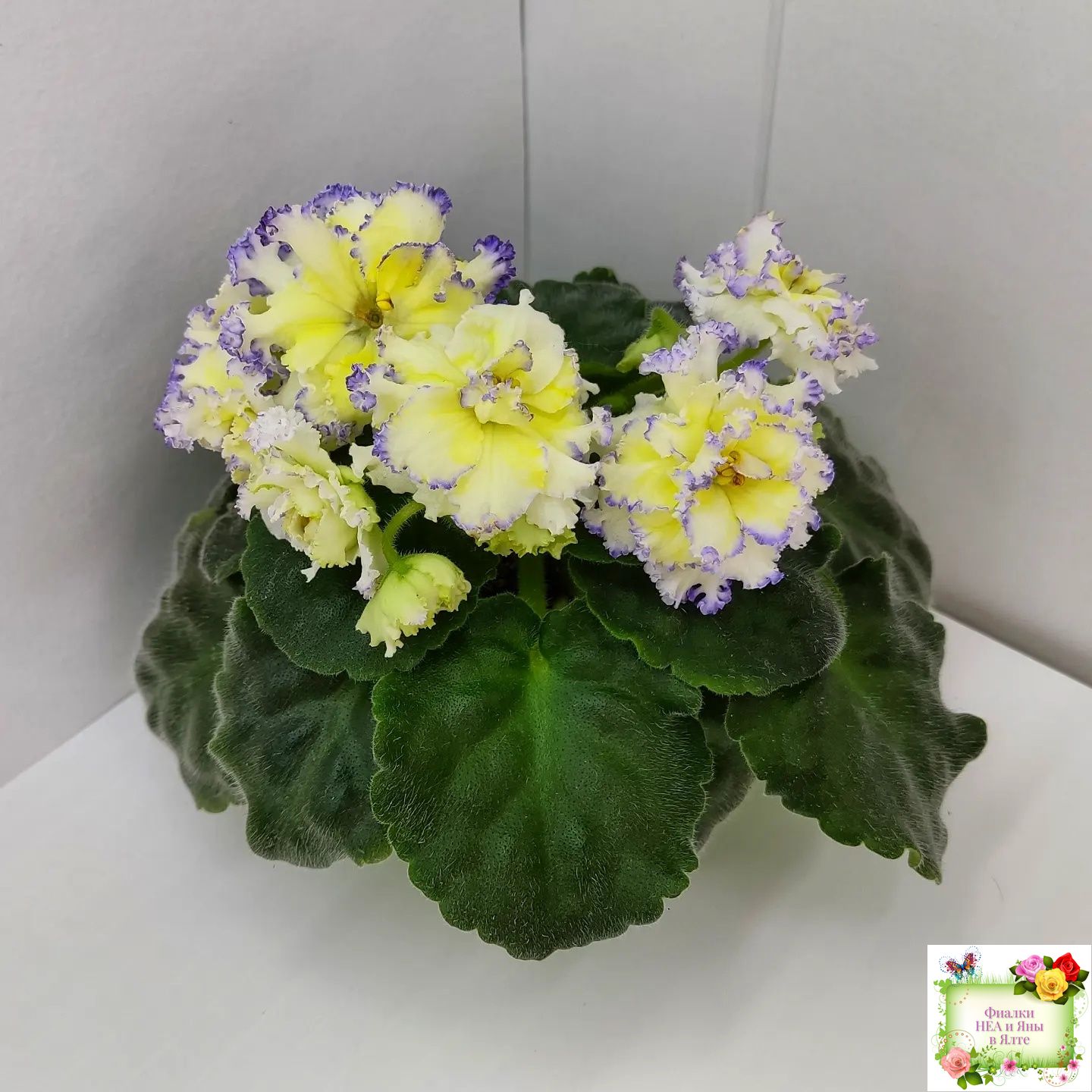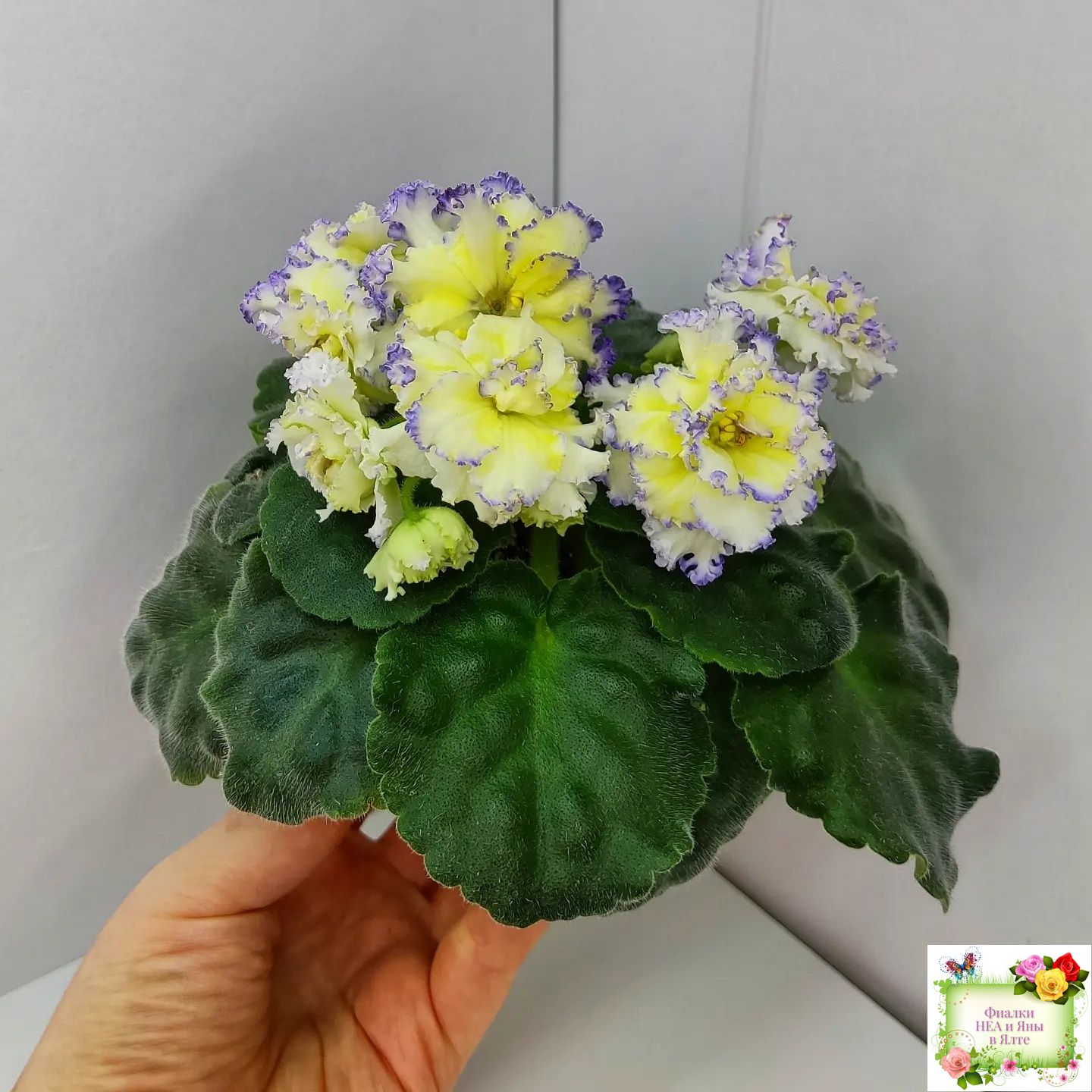 Белые с очень яркой желтой пропиткой махровые звезды с тоненькой прерывистой голубой каемкой. Ровные средне-зеленые листья 2017