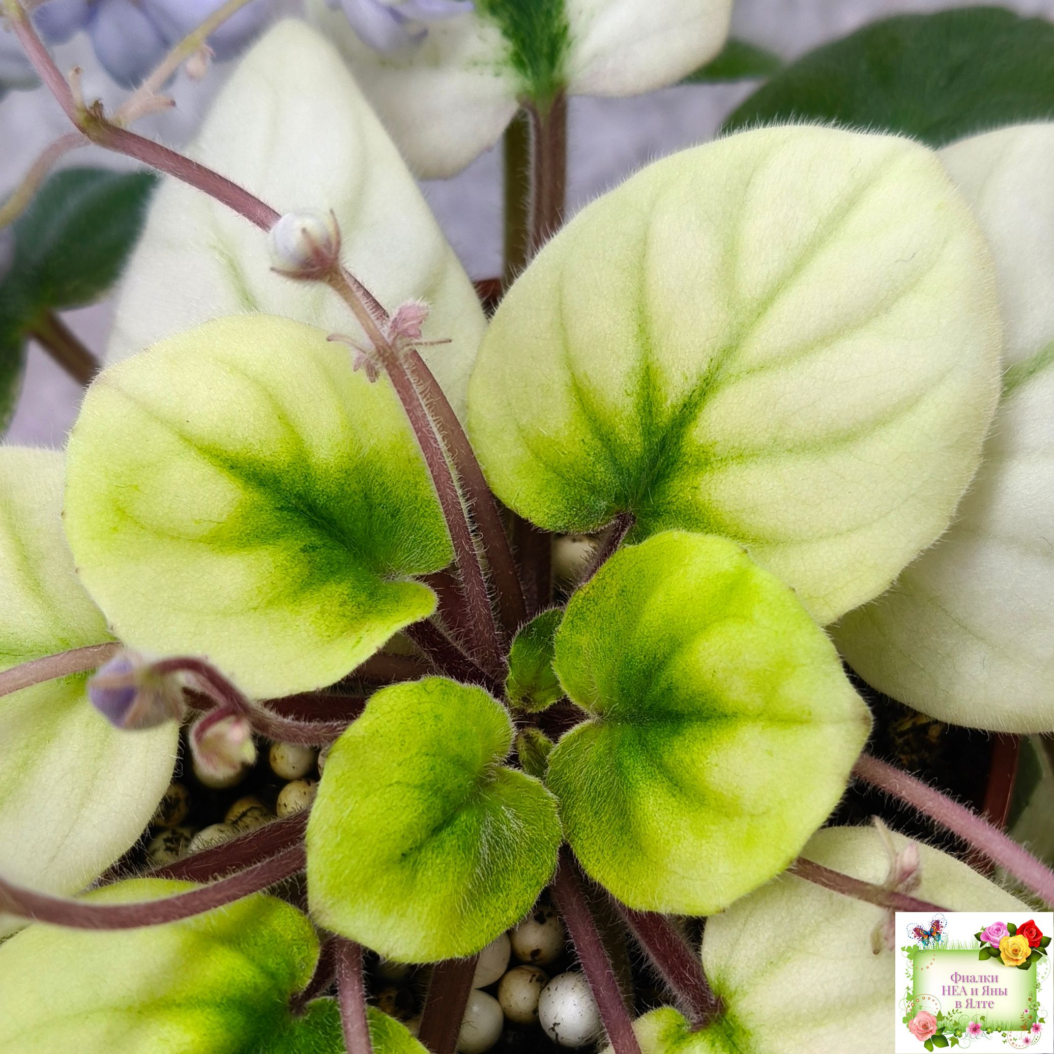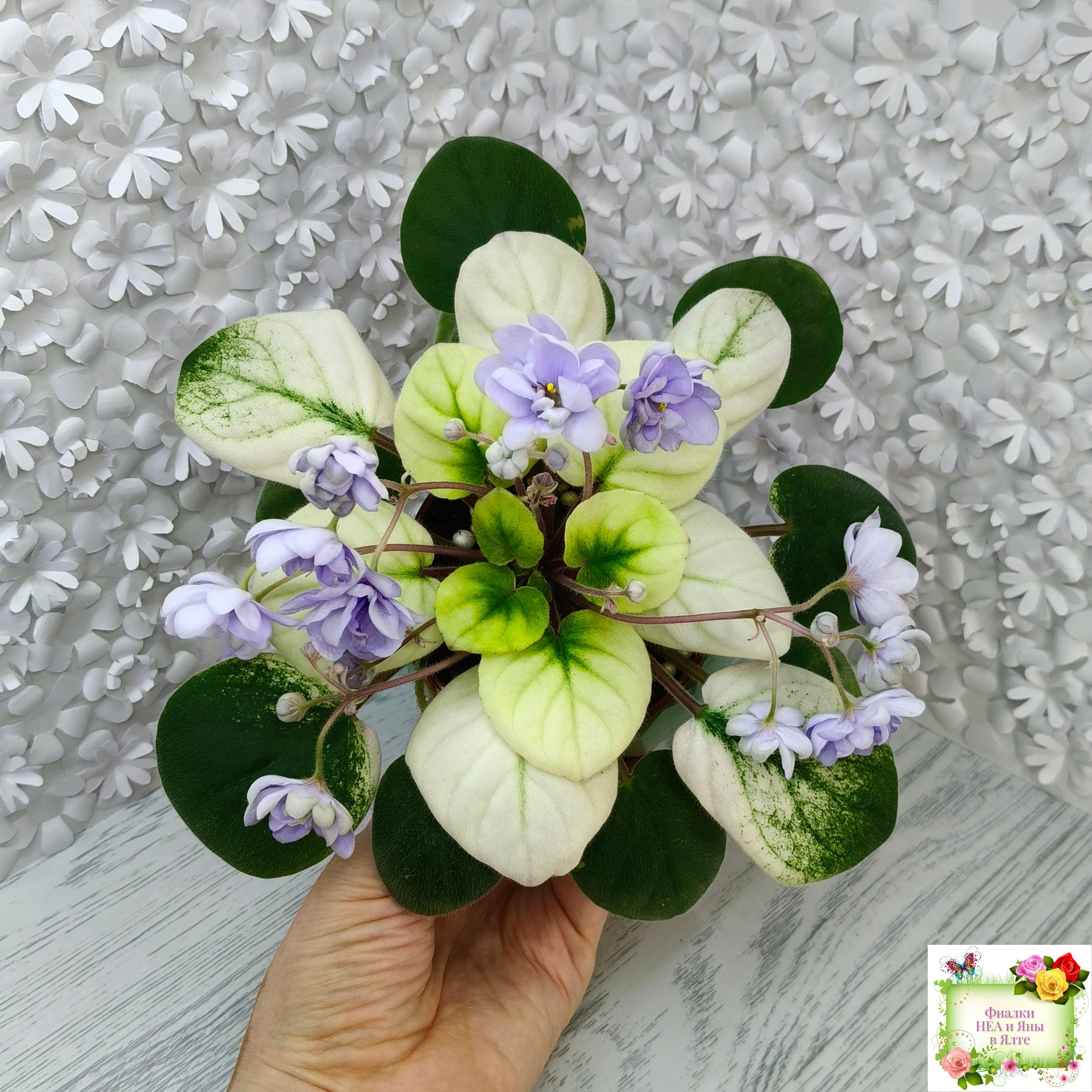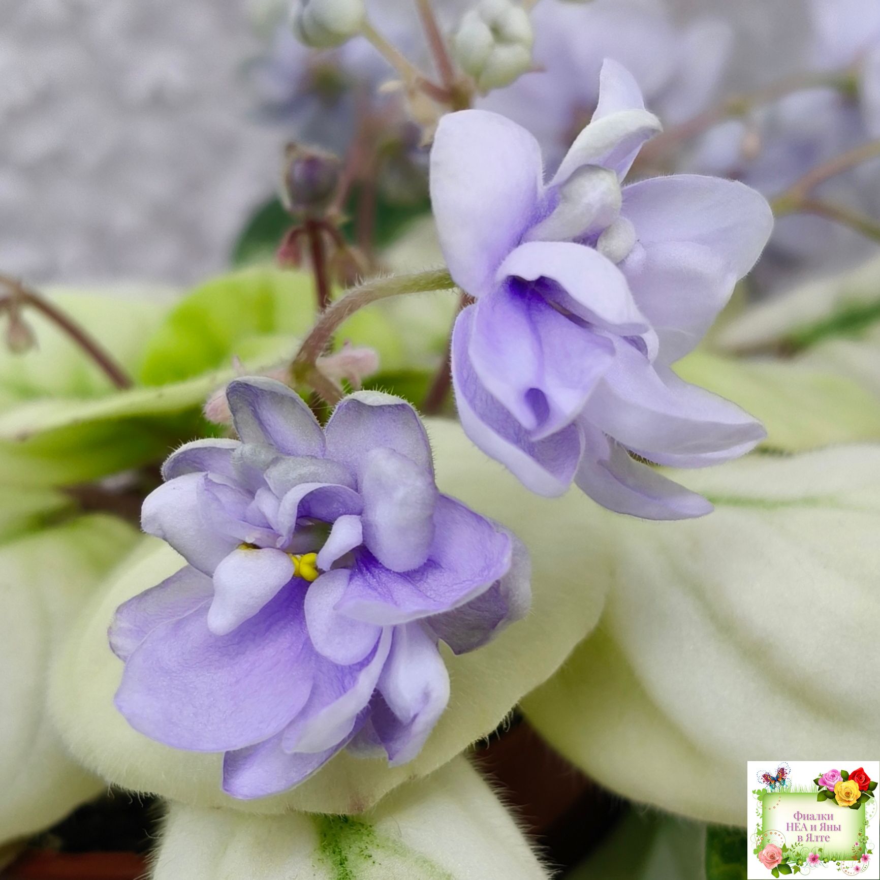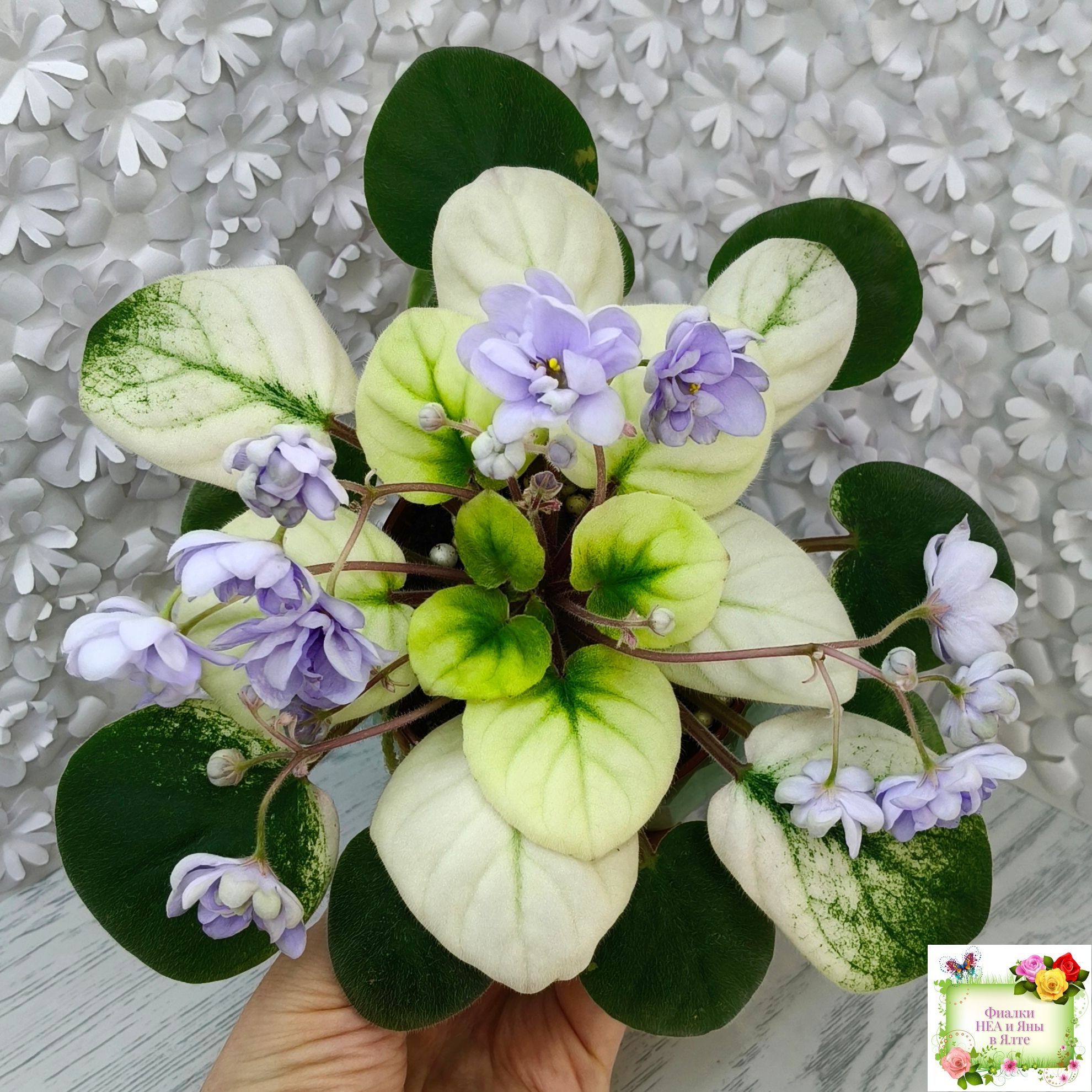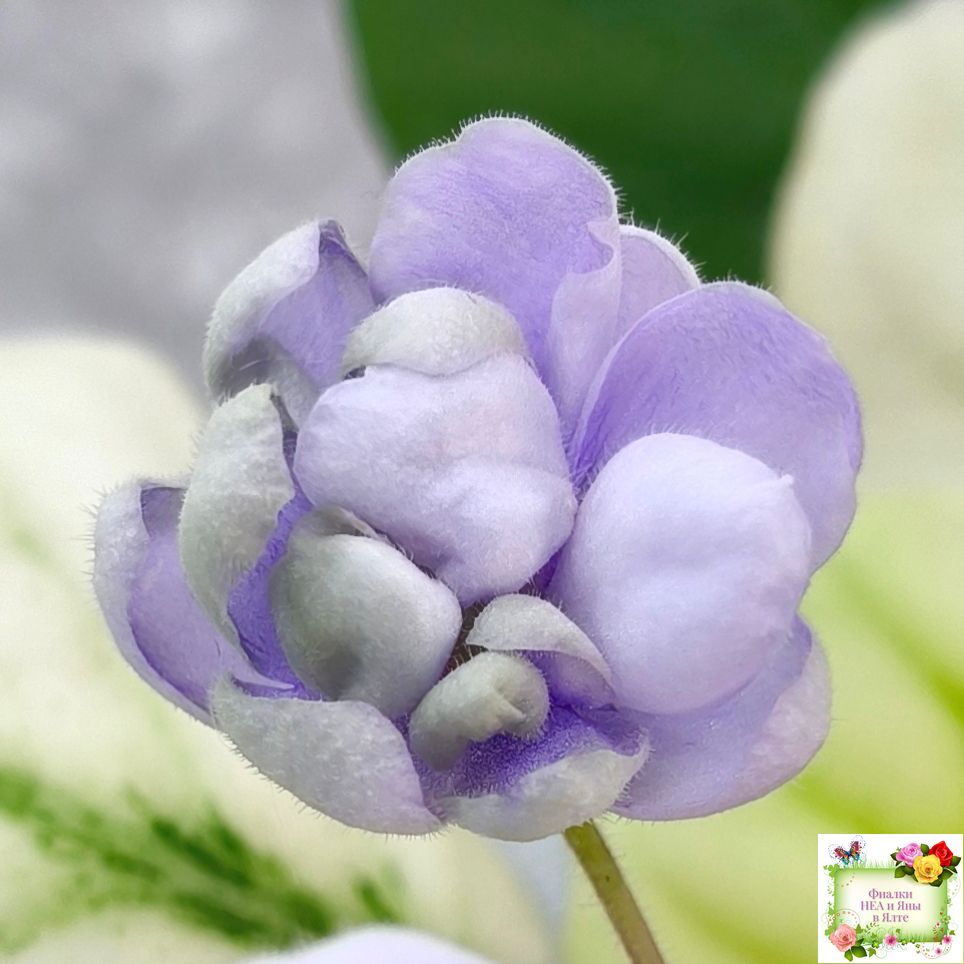 Крупные махровые чашевидные нежно-голубые цветы. Очень обильное бесконечное цветение. Кроновая золотисто-белая пестролистность простые листья. Полумини трейлер.