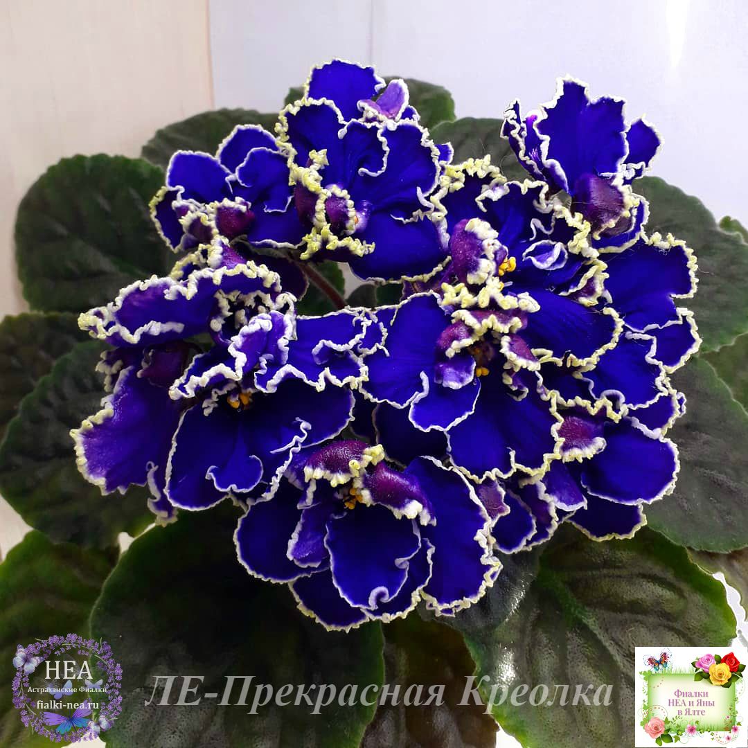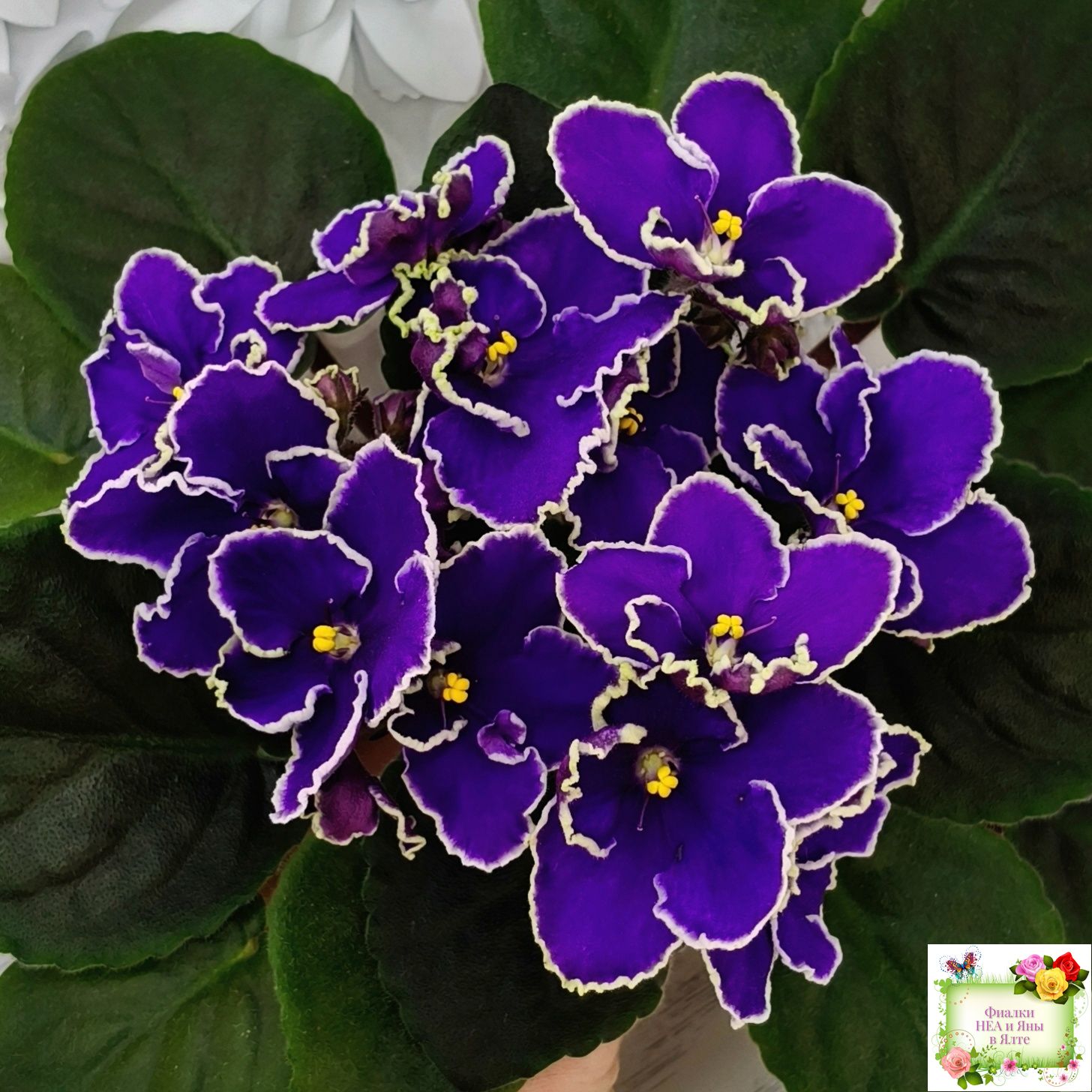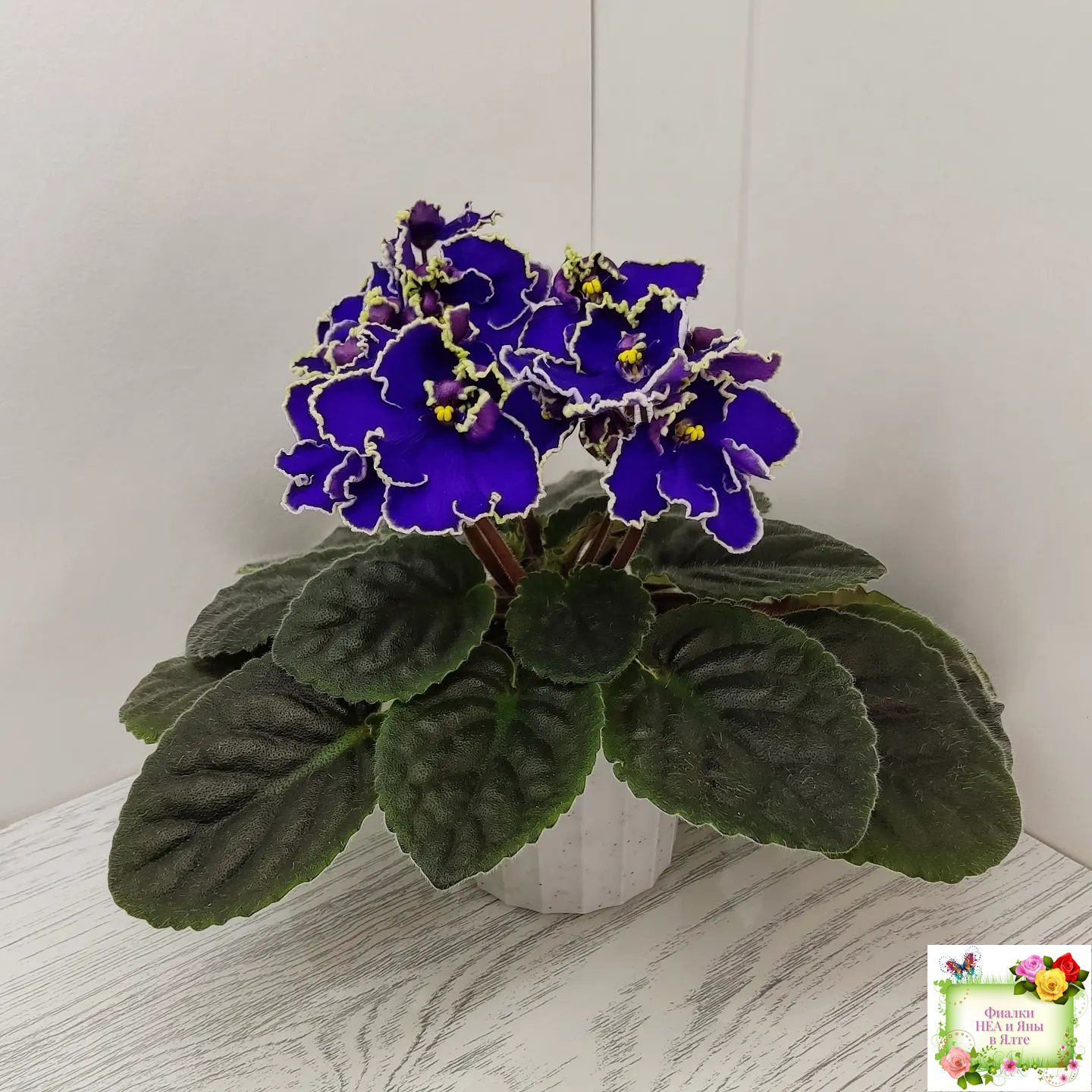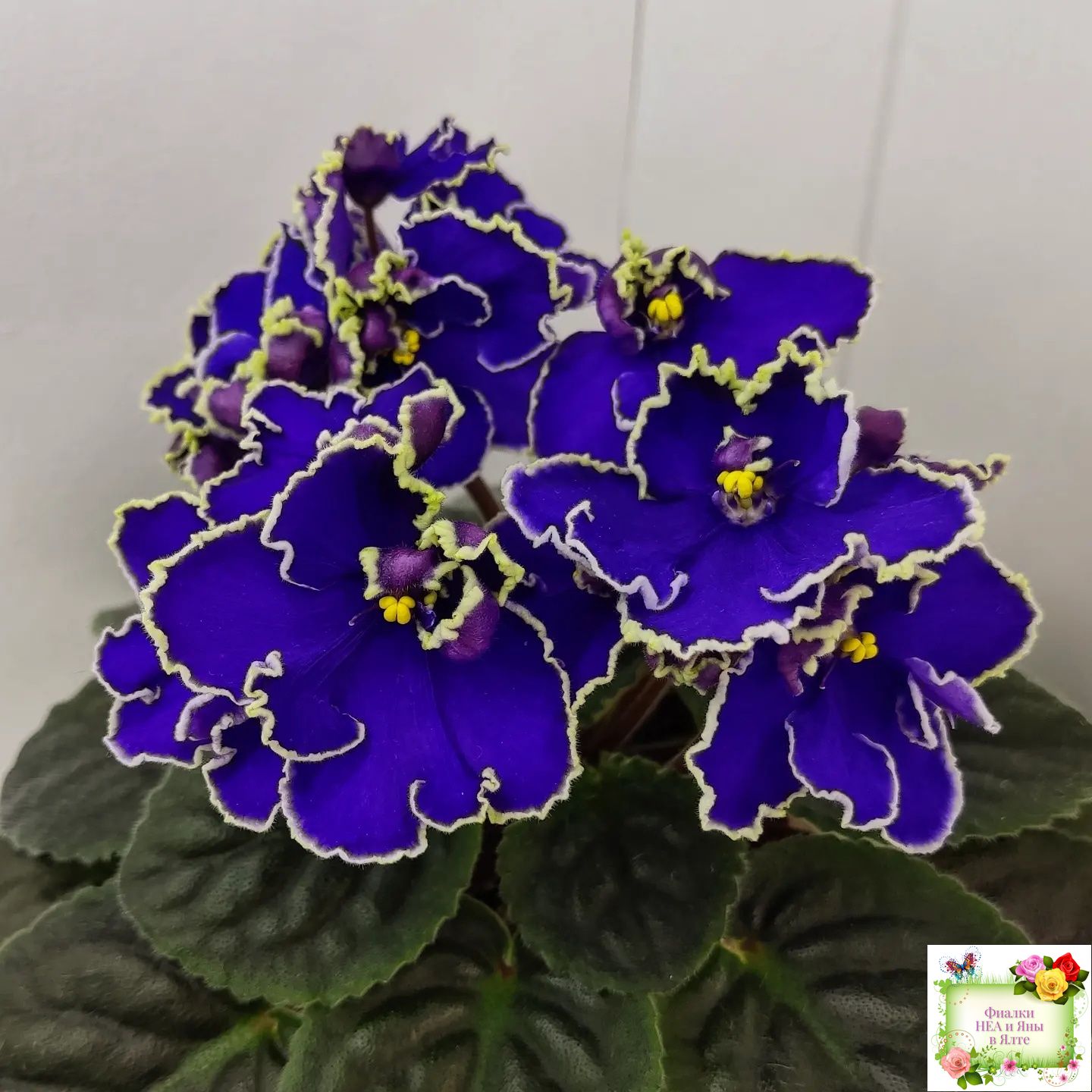 Крупные полумахровые темно-темно синие цветы фиалковой формы с широкой «жирной» волнистой зелёной бахромой. Лист средне-зелёный.