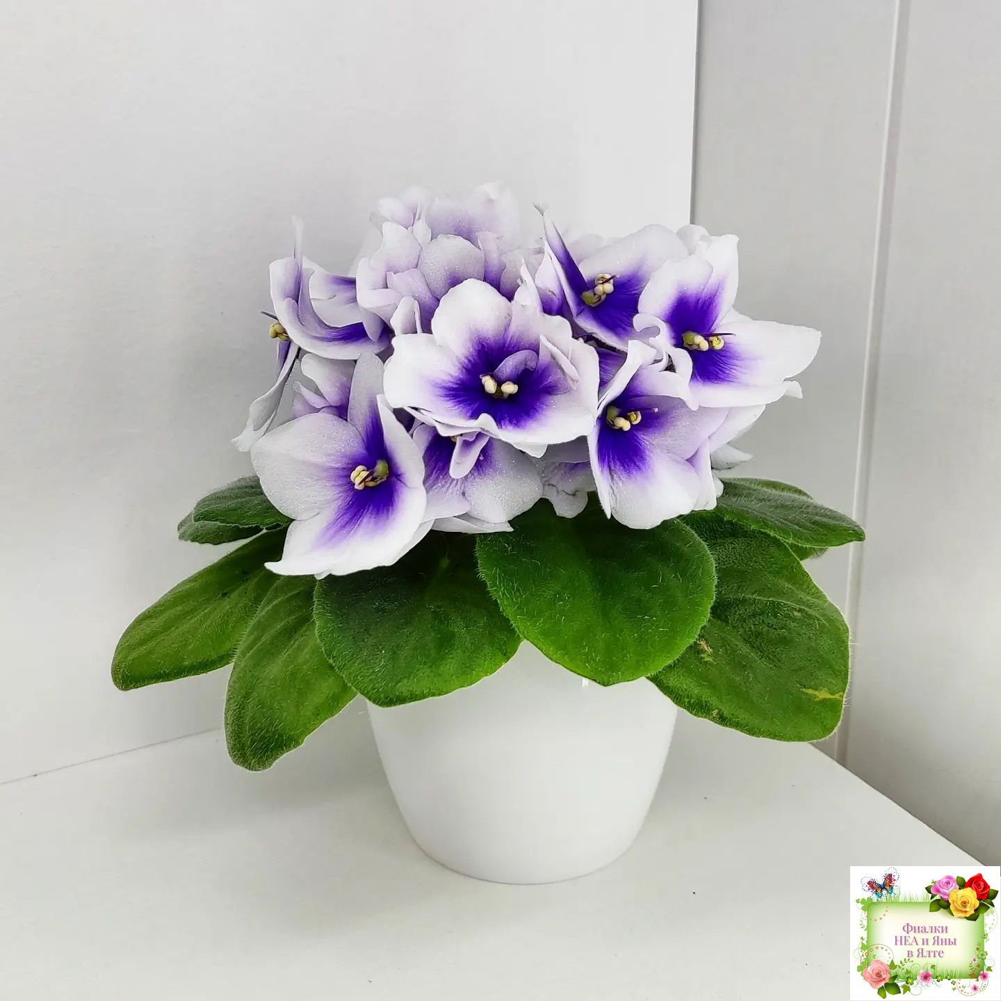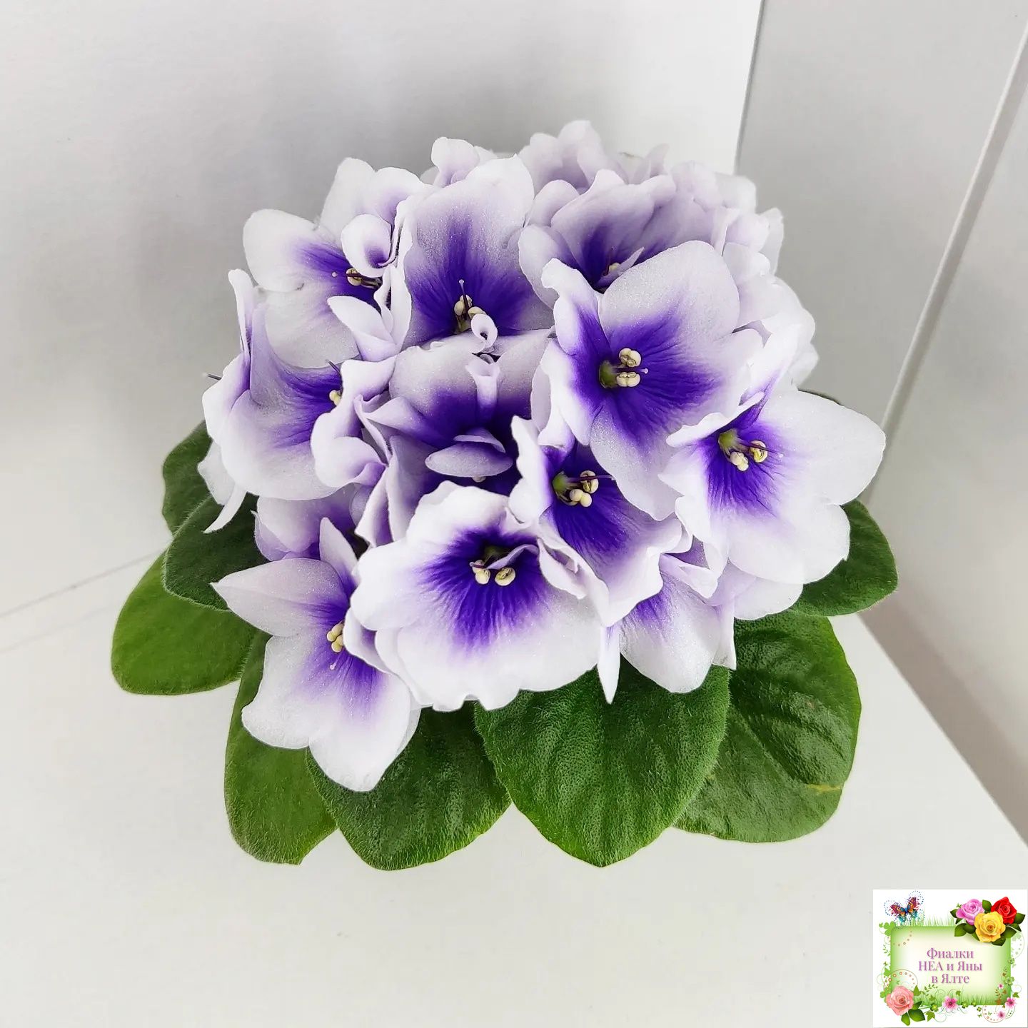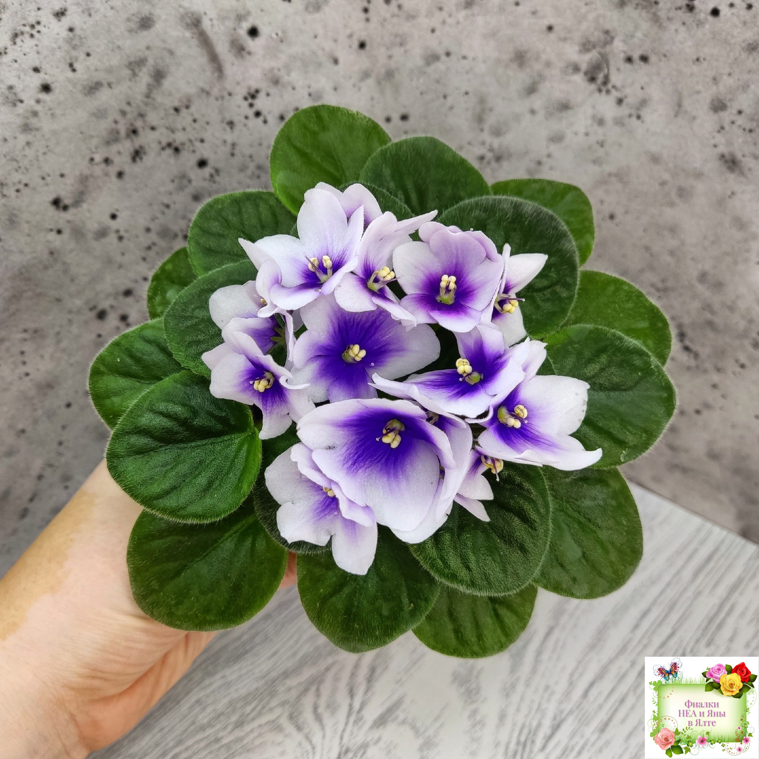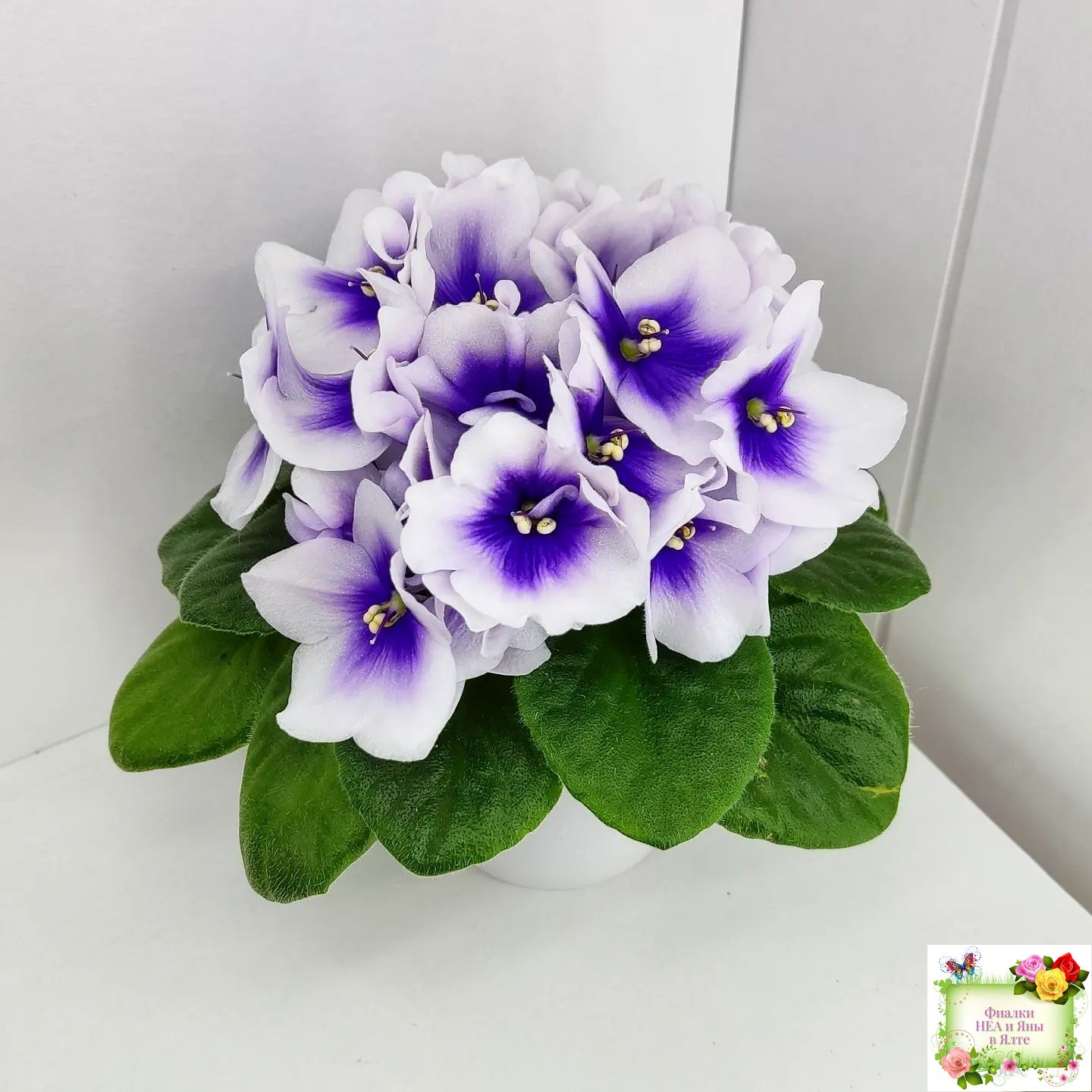 Крупные белые анютки с ярким четким синим глазком. Светло-зеленая стеганая слегка заостренная листва; миниатюрная розетка.