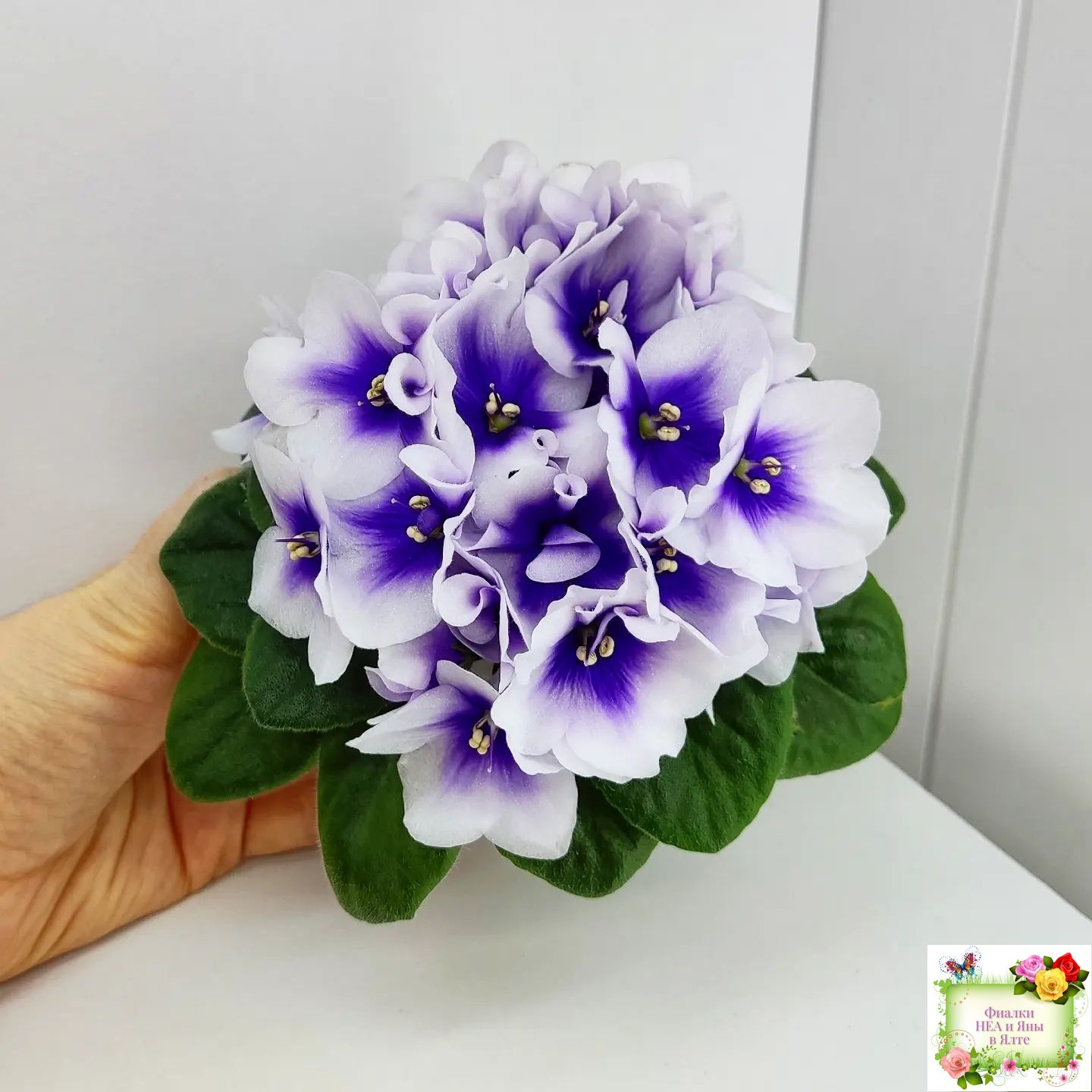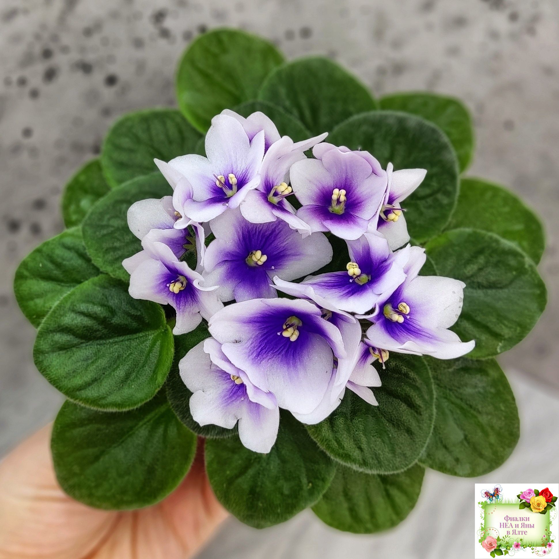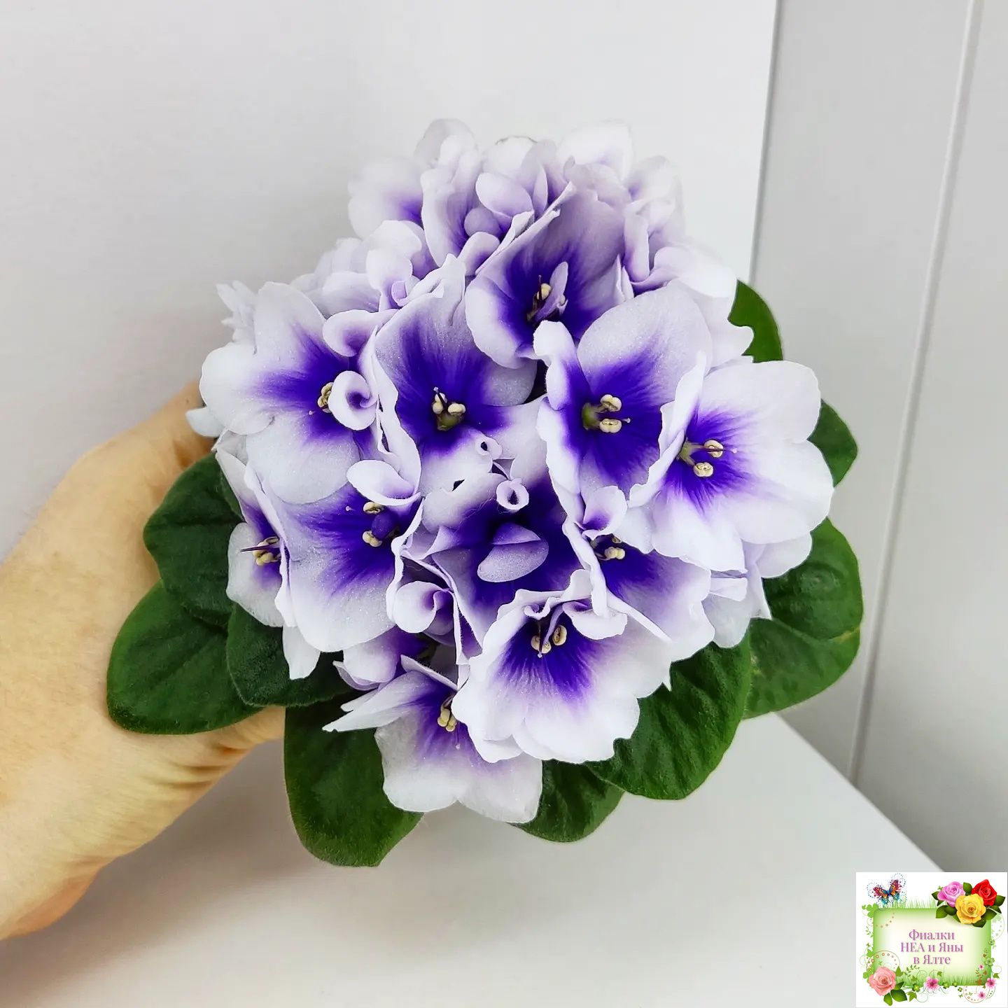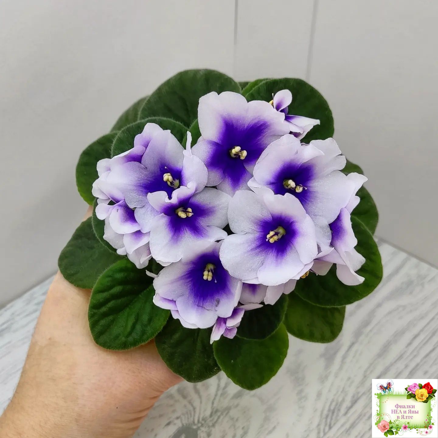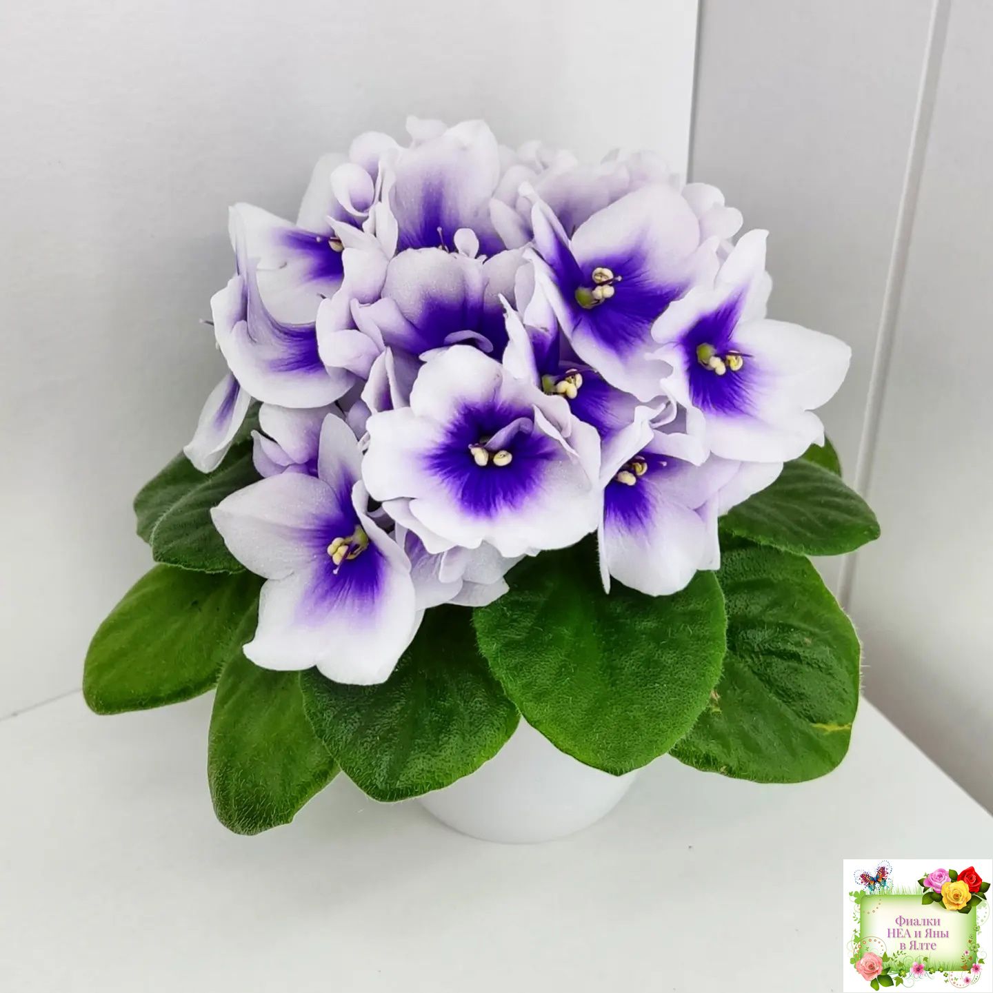 Крупные белые анютки с ярким четким синим глазком. Светло-зеленая стеганая слегка заостренная листва; миниатюрная розетка.
