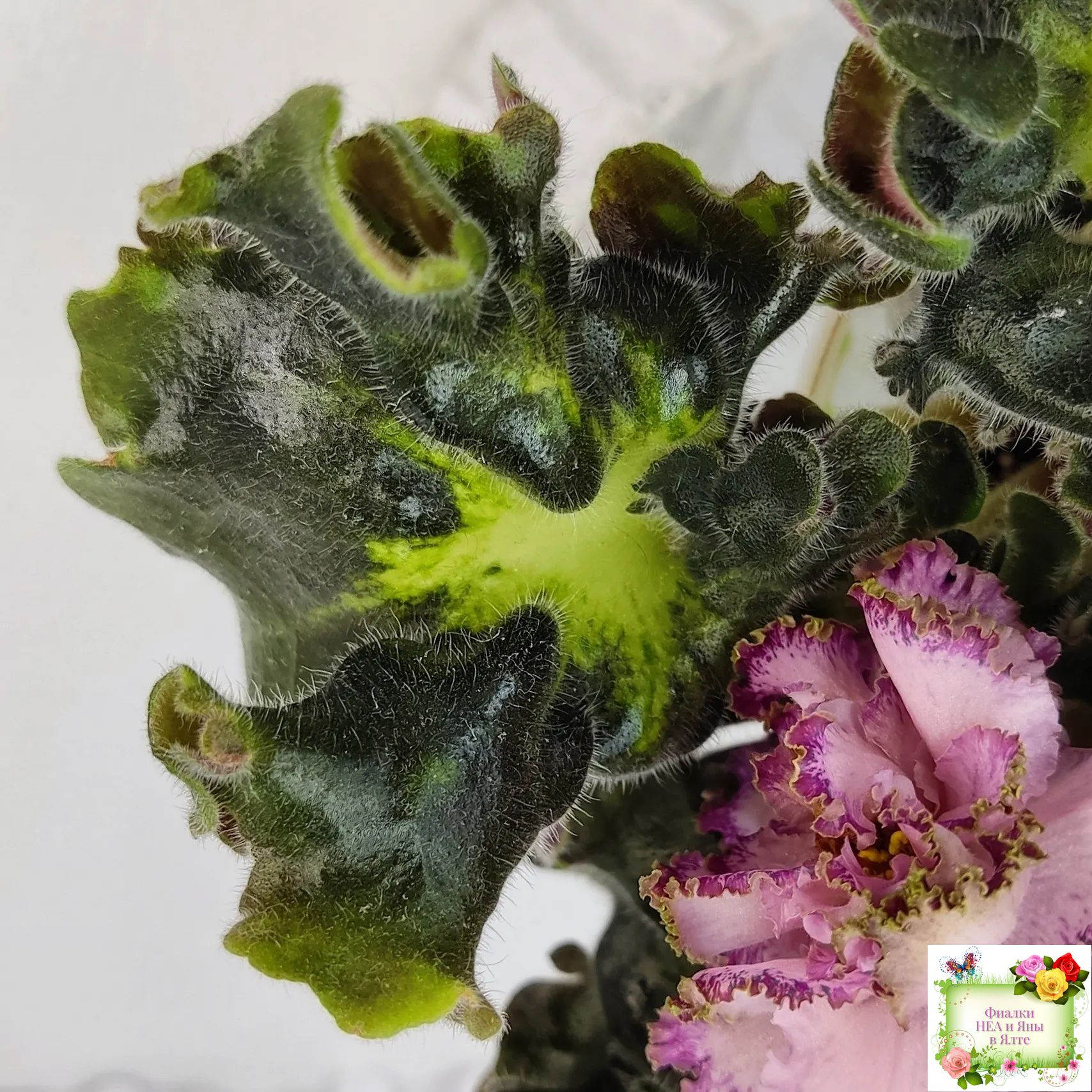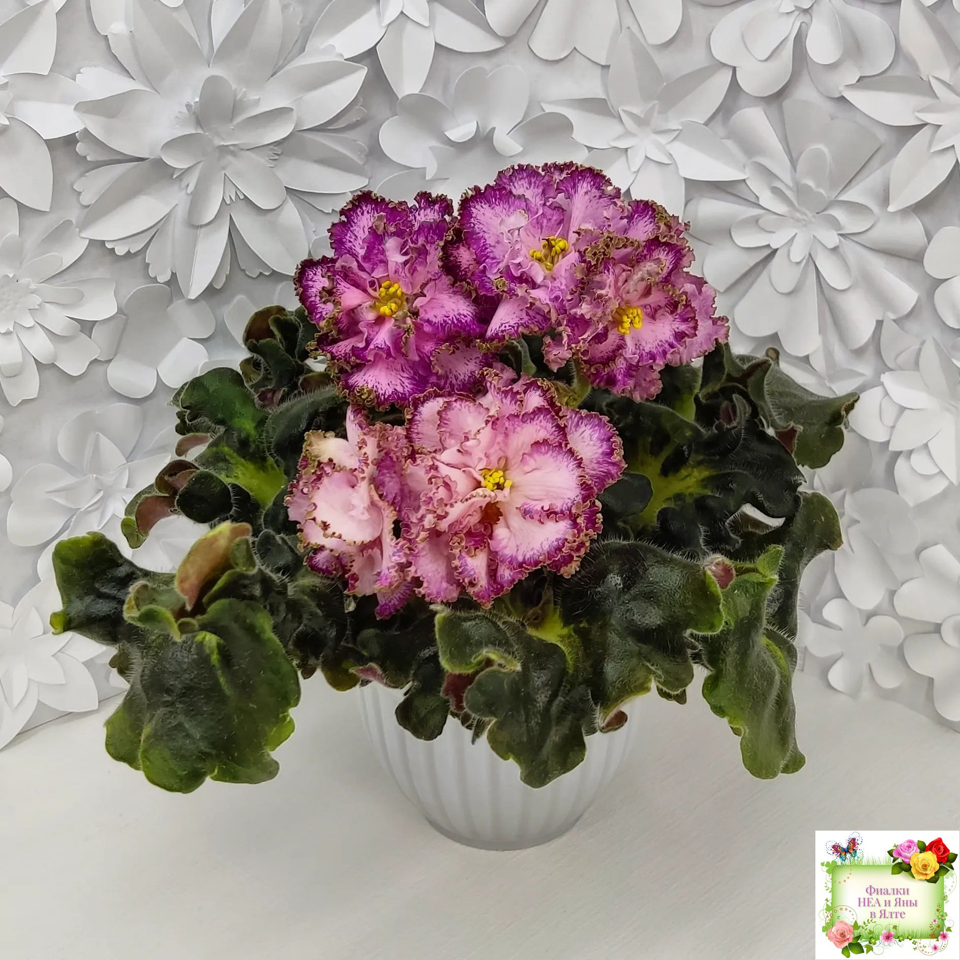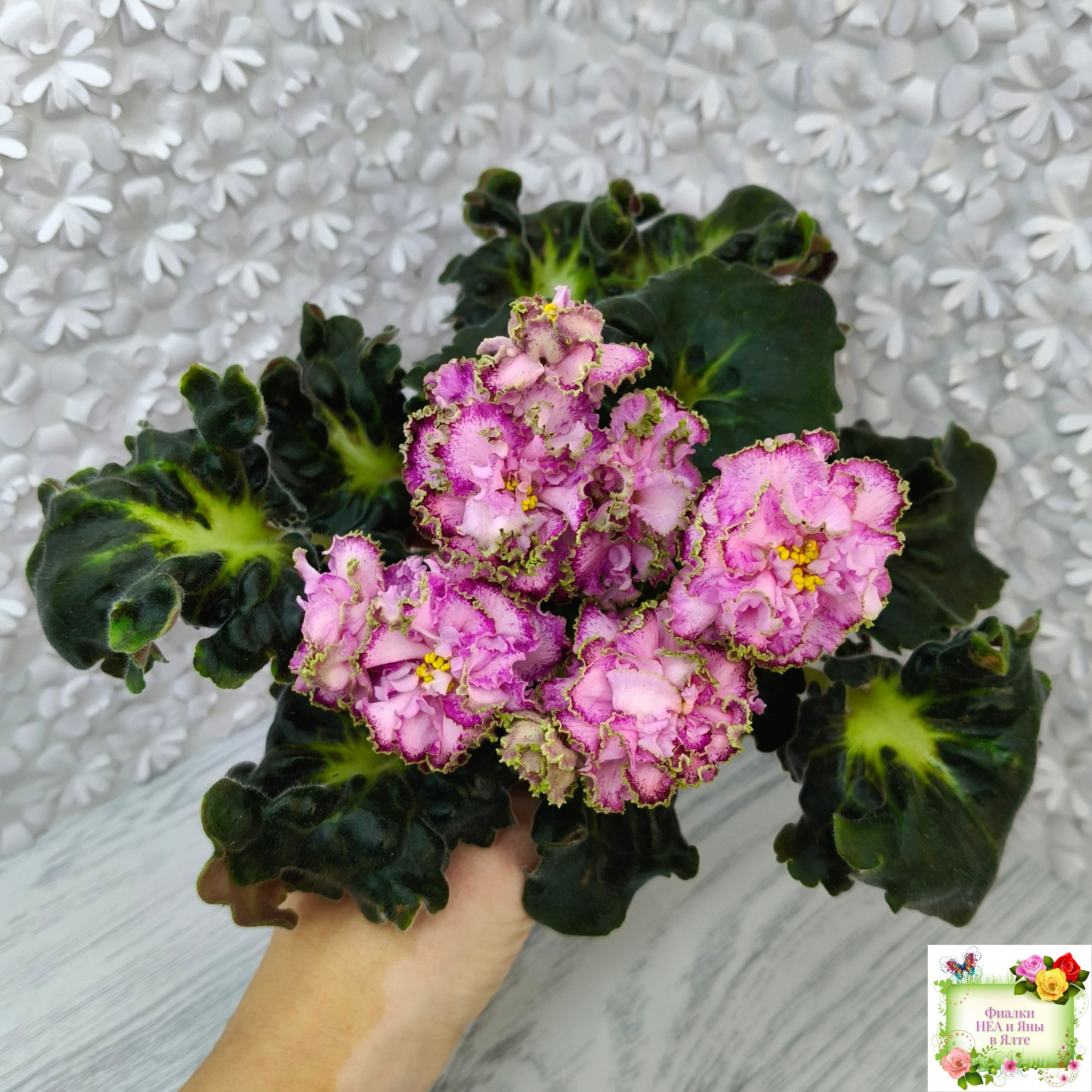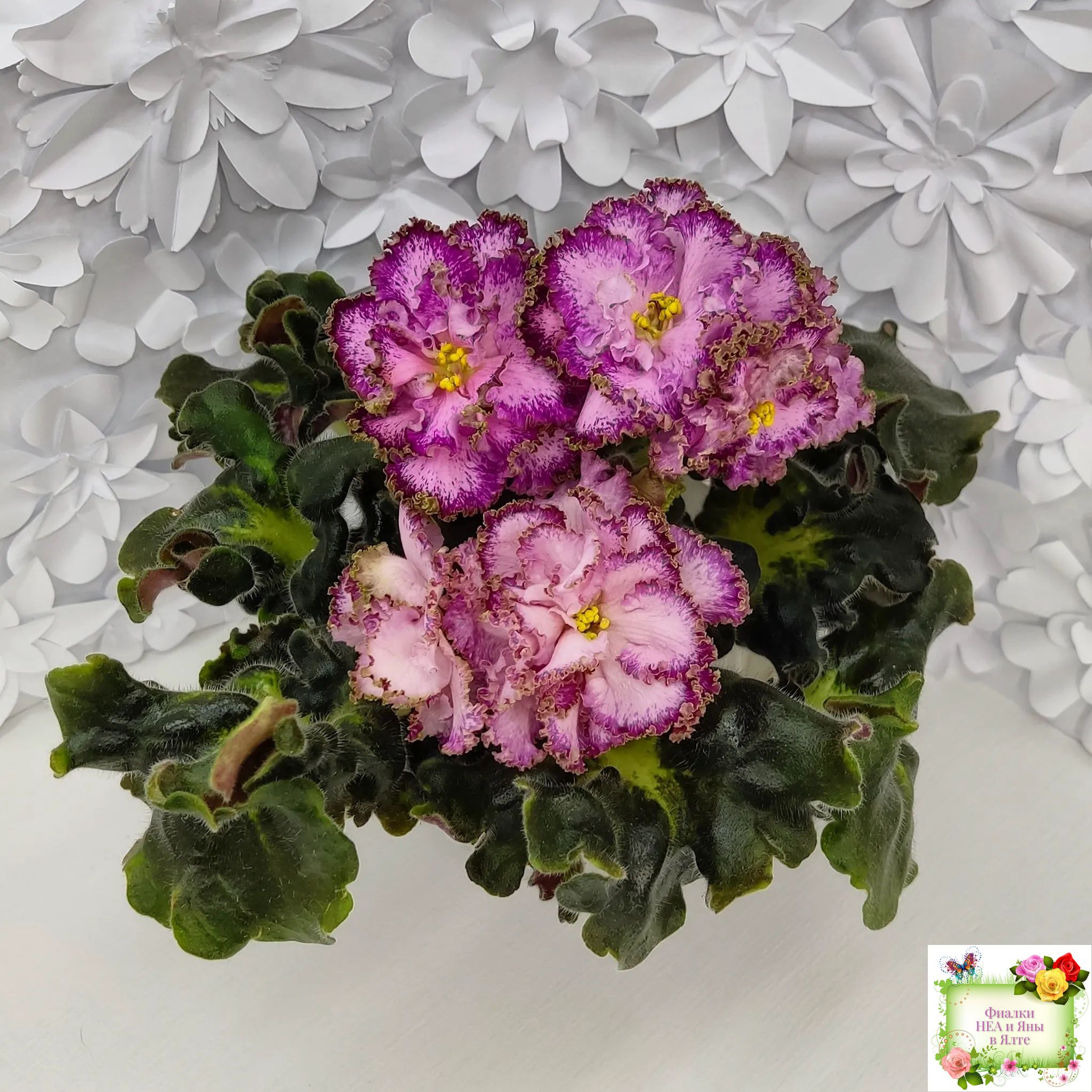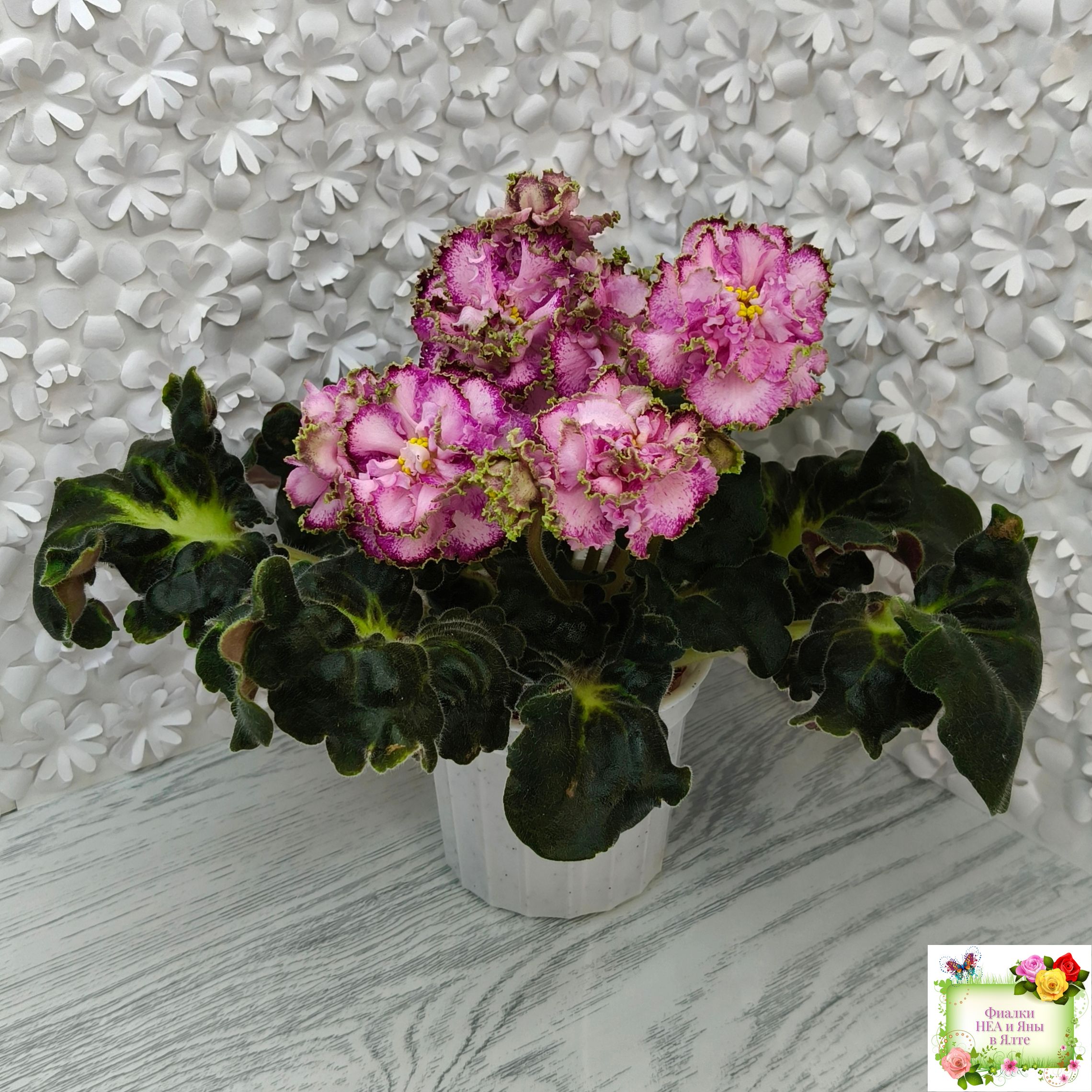 Крупные махровые цветы с белым центром, малиновой каймой напылением и салатовой гофрированной рюшкой на небольшой, темной розетке с герл- листвой.