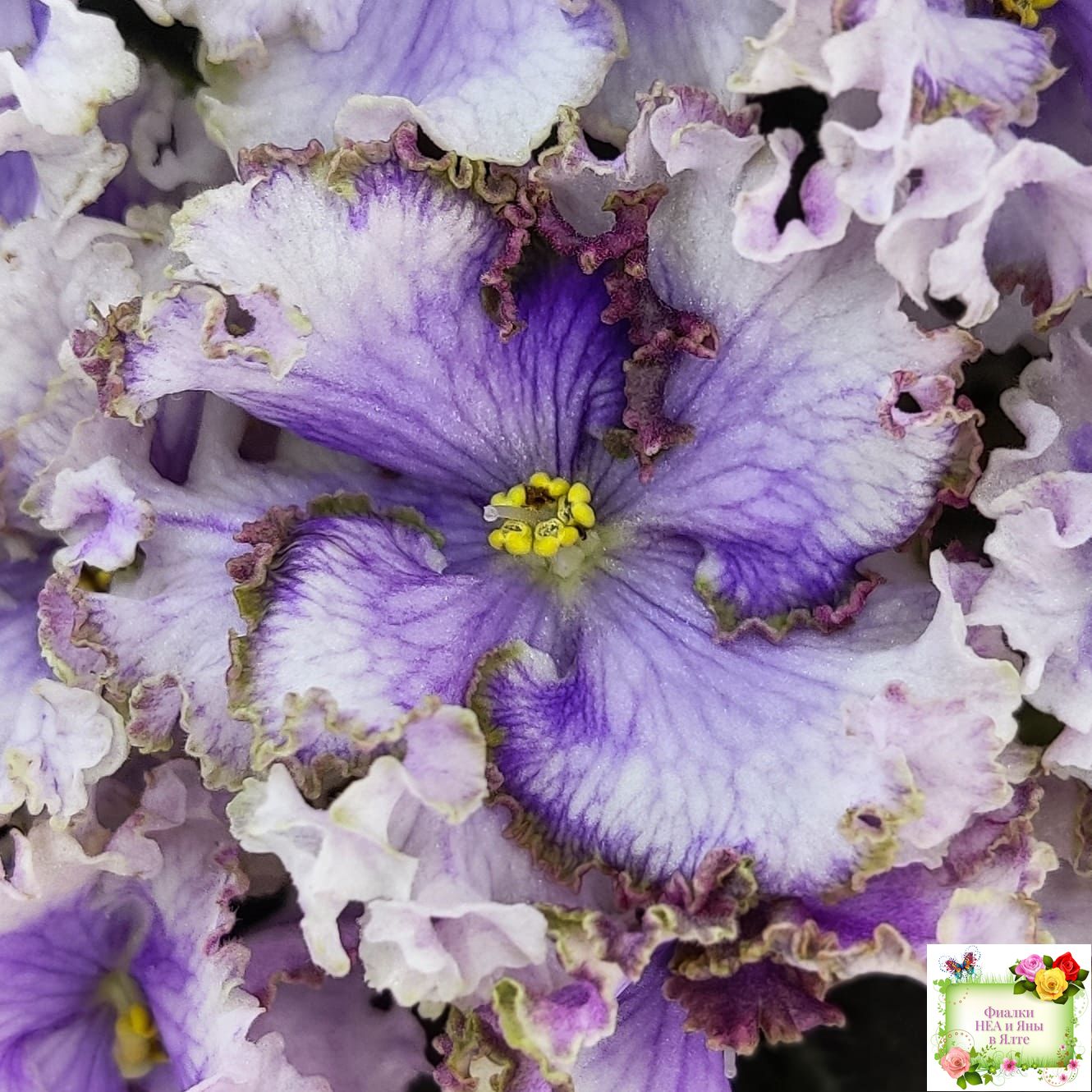 Цветок: Интересный светло-голубой цветок с сине-фиолетовым венозным рисунком и тугой бронзовой рюшью.