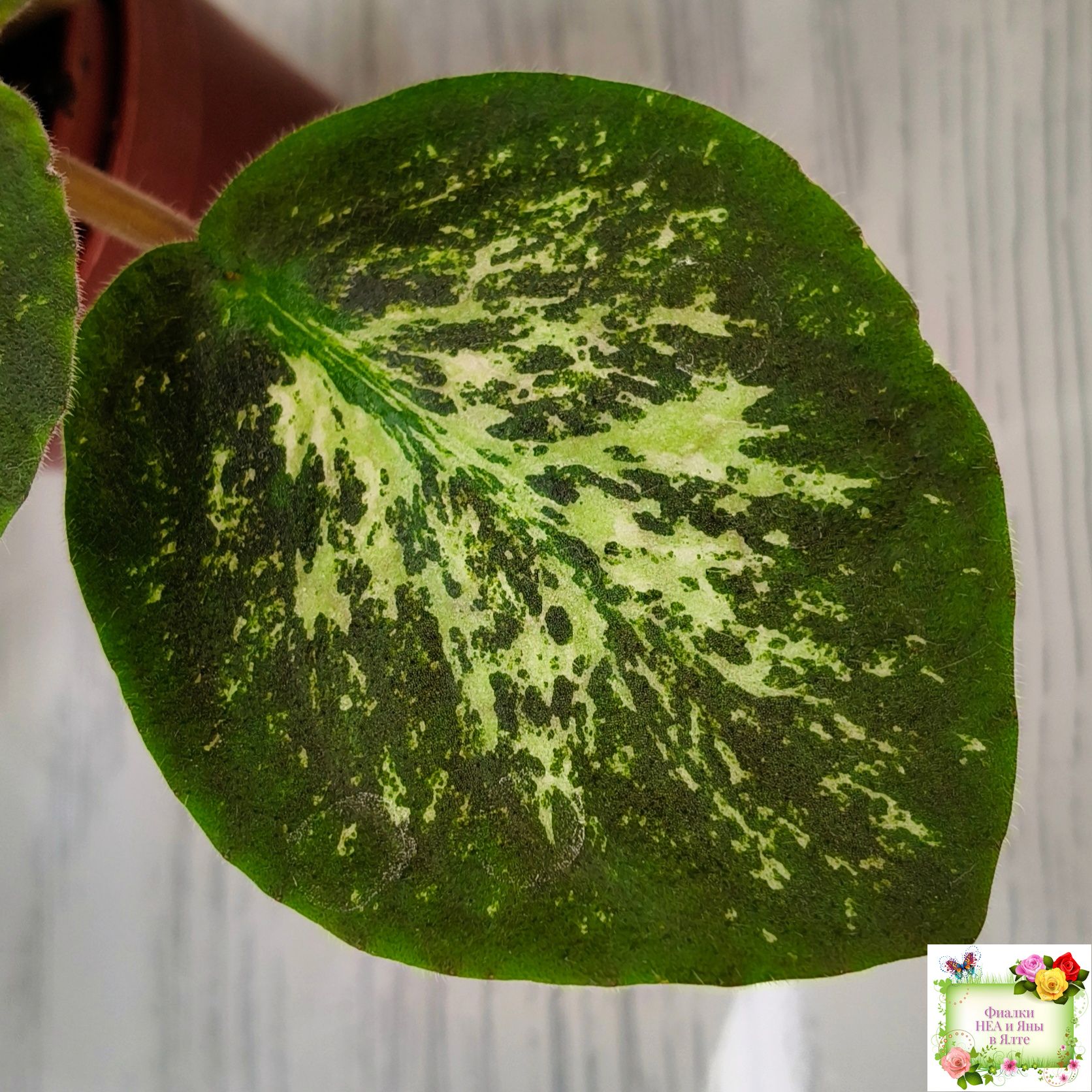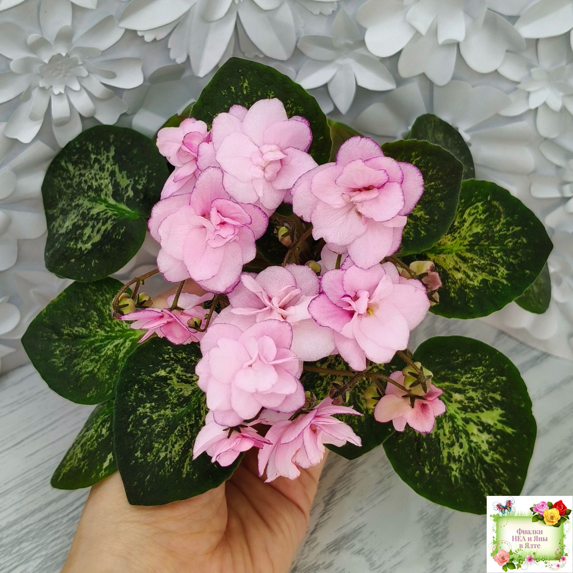 Semidouble light pink/darker fantasy edge. Mosaic variegated dark green and pink, plain. Standard.