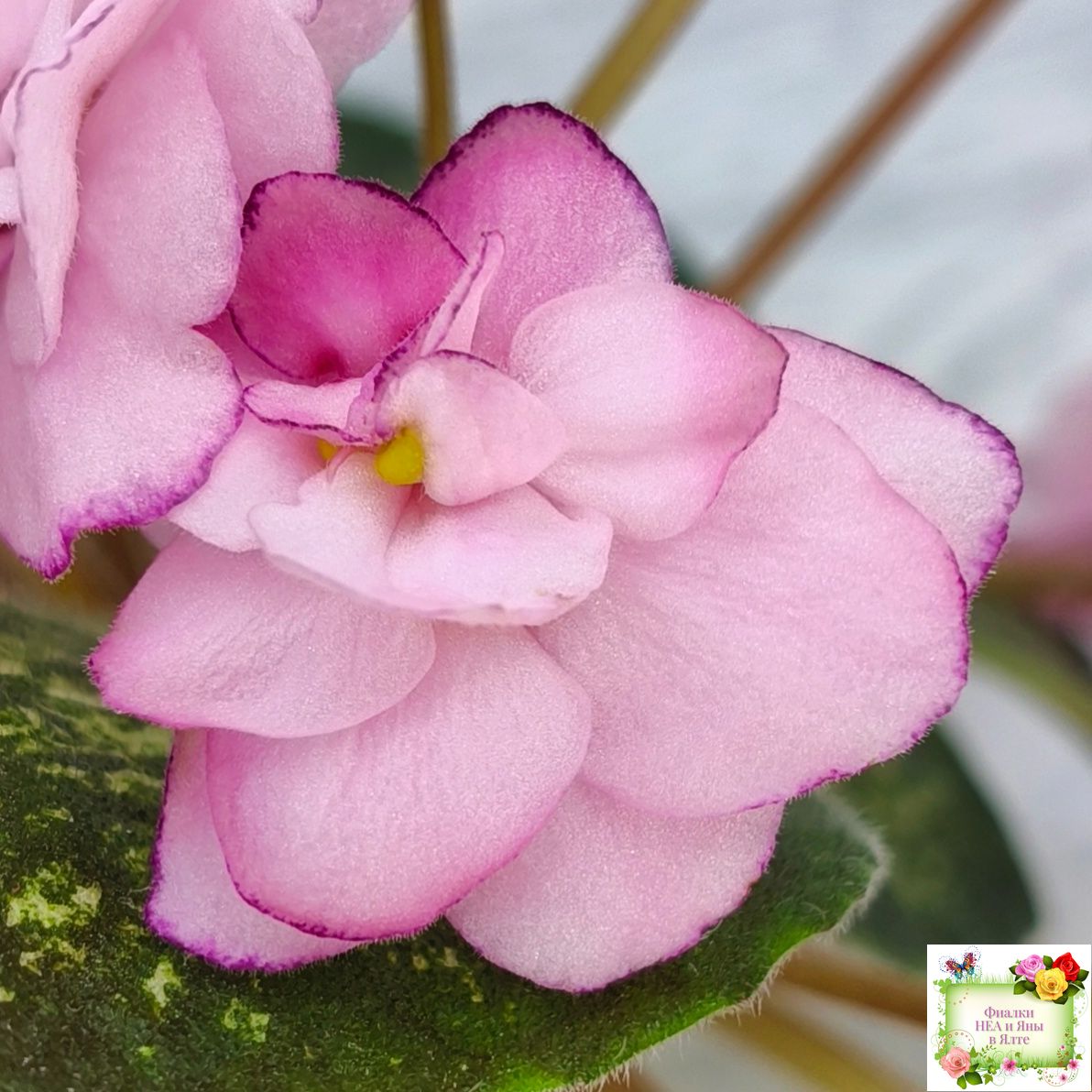 Полумахровые светло-розовые анютки с более темной фантазийной каймой. Темно-зеленая с розовым мозаичная пестролистность. Компактный стандарт.