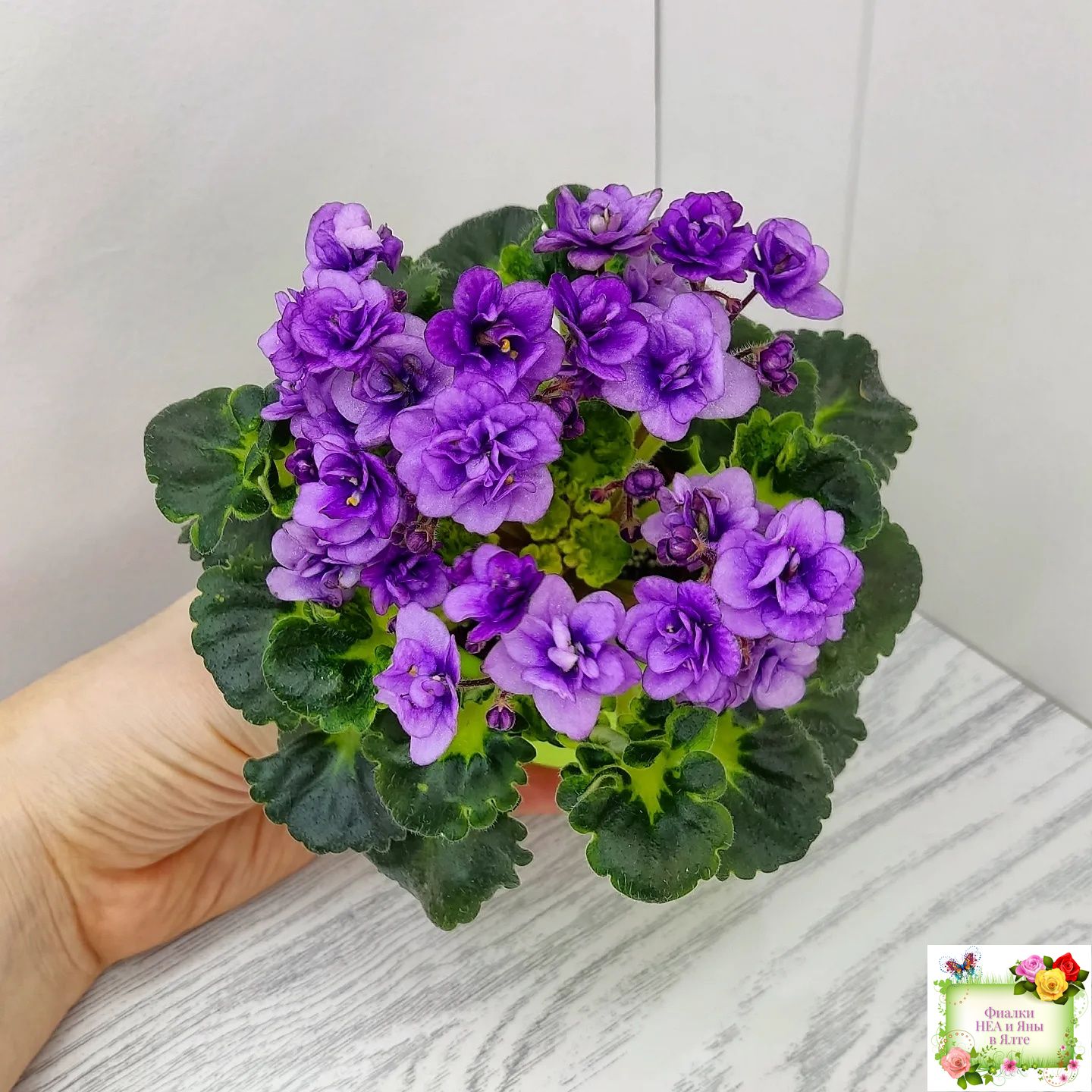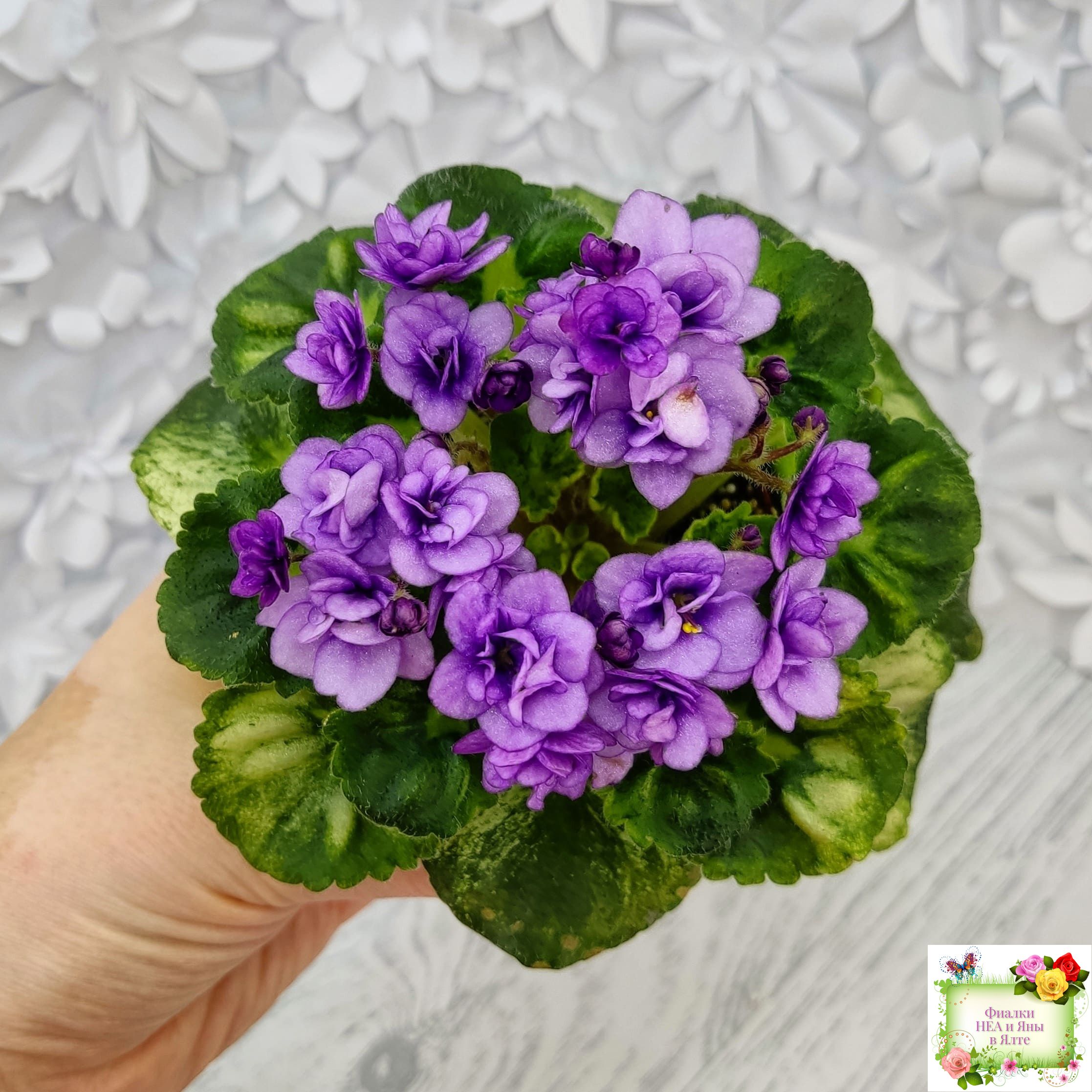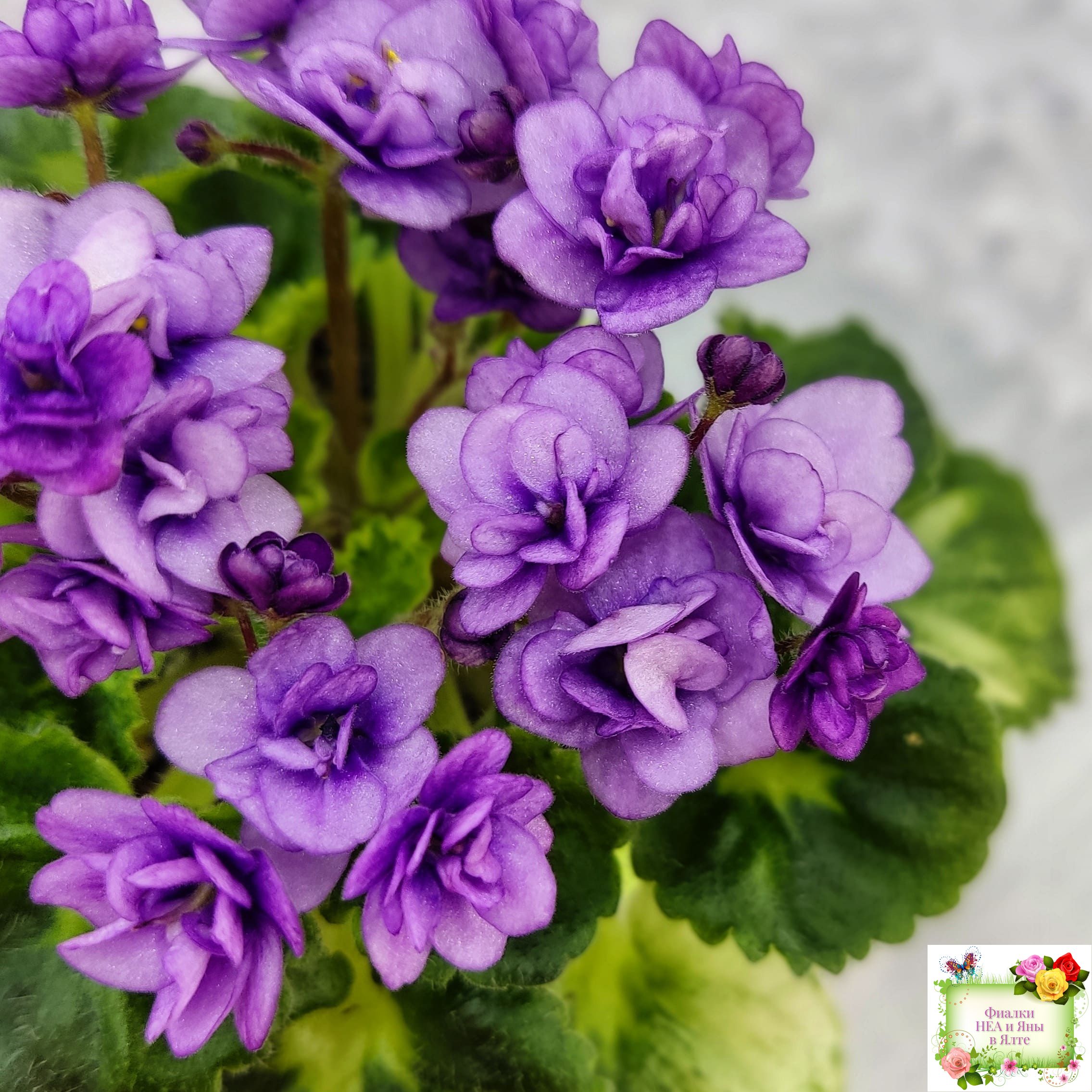 Махровые сиренево-лавандовые цветы-шарики; необычайно красивая кудрявая золотисто-зеленая гел-листва с кроновой пестролистностью. Полумини.