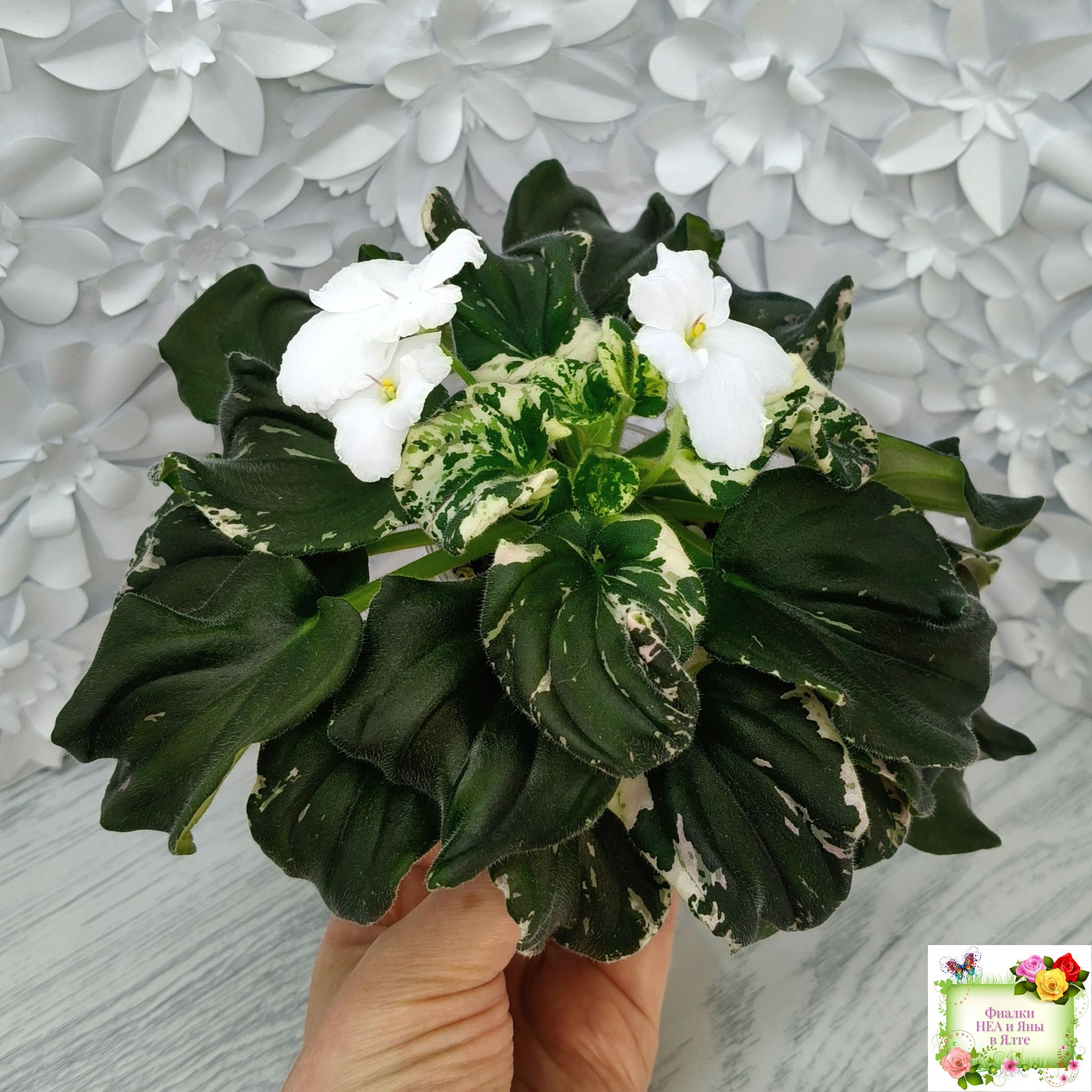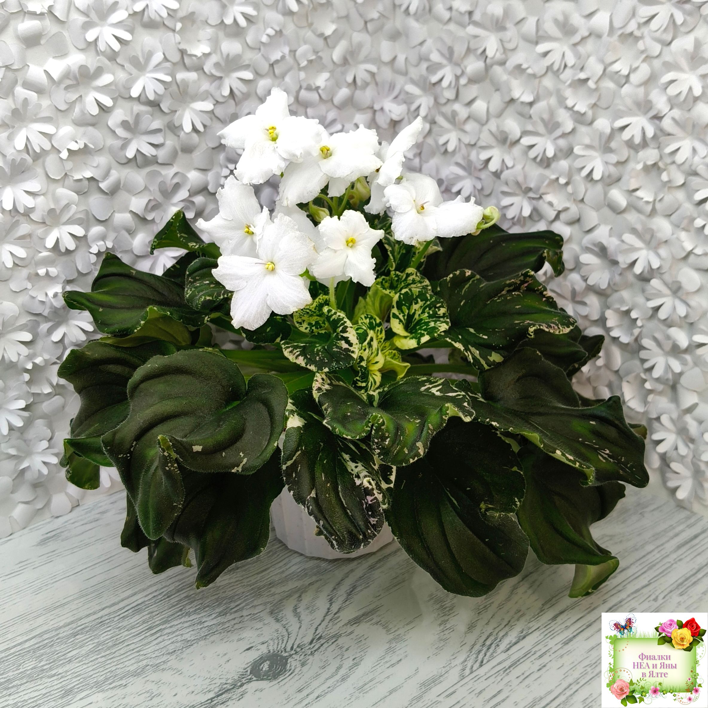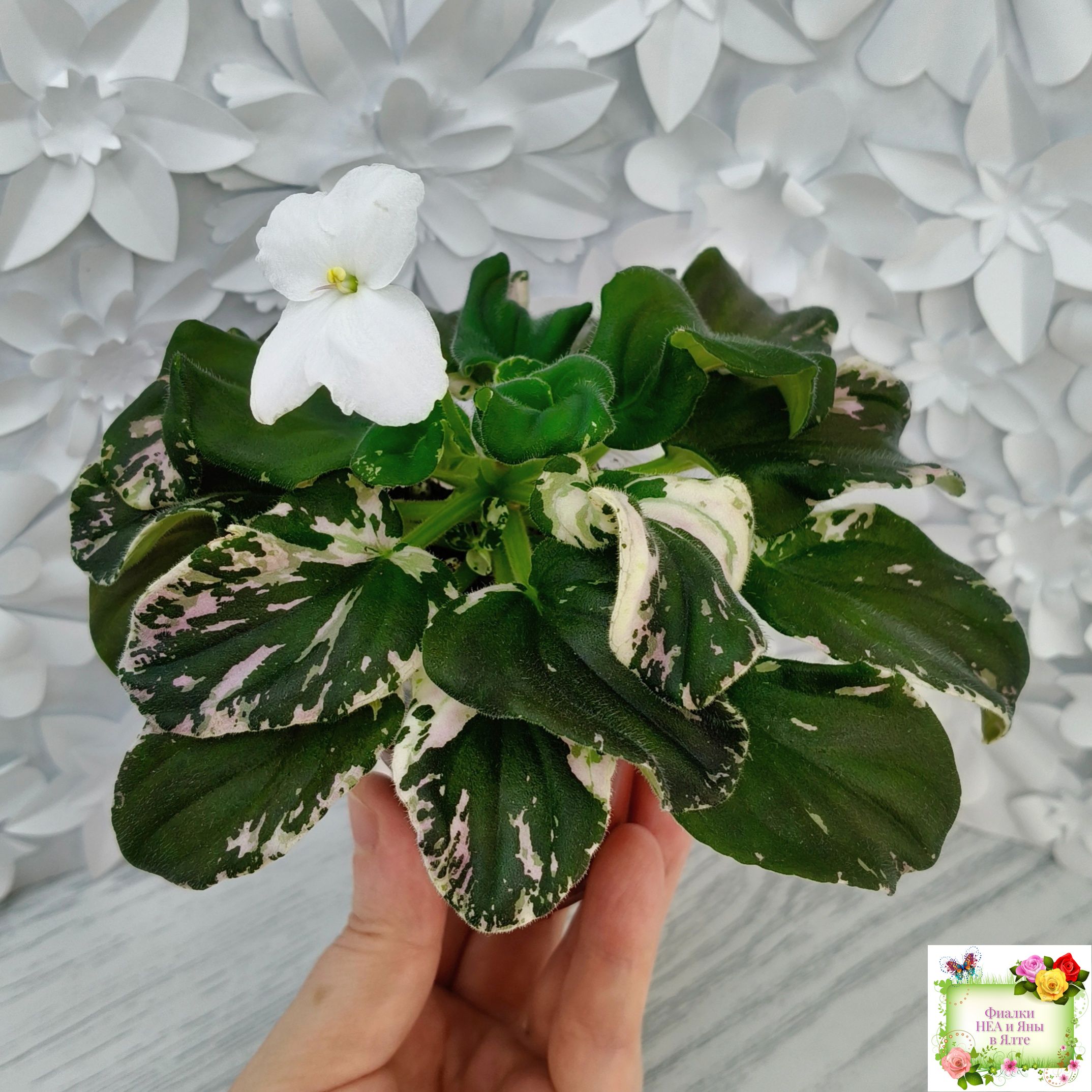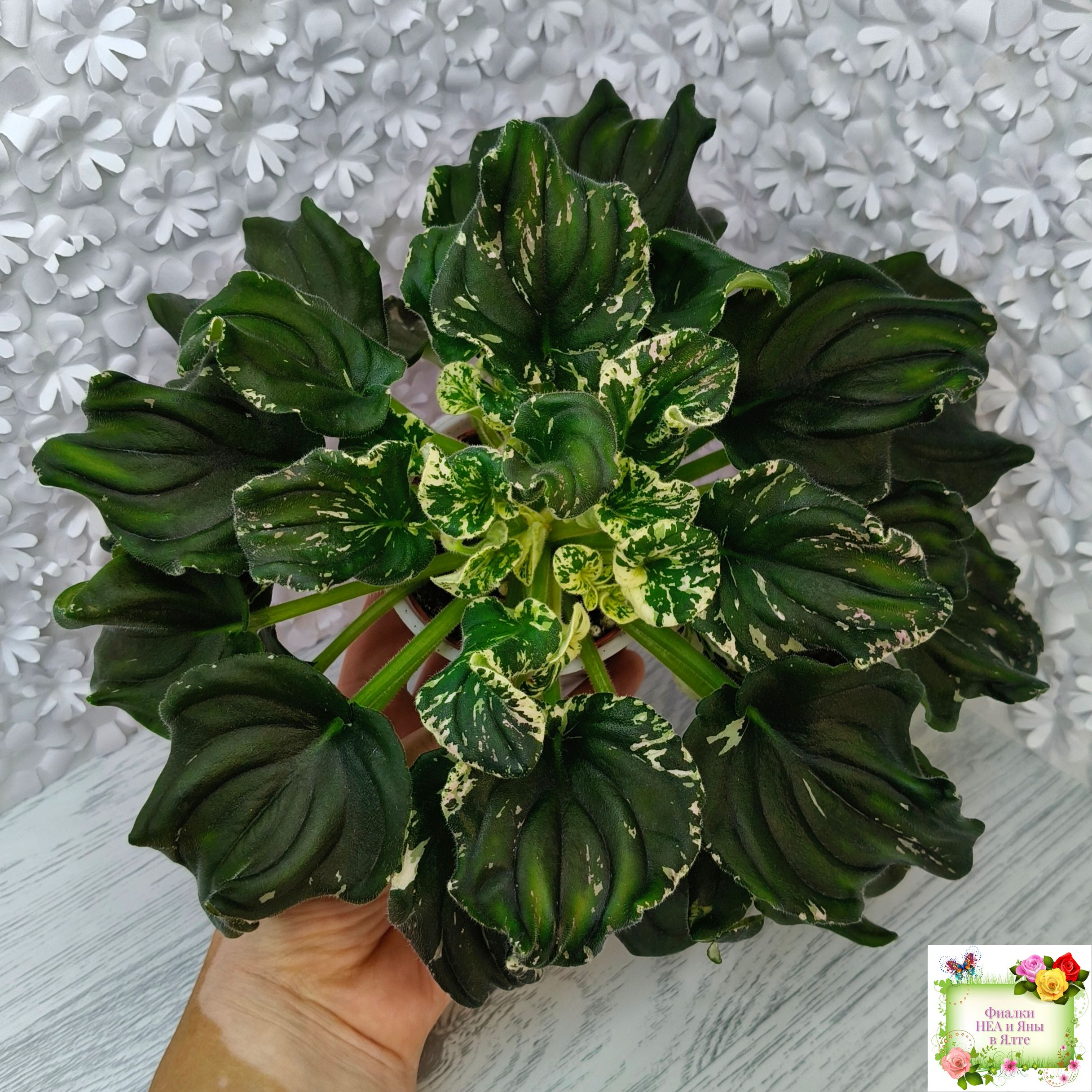 Розетка: Темно-зелёный лист клакамасного типа жилкования с бело-розовой пестролистностью.