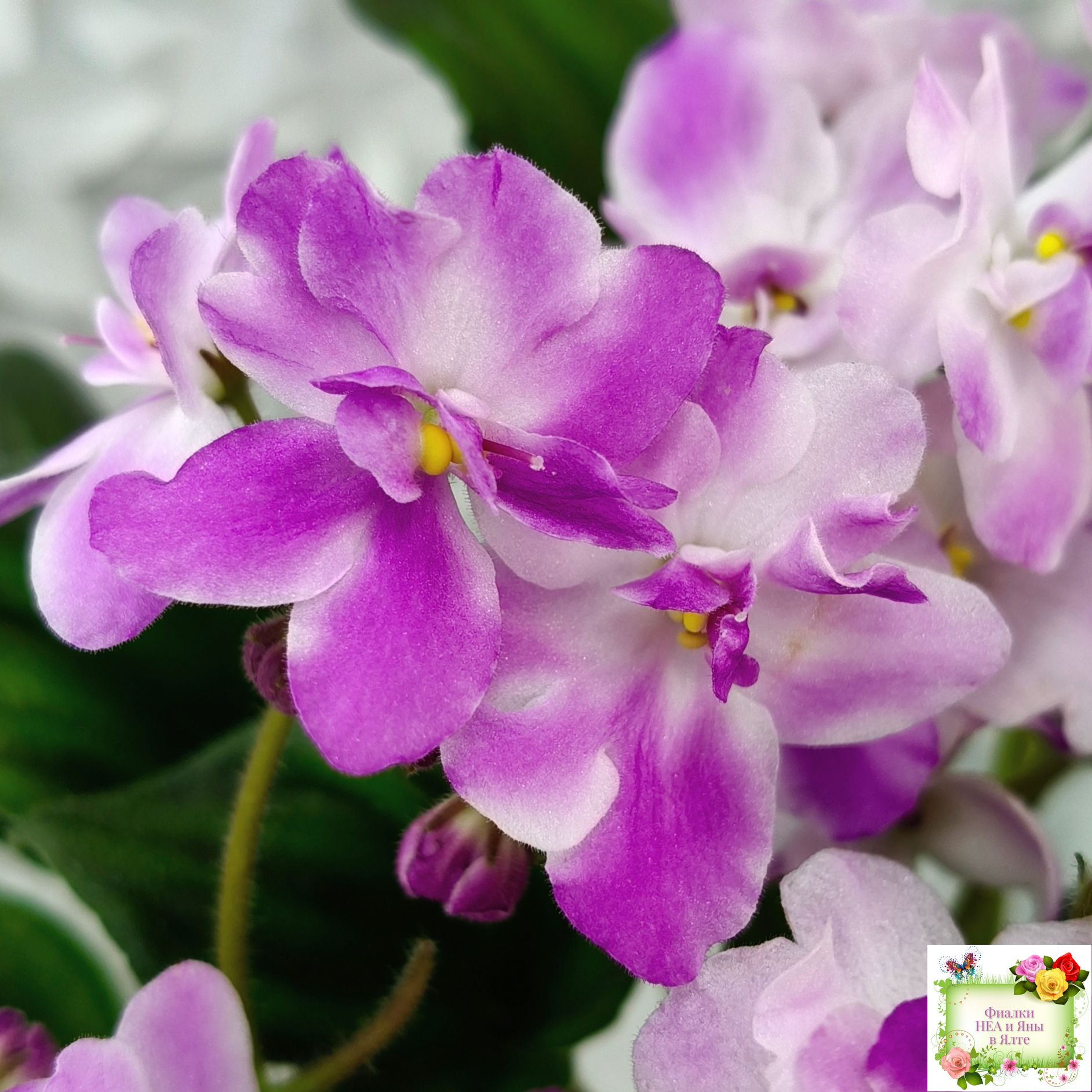 Цветок: Простой или полумахровый фиалковой формы белый с яркими сиренево-малиновыми напечатками.