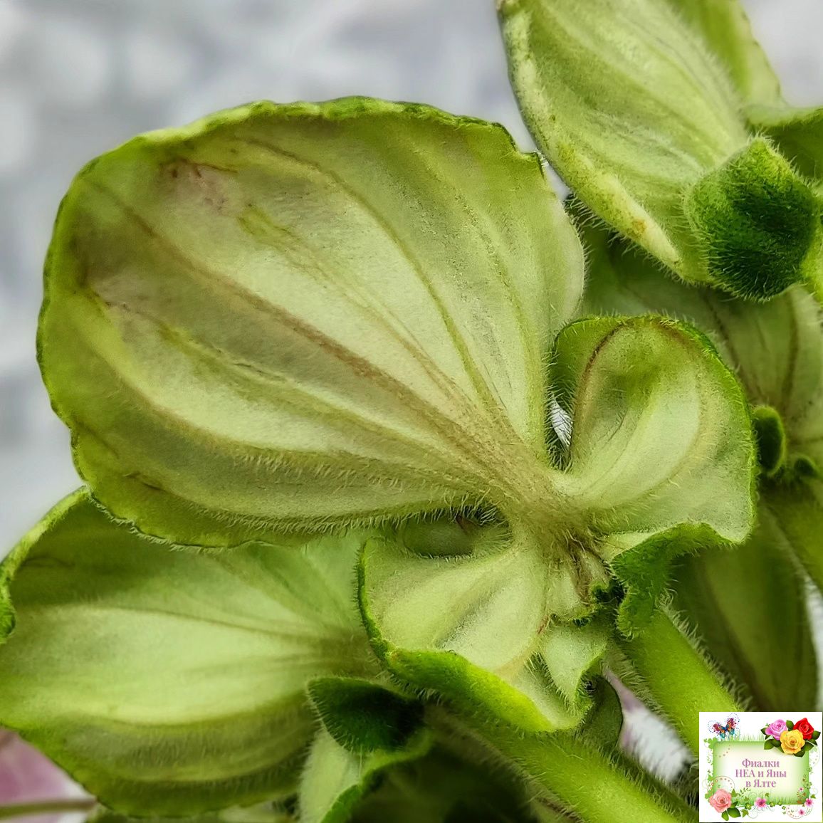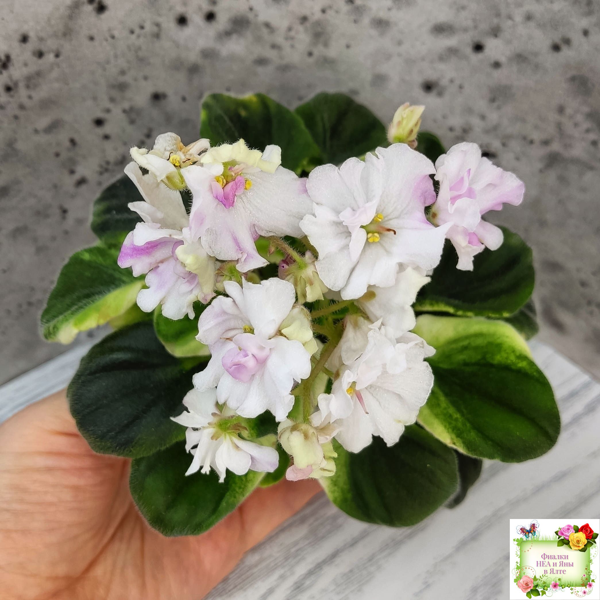 Розетка: Ложковидная средне -зелёная с бело-жёлтой кроновой пестролистностью листва с гладким краем, с клакамусным типом жилкования, турнюрная (с прилистниками). Ложковидность появляется по мере взросления розетки.
