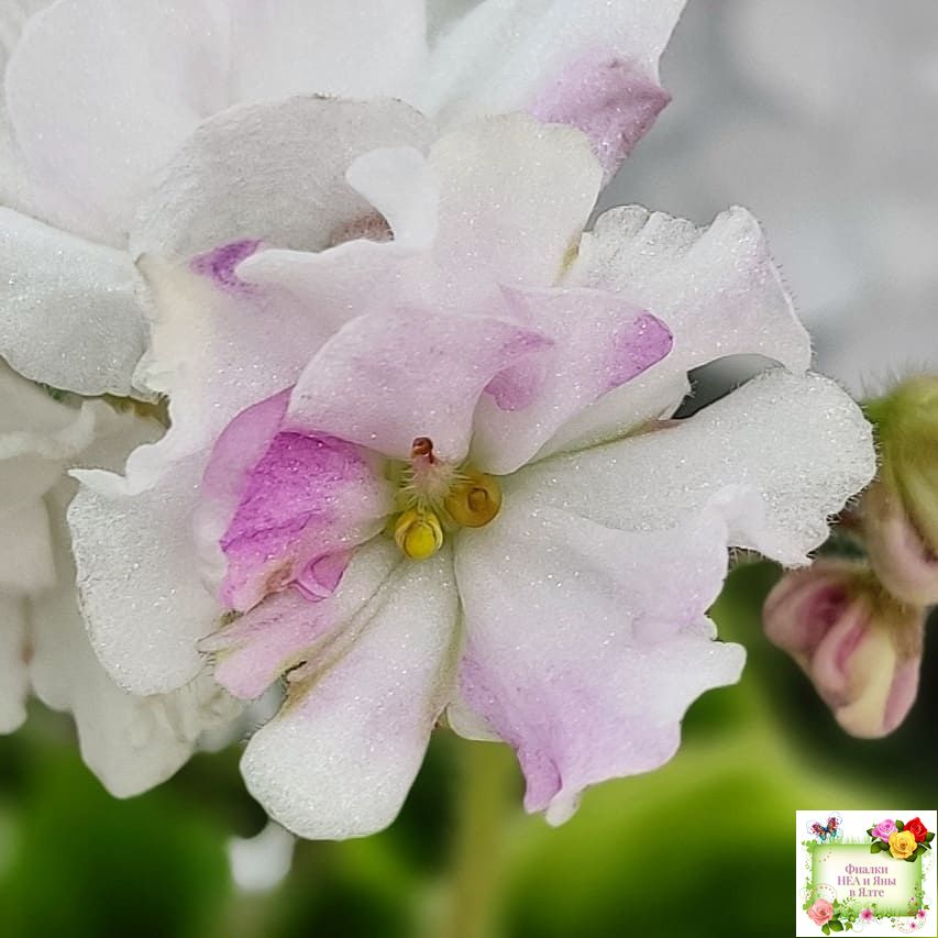 Цветок: Полумахровый, бело-розовый, температурно зависимый, "оса".