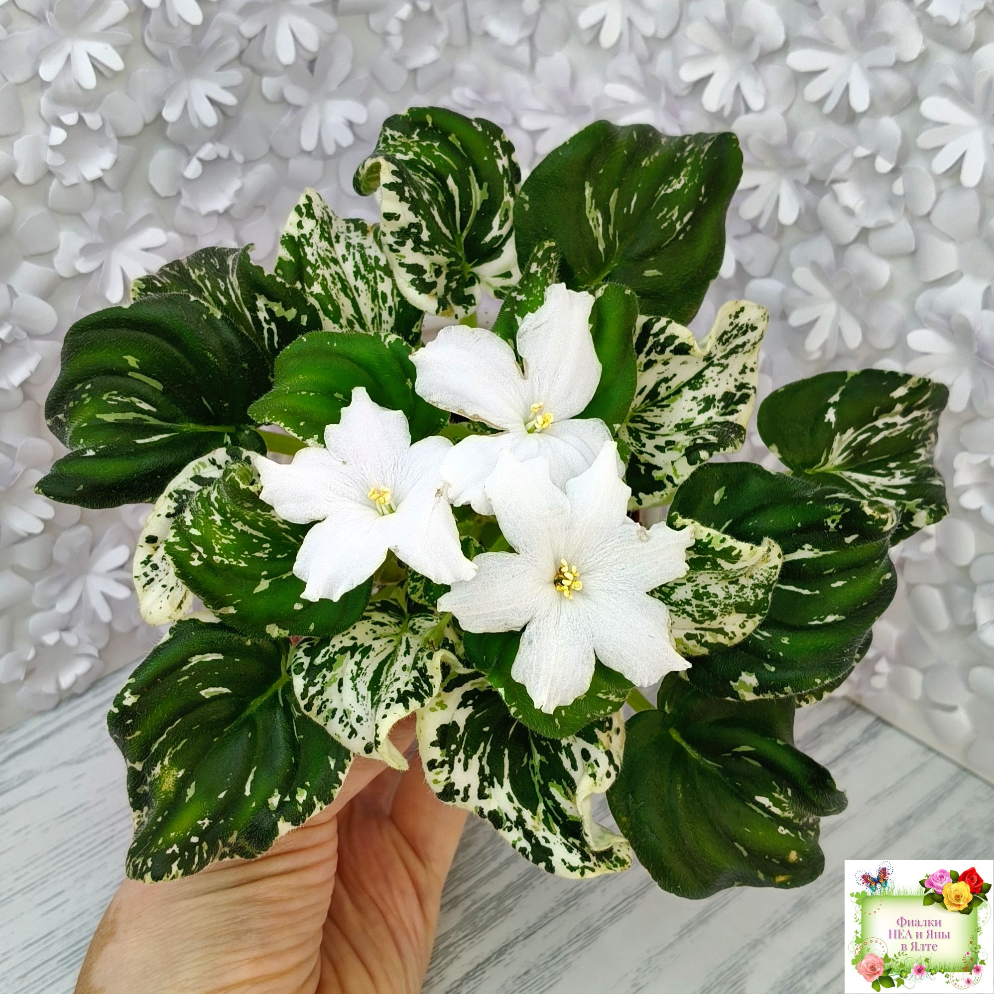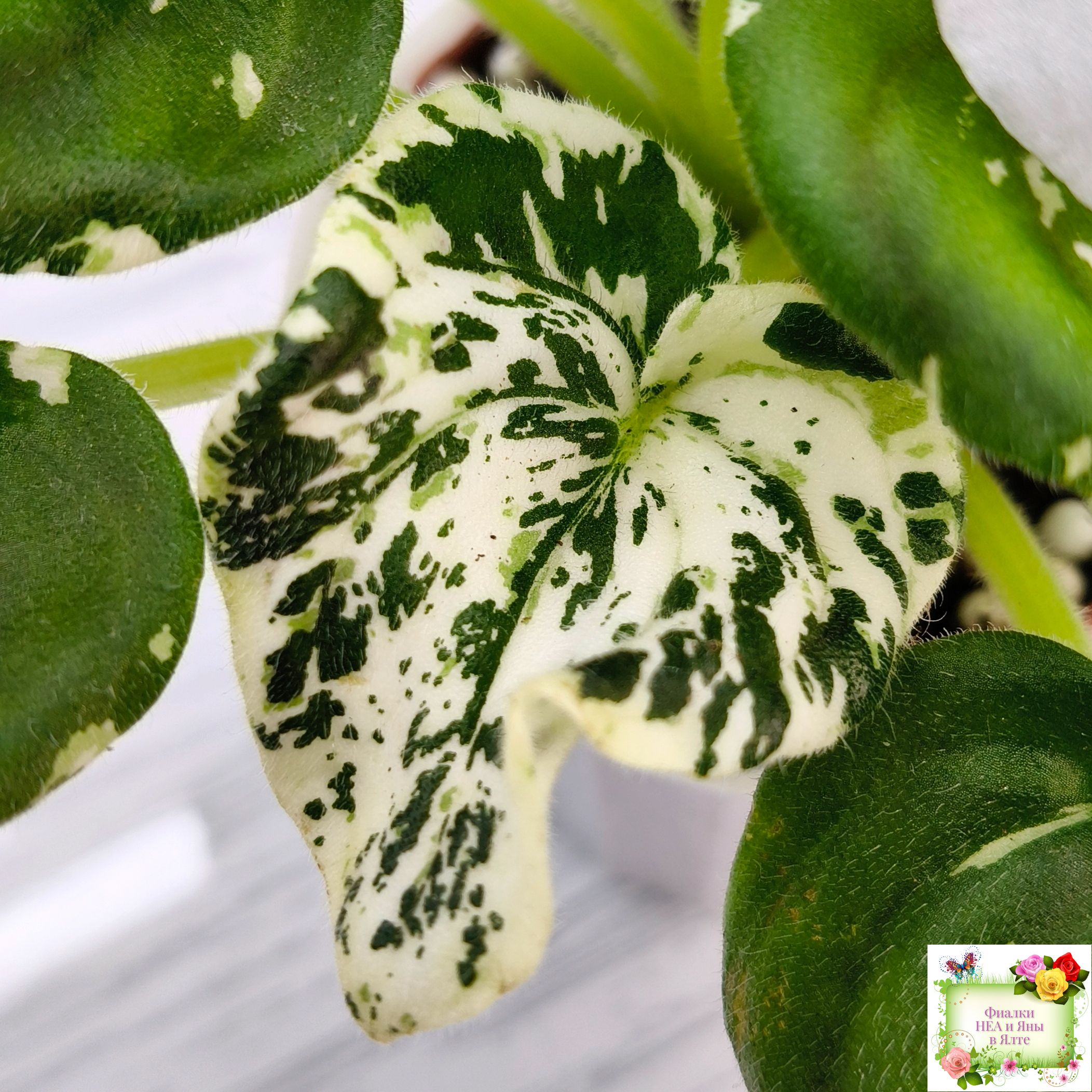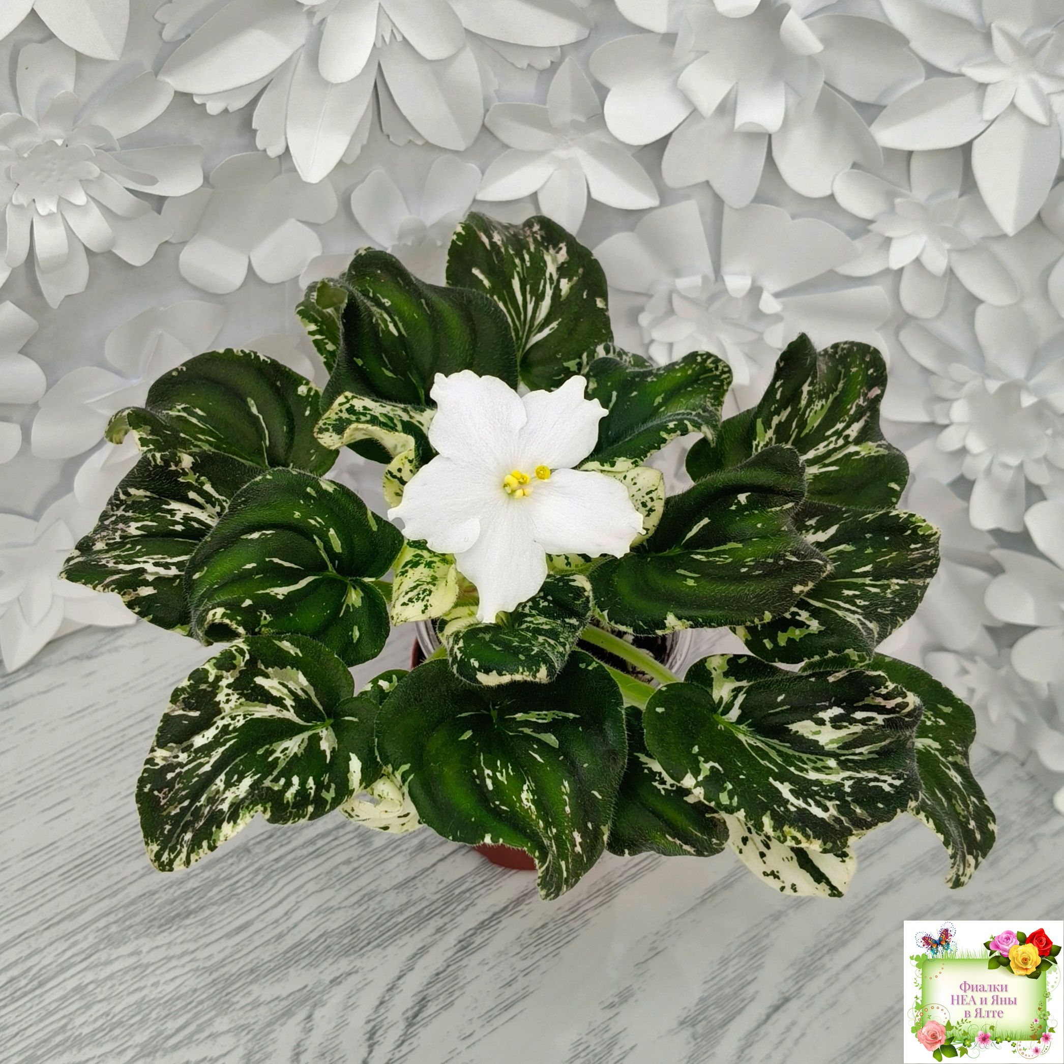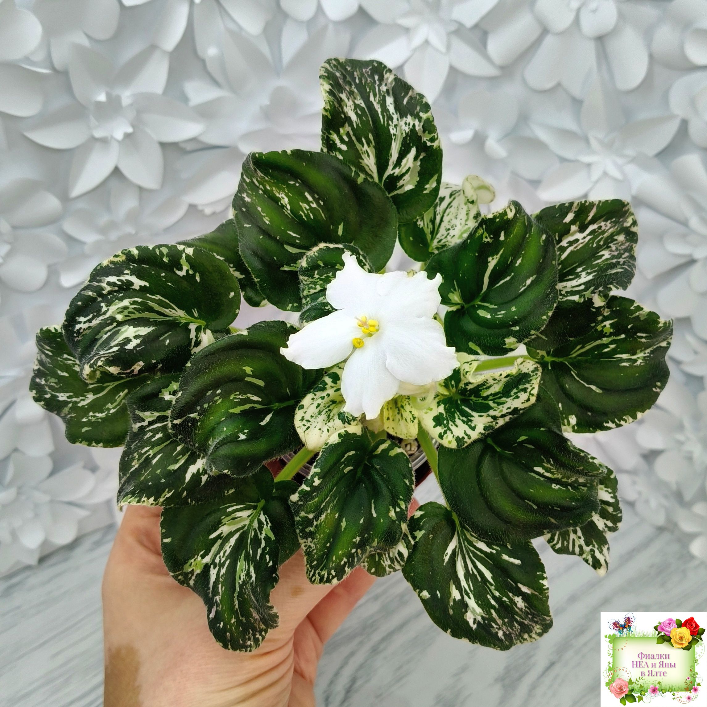 Розетка: Средне-зелёный лист клакамасного типа жилкования с обильной белой пестролистностью по всему листу штрихами, полосками, сегментами, иногда с песочно-жёлтыми отметинами.