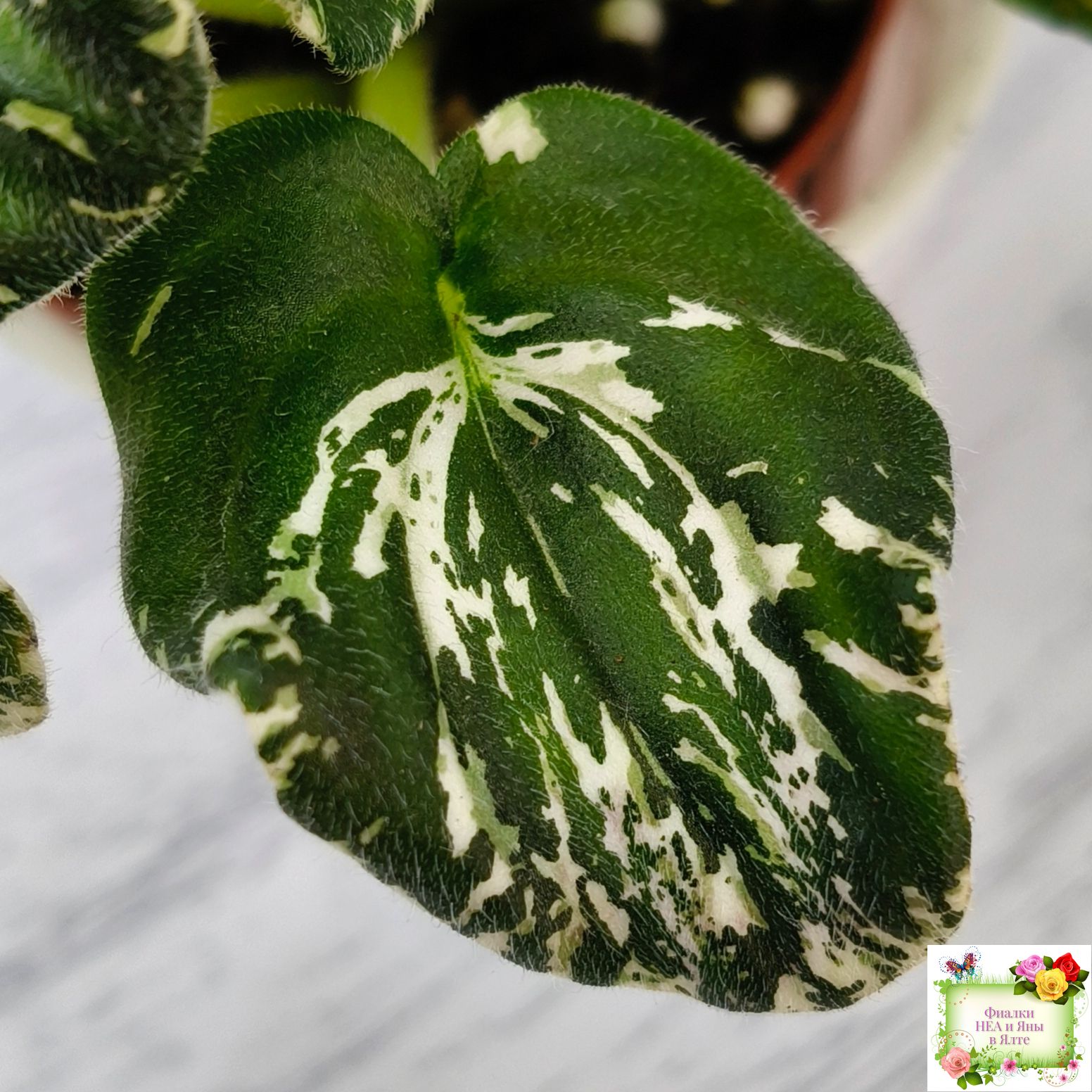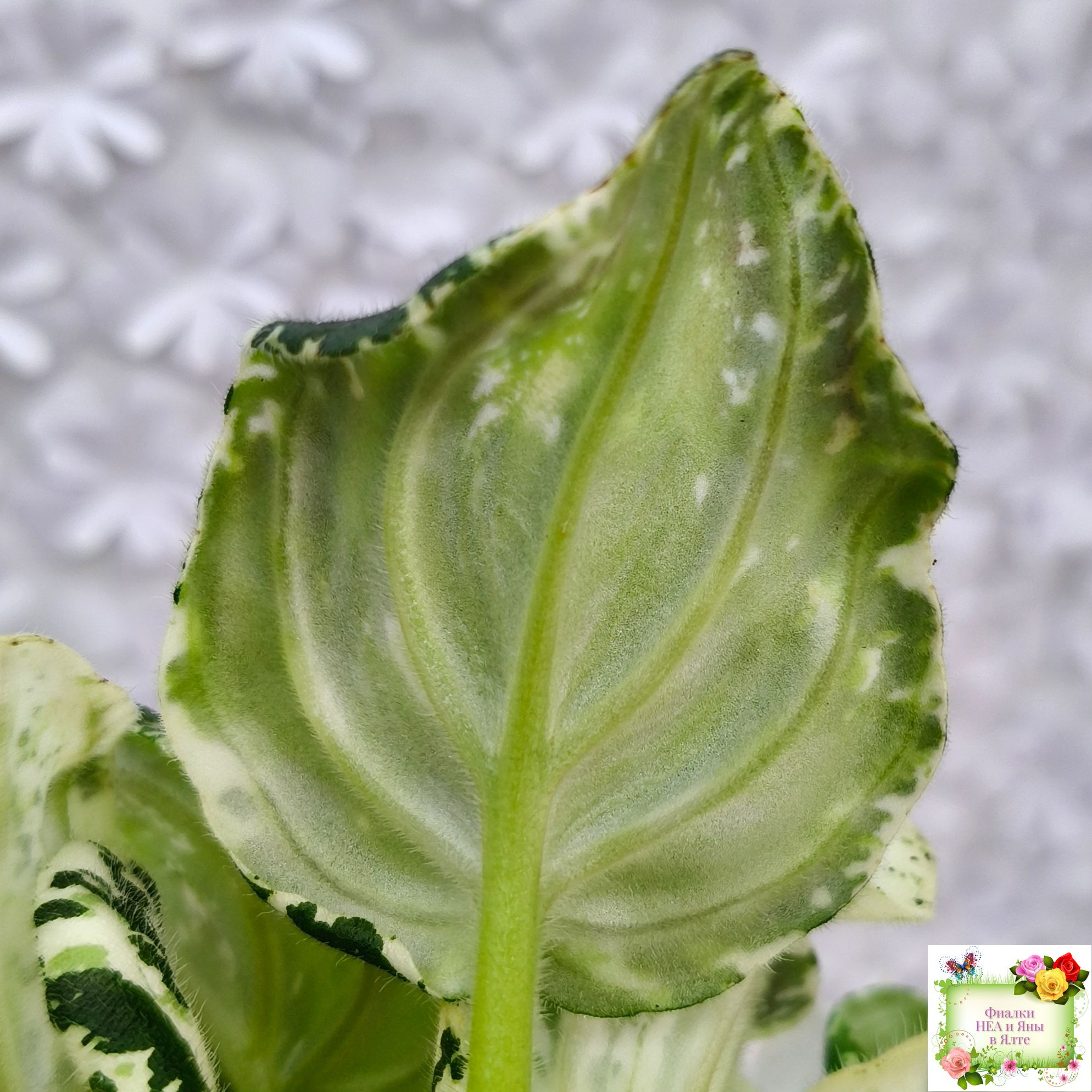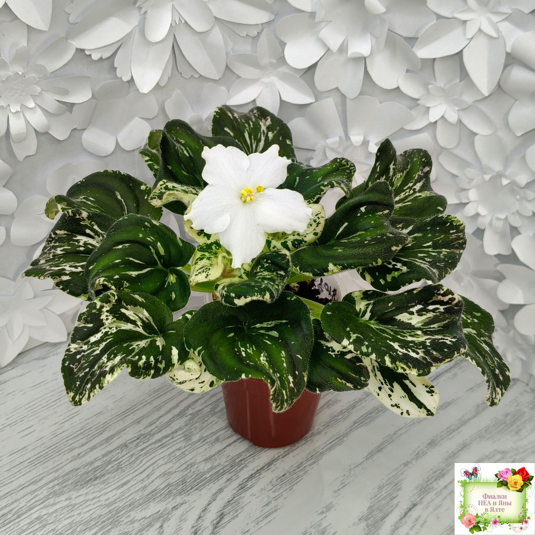 Розетка: Средне-зелёный лист клакамасного типа жилкования с обильной белой пестролистностью по всему листу штрихами, полосками, сегментами, иногда с песочно-жёлтыми отметинами.
