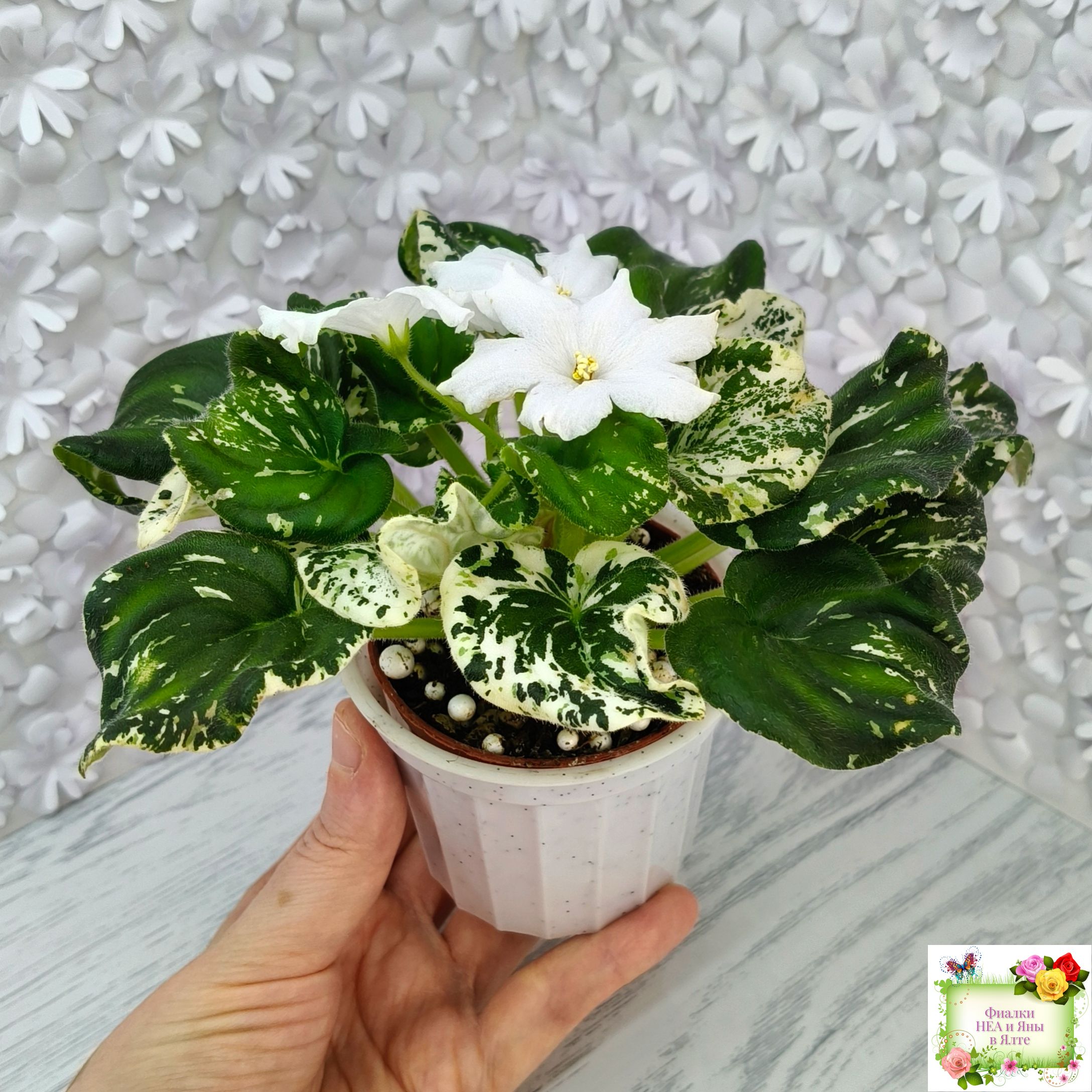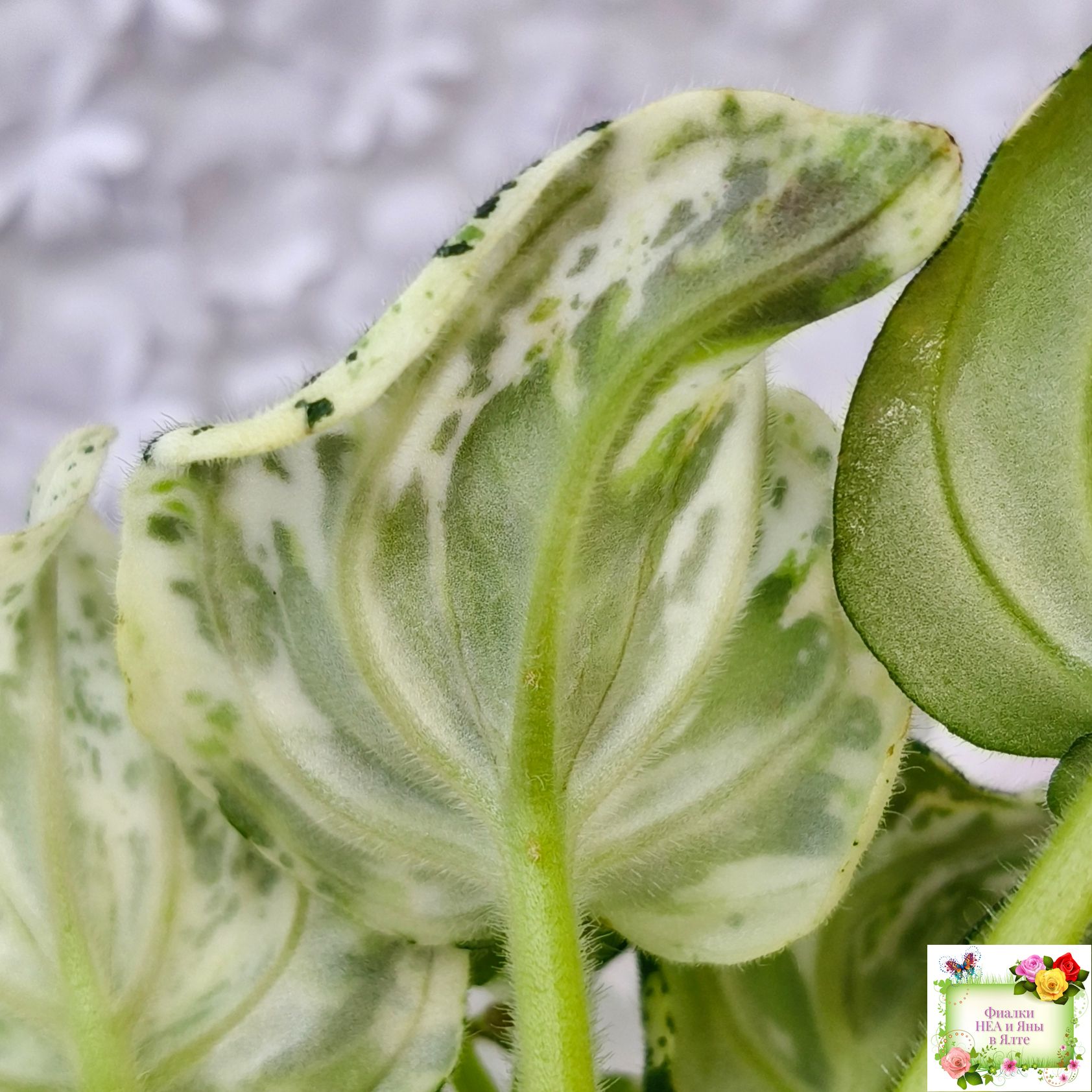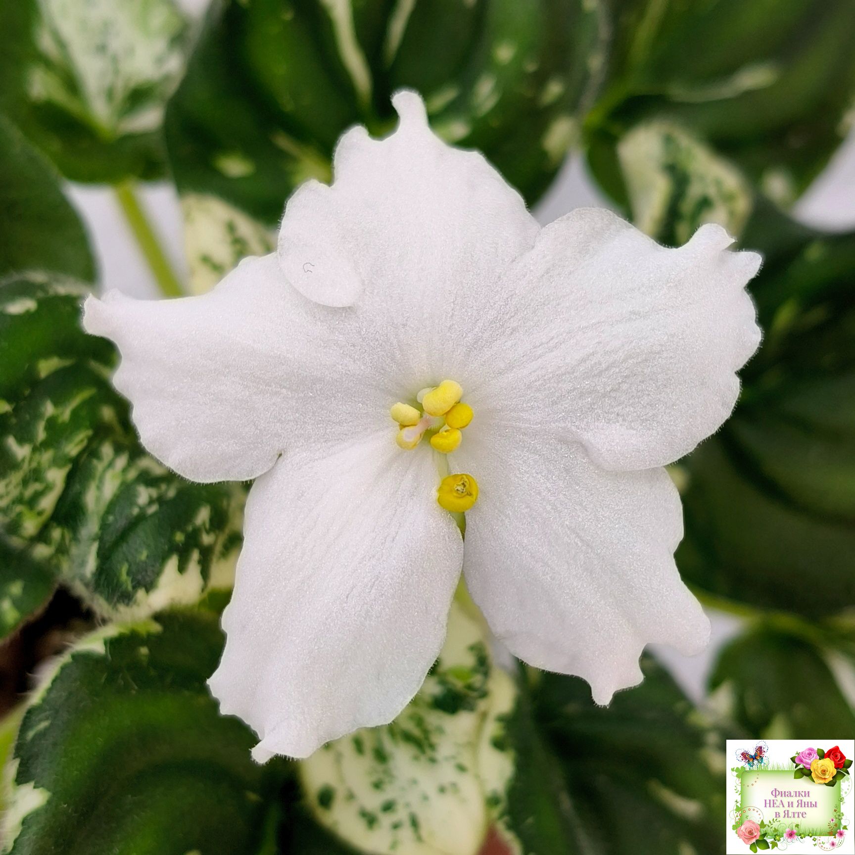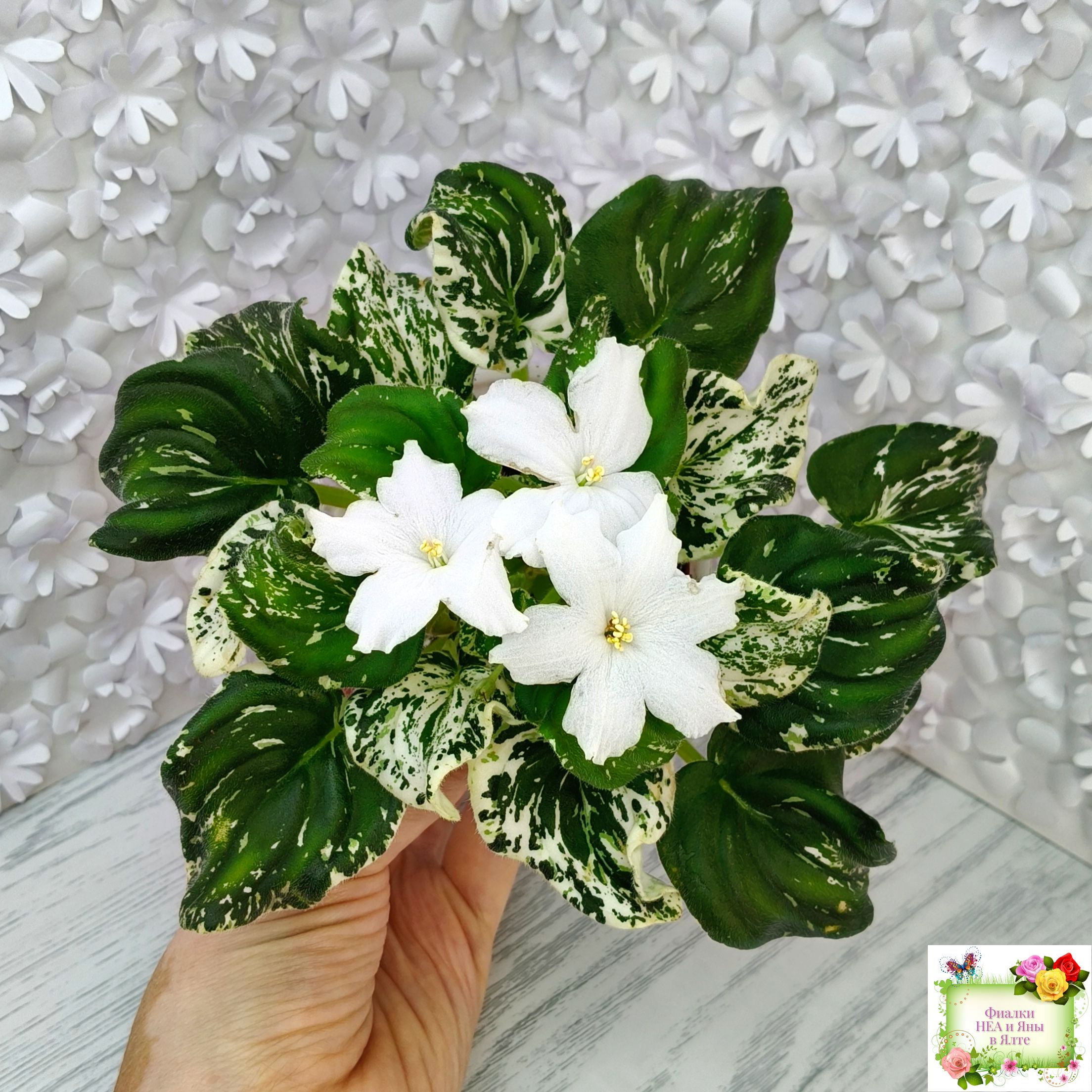 Розетка: Средне-зелёный лист клакамасного типа жилкования с обильной белой пестролистностью по всему листу штрихами, полосками, сегментами, иногда с песочно-жёлтыми отметинами.