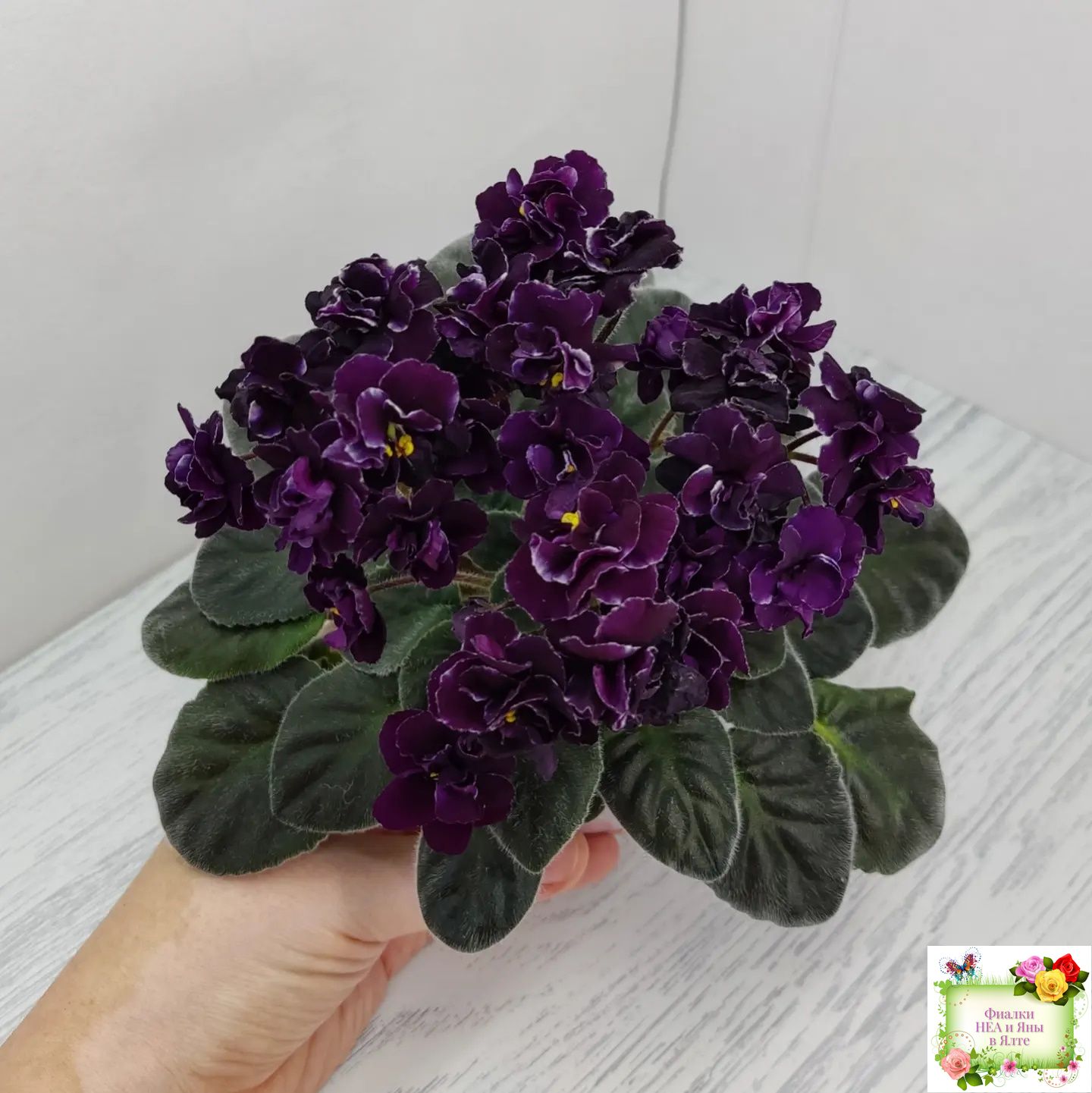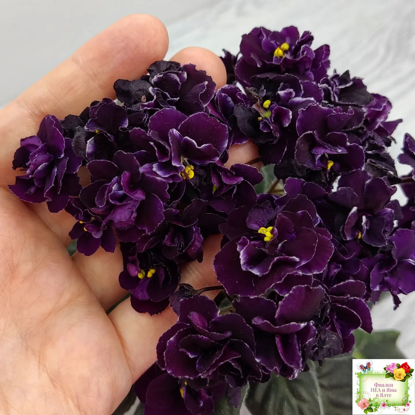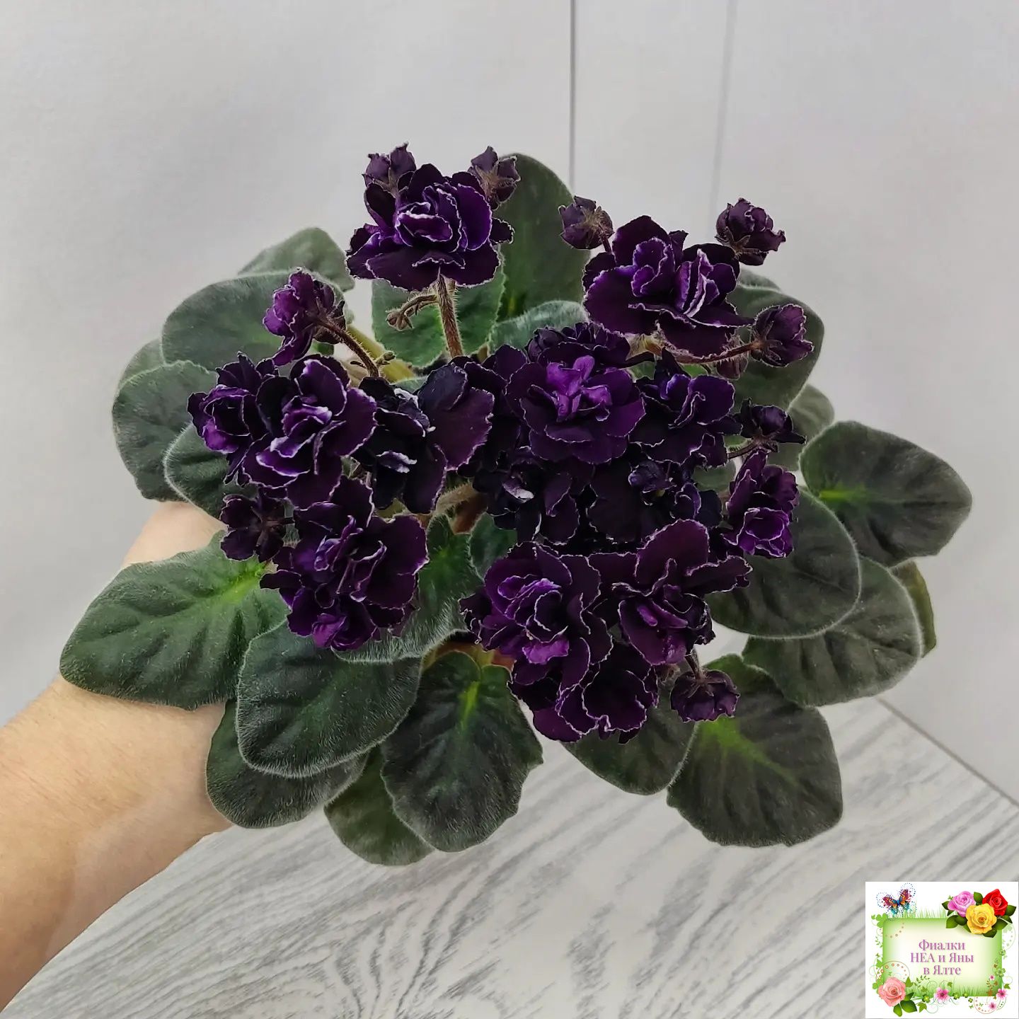 Настоящий шедевр в селекции черноцветковых сортов! Цветы черно-пурпурные крупные густомахровые, с тонкой немного оборчатой белой окантовкой, настоящие букеты на каждом цветоносе; листва крепкая темно-зеленая, стеганая. Полумини.