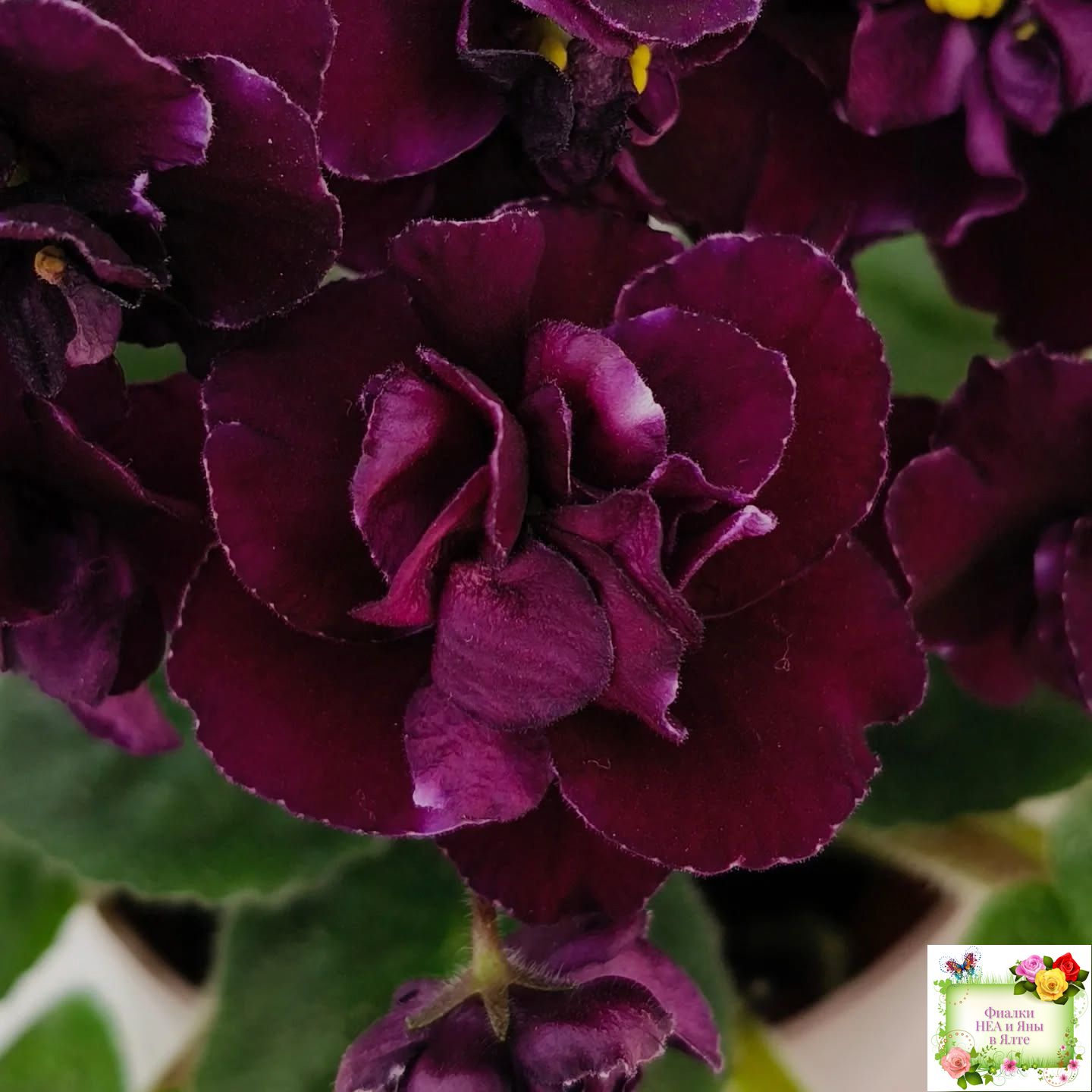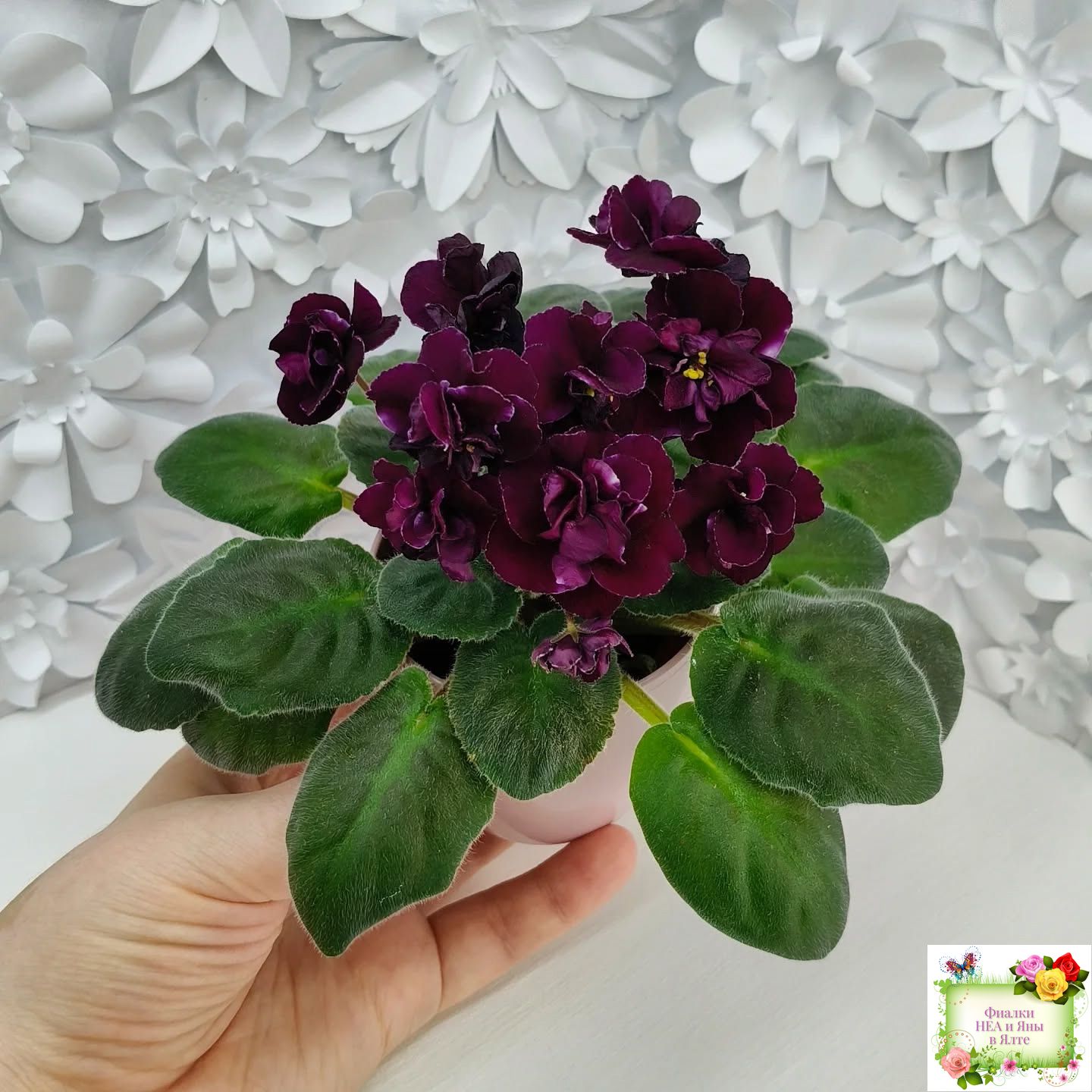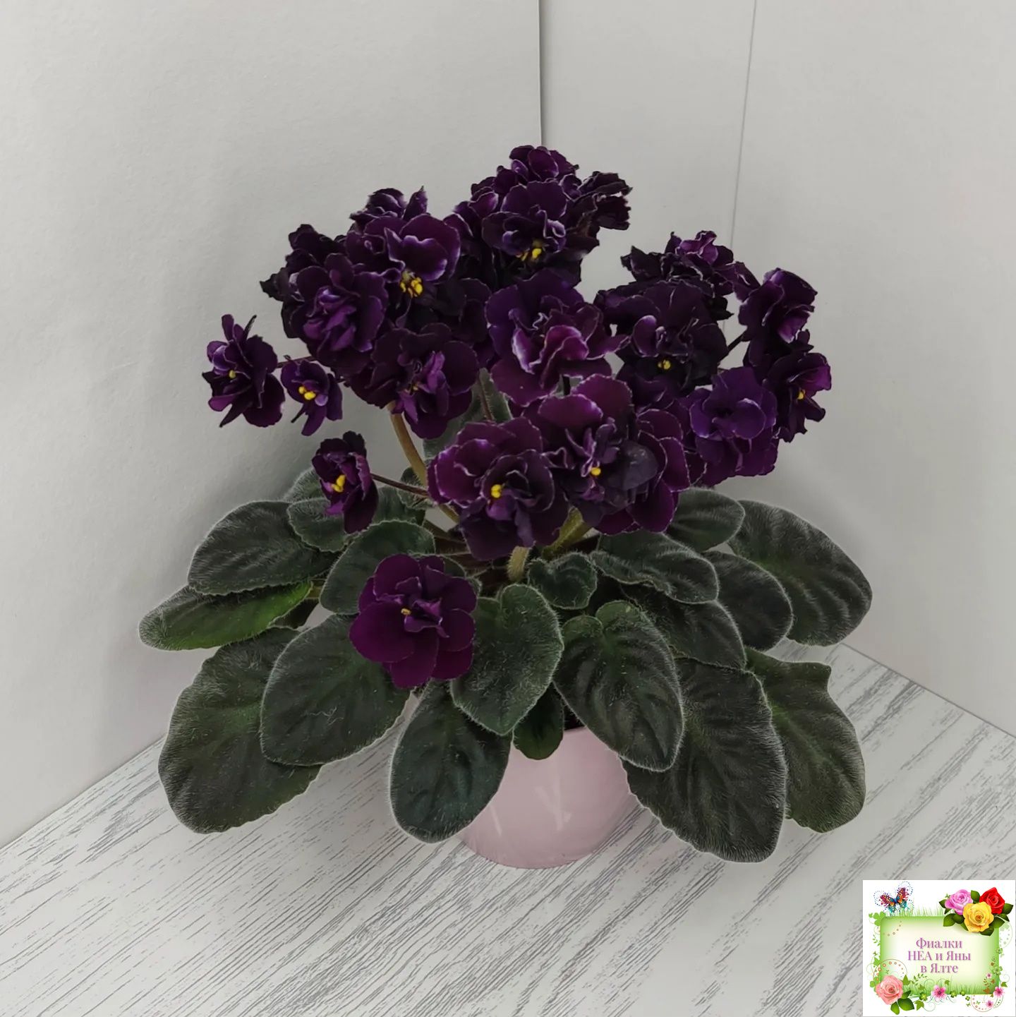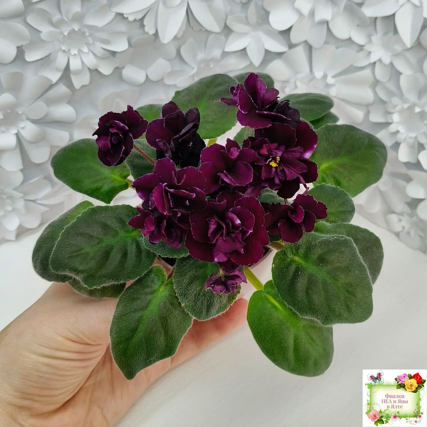 Настоящий шедевр в селекции черноцветковых сортов! Цветы черно-пурпурные крупные густомахровые, с тонкой немного оборчатой белой окантовкой, настоящие букеты на каждом цветоносе; листва крепкая темно-зеленая, стеганая. Полумини.