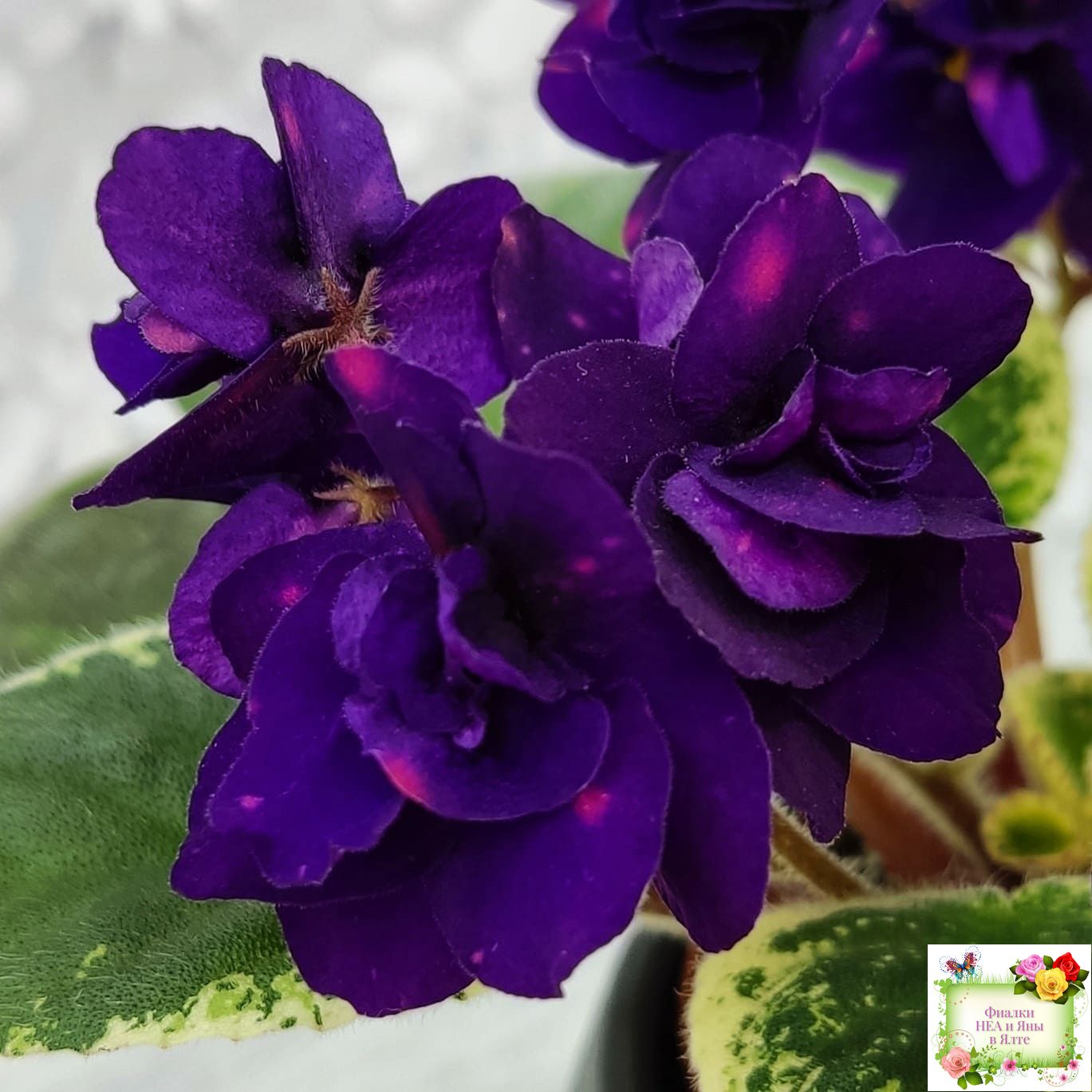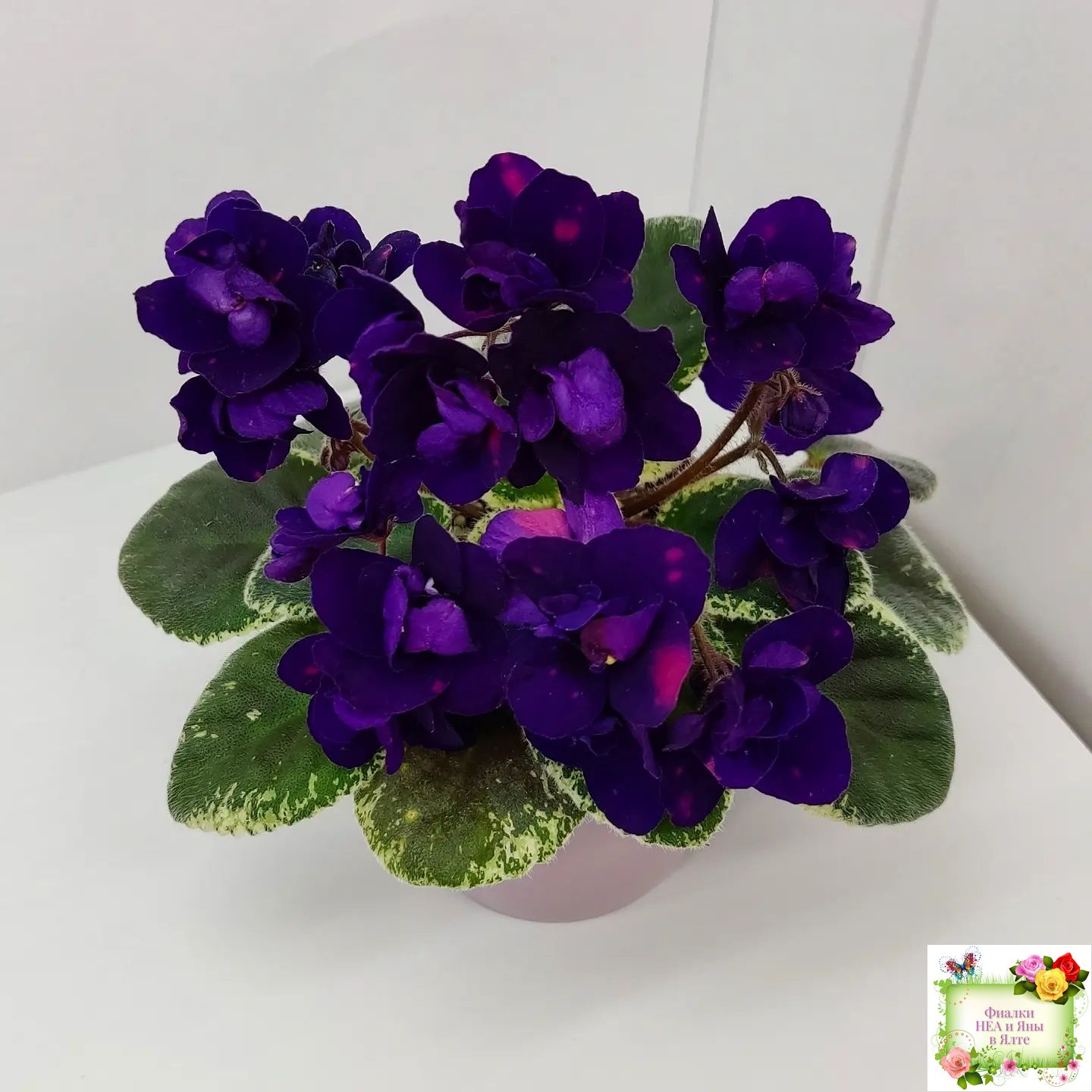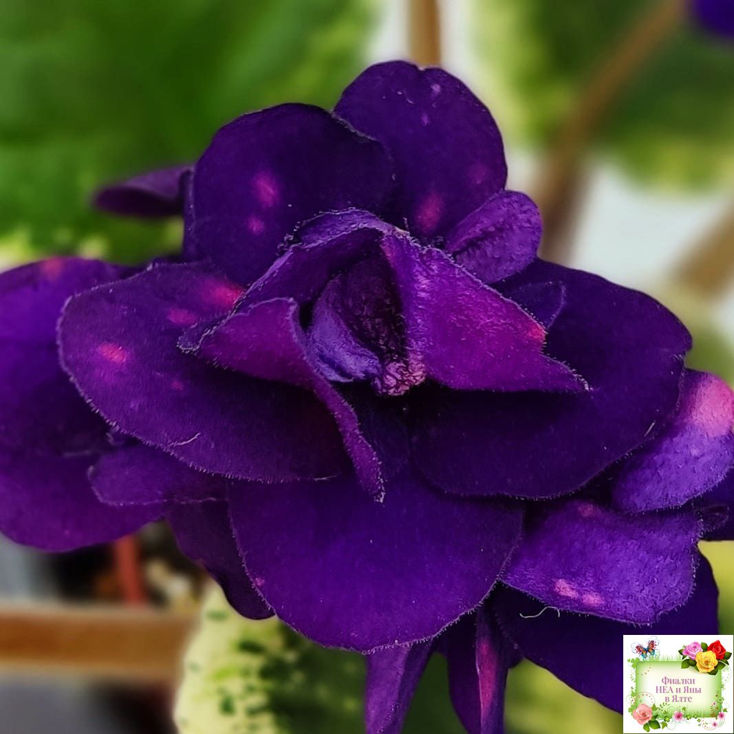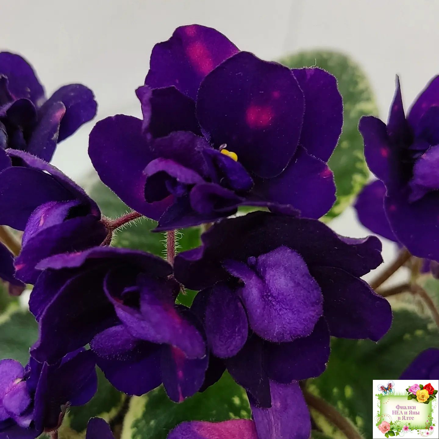 Полумахровые звездочки сапфирово-синего цвета с горошинами малинового фэнтези. Светло-зеленая листва с окаймляющей пестролистностью цвета слоновой кости. Полуминиатюра.