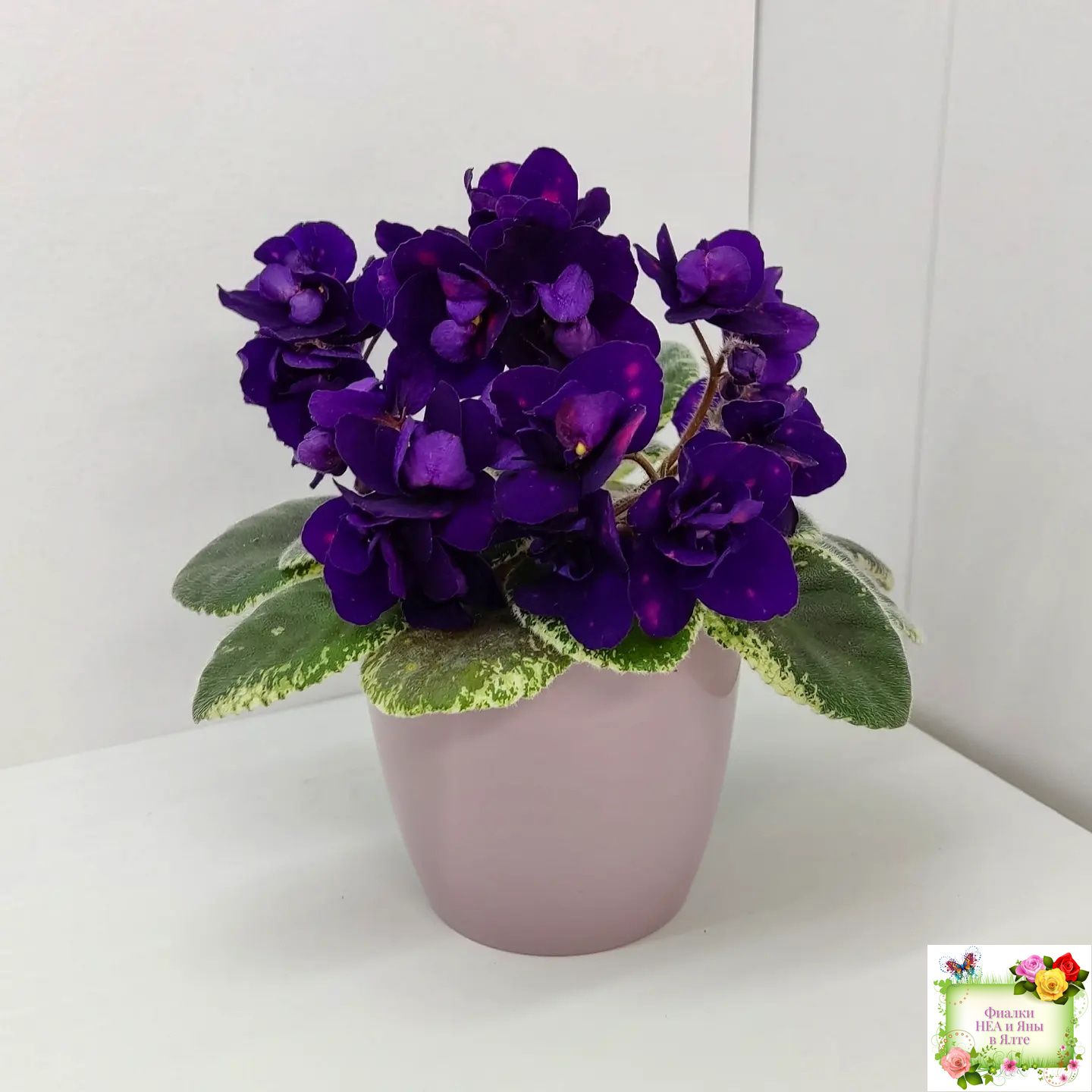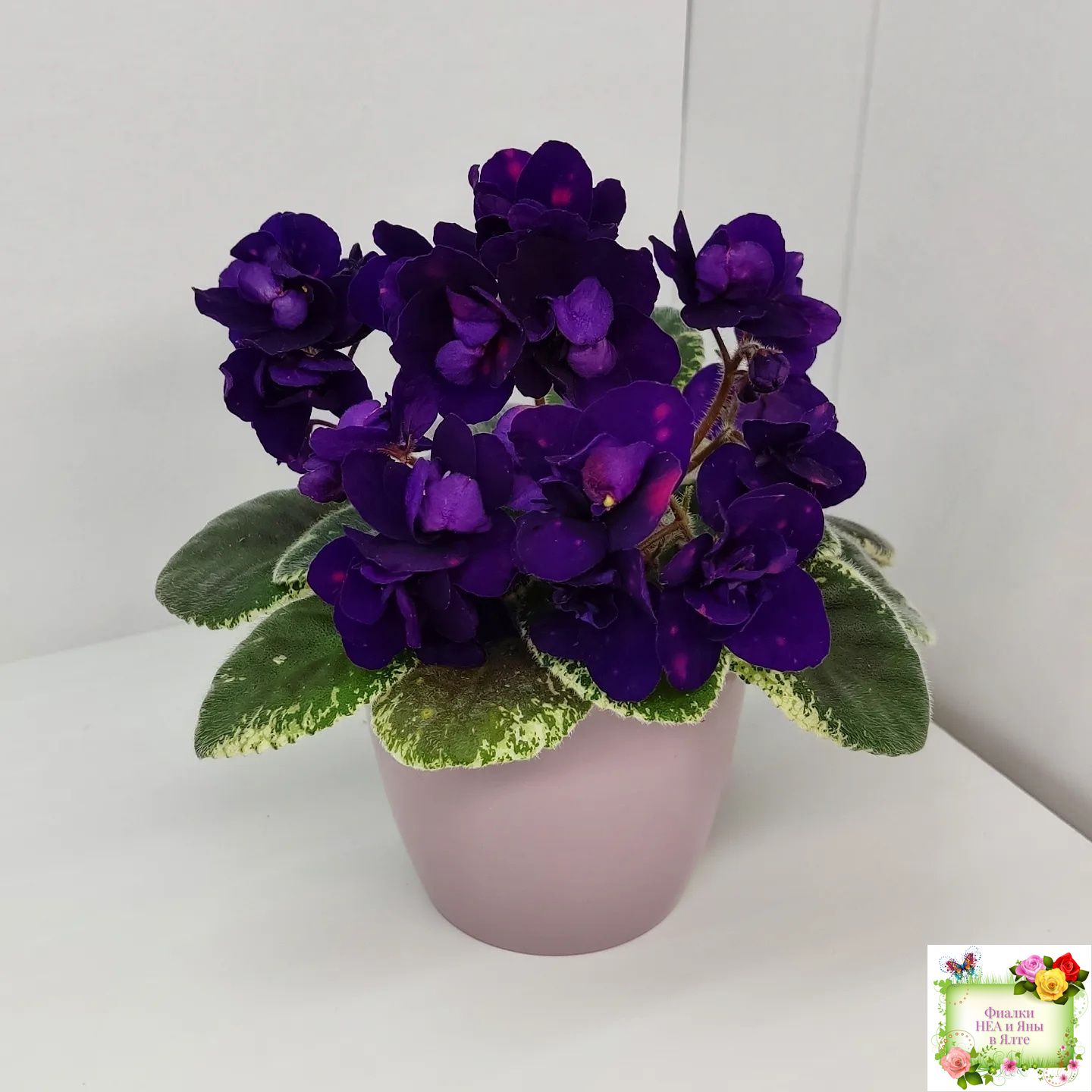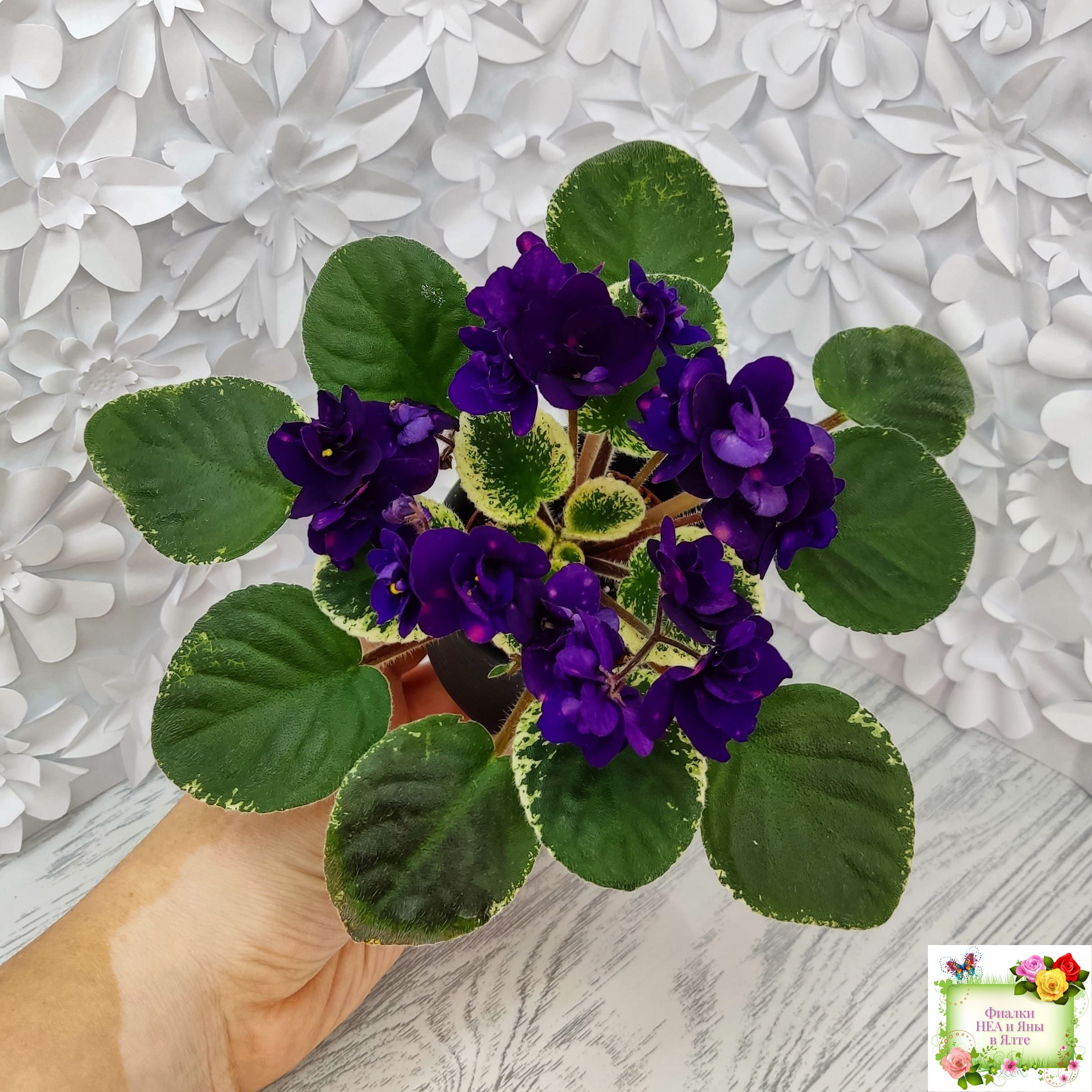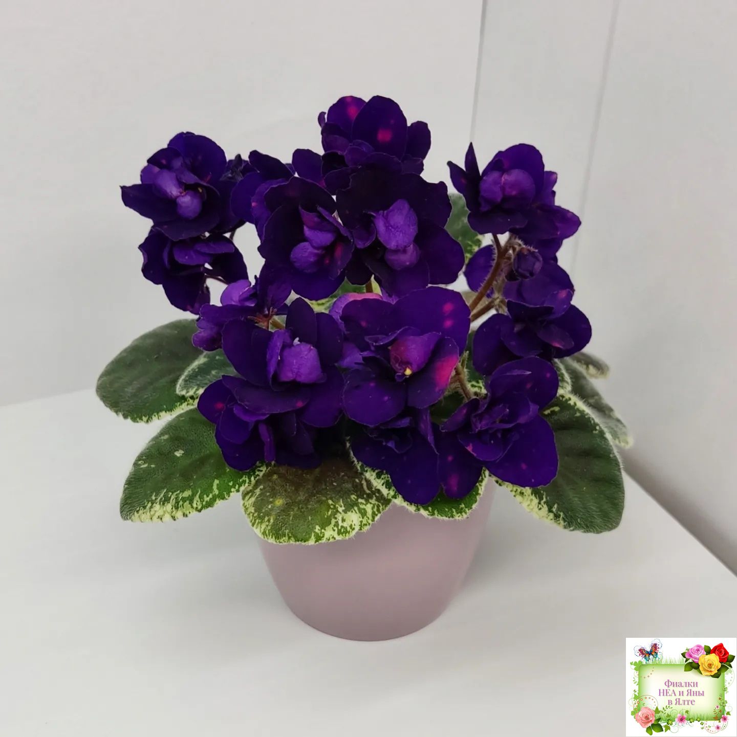 Полумахровые звездочки сапфирово-синего цвета с горошинами малинового фэнтези. Светло-зеленая листва с окаймляющей пестролистностью цвета слоновой кости. Полуминиатюра.
