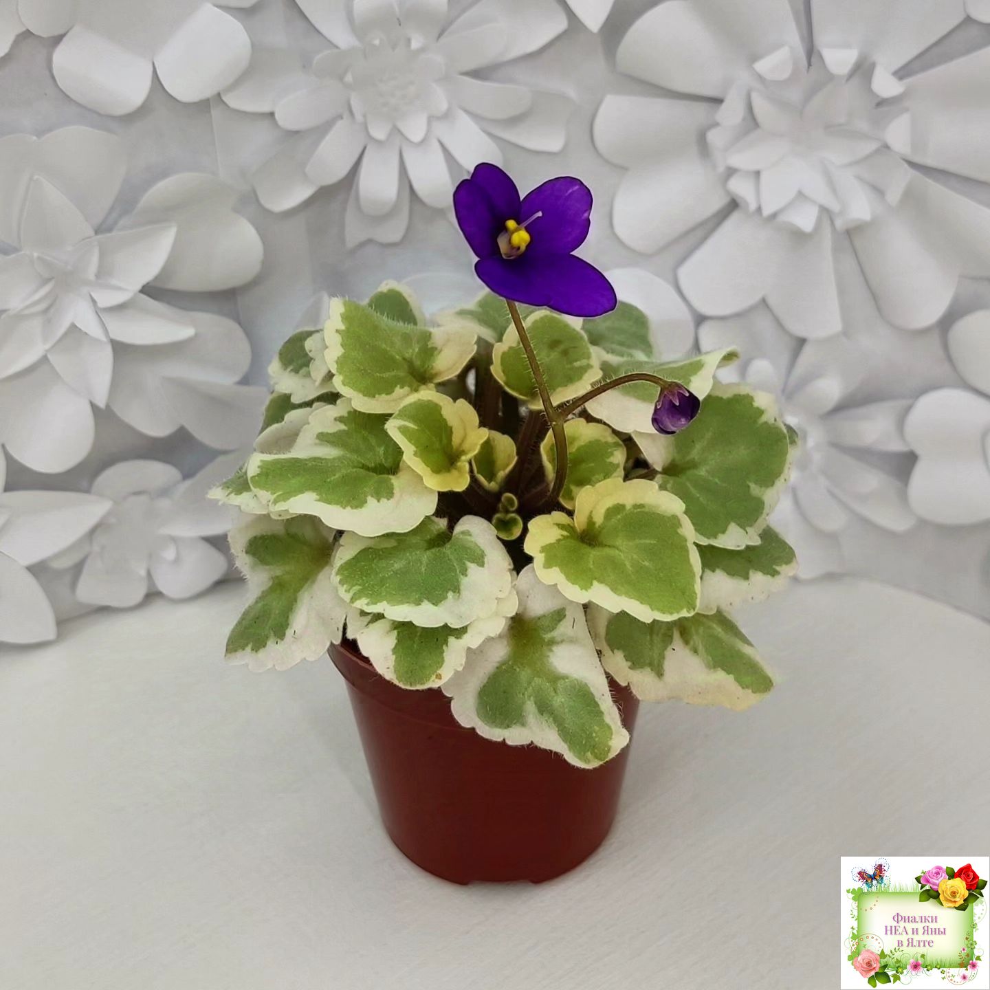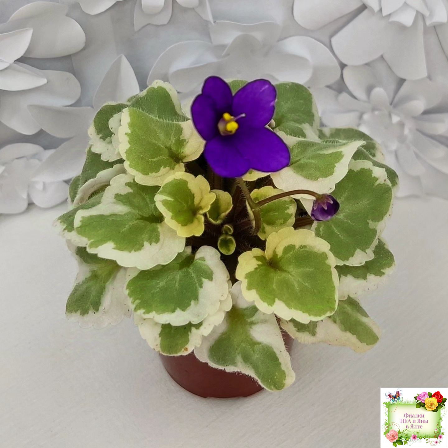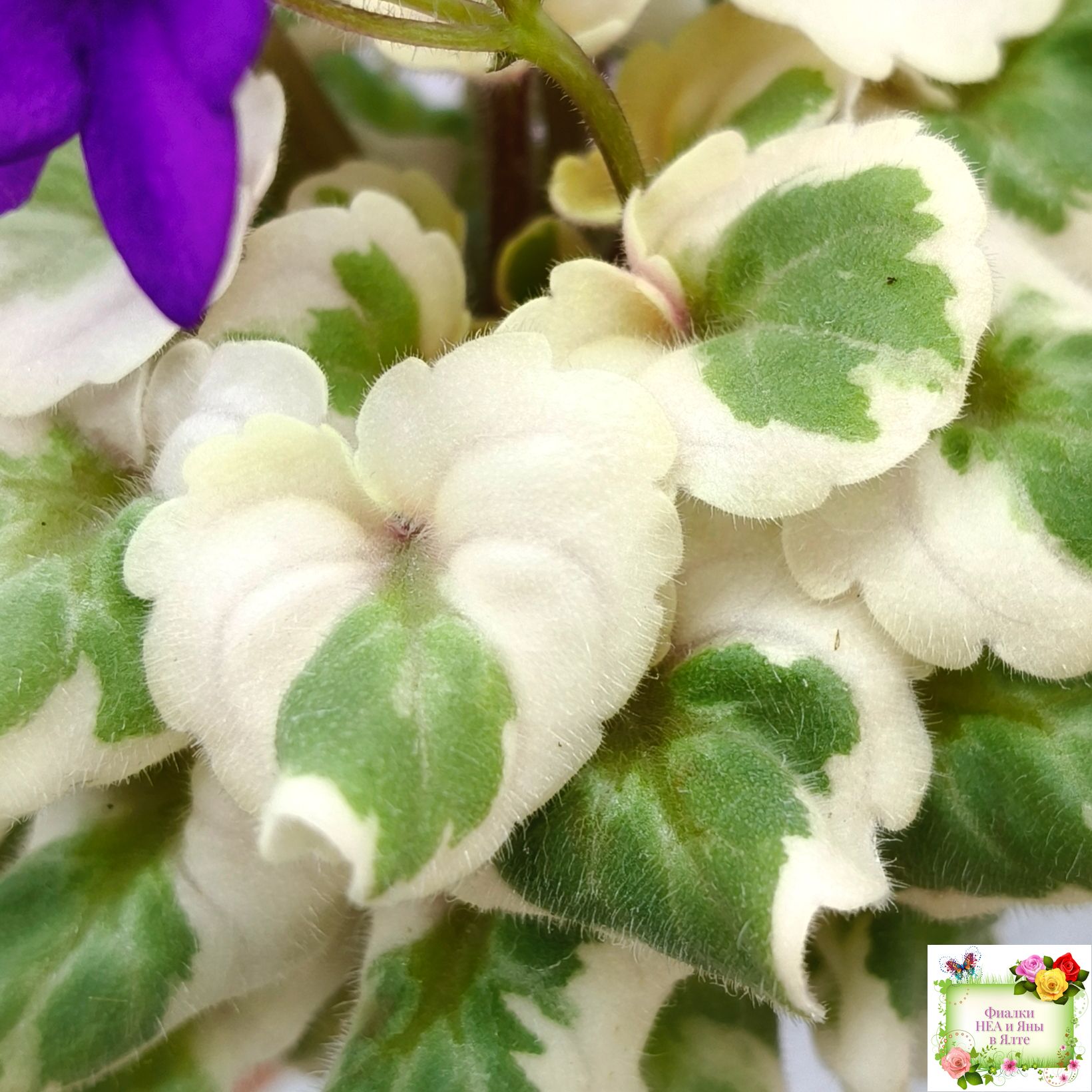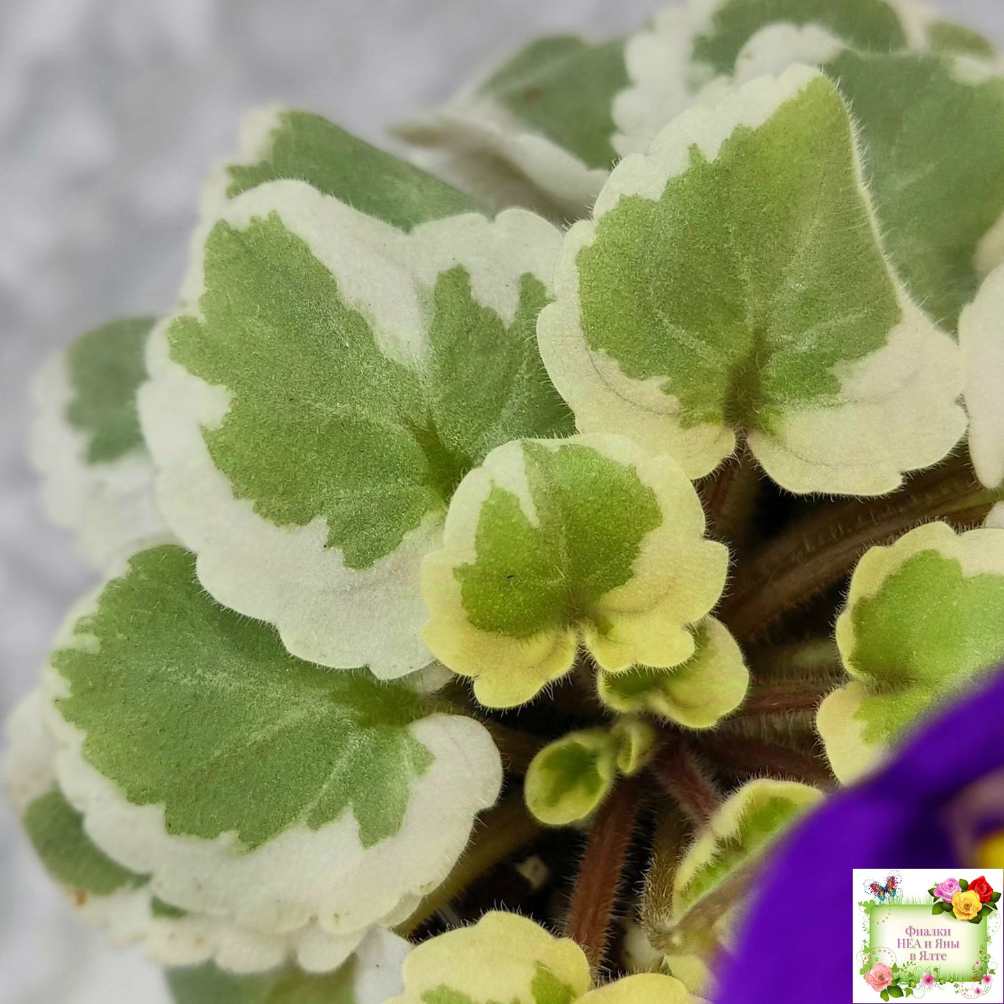 Простые сине-фиолетовые анютки. Химерная, бело-зелёная гёл-листва с зубчатым краем. Полуминиатюра.