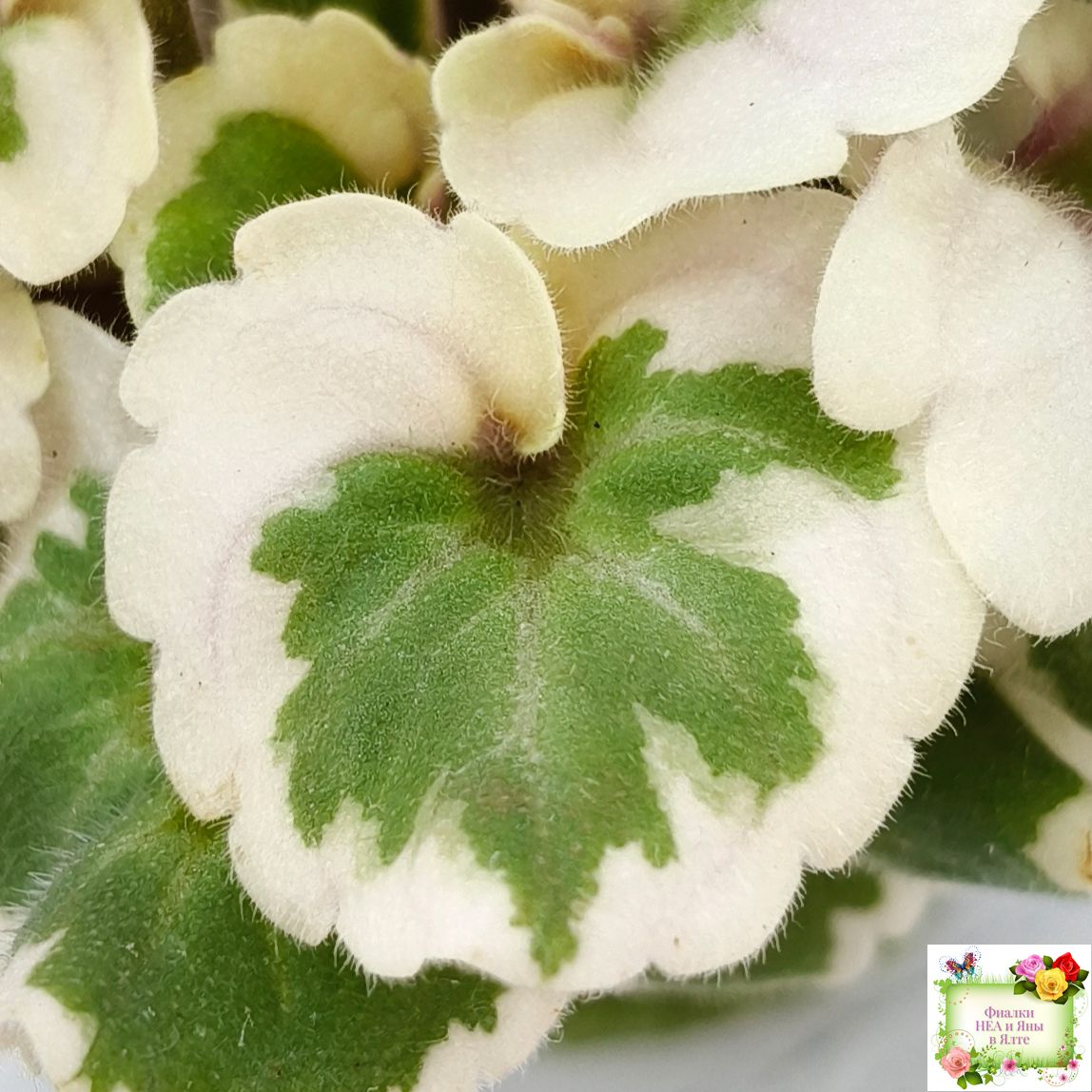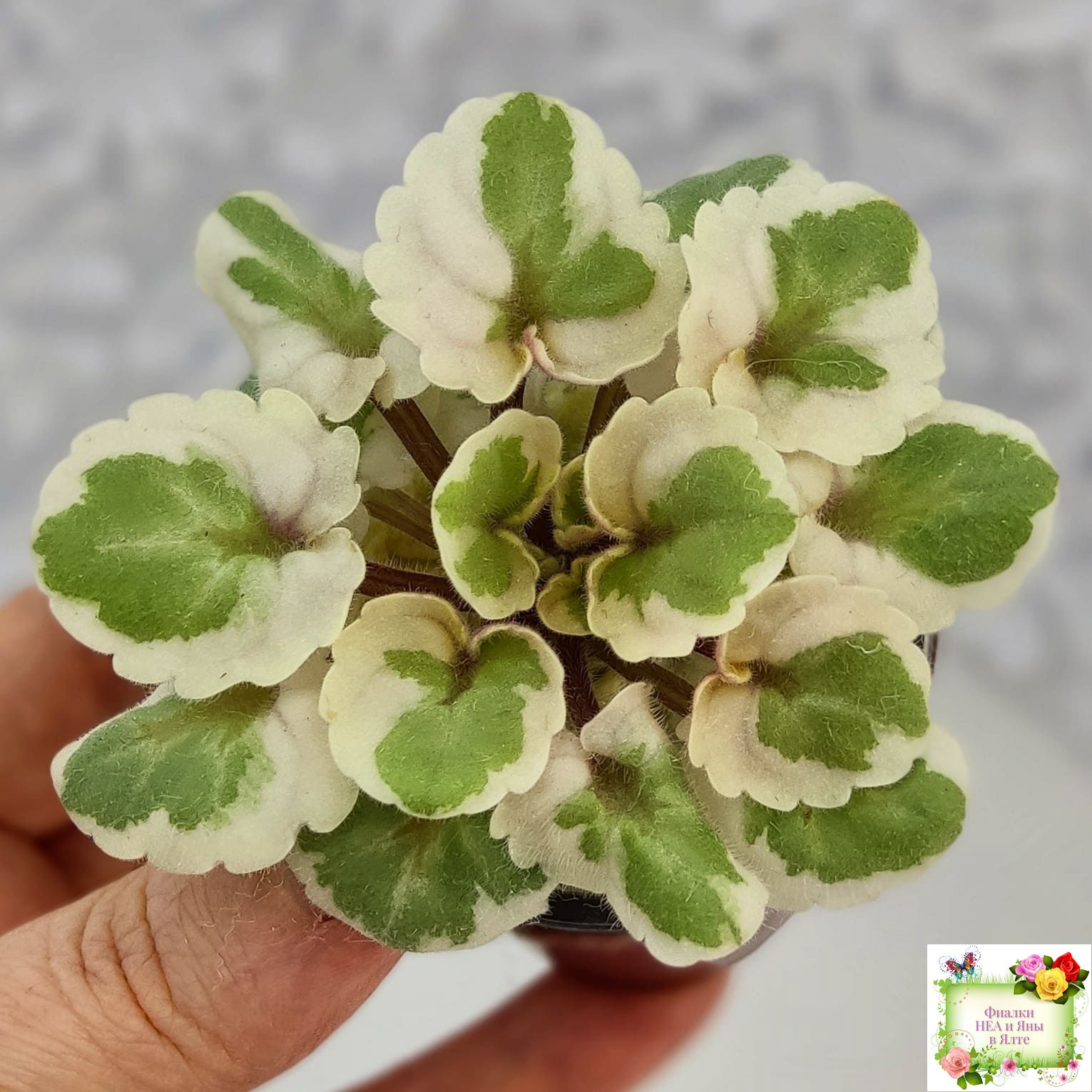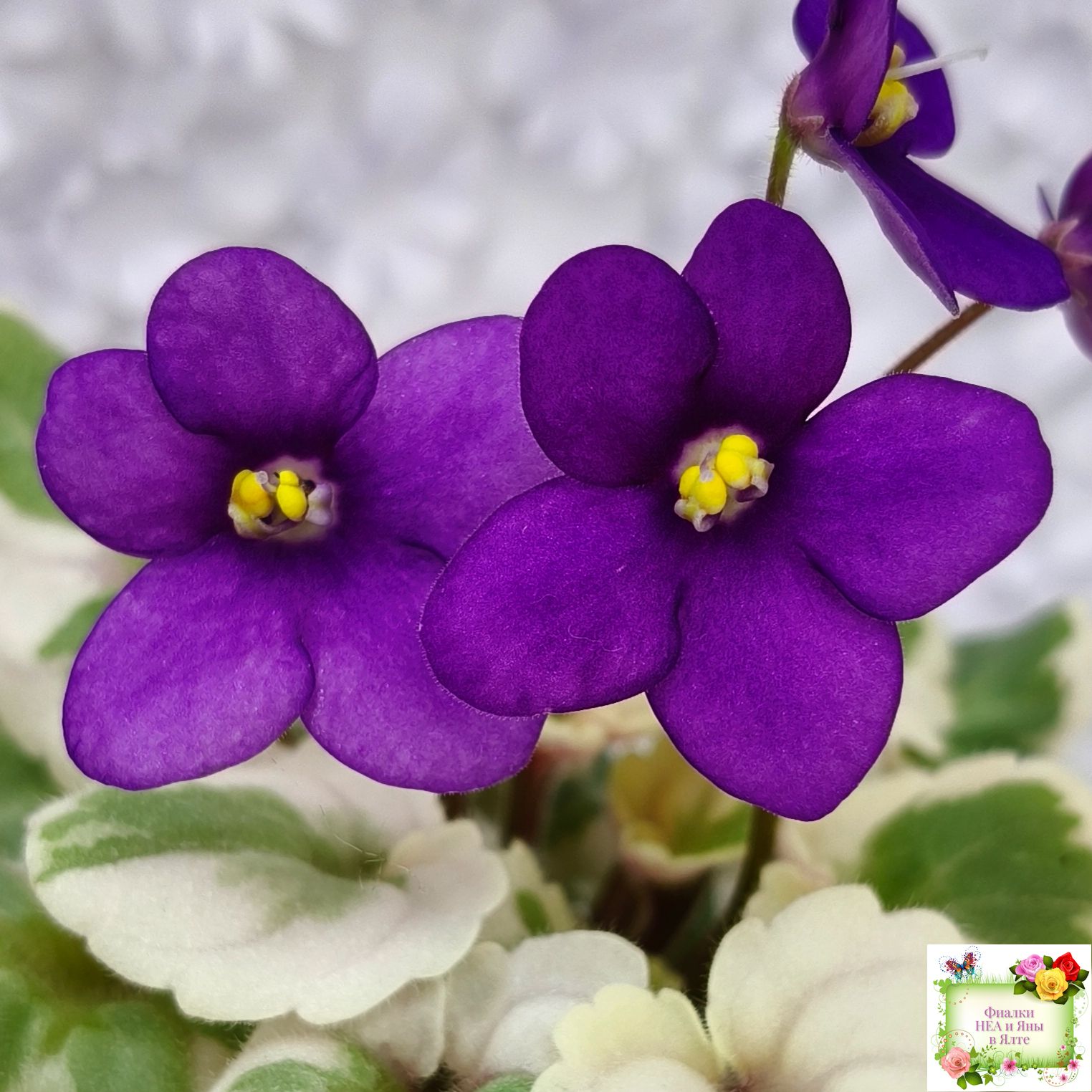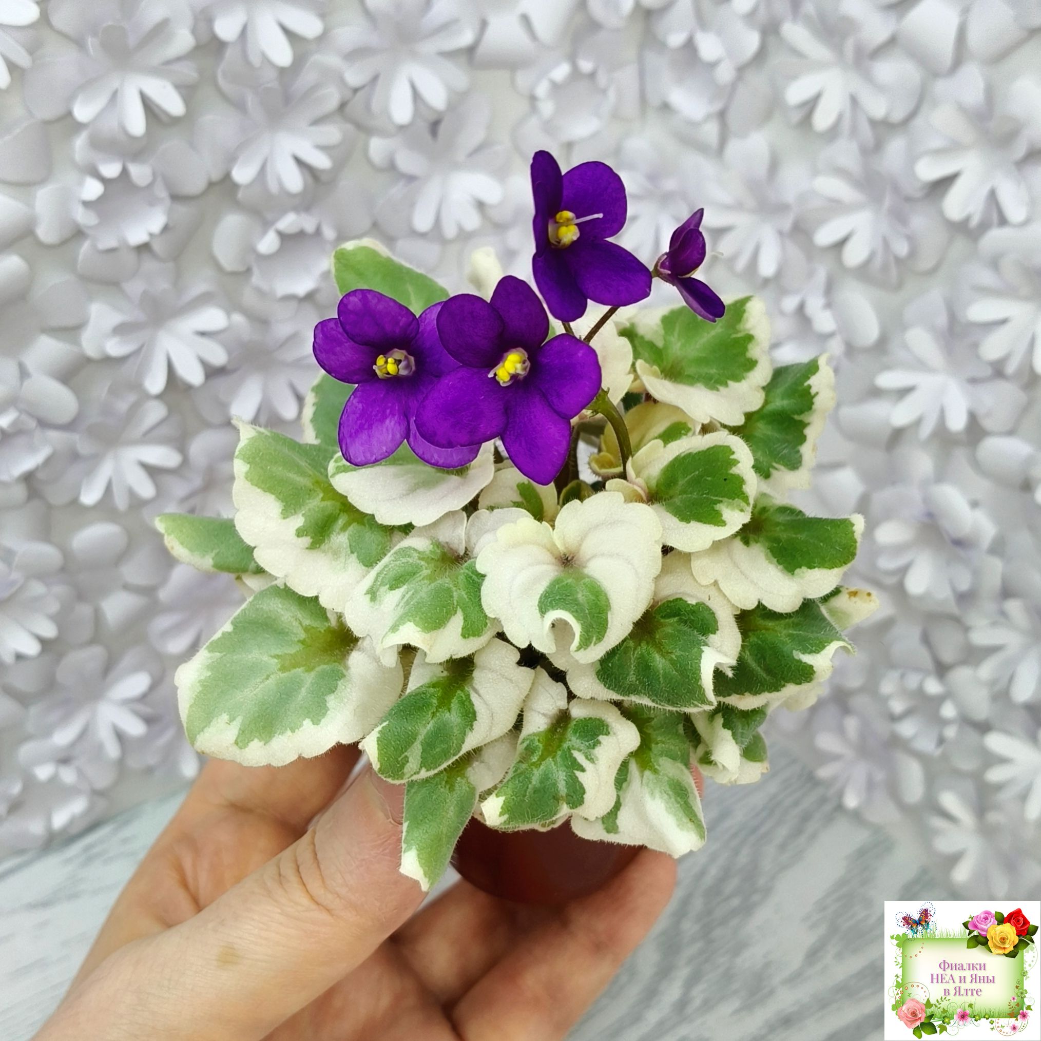 Простые сине-фиолетовые анютки. Химерная, бело-зелёная гёл-листва с зубчатым краем. Полуминиатюра.