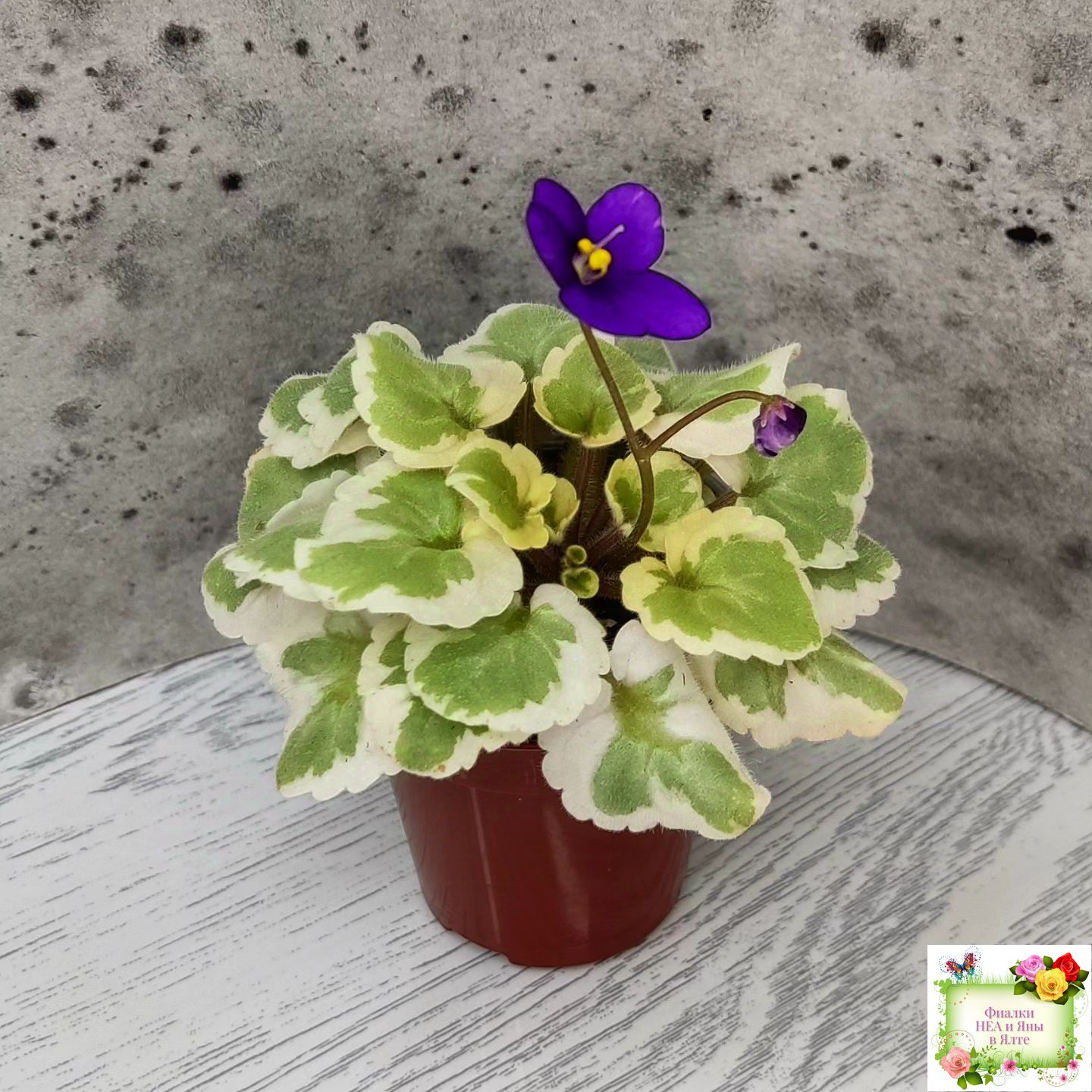 Single blue-purple pansy. Chimera variegated medium green and white, scalloped girl foliage. Semiminiature